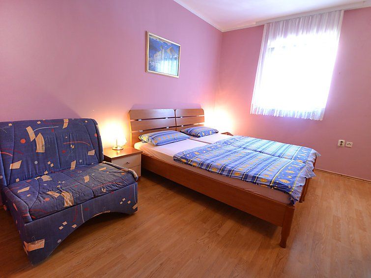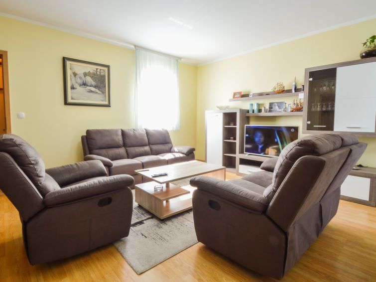 "Ana", 3-room apartment 85 m2, on the upper ground floor. Modern and cosy furnishings: living/dining room 36 m2 with satellite TV (flat screen), air conditioning. Exit to the loggia. 1 room with 1 french bed (180 cm, length 200 cm). Exit to the terrace. 1 room with 2 beds (90 cm, length 200 cm).