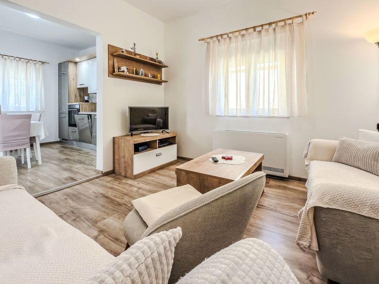 2-room semi-detached house 60 m2, south-west facing position. Living/dining room 18 m2 with 1 sofabed (130 cm, length 200 cm), TV (flat screen). 1 room with 1 french bed (180 cm, length 200 cm), air conditioning. Open kitchen (oven, dishwasher, 1 ceramic glass hob hotplate, 3 gas rings, freezer, electric coffee machine) with air conditioning.