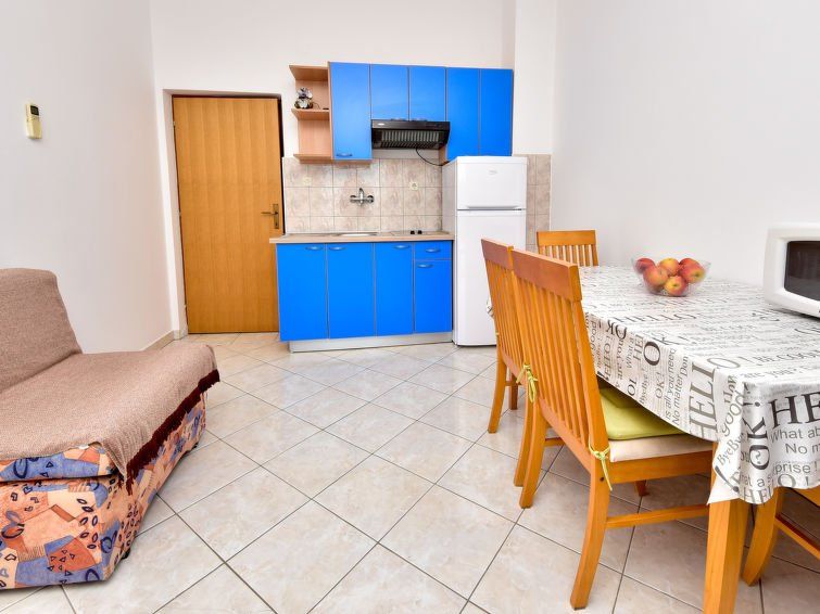 2-room apartment 35 m2 on 2nd floor, south-west facing position. Living/dining room 22 m2 with 1 sofabed (120 cm, length 190 cm), satellite TV (flat screen), air conditioning. Exit to the terrace. 1 room with 1 double bed (2 x 90 cm, length 200 cm). Open kitchen (4 hot plates, microwave, electric coffee machine).