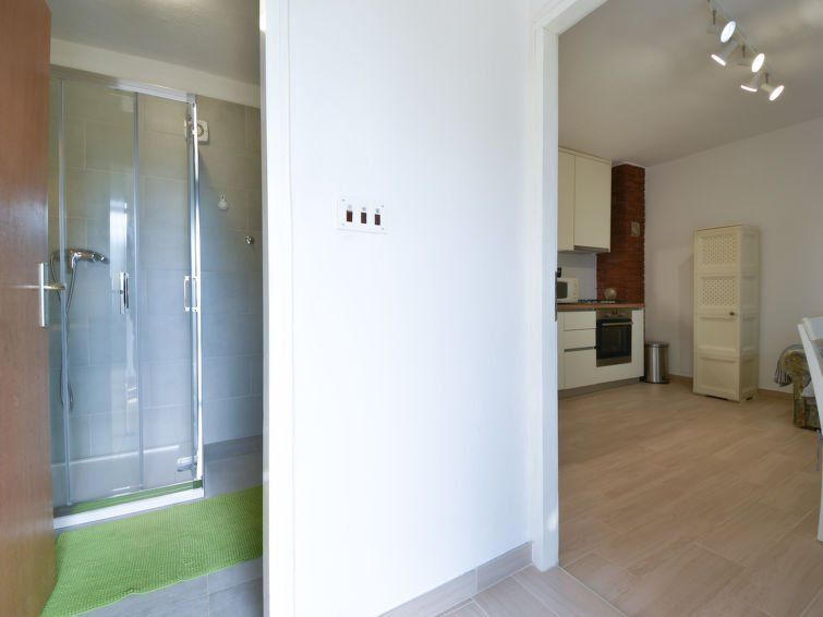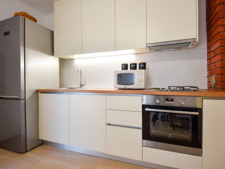 2-room apartment 38 m2, on the ground floor, south-west facing position. Renovated in 2023: living/dining room 22 m2 with satellite TV (flat screen), air conditioning. Exit to the veranda. 1 room with 1 bed (90 cm, length 190 cm), 1 double bed (2 x 90 cm, length 190 cm). Open kitchen (2 hot plates, oven, Gas stove, 2 gas rings, electric coffee machine).