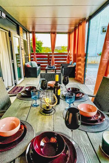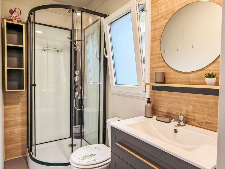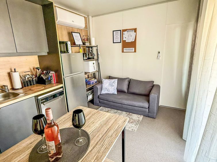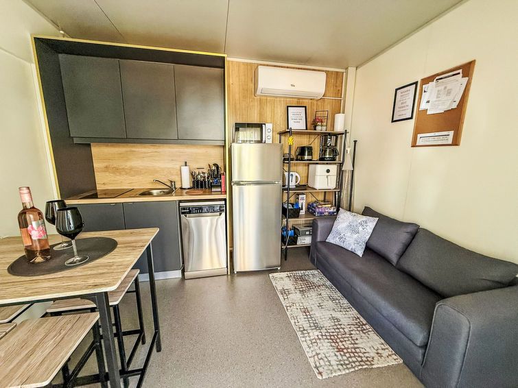 3-room mobile home 24 m2, south facing position. Living/dining room with satellite TV (flat screen), air conditioning. Exit to the terrace. 1 room with 1 french bed (160 cm, length 200 cm). 1 room with 1 french bed (140 cm, length 200 cm). Open kitchen (oven, dishwasher, 2 ceramic glass hob hotplates, freezer, electric coffee machine).