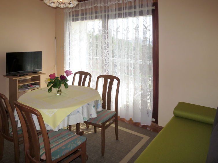 3-room apartment 55 m2 on 1st floor. Living/dining room with satellite TV (flat screen), air conditioning. Exit to the balcony. 1 room with 1 double bed (2 x 90 cm, length 200 cm). Exit to the balcony. 1 room with 2 beds (90 cm, length 200 cm). Open kitchen (4 hot plates, oven, toaster, kettle, freezer, electric coffee machine).