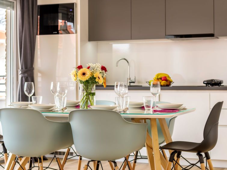 "Lavanda", 3-room apartment 69 m2 on 1st floor. Tasteful furnishings: living/dining room with 1 double sofabed (120 cm, length 200 cm), satellite TV (flat screen), air conditioning. Exit to the terrace. 2 rooms, each room with 1 french bed (180 cm, length 200 cm). Open kitchen (dishwasher, 2 ceramic glass hob hotplates, kettle, microwave, freezer).