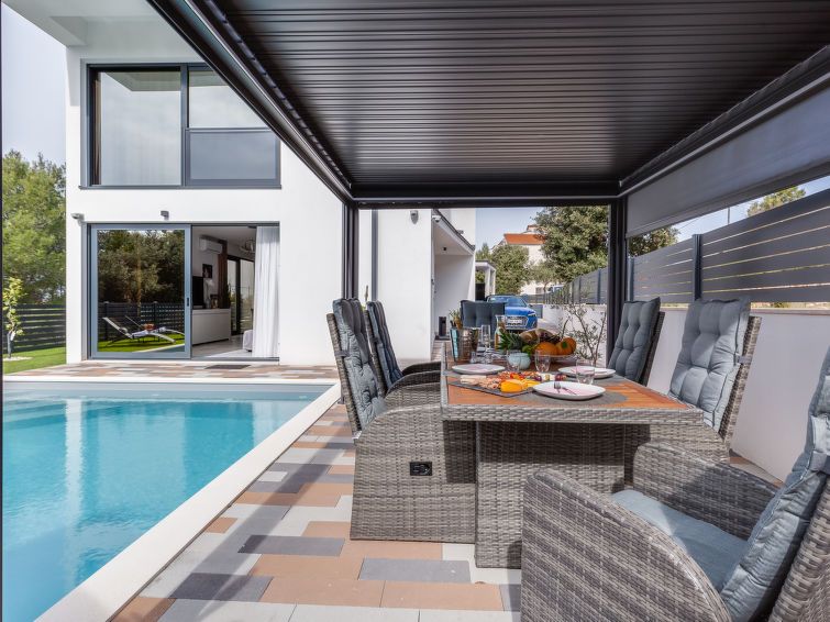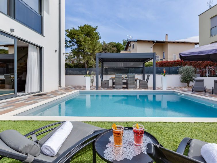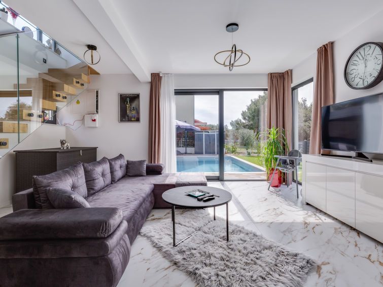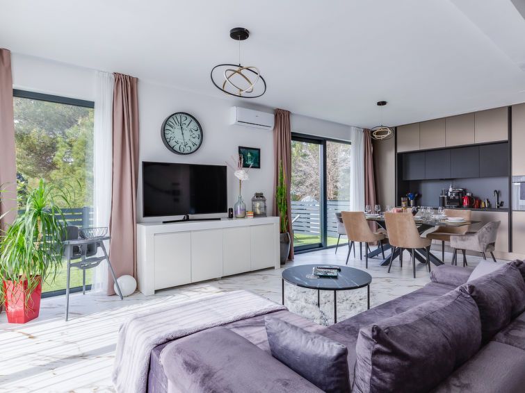 4-room terraced house 130 m2 on 3 levels, south-west facing position. Living/dining room 45 m2 with satellite TV (flat screen), air conditioning. Exit to the terrace. Open kitchen (oven, dishwasher, 4 induction hot plates, microwave, freezer, electric coffee machine). Shower/WC. On the lower ground floor: 1 room with 1 french bed (160 cm, length 200 cm).