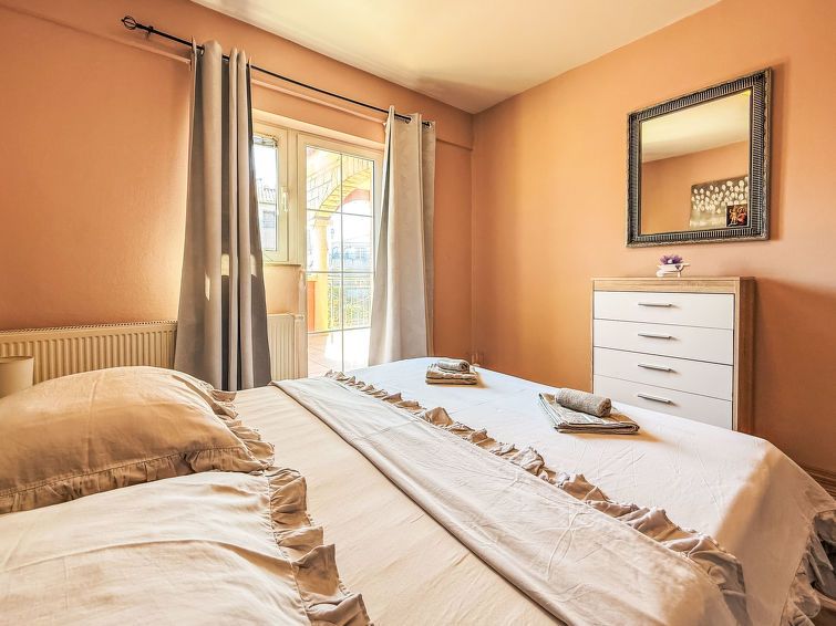4-room apartment 90 m2 on 1st floor, south-west facing position. Living/dining room 18 m2 with 1 sofabed (120 cm, length 200 cm), satellite TV (flat screen), air conditioning. Exit to the terrace. 2 rooms, each room with 1 french bed (155 cm, length 200 cm). 1 room with 1 bed (90 cm, length 200 cm).