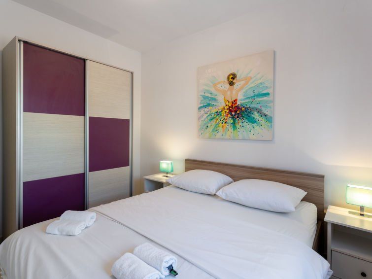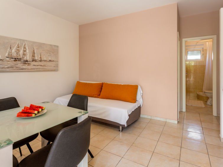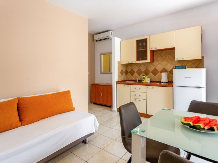 2-room apartment 35 m2, on the upper ground floor. Living/dining room with 1 double sofabed (155 cm, length 200 cm), satellite TV (flat screen), air conditioning. 1 room with 1 french bed (160 cm, length 200 cm). Open kitchen (2 hot plates, toaster, kettle, electric coffee machine).