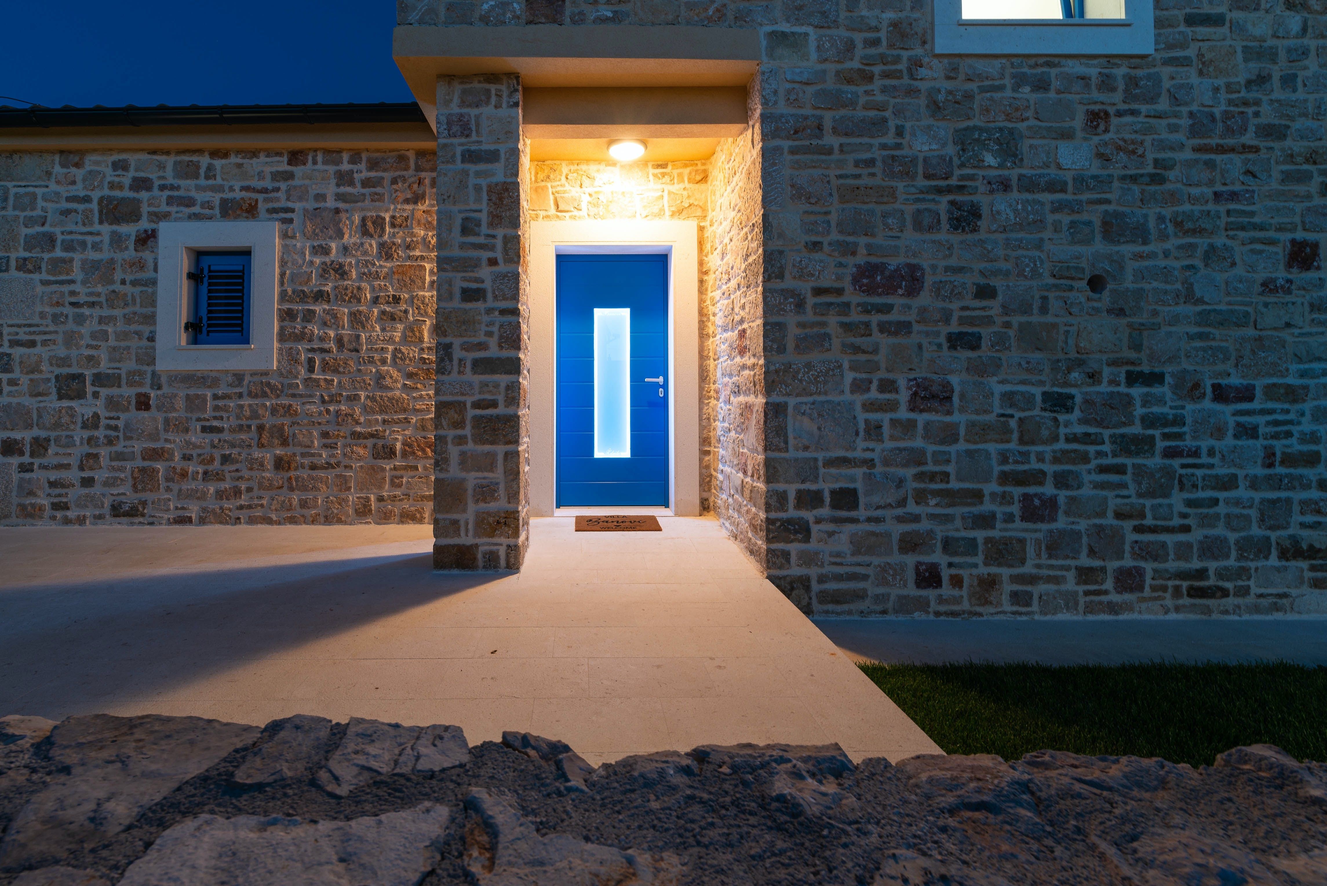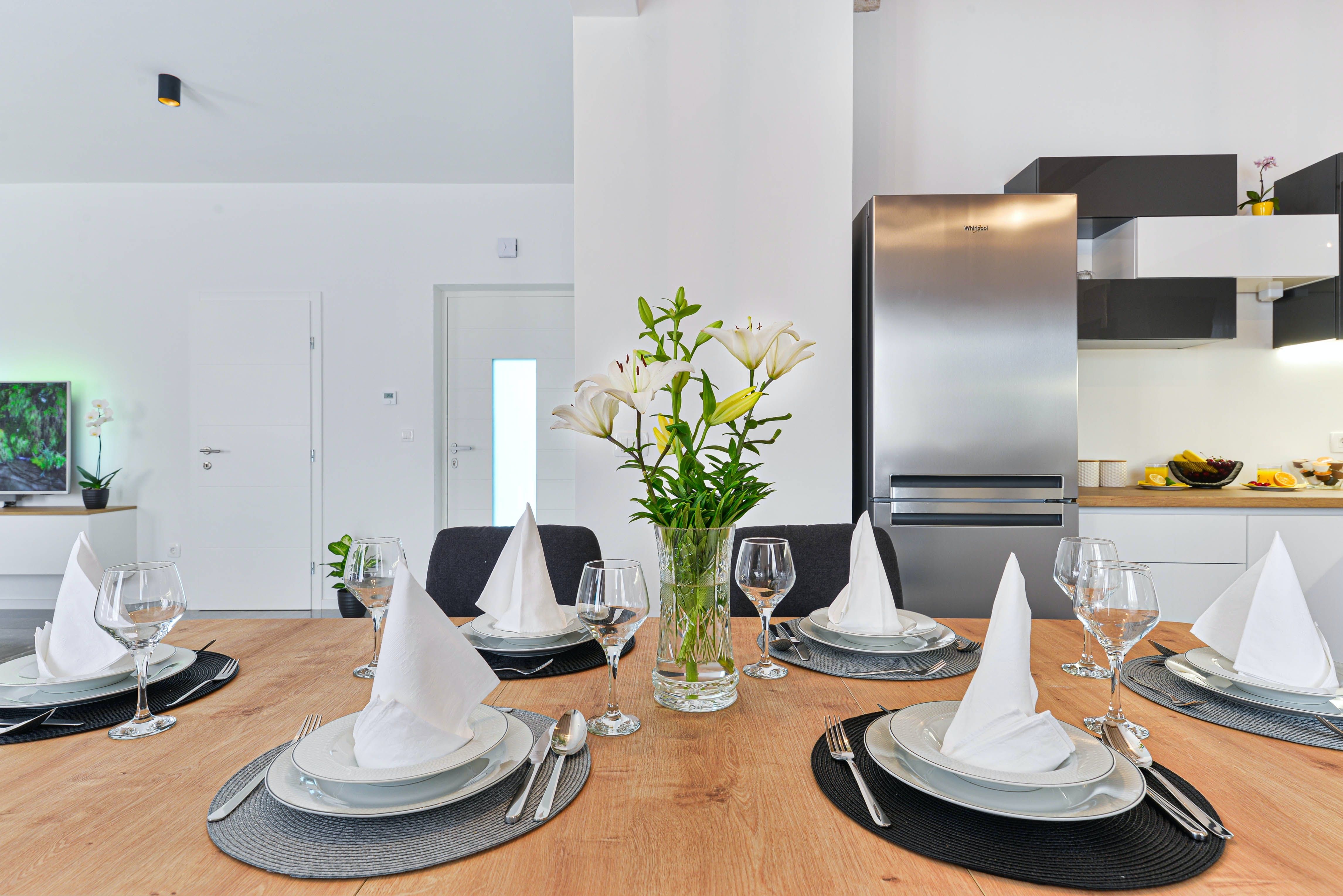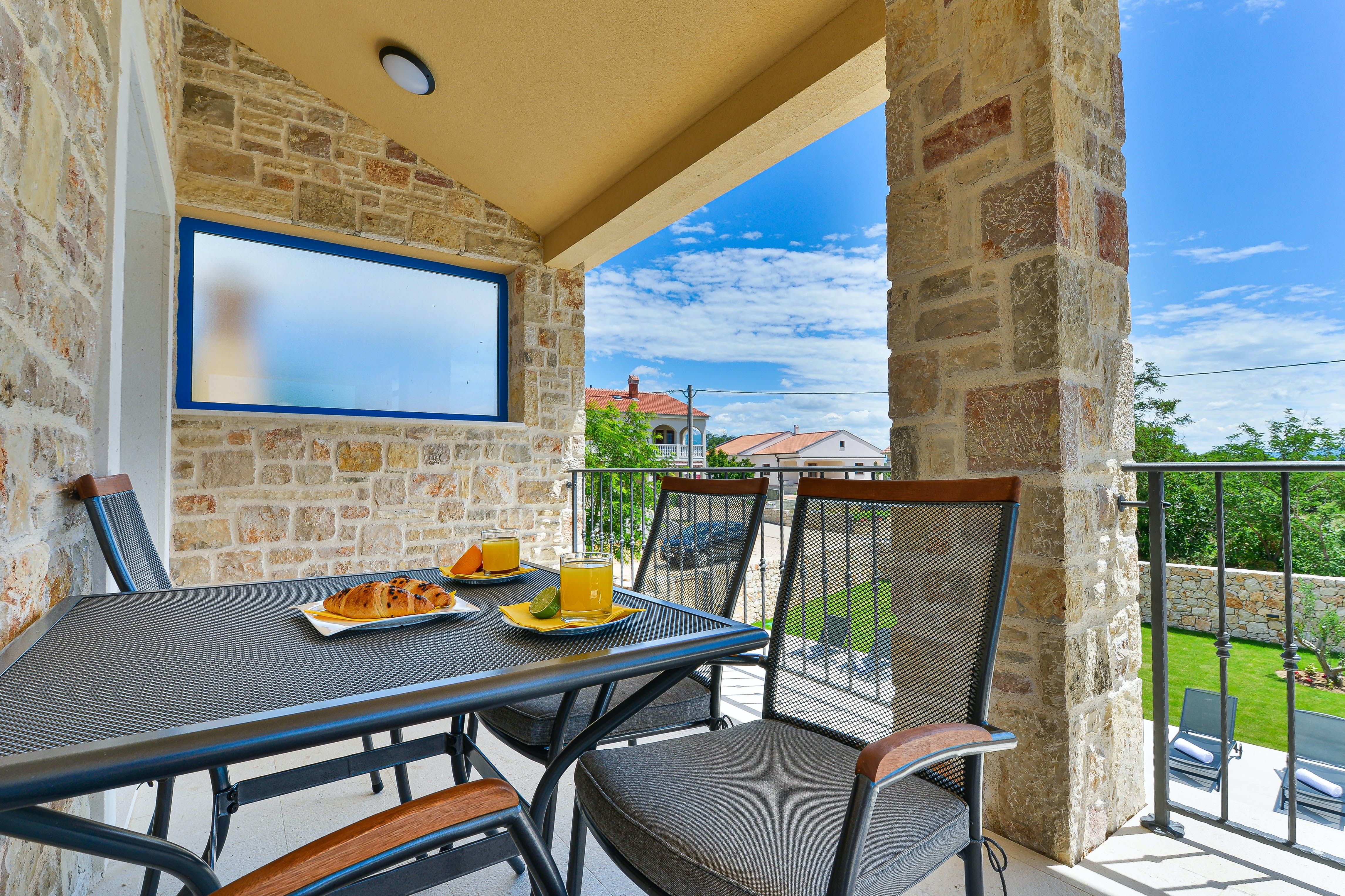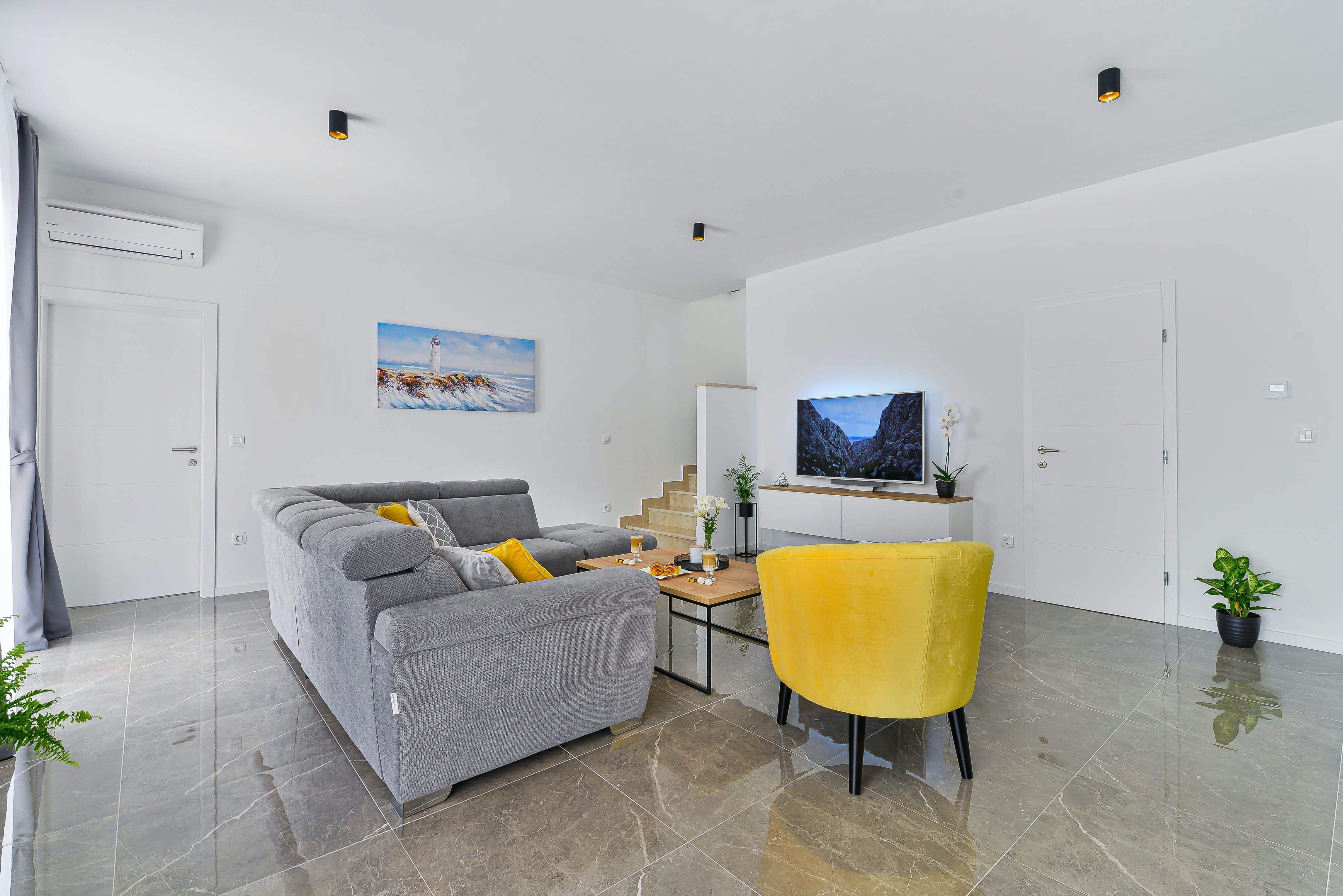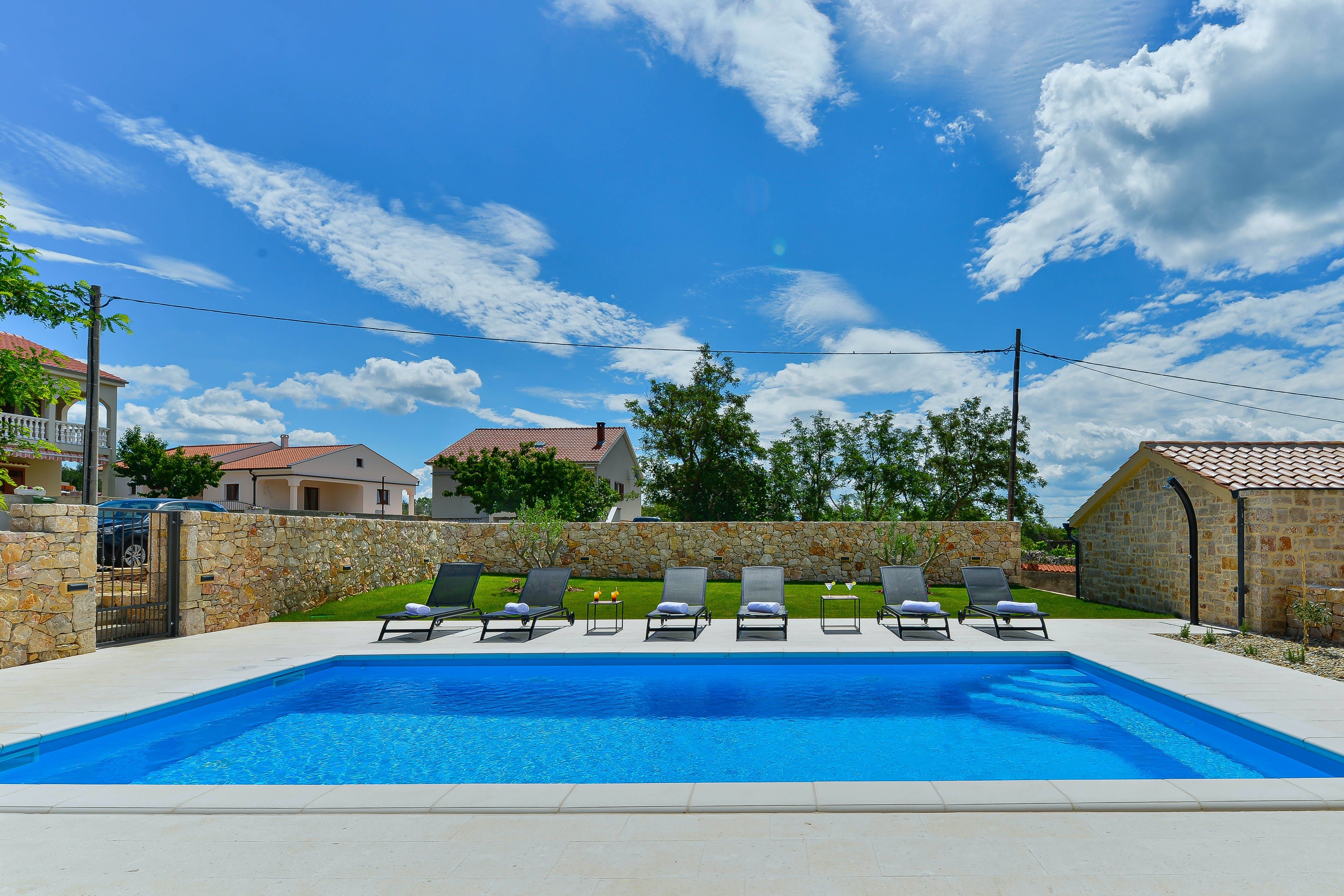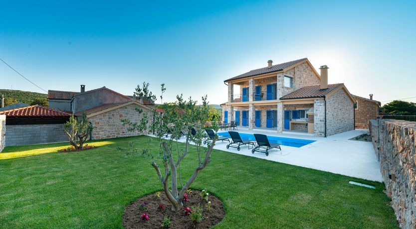 This charming stone villa is located near the sea and offers a versatile equipment that will delight guests. The 400 m² fenced plot includes lawns, terraces, and gravel areas, as well as a heated pool with comfortable stair entry, hydromassage function, and pool towels provided. Sports enthusiasts can enjoy badminton equipment, soccer goals, and a basketball hoop. The covered terrace with summer kitchen and barbecue is perfect for evening gatherings, while the furnished balcony on the first floor offers another attractive spot. Inside, the villa features a trendy design with white decor, large high-gloss tiles, and underfloor heating throughout. The living area is openly connected to the fully-equipped kitchen with dining table. Guests can relax on the sofa (which can be used as a sofa bed for two if required) in front of the TV or in one of the three air-conditioned double bedrooms with en suite shower rooms. The villa is perfect for families seeking relaxing vacations in a prime location.