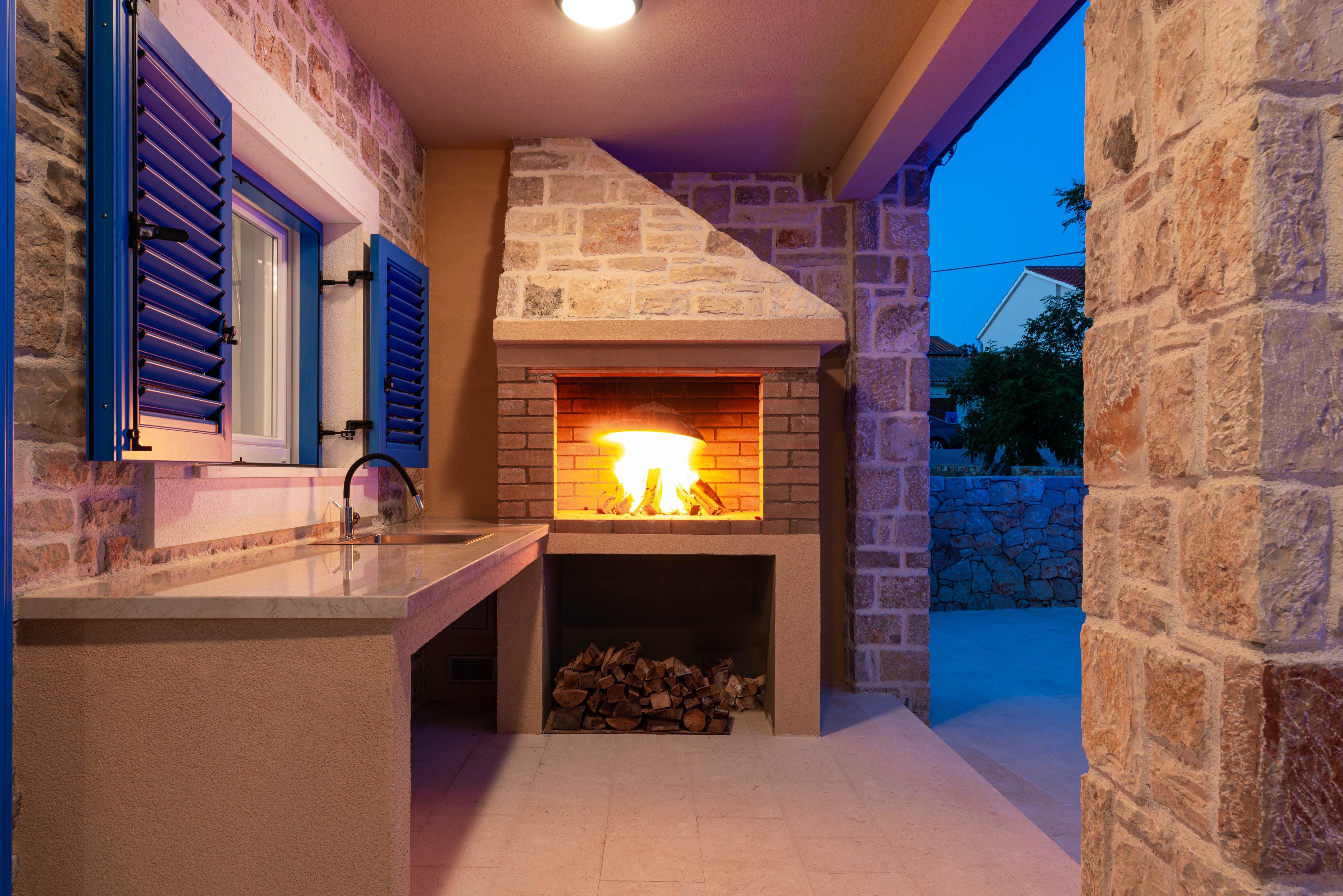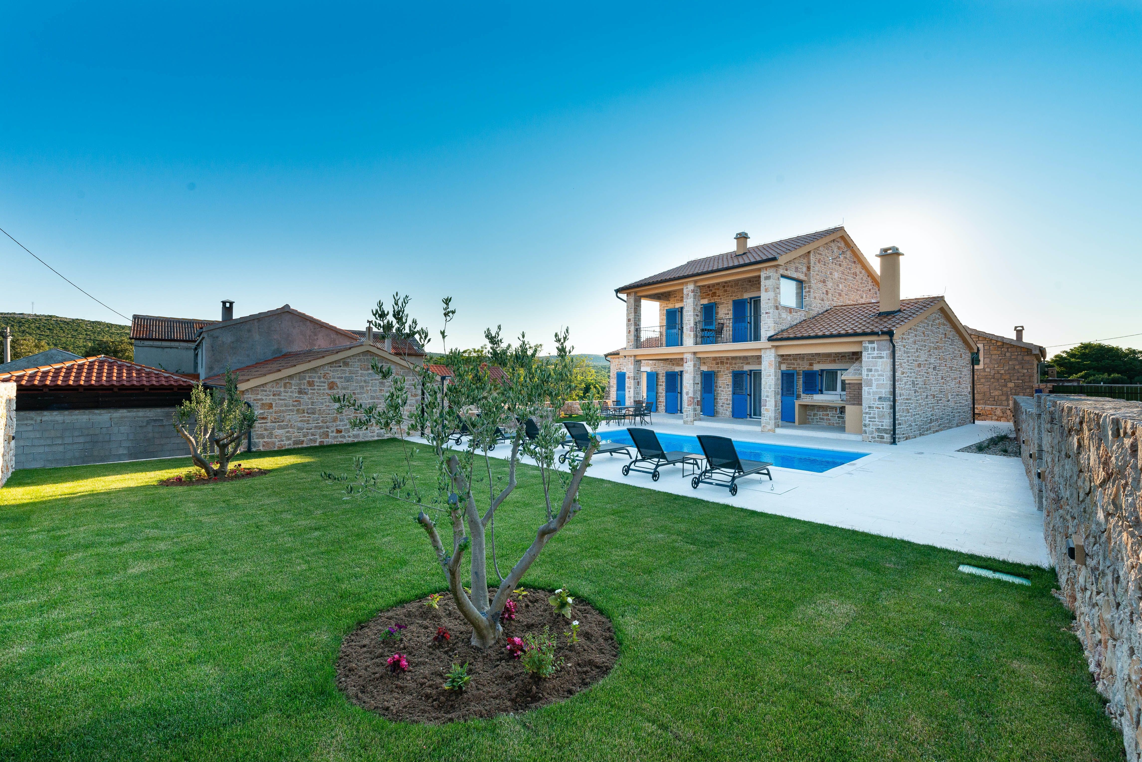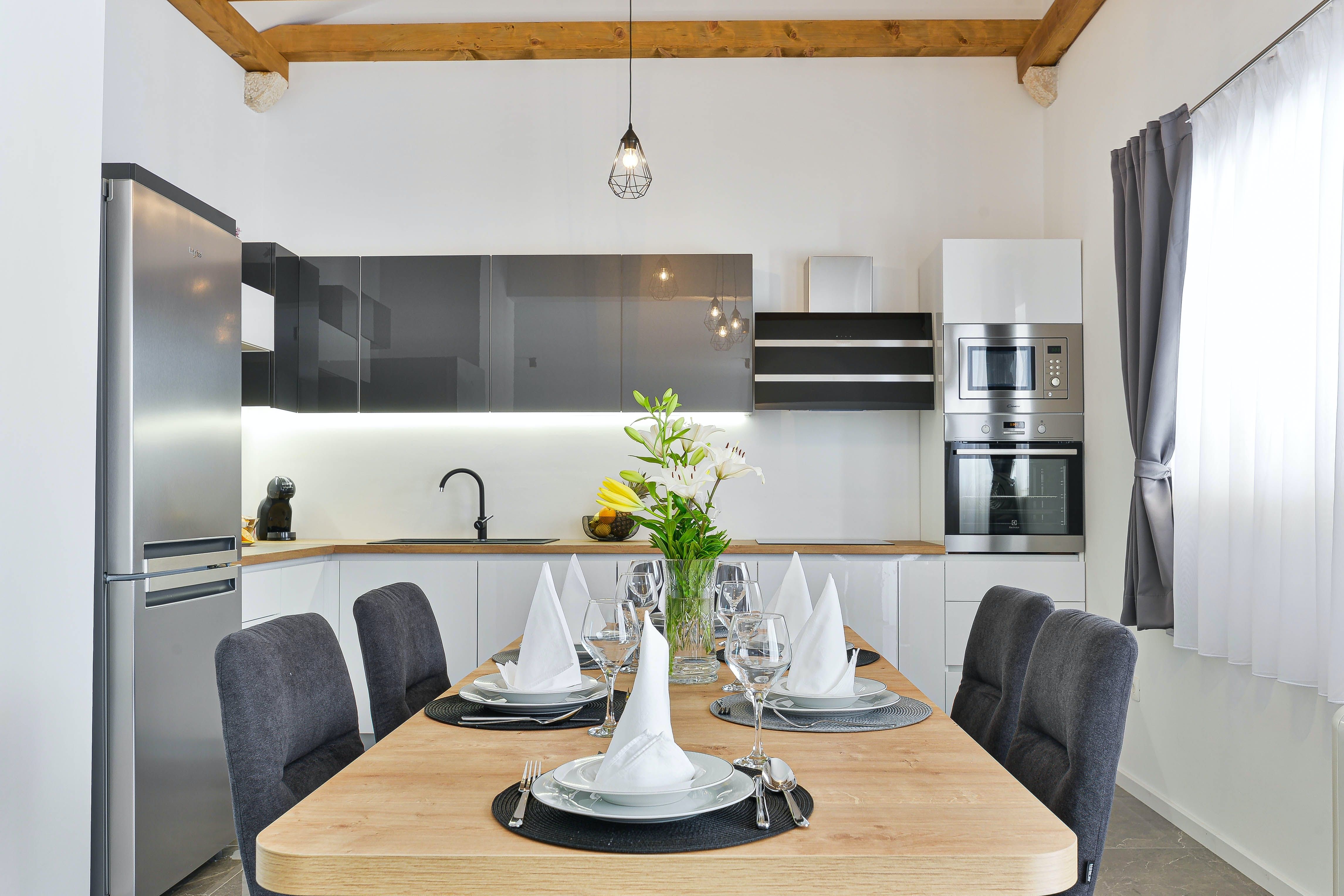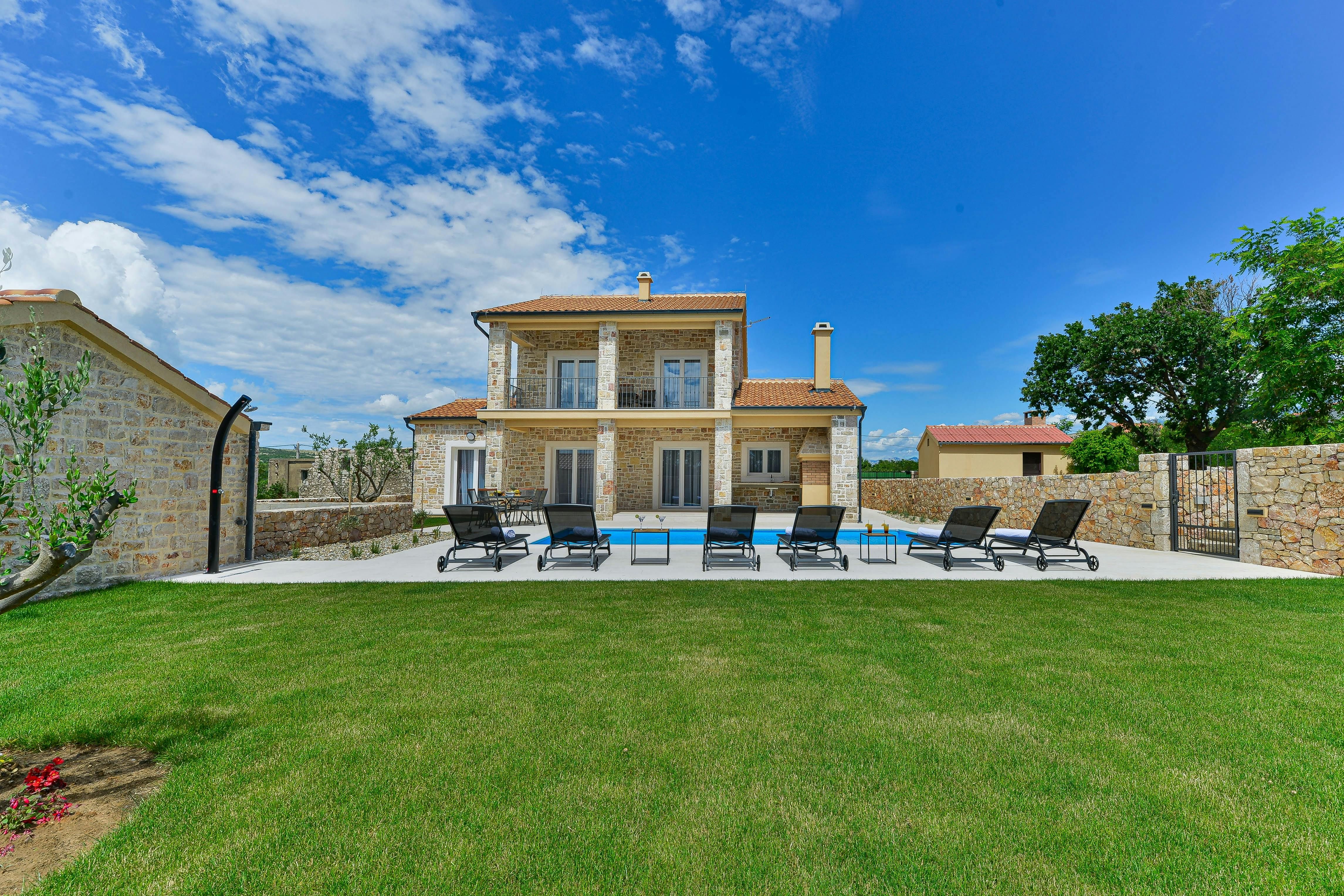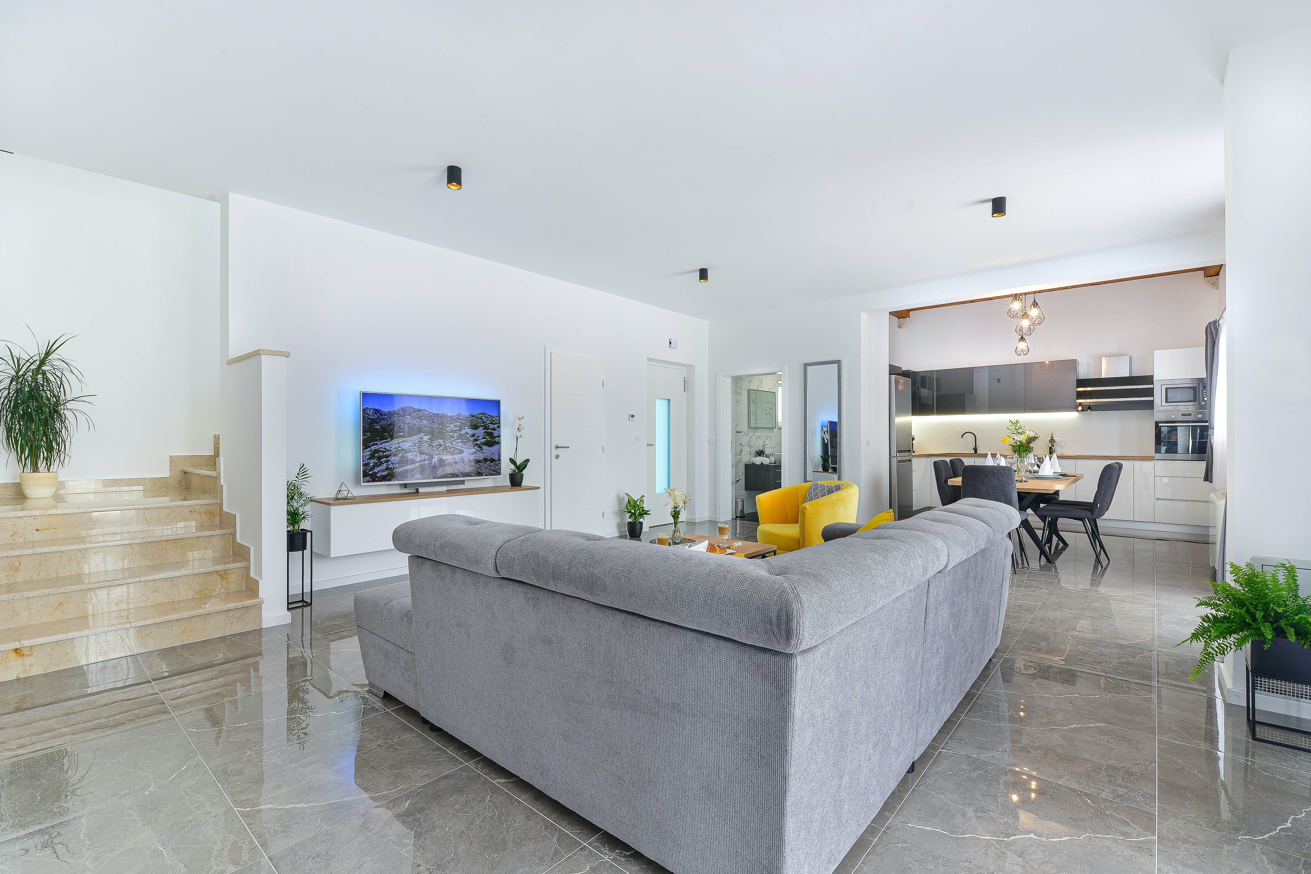 This charming stone villa is located near the sea and offers a versatile equipment that will delight guests. The 400 m² fenced plot includes lawns, terraces, and gravel areas, as well as a heated pool with comfortable stair entry, hydromassage function, and pool towels provided. Sports enthusiasts can enjoy badminton equipment, soccer goals, and a basketball hoop. The covered terrace with summer kitchen and barbecue is perfect for evening gatherings, while the furnished balcony on the first floor offers another attractive spot. Inside, the villa features a trendy design with white decor, large high-gloss tiles, and underfloor heating throughout. The living area is openly connected to the fully-equipped kitchen with dining table. Guests can relax on the sofa (which can be used as a sofa bed for two if required) in front of the TV or in one of the three air-conditioned double bedrooms with en suite shower rooms. The villa is perfect for families seeking relaxing vacations in a prime location.