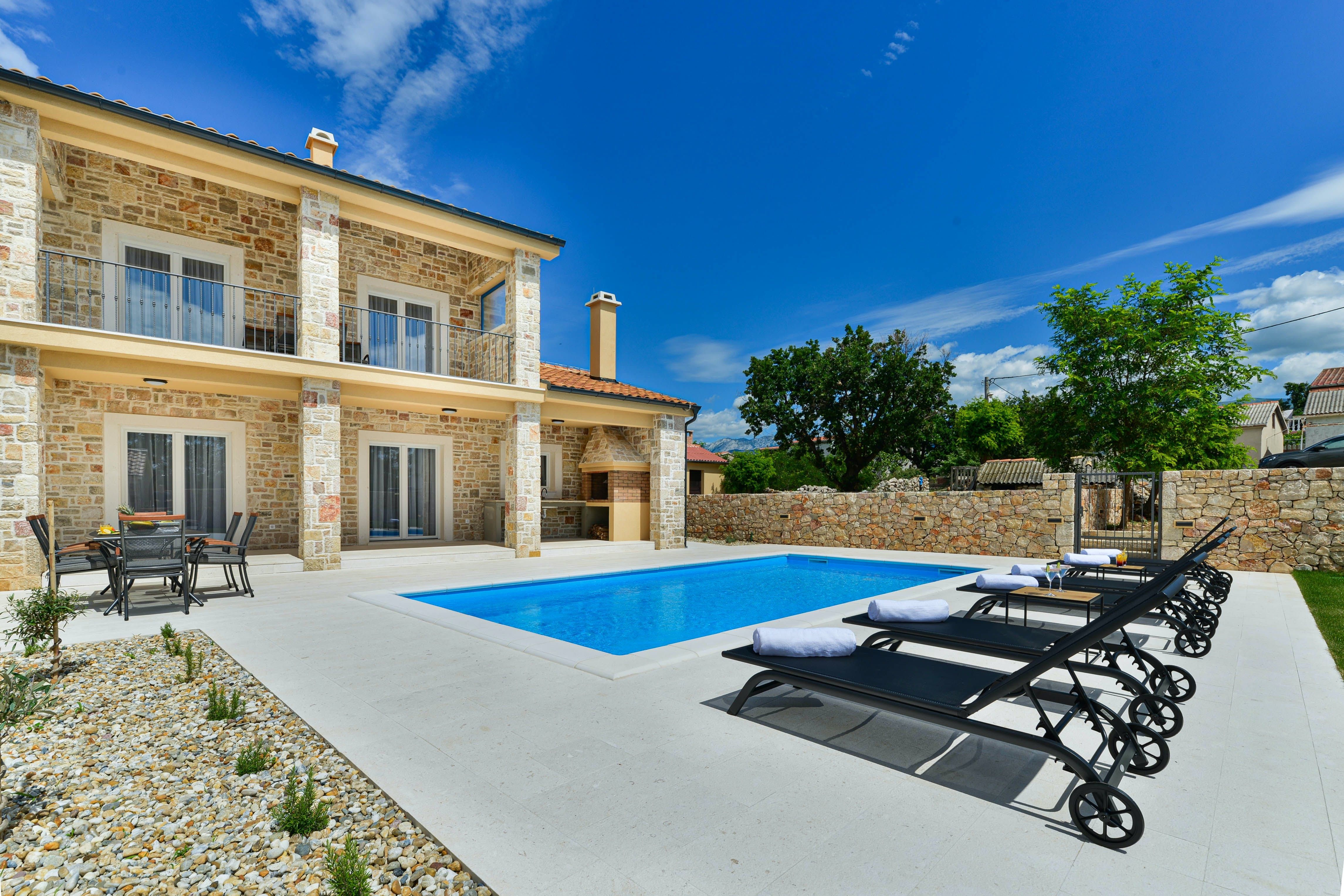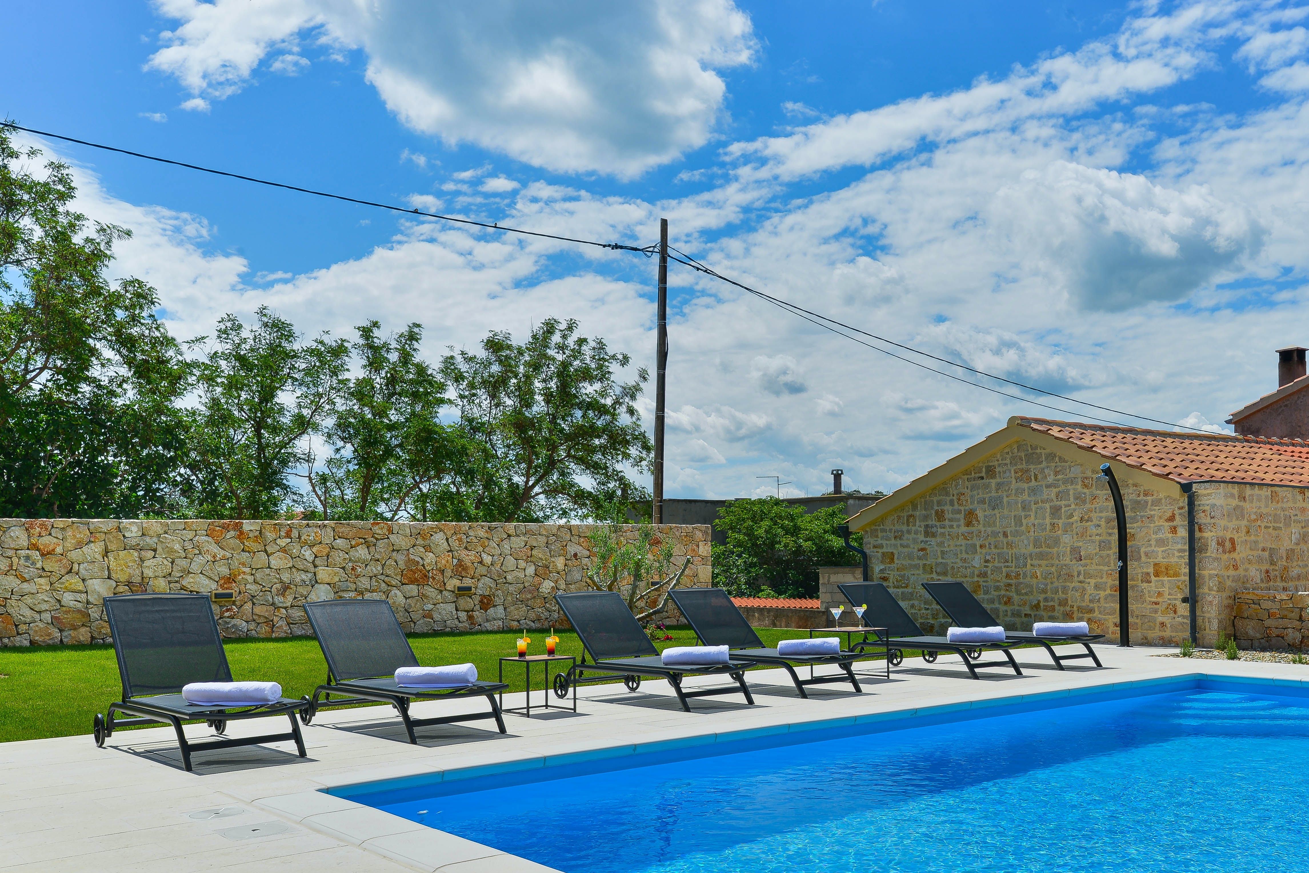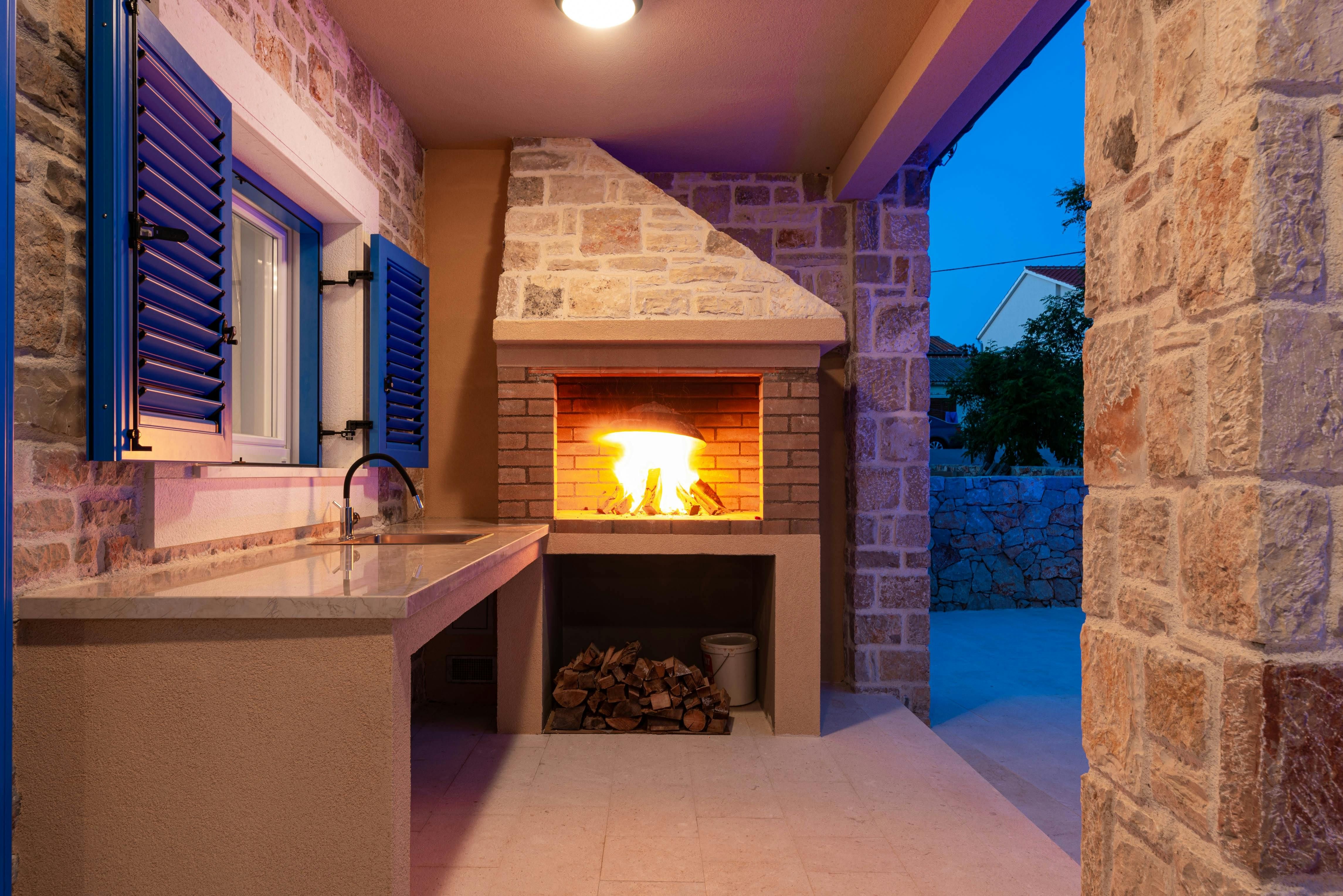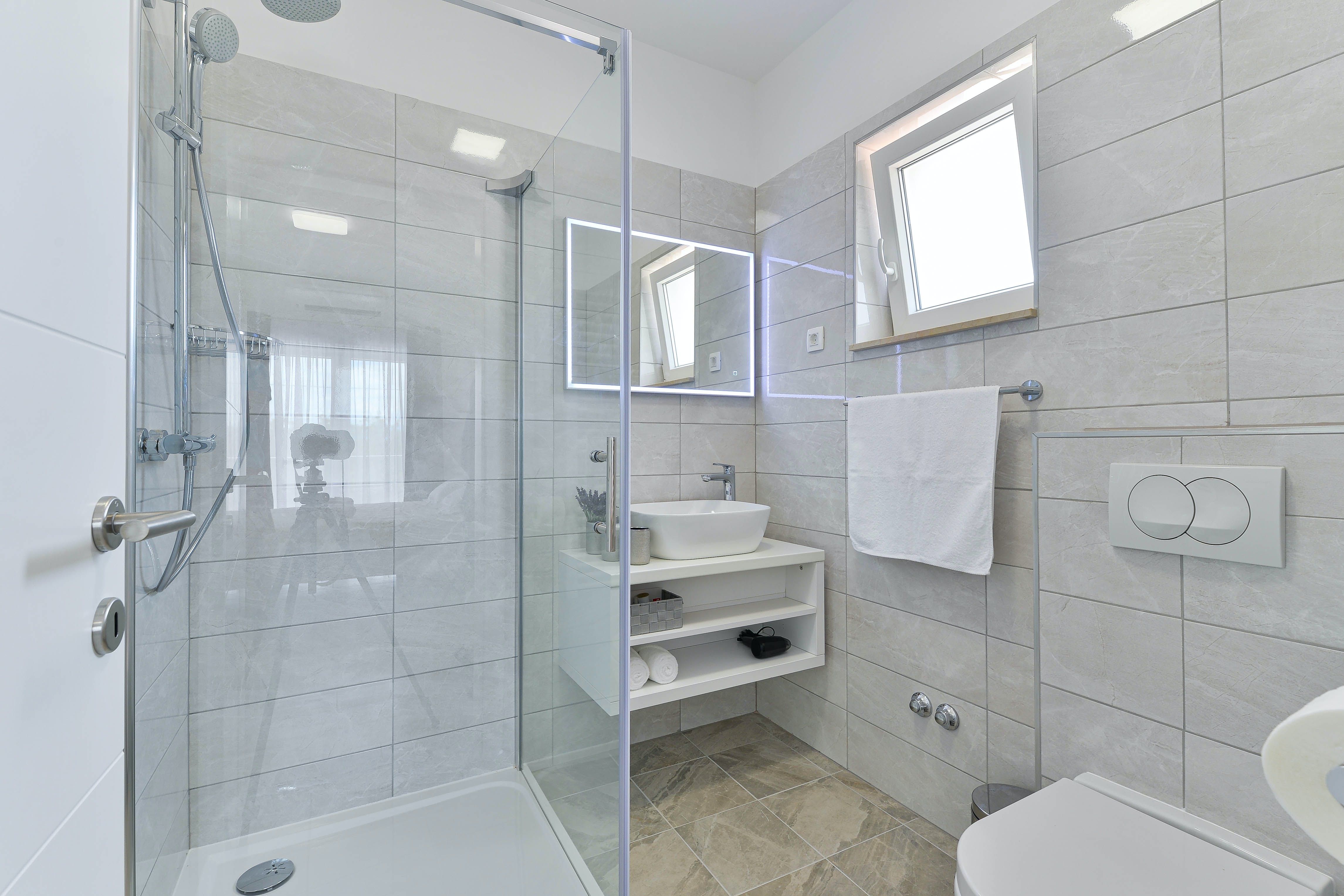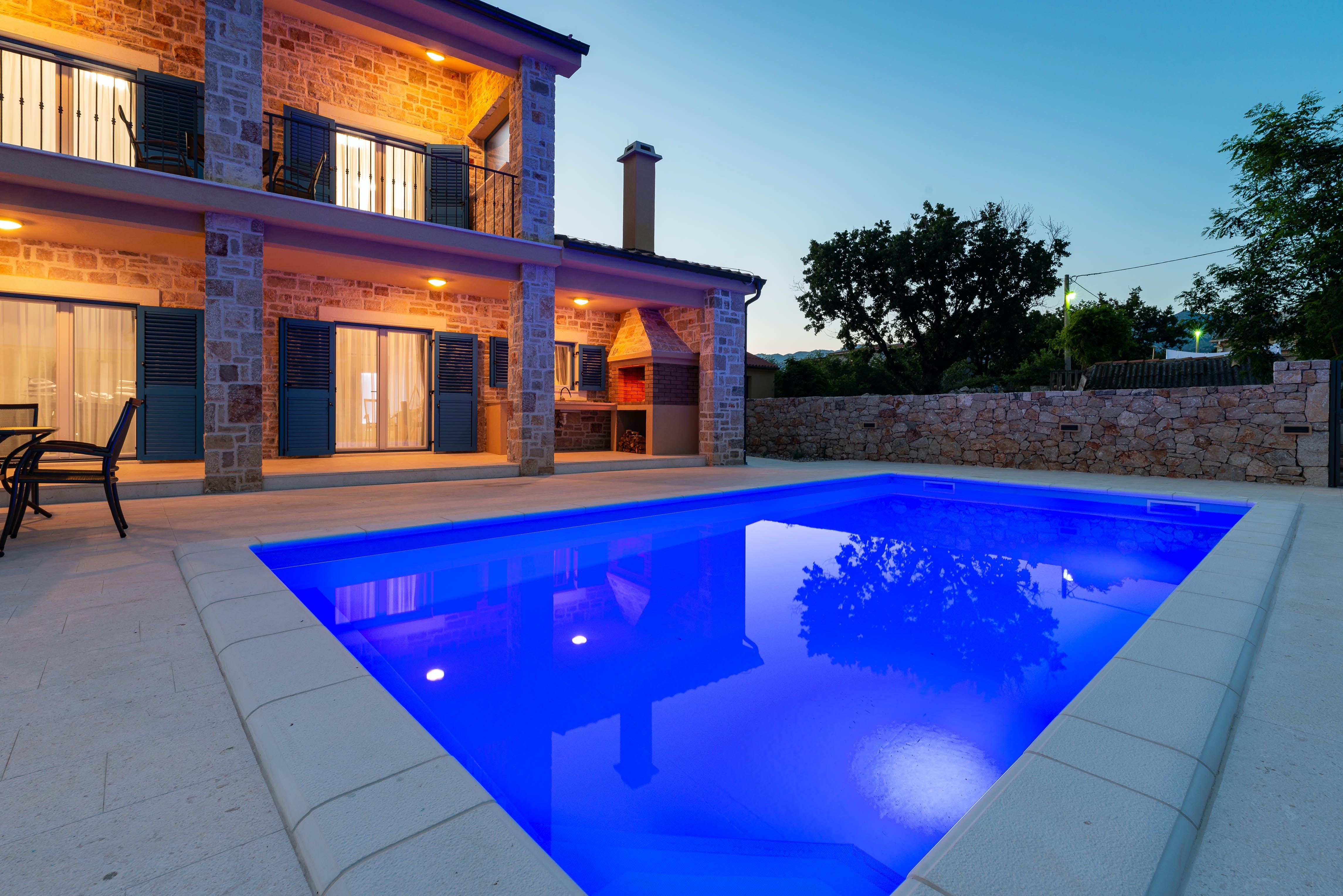 This charming stone villa is located near the sea and offers a versatile equipment that will delight guests. The 400 m² fenced plot includes lawns, terraces, and gravel areas, as well as a heated pool with comfortable stair entry, hydromassage function, and pool towels provided. Sports enthusiasts can enjoy badminton equipment, soccer goals, and a basketball hoop. The covered terrace with summer kitchen and barbecue is perfect for evening gatherings, while the furnished balcony on the first floor offers another attractive spot. Inside, the villa features a trendy design with white decor, large high-gloss tiles, and underfloor heating throughout. The living area is openly connected to the fully-equipped kitchen with dining table. Guests can relax on the sofa (which can be used as a sofa bed for two if required) in front of the TV or in one of the three air-conditioned double bedrooms with en suite shower rooms. The villa is perfect for families seeking relaxing vacations in a prime location.