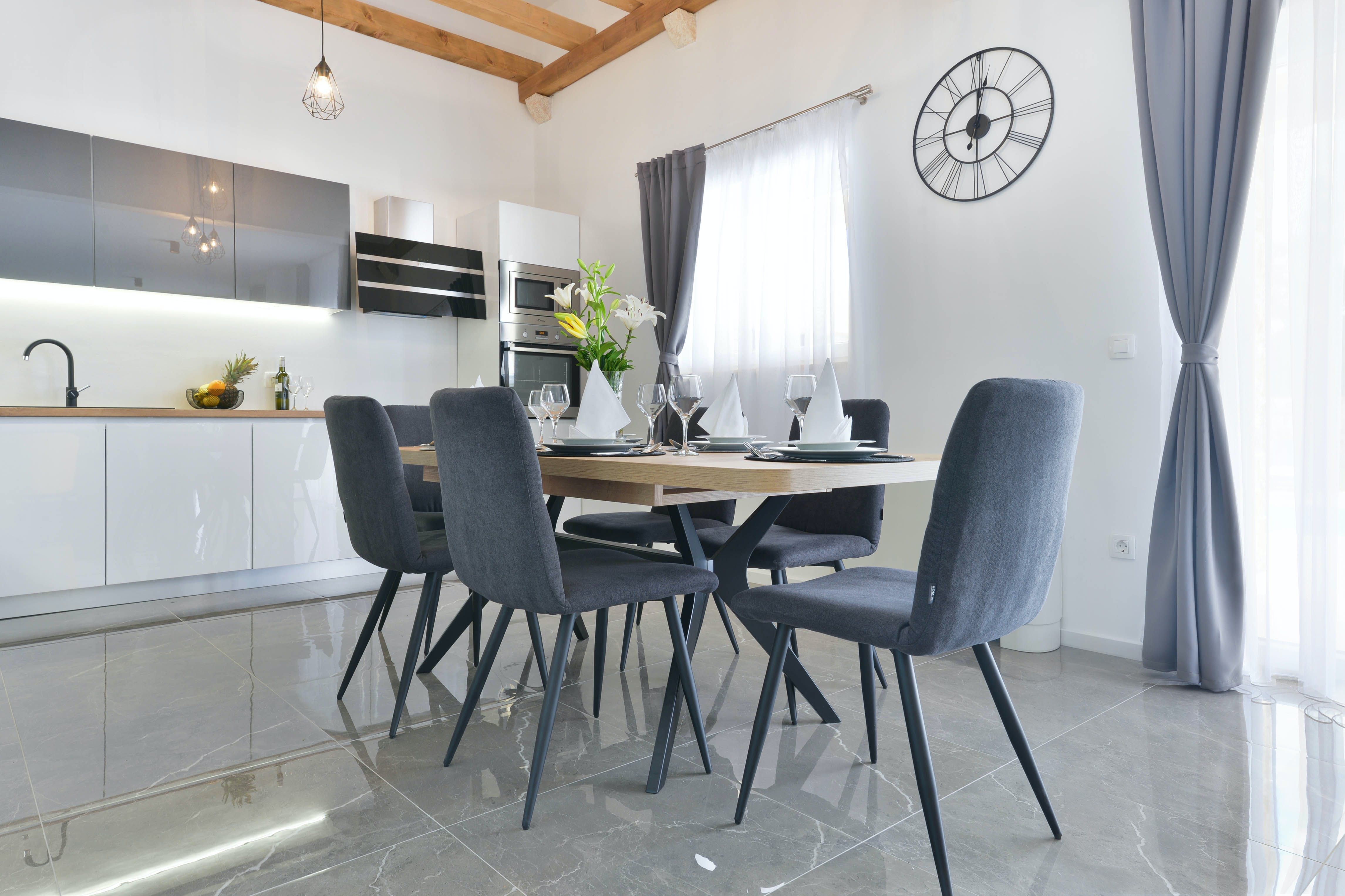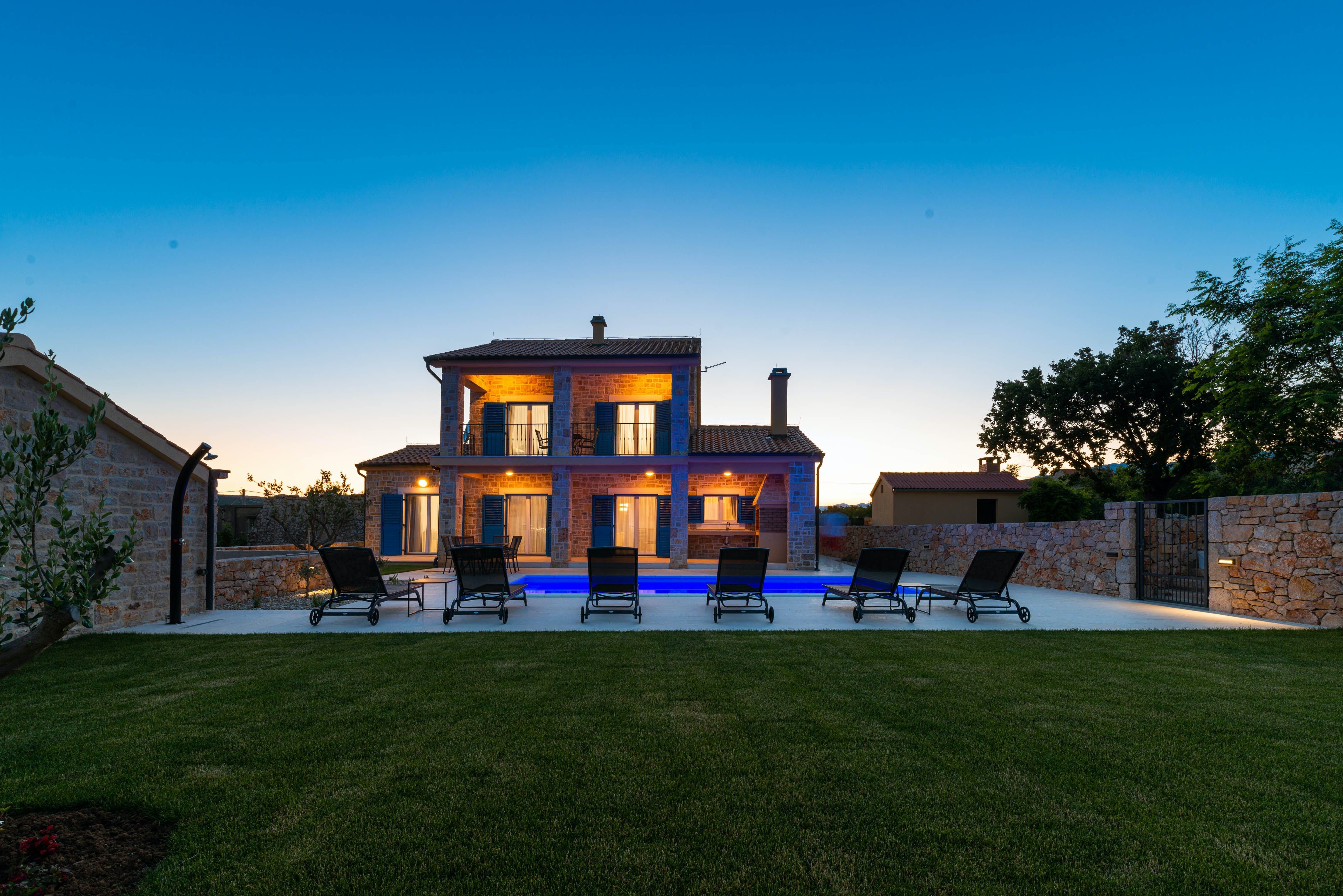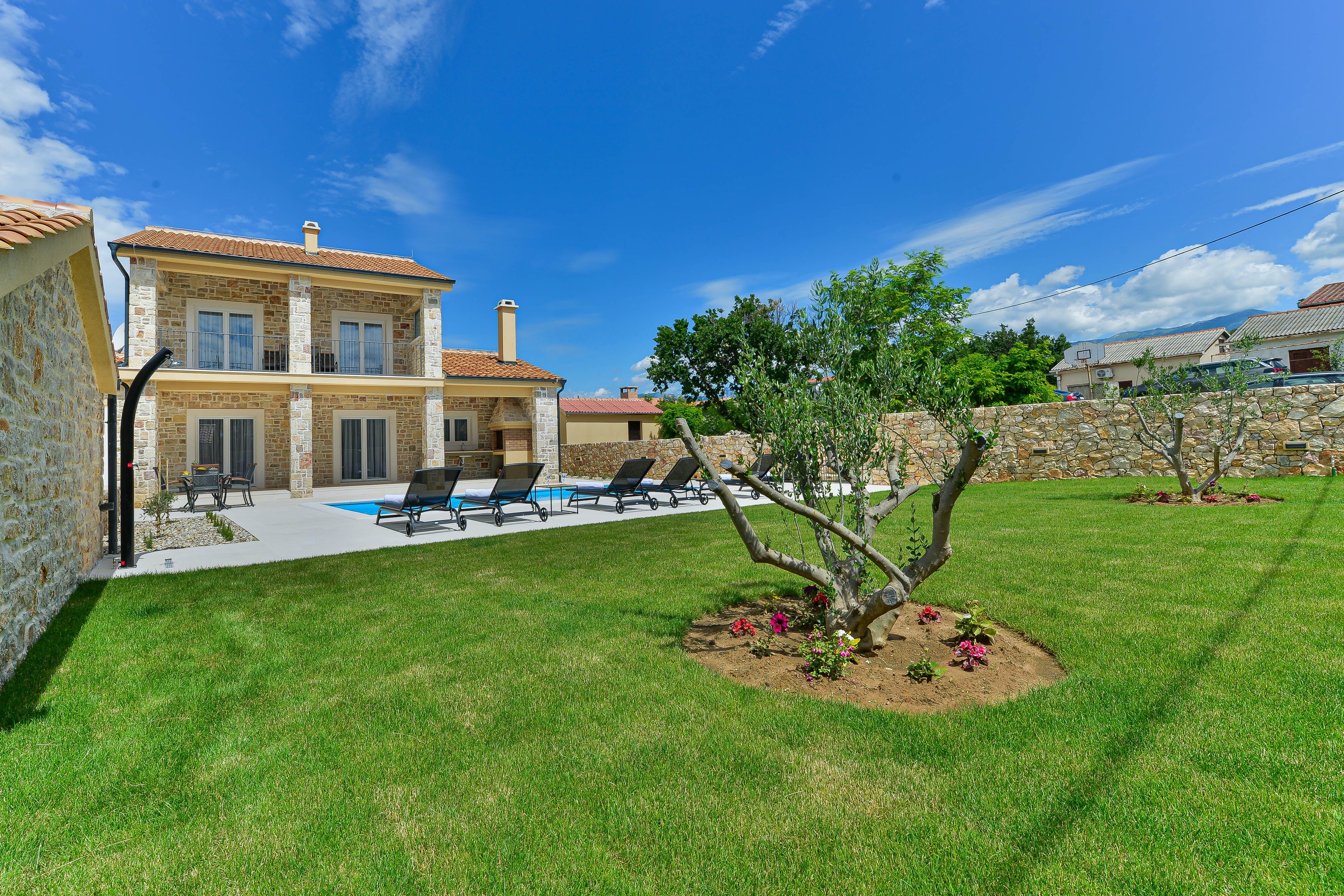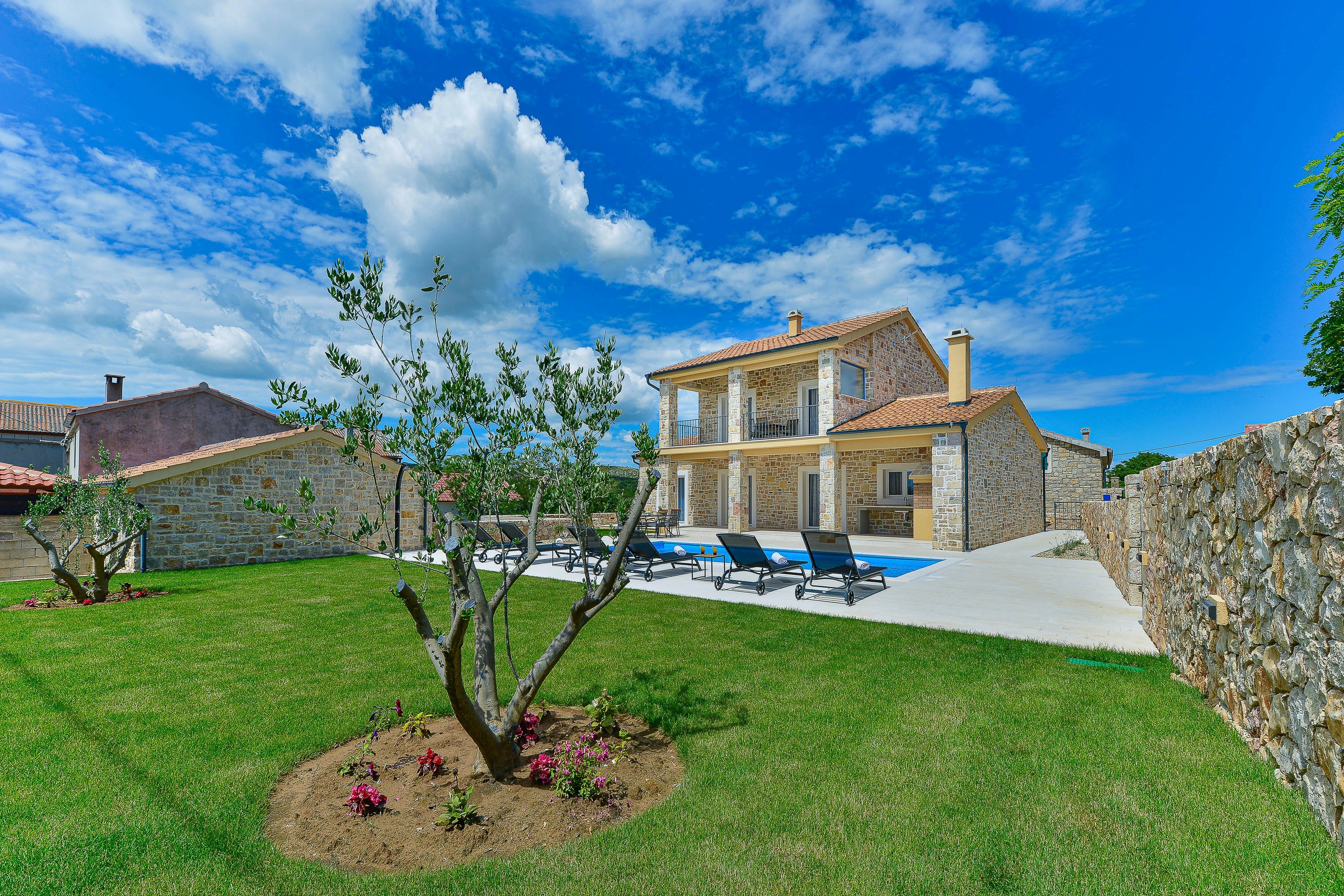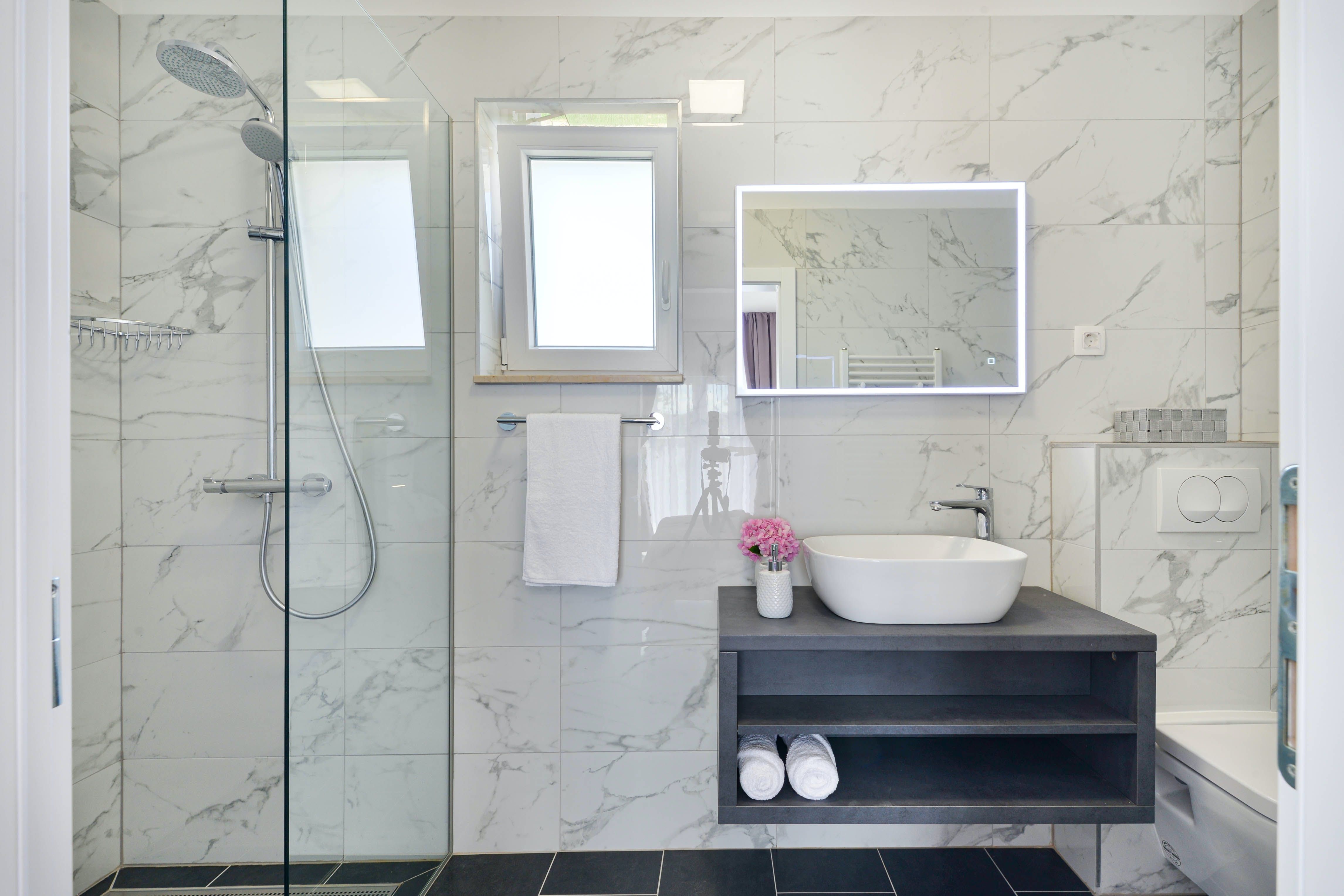 This charming stone villa is located near the sea and offers a versatile equipment that will delight guests. The 400 m² fenced plot includes lawns, terraces, and gravel areas, as well as a heated pool with comfortable stair entry, hydromassage function, and pool towels provided. Sports enthusiasts can enjoy badminton equipment, soccer goals, and a basketball hoop. The covered terrace with summer kitchen and barbecue is perfect for evening gatherings, while the furnished balcony on the first floor offers another attractive spot. Inside, the villa features a trendy design with white decor, large high-gloss tiles, and underfloor heating throughout. The living area is openly connected to the fully-equipped kitchen with dining table. Guests can relax on the sofa (which can be used as a sofa bed for two if required) in front of the TV or in one of the three air-conditioned double bedrooms with en suite shower rooms. The villa is perfect for families seeking relaxing vacations in a prime location.