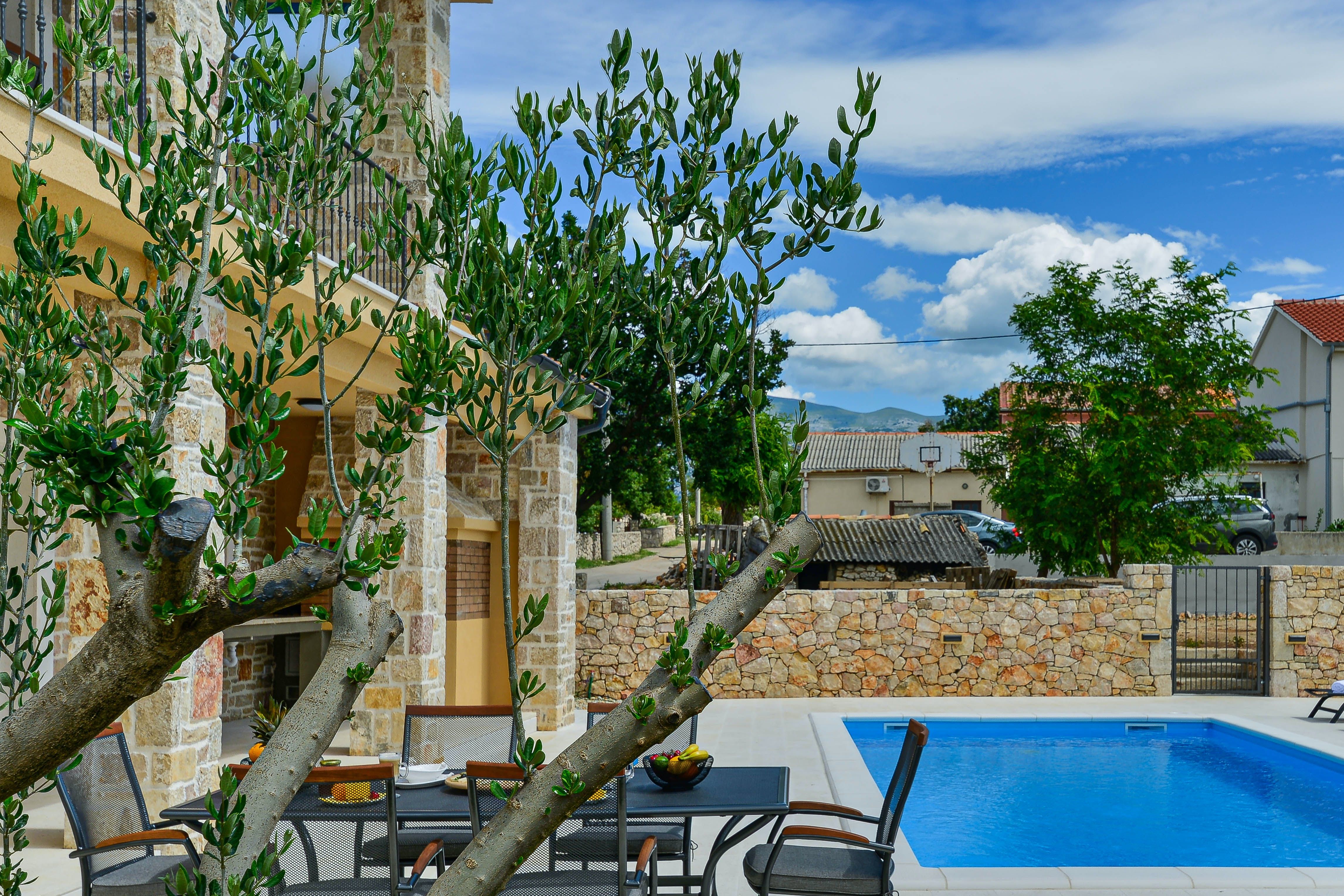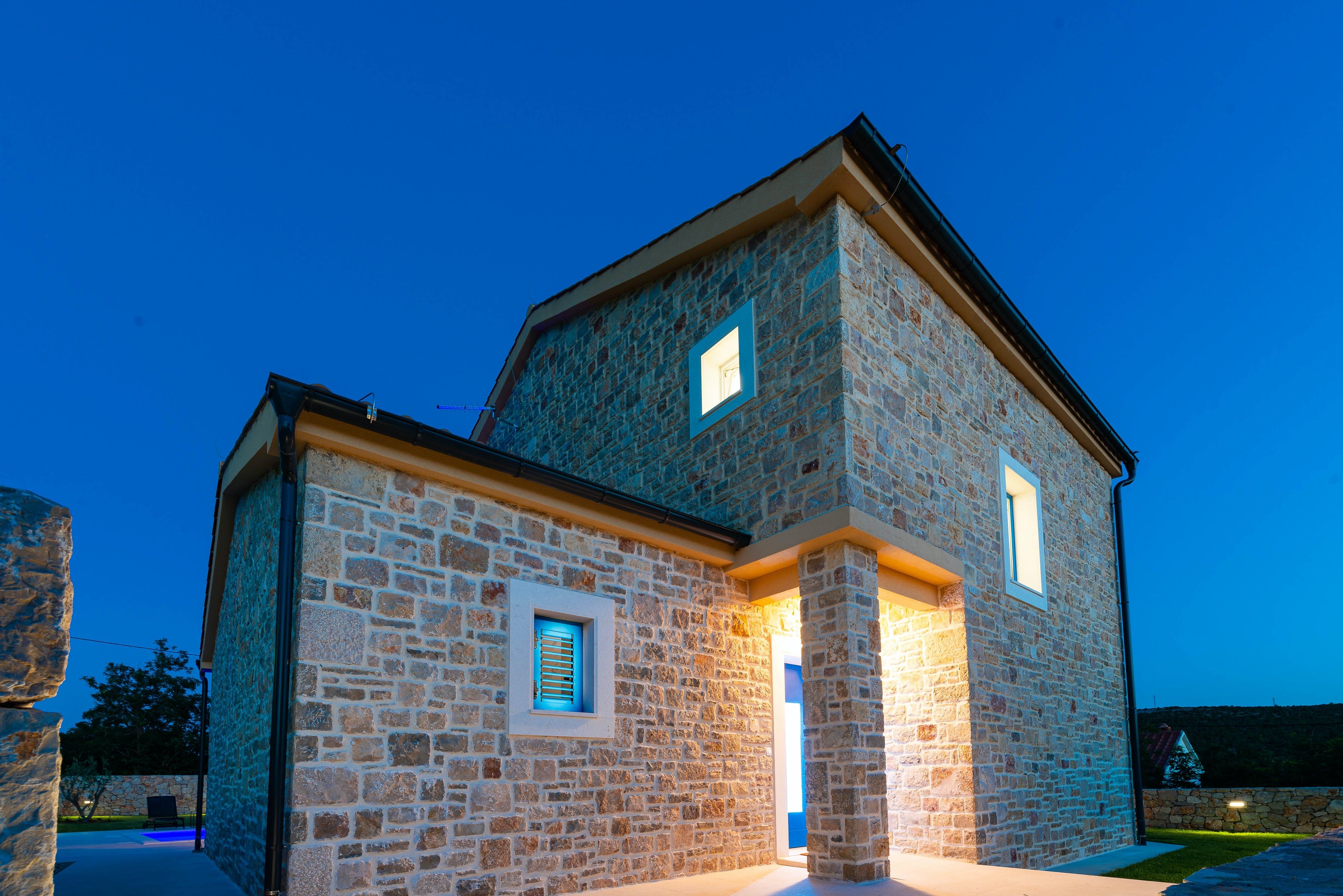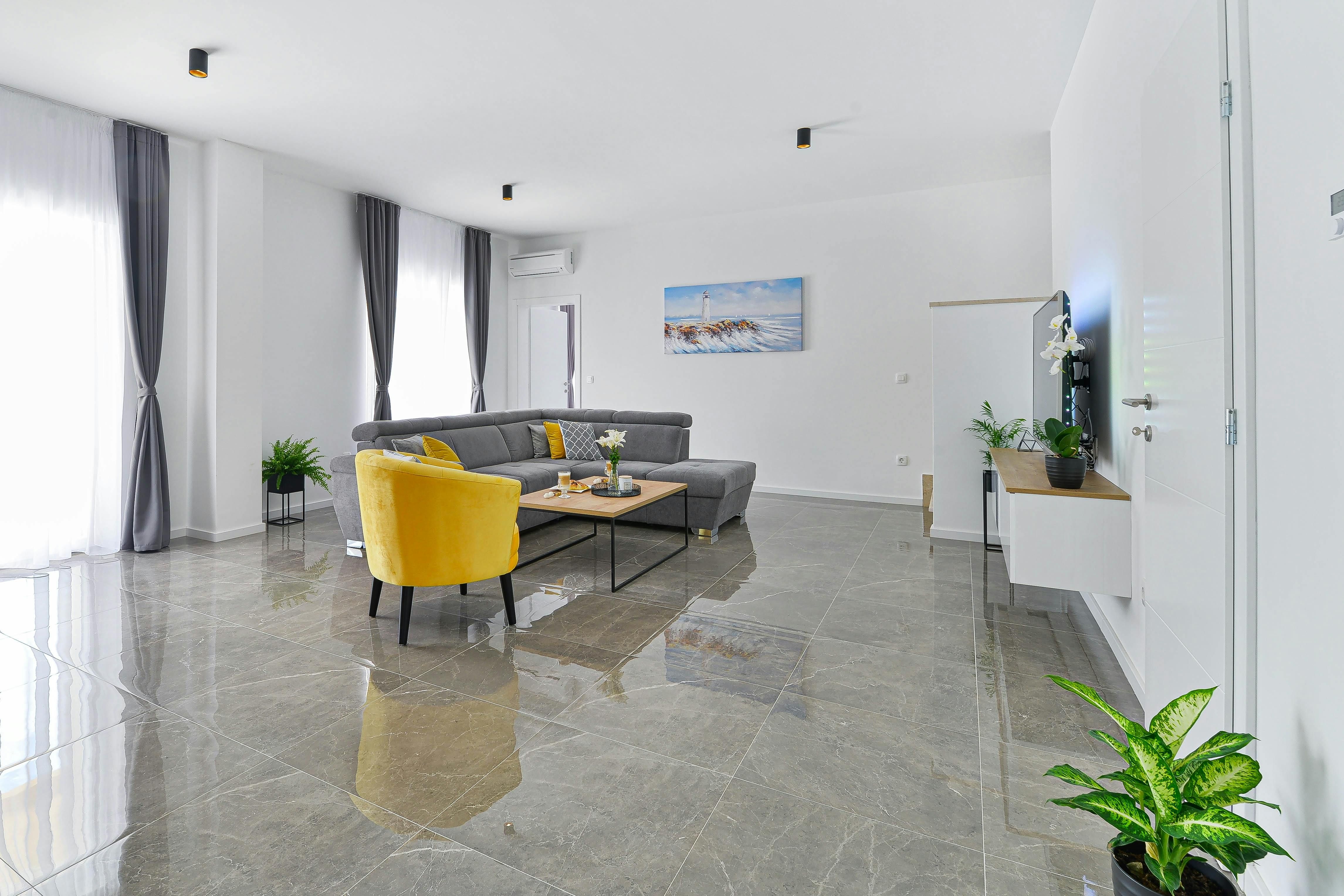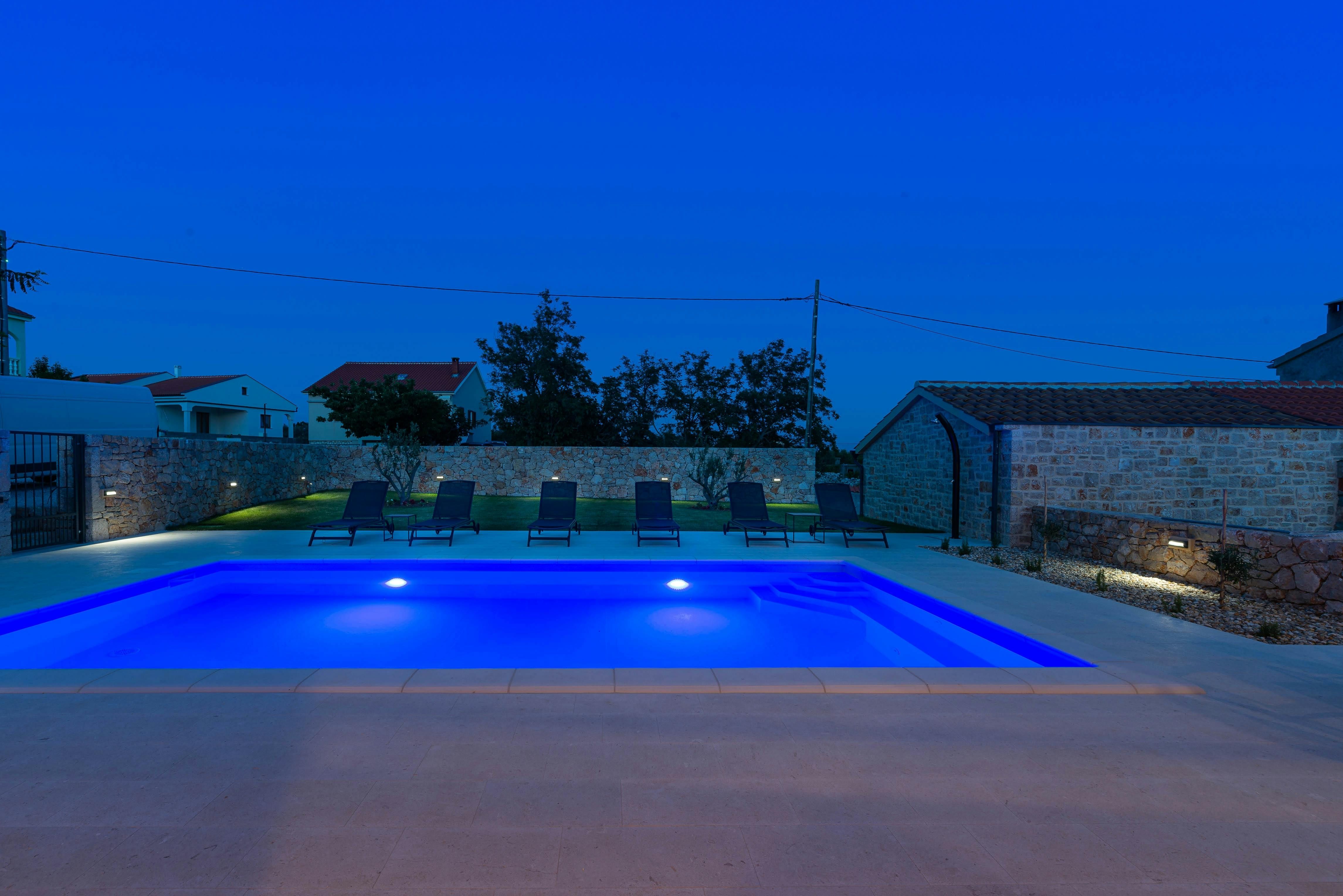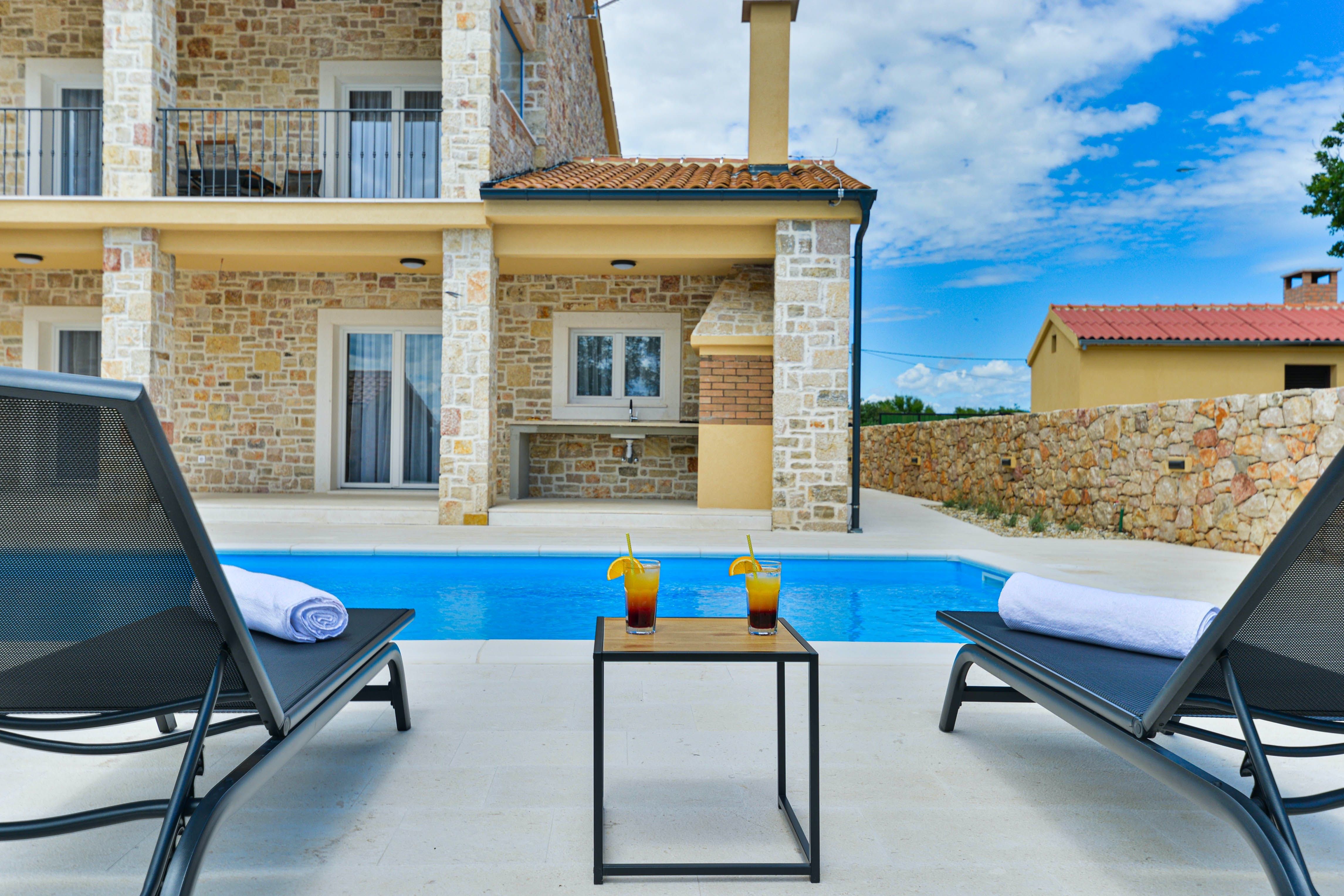 This charming stone villa is located near the sea and offers a versatile equipment that will delight guests. The 400 m² fenced plot includes lawns, terraces, and gravel areas, as well as a heated pool with comfortable stair entry, hydromassage function, and pool towels provided. Sports enthusiasts can enjoy badminton equipment, soccer goals, and a basketball hoop. The covered terrace with summer kitchen and barbecue is perfect for evening gatherings, while the furnished balcony on the first floor offers another attractive spot. Inside, the villa features a trendy design with white decor, large high-gloss tiles, and underfloor heating throughout. The living area is openly connected to the fully-equipped kitchen with dining table. Guests can relax on the sofa (which can be used as a sofa bed for two if required) in front of the TV or in one of the three air-conditioned double bedrooms with en suite shower rooms. The villa is perfect for families seeking relaxing vacations in a prime location.