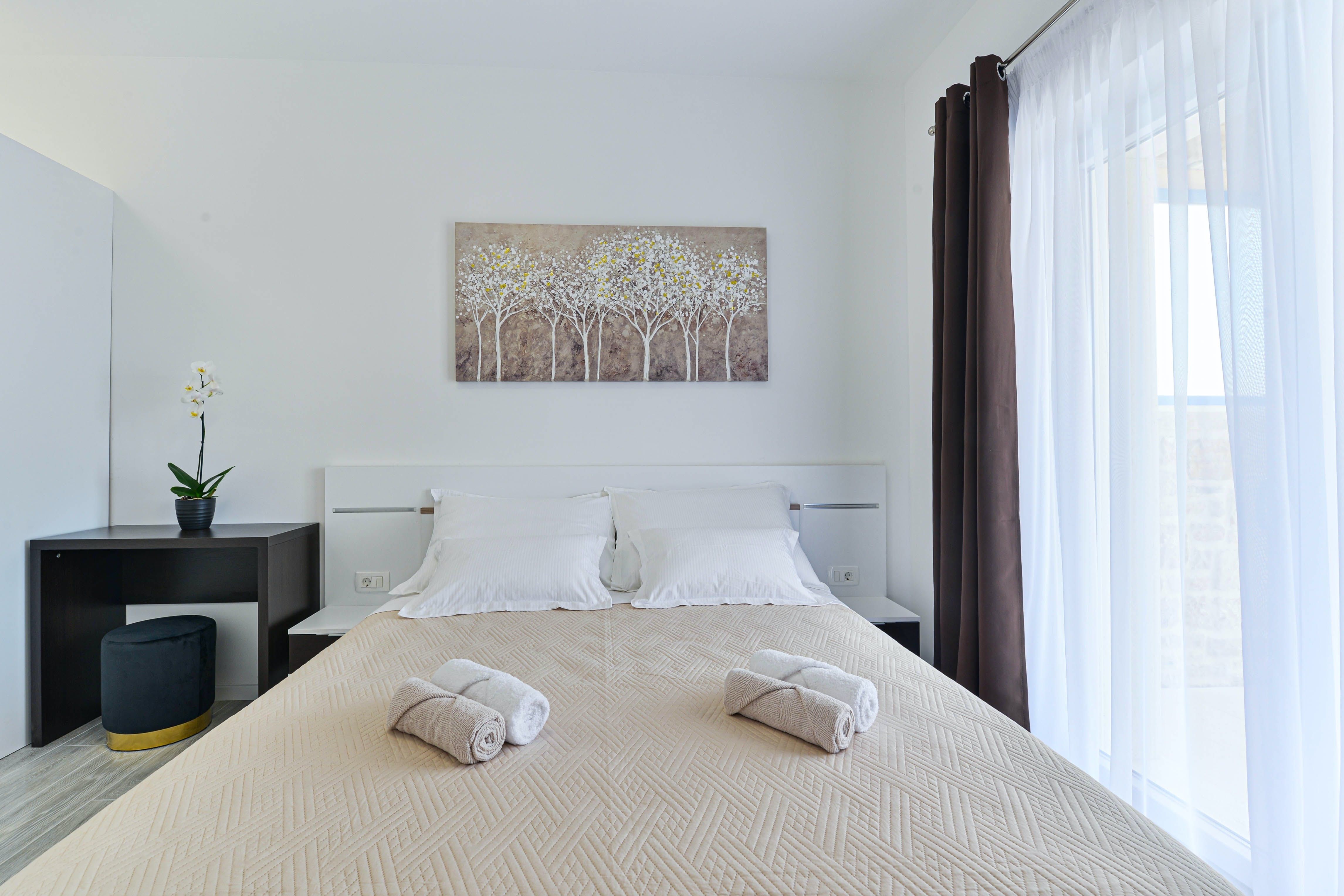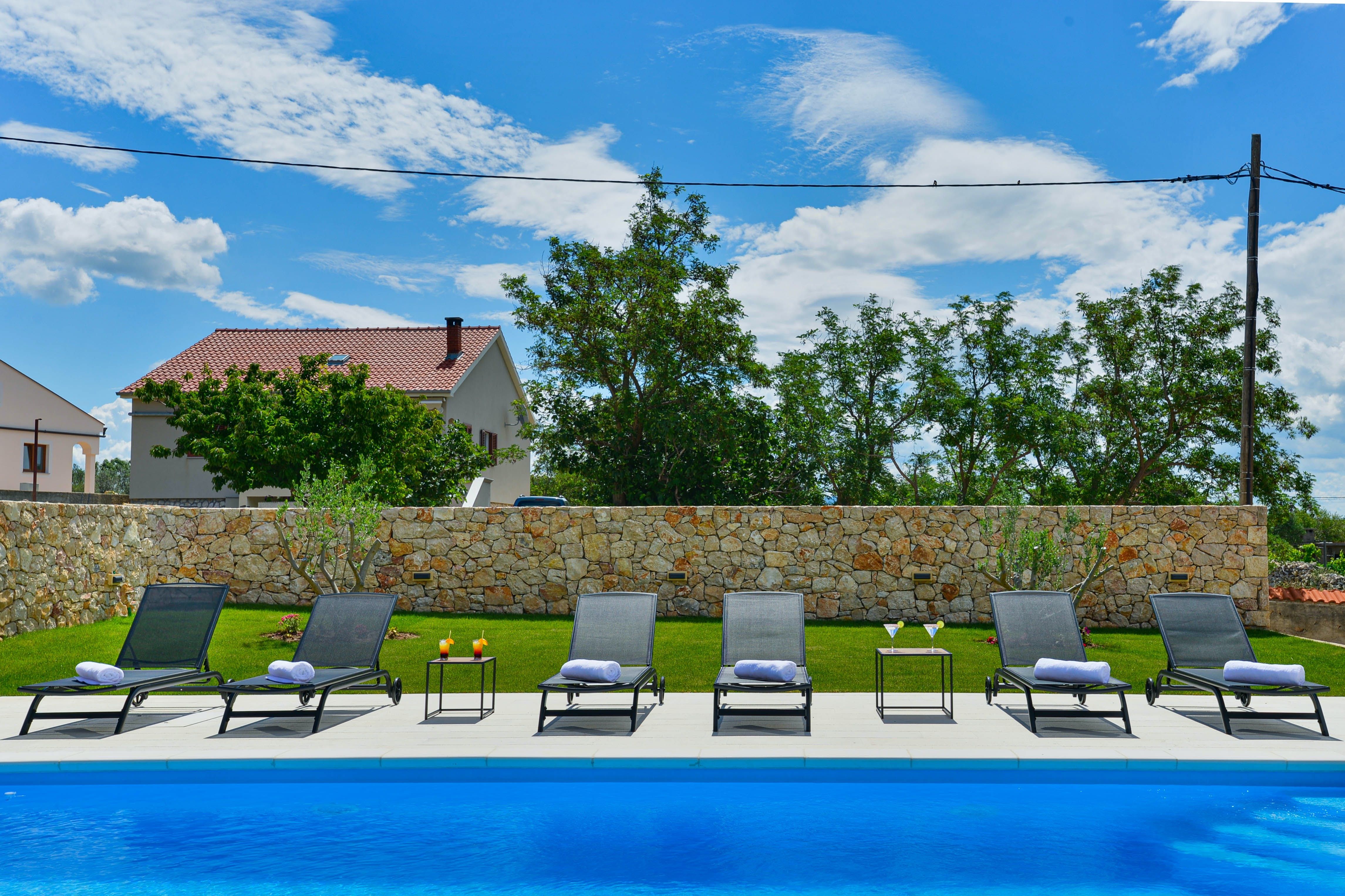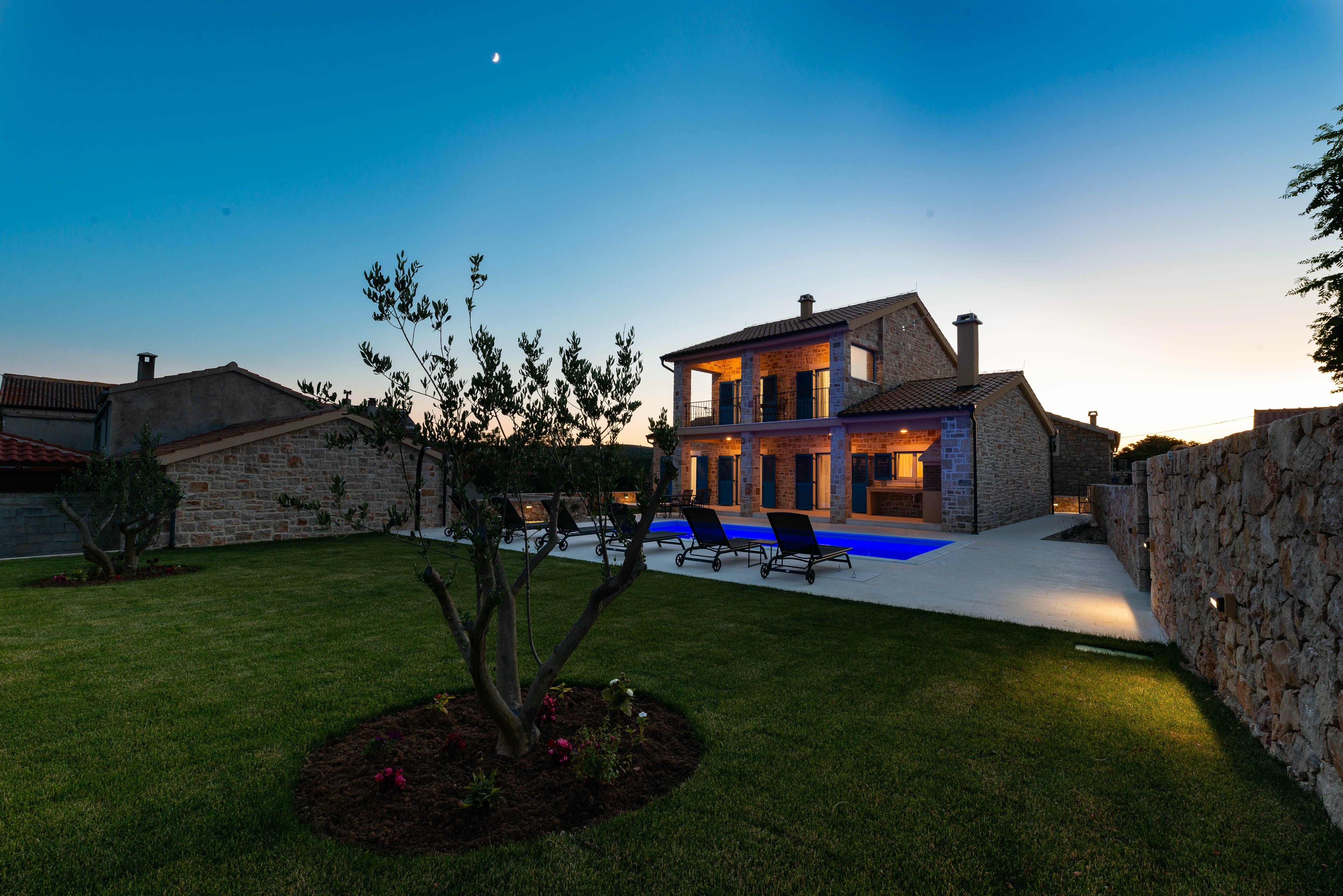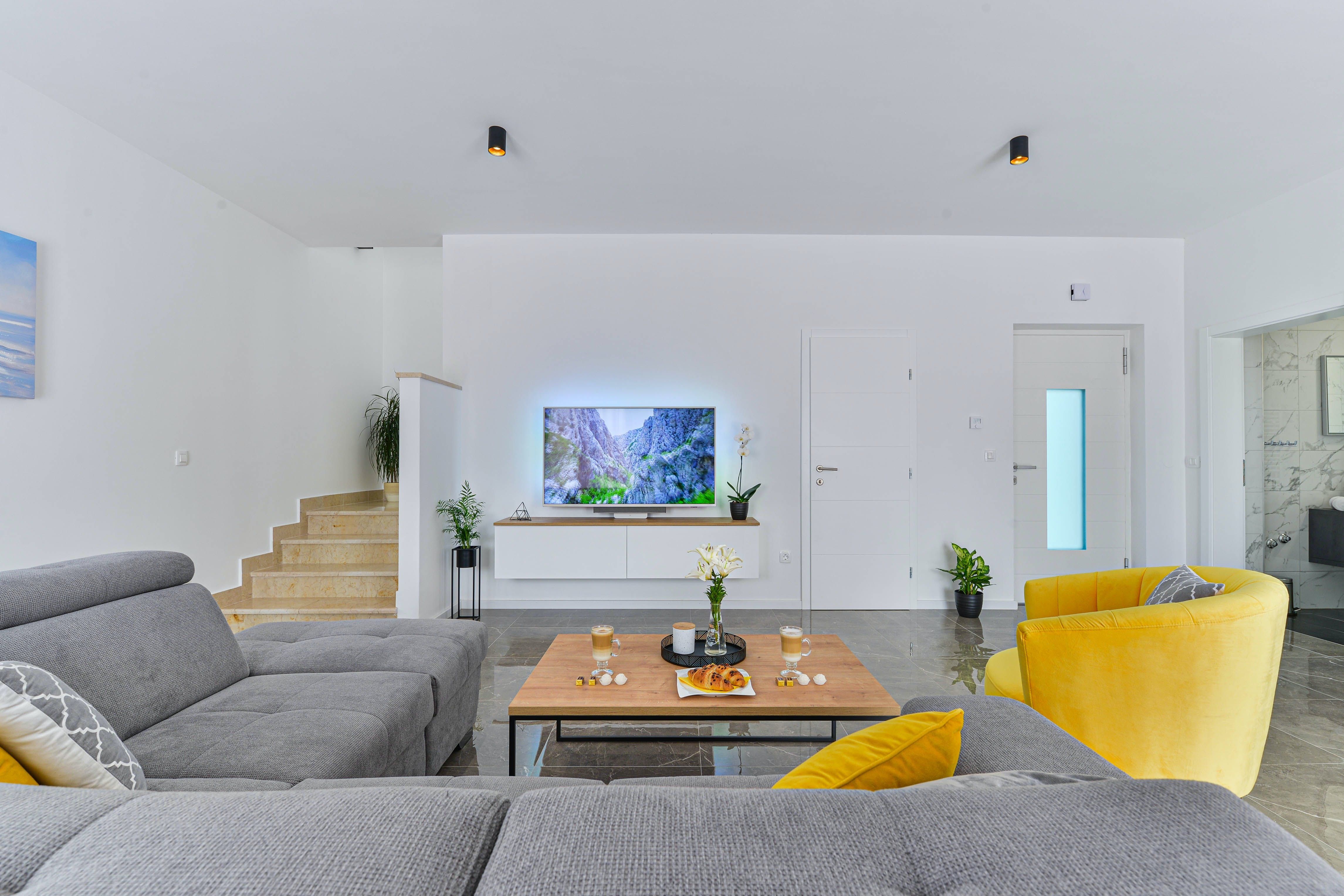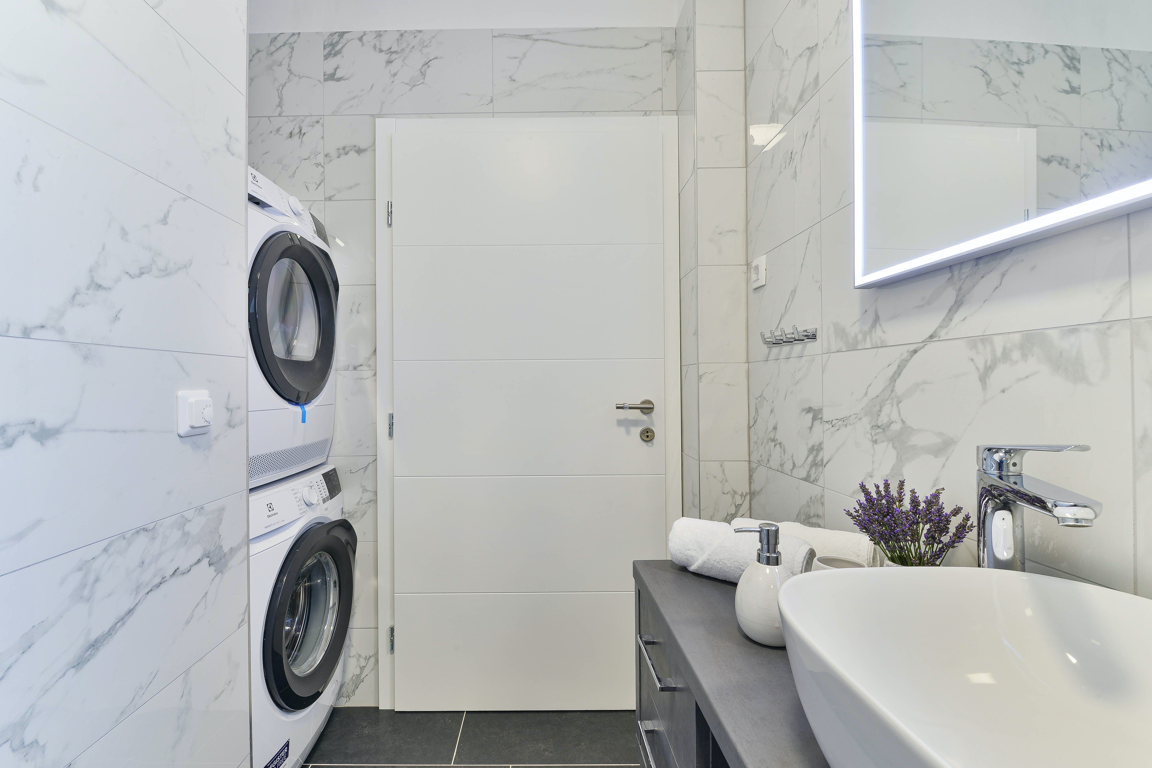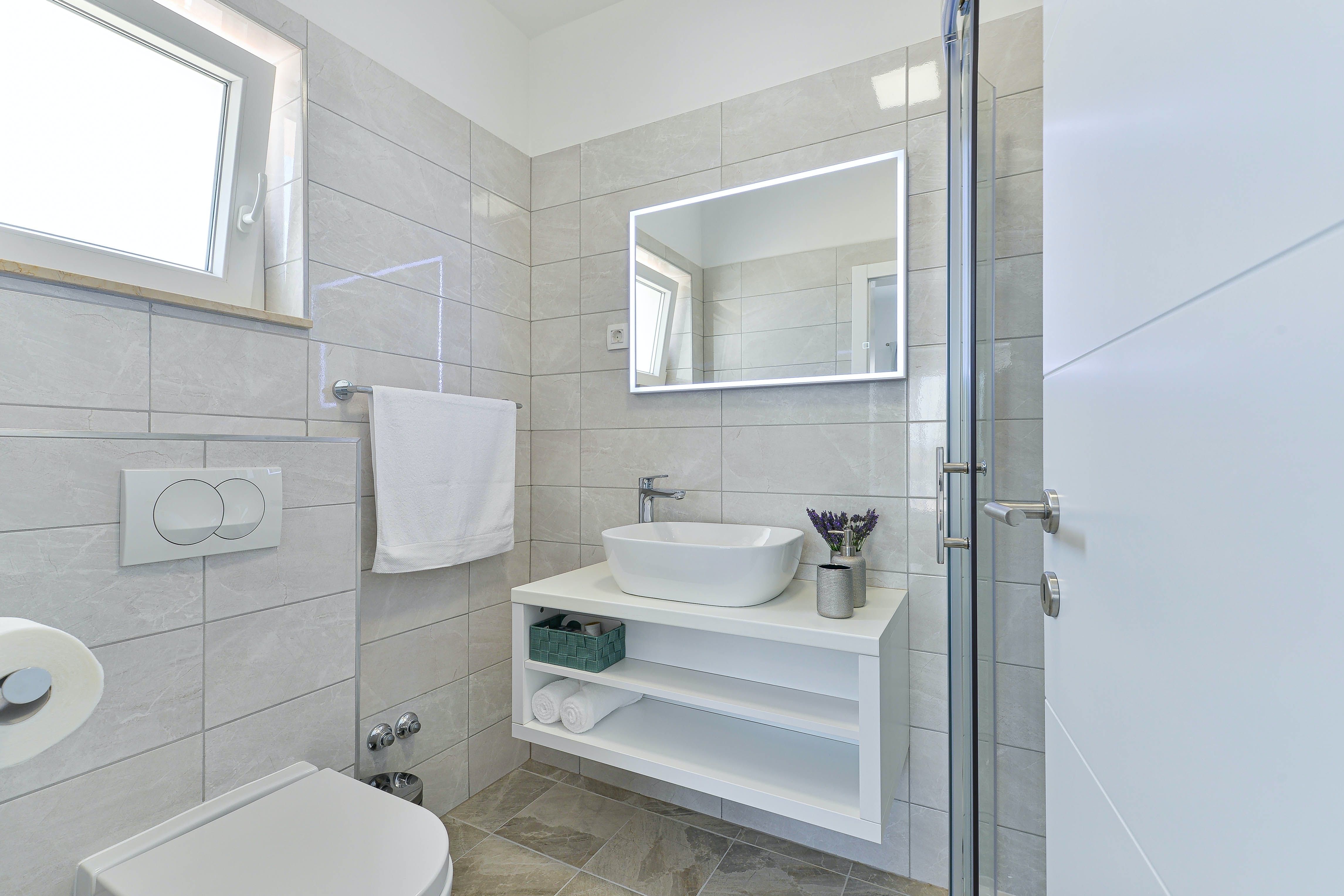 This charming stone villa is located near the sea and offers a versatile equipment that will delight guests. The 400 m² fenced plot includes lawns, terraces, and gravel areas, as well as a heated pool with comfortable stair entry, hydromassage function, and pool towels provided. Sports enthusiasts can enjoy badminton equipment, soccer goals, and a basketball hoop. The covered terrace with summer kitchen and barbecue is perfect for evening gatherings, while the furnished balcony on the first floor offers another attractive spot. Inside, the villa features a trendy design with white decor, large high-gloss tiles, and underfloor heating throughout. The living area is openly connected to the fully-equipped kitchen with dining table. Guests can relax on the sofa (which can be used as a sofa bed for two if required) in front of the TV or in one of the three air-conditioned double bedrooms with en suite shower rooms. The villa is perfect for families seeking relaxing vacations in a prime location.