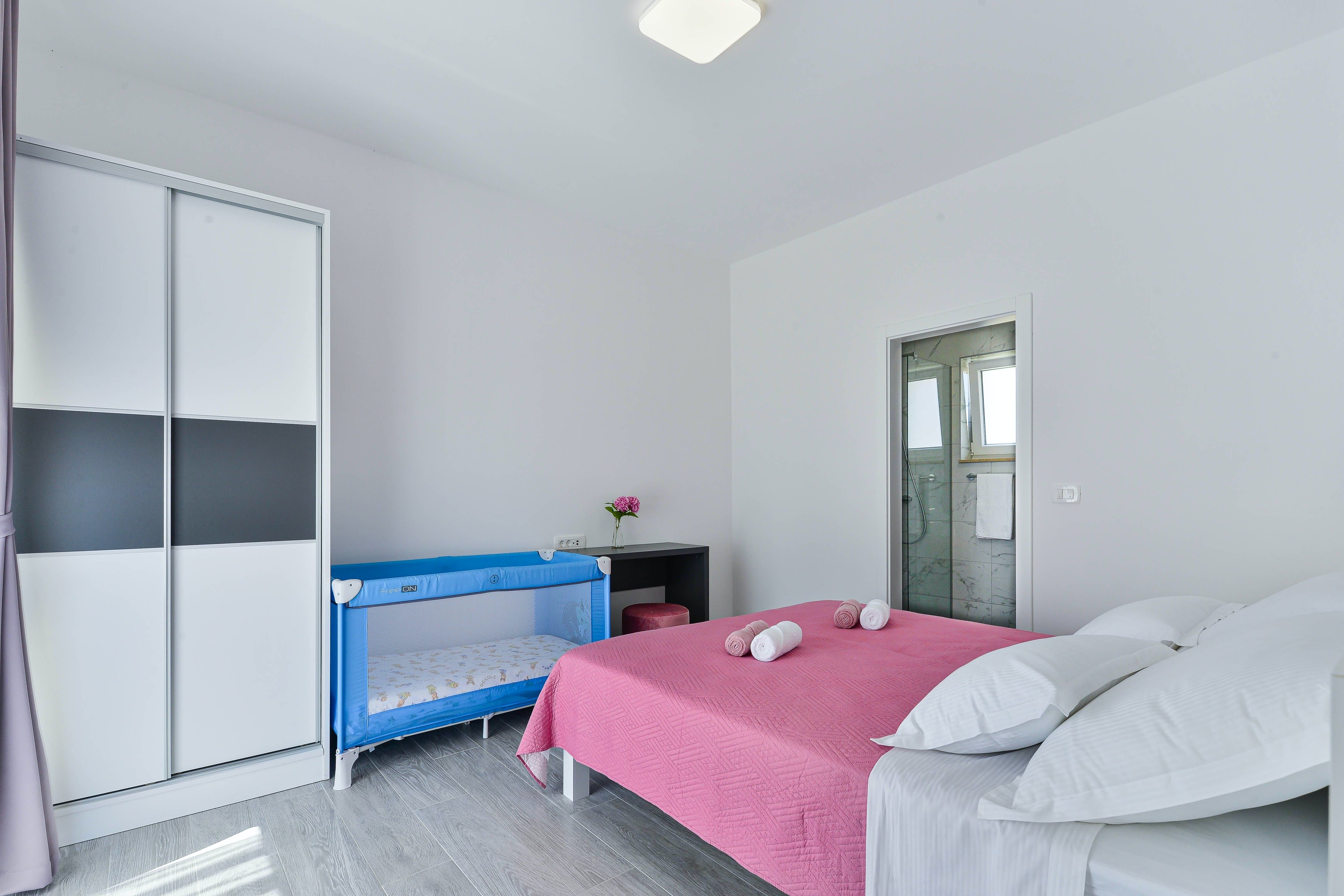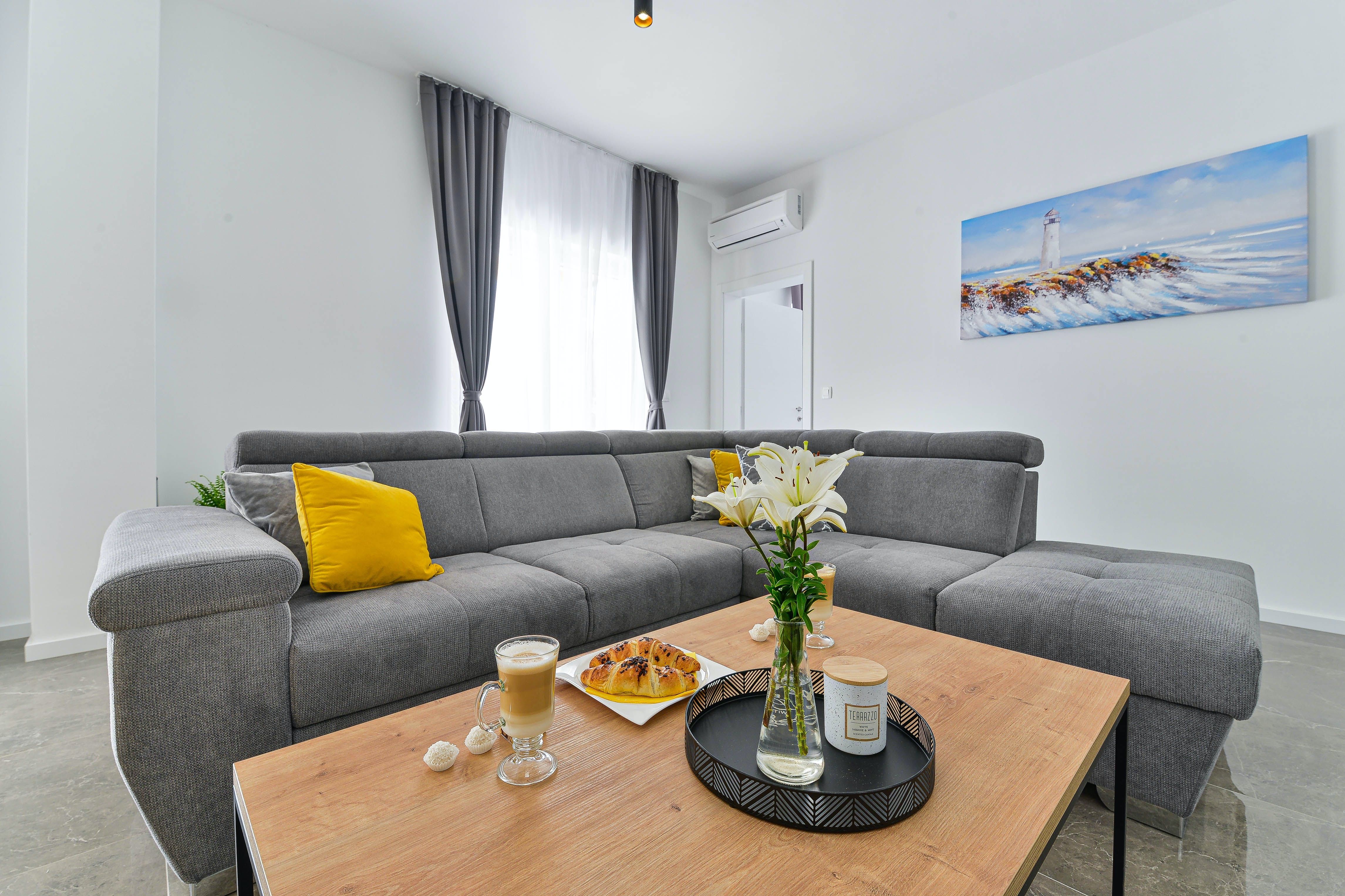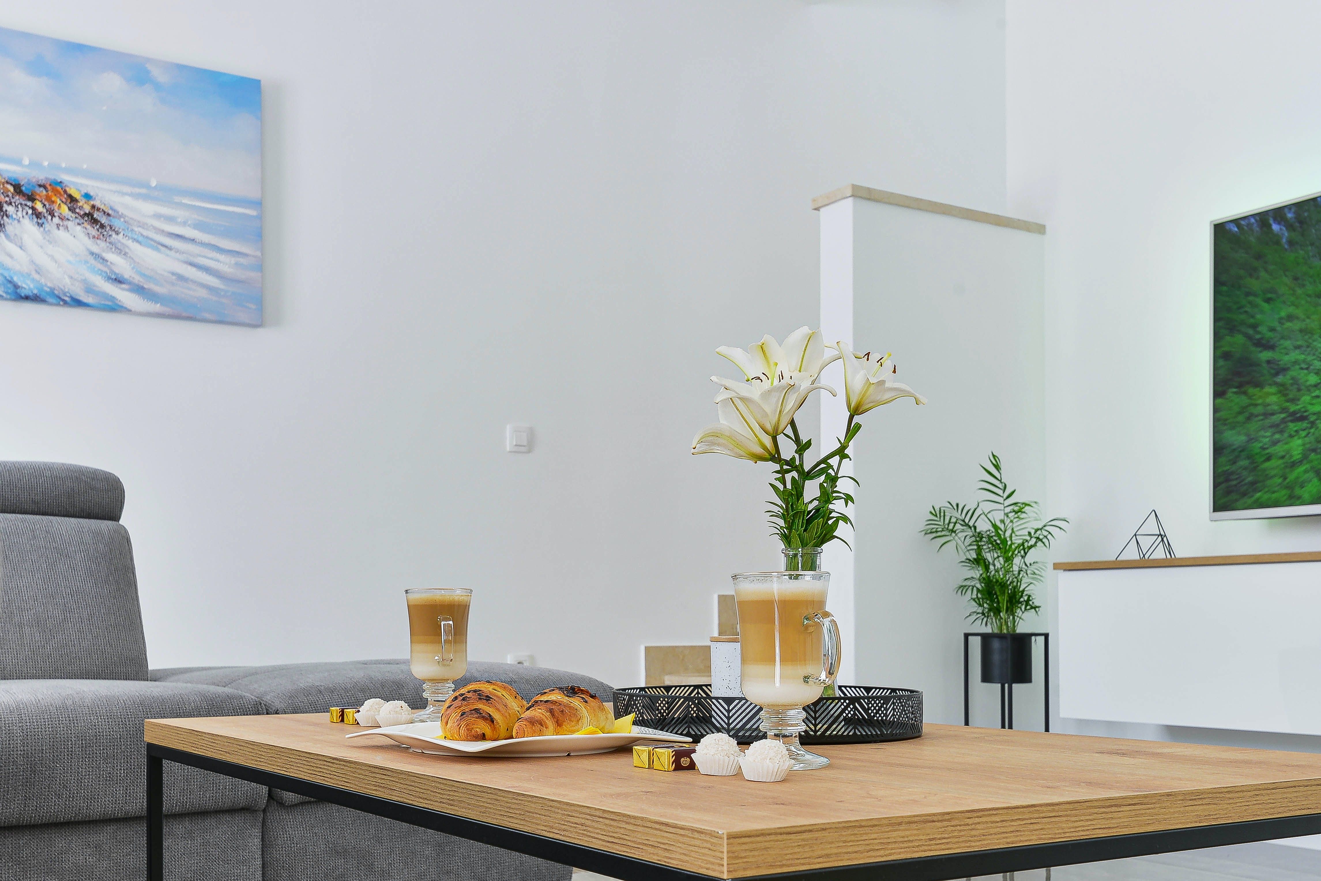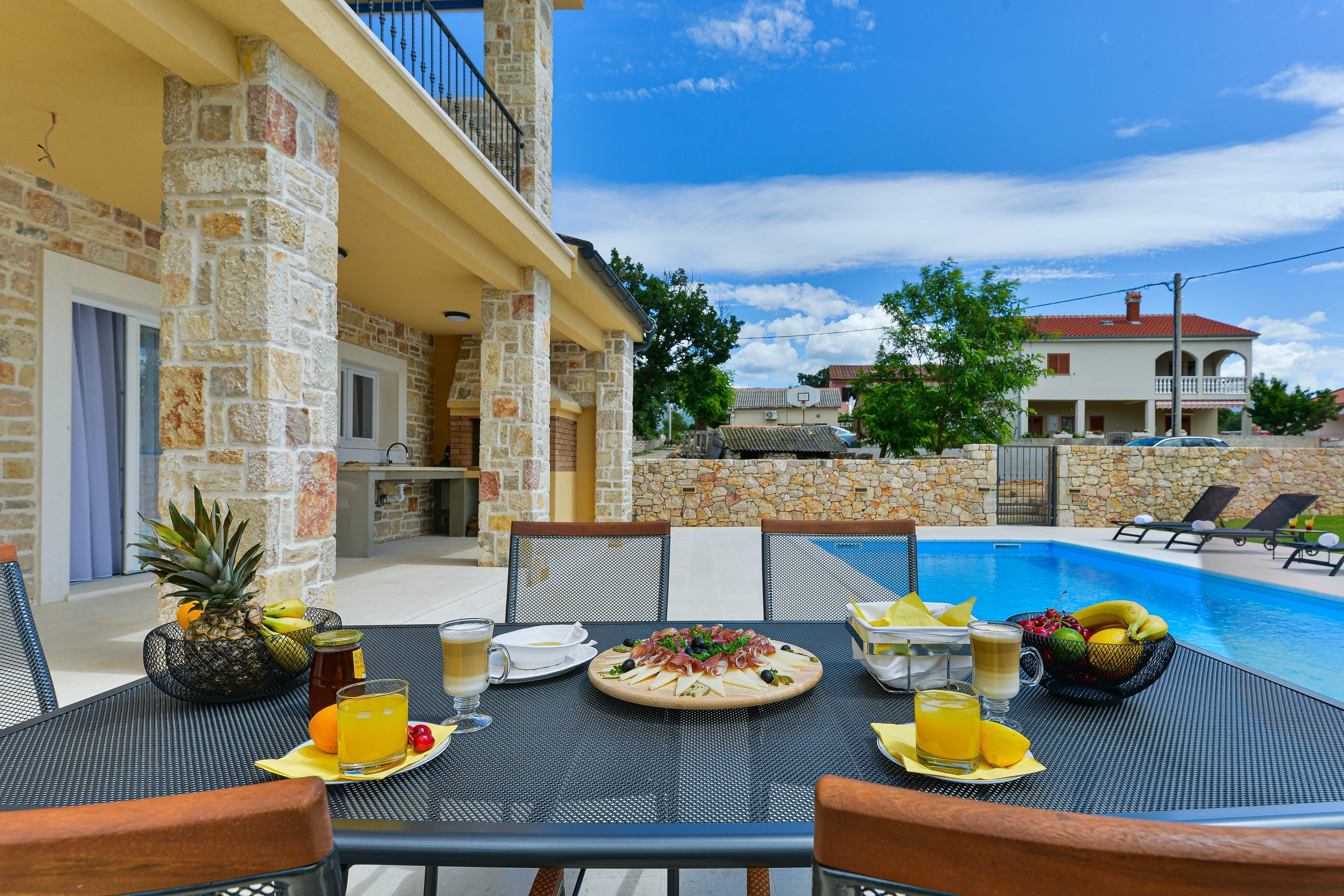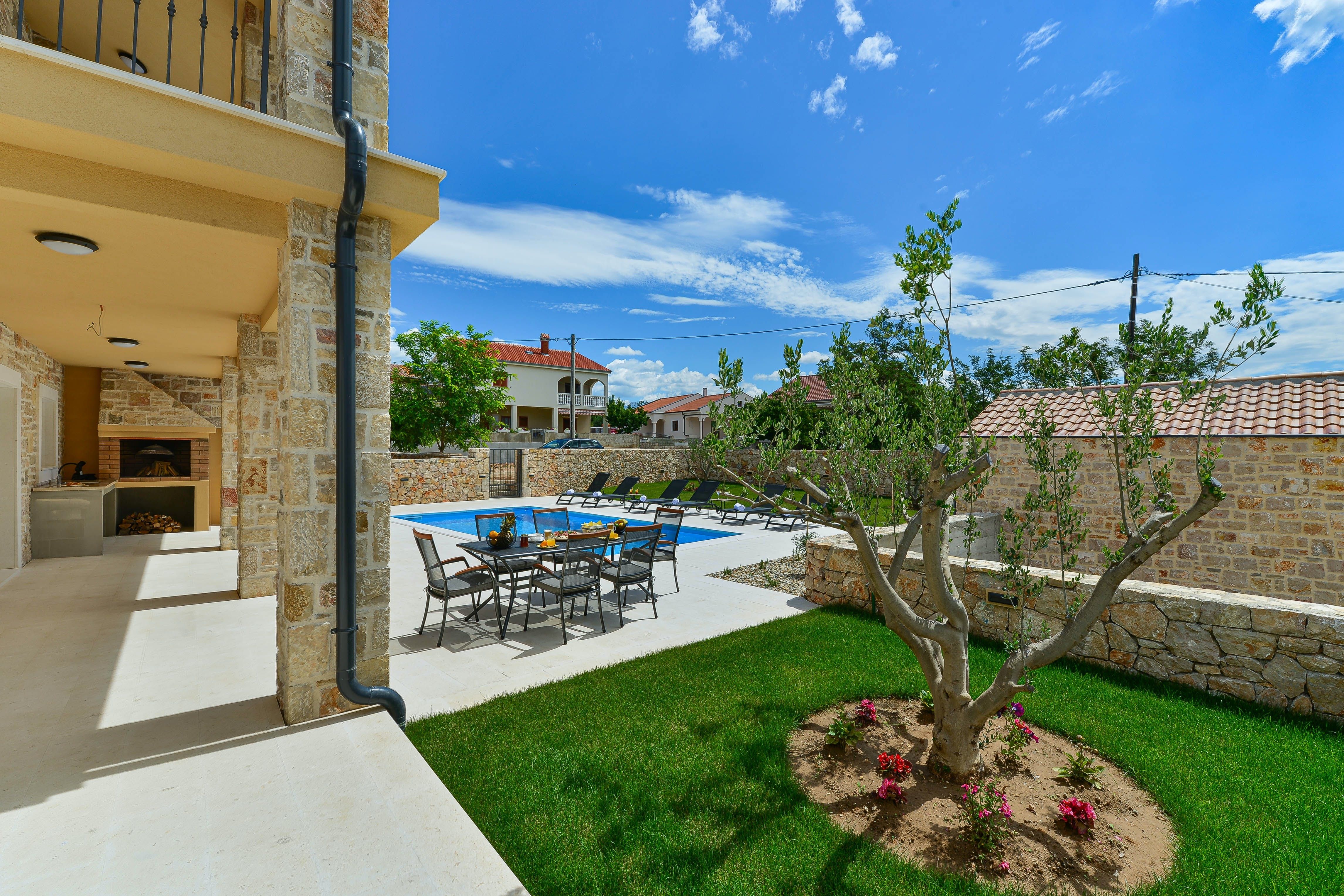 This charming stone villa is located near the sea and offers a versatile equipment that will delight guests. The 400 m² fenced plot includes lawns, terraces, and gravel areas, as well as a heated pool with comfortable stair entry, hydromassage function, and pool towels provided. Sports enthusiasts can enjoy badminton equipment, soccer goals, and a basketball hoop. The covered terrace with summer kitchen and barbecue is perfect for evening gatherings, while the furnished balcony on the first floor offers another attractive spot. Inside, the villa features a trendy design with white decor, large high-gloss tiles, and underfloor heating throughout. The living area is openly connected to the fully-equipped kitchen with dining table. Guests can relax on the sofa (which can be used as a sofa bed for two if required) in front of the TV or in one of the three air-conditioned double bedrooms with en suite shower rooms. The villa is perfect for families seeking relaxing vacations in a prime location.