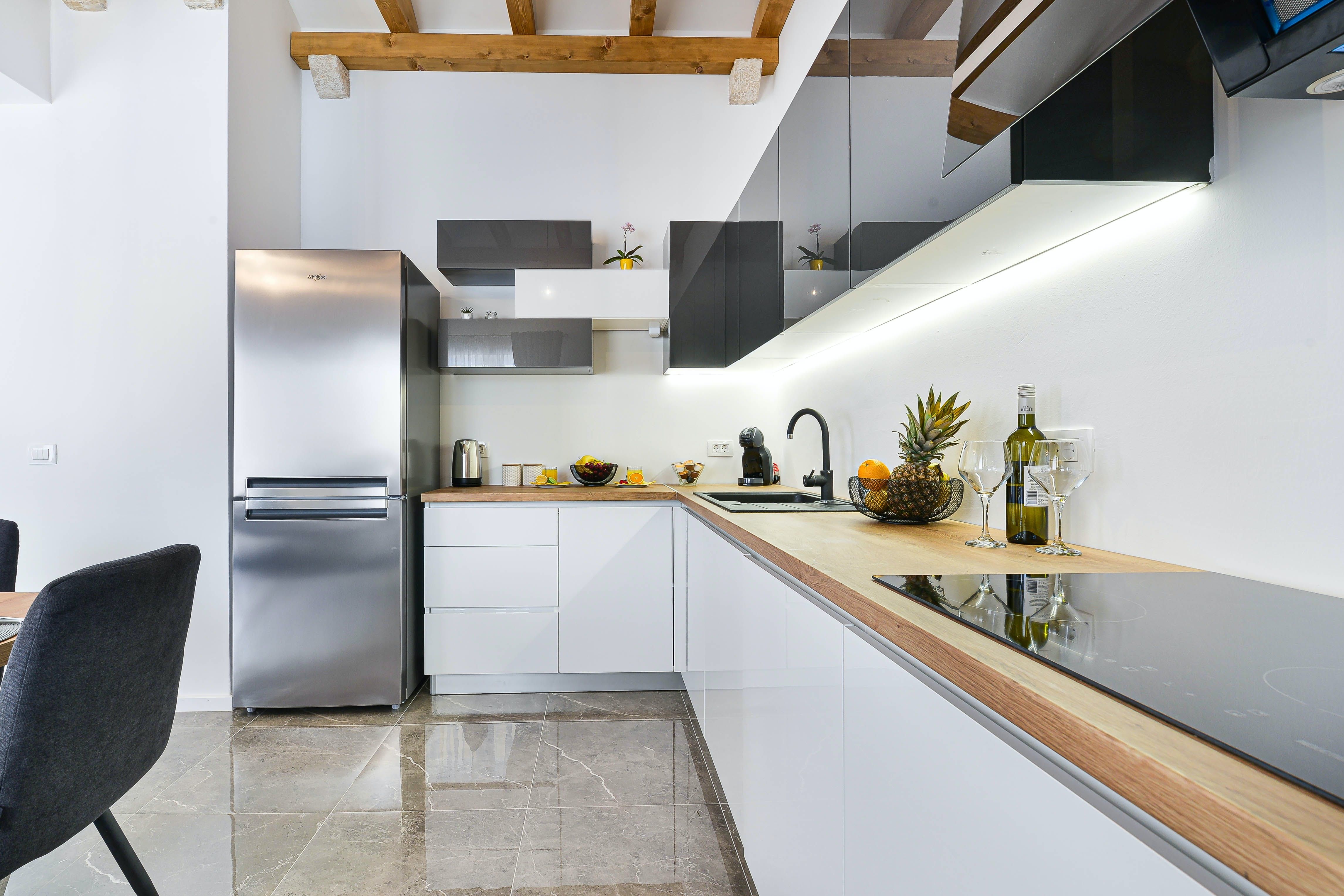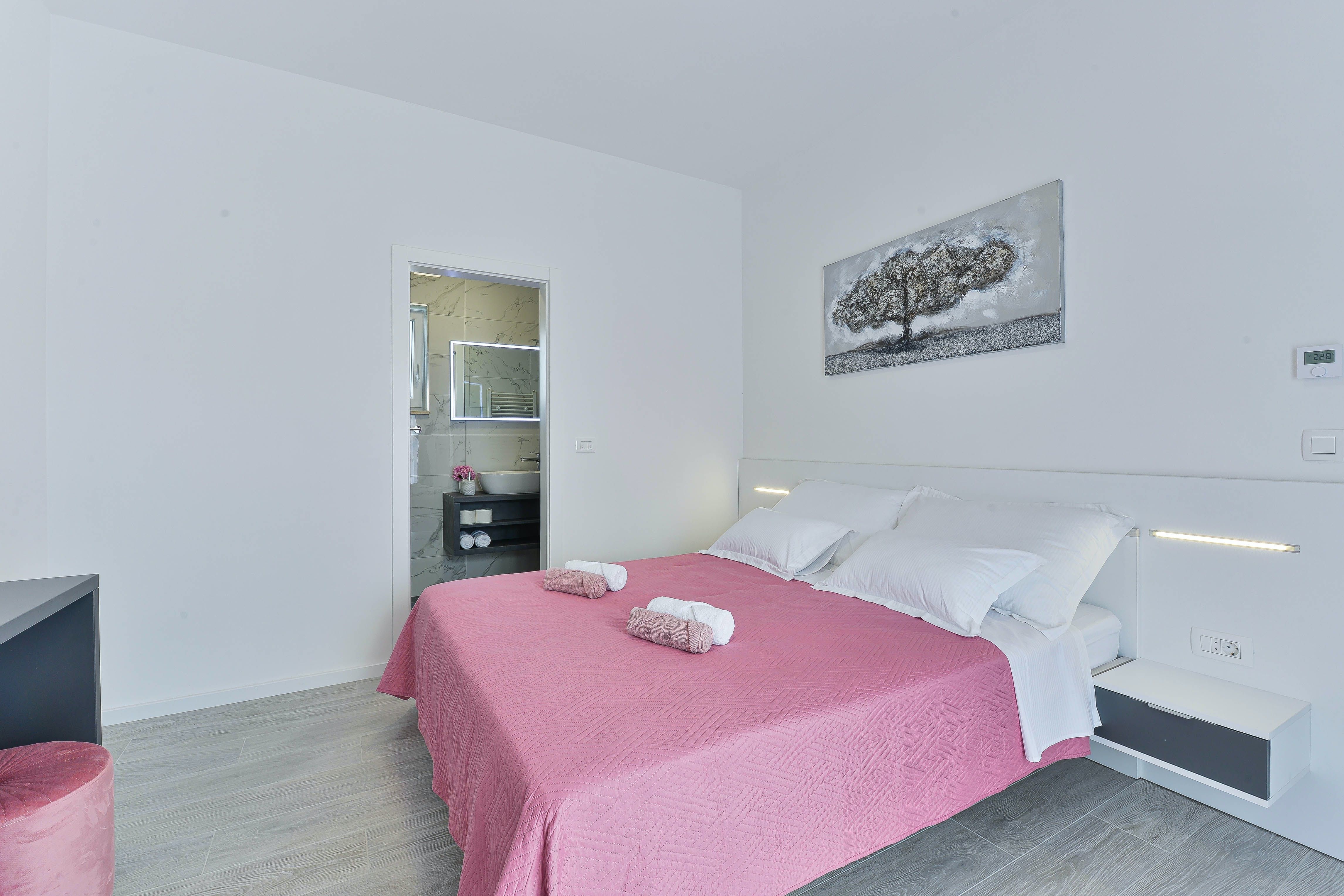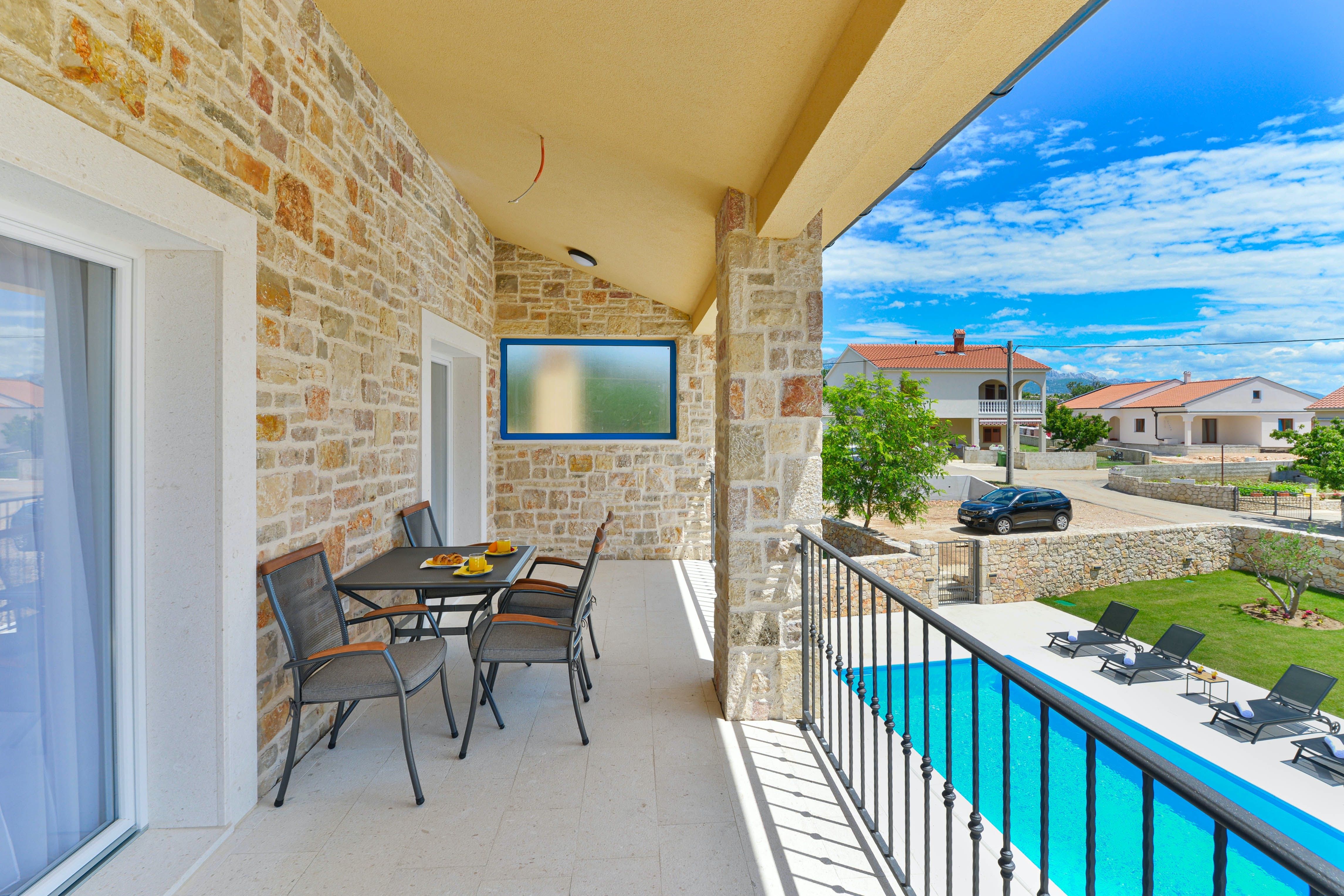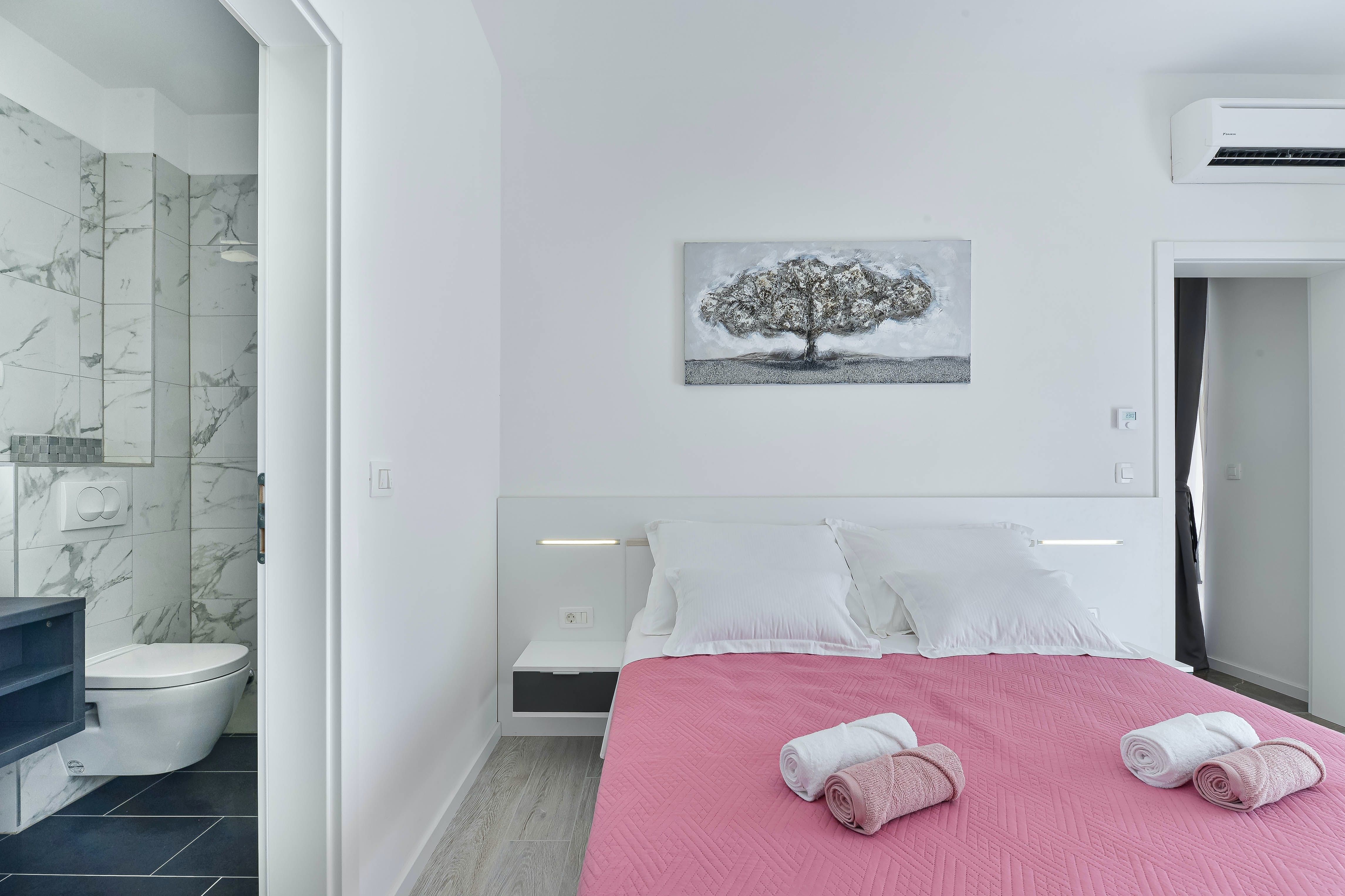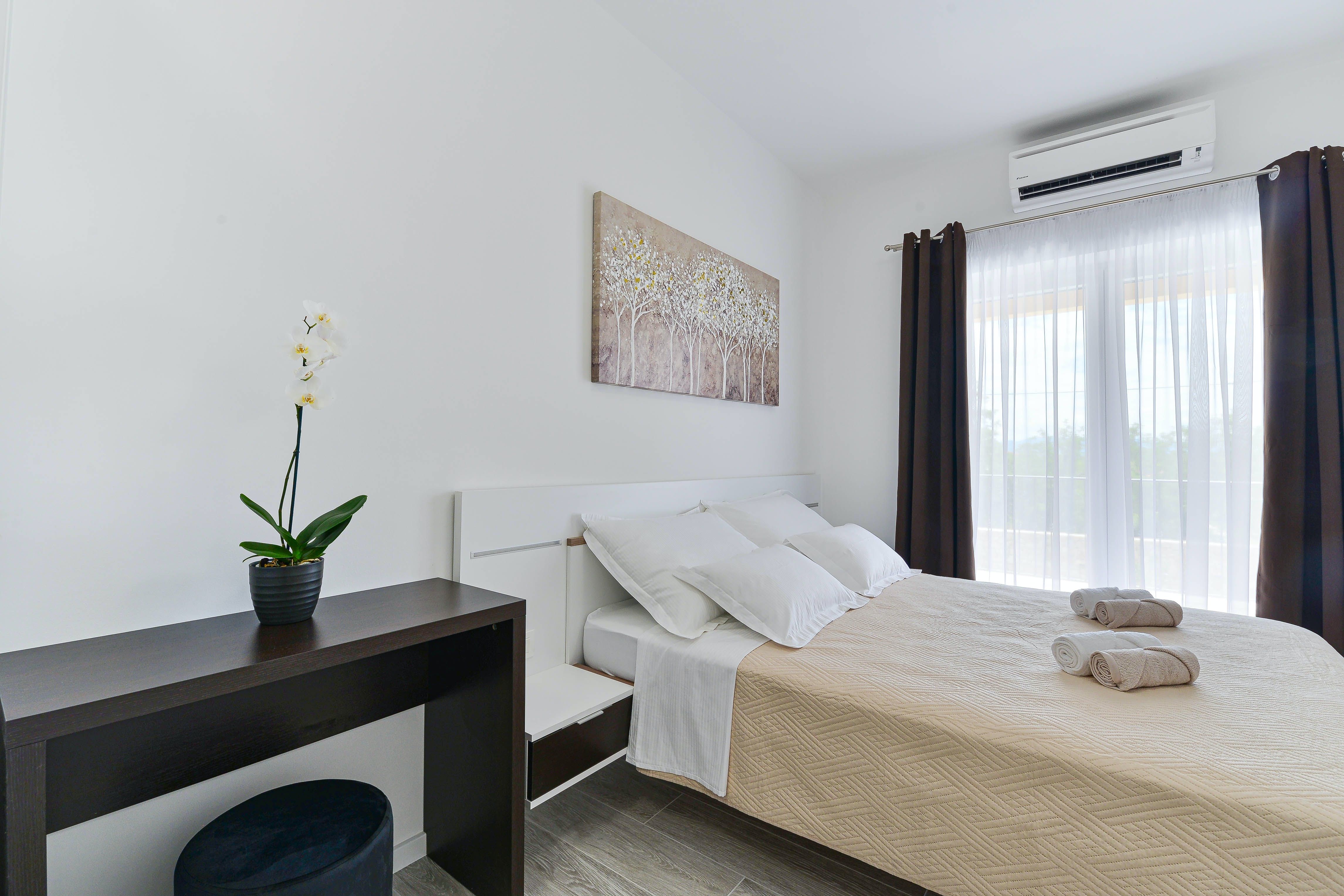 This charming stone villa is located near the sea and offers a versatile equipment that will delight guests. The 400 m² fenced plot includes lawns, terraces, and gravel areas, as well as a heated pool with comfortable stair entry, hydromassage function, and pool towels provided. Sports enthusiasts can enjoy badminton equipment, soccer goals, and a basketball hoop. The covered terrace with summer kitchen and barbecue is perfect for evening gatherings, while the furnished balcony on the first floor offers another attractive spot. Inside, the villa features a trendy design with white decor, large high-gloss tiles, and underfloor heating throughout. The living area is openly connected to the fully-equipped kitchen with dining table. Guests can relax on the sofa (which can be used as a sofa bed for two if required) in front of the TV or in one of the three air-conditioned double bedrooms with en suite shower rooms. The villa is perfect for families seeking relaxing vacations in a prime location.