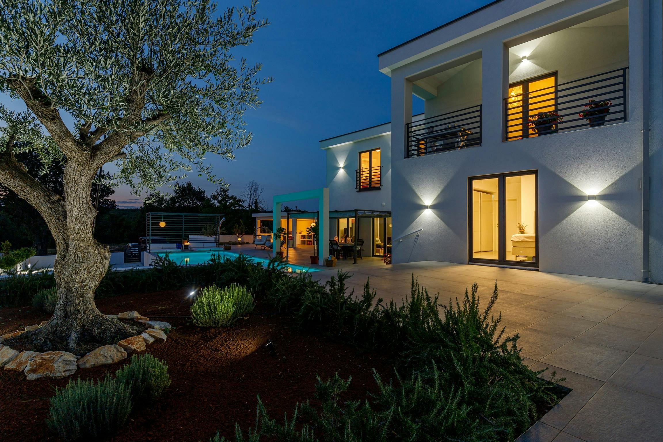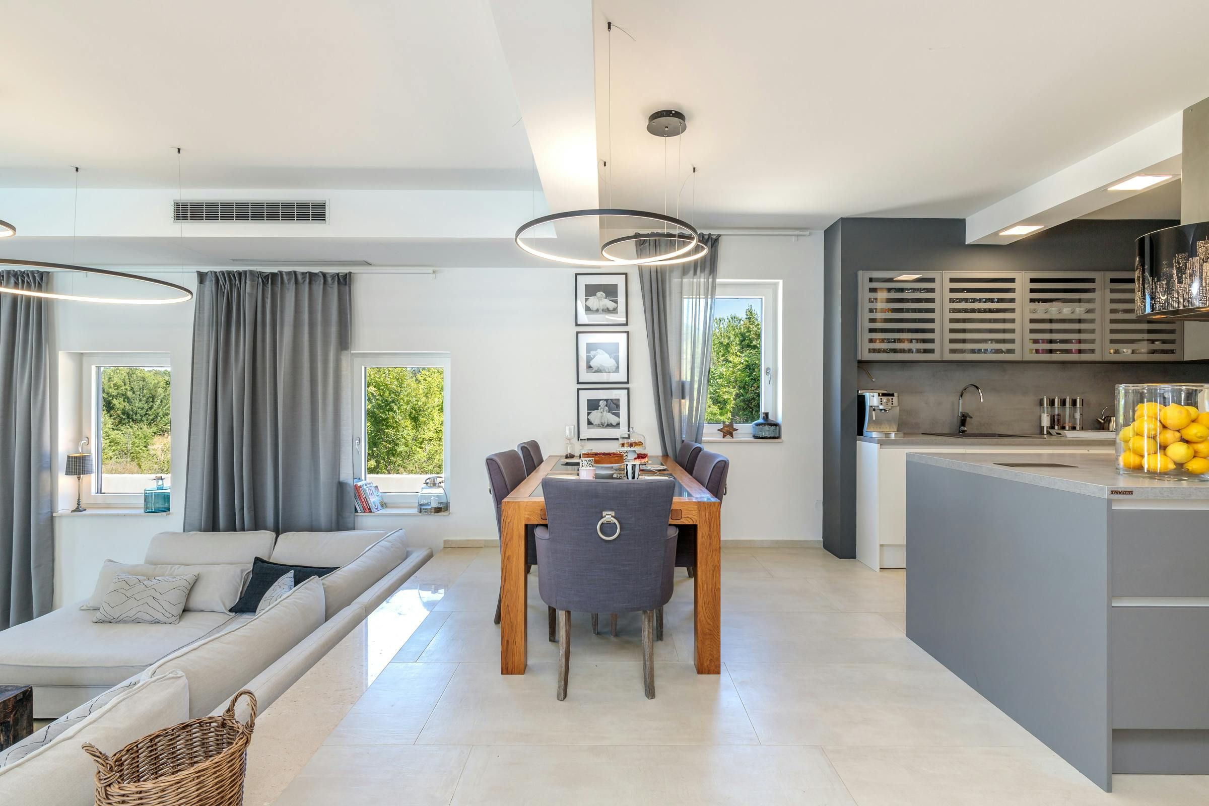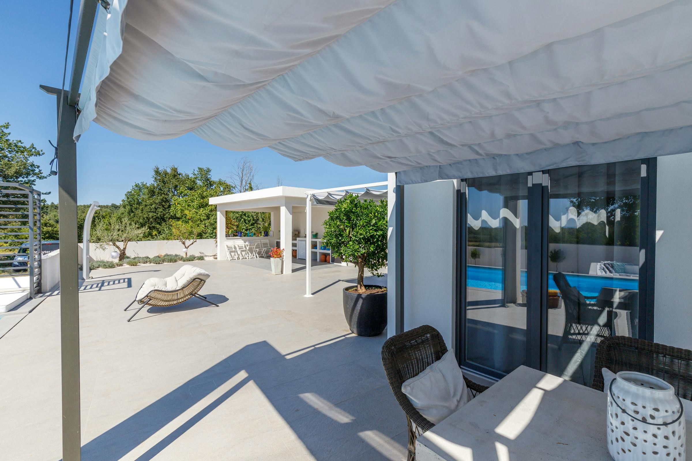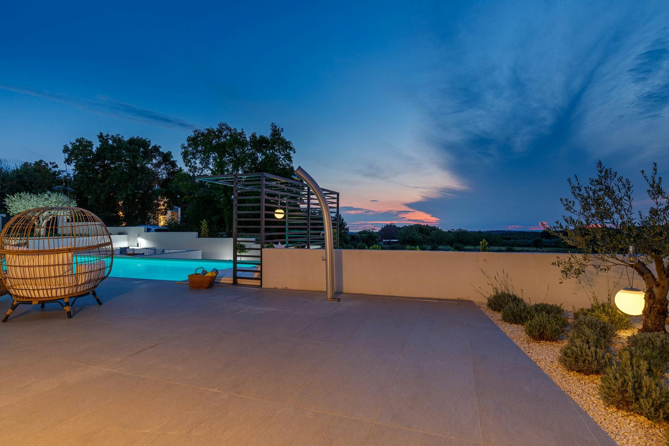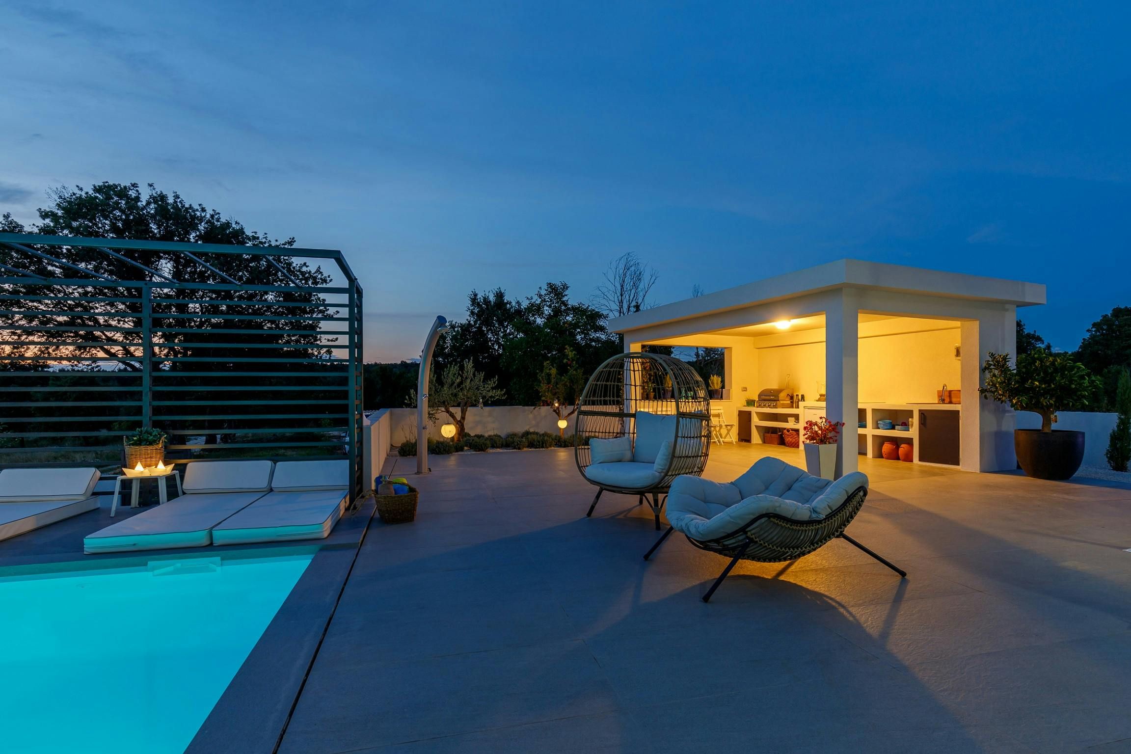 This charming villa located in the heart of Istria, in the small village of Barat, promises a relaxing and luxurious stay. Surrounded by greenery, this modernly designed property offers indoor and outdoor living space for the whole family. The outdoor area also includes a covered dining area, swimming pool, summer kitchen with an electric grill, and cosy daybeds. Inside, the living area boasts plenty of natural light as well as four bedrooms, each with an en-suite bathroom – one has a balcony with a view of the pool. Popular coastal towns such as Rovinj and Porec are just a thirty-minute drive away.