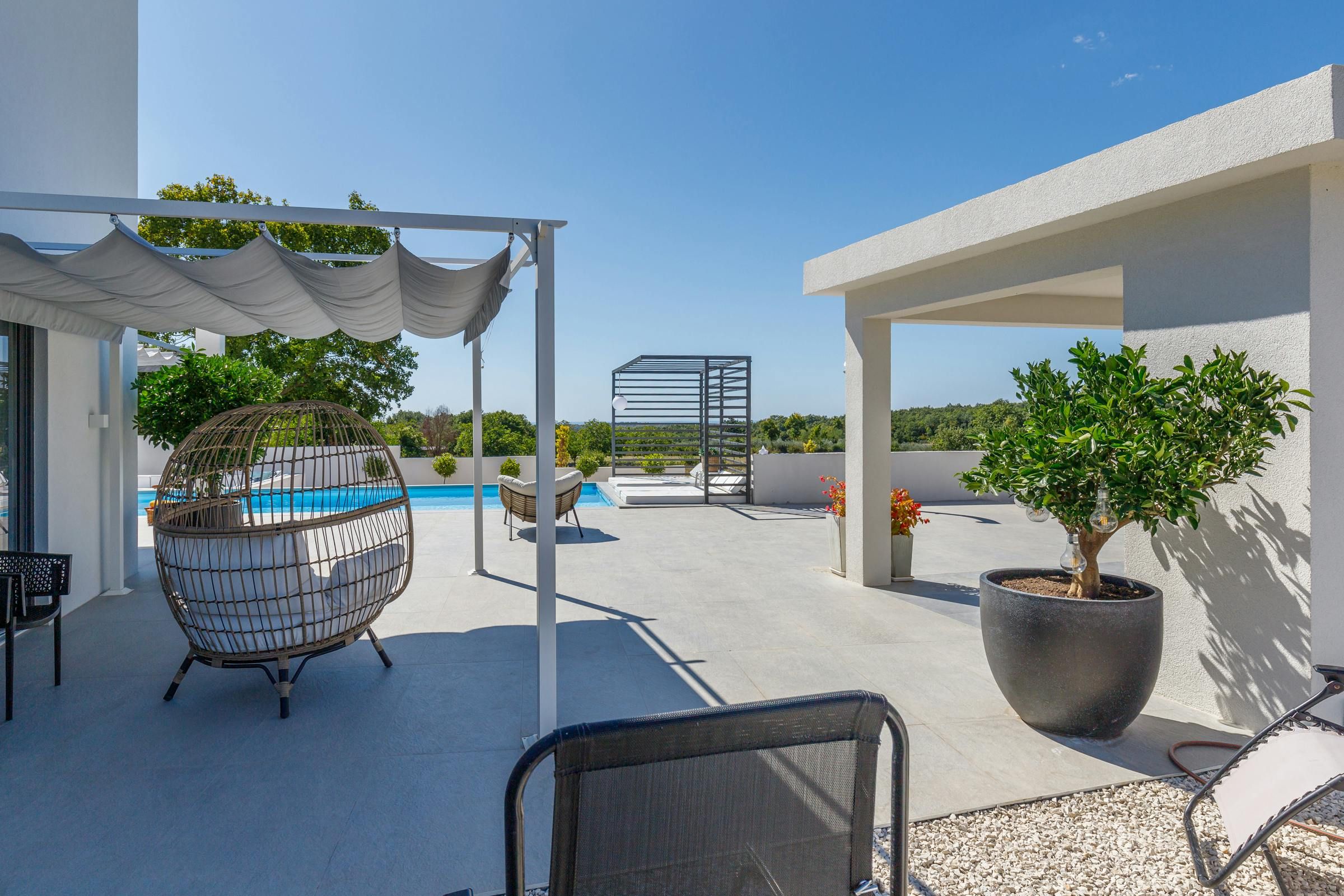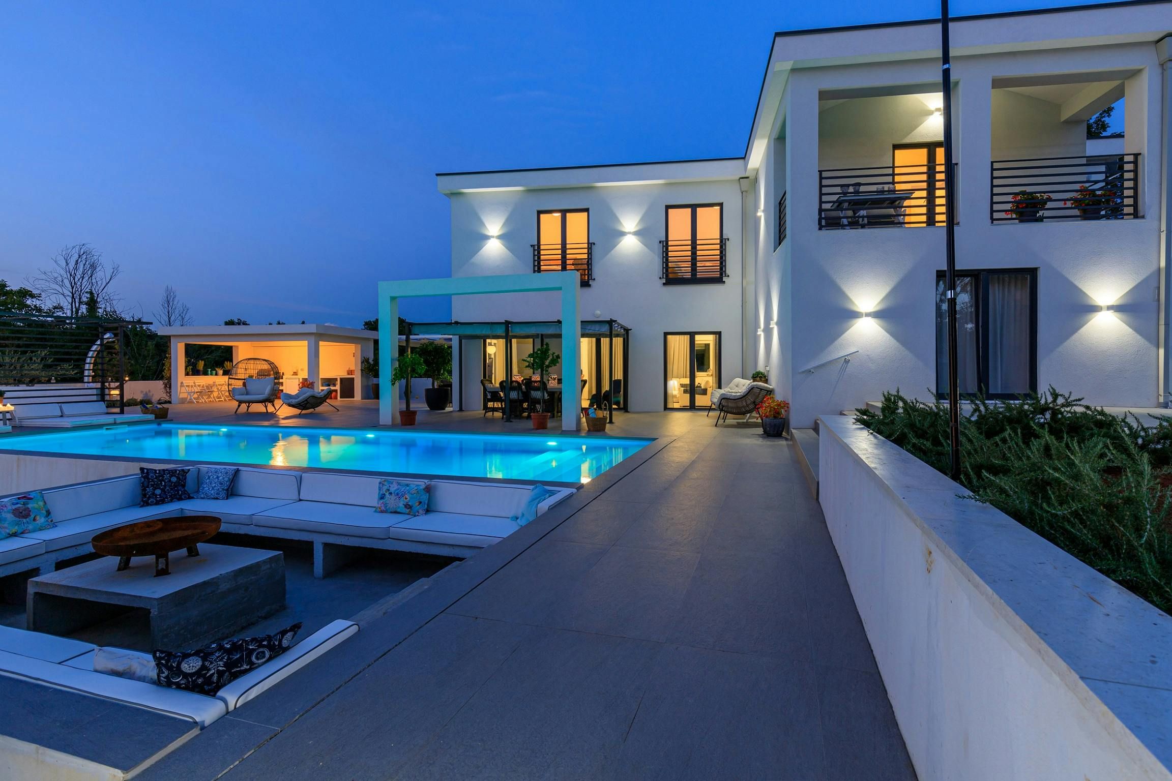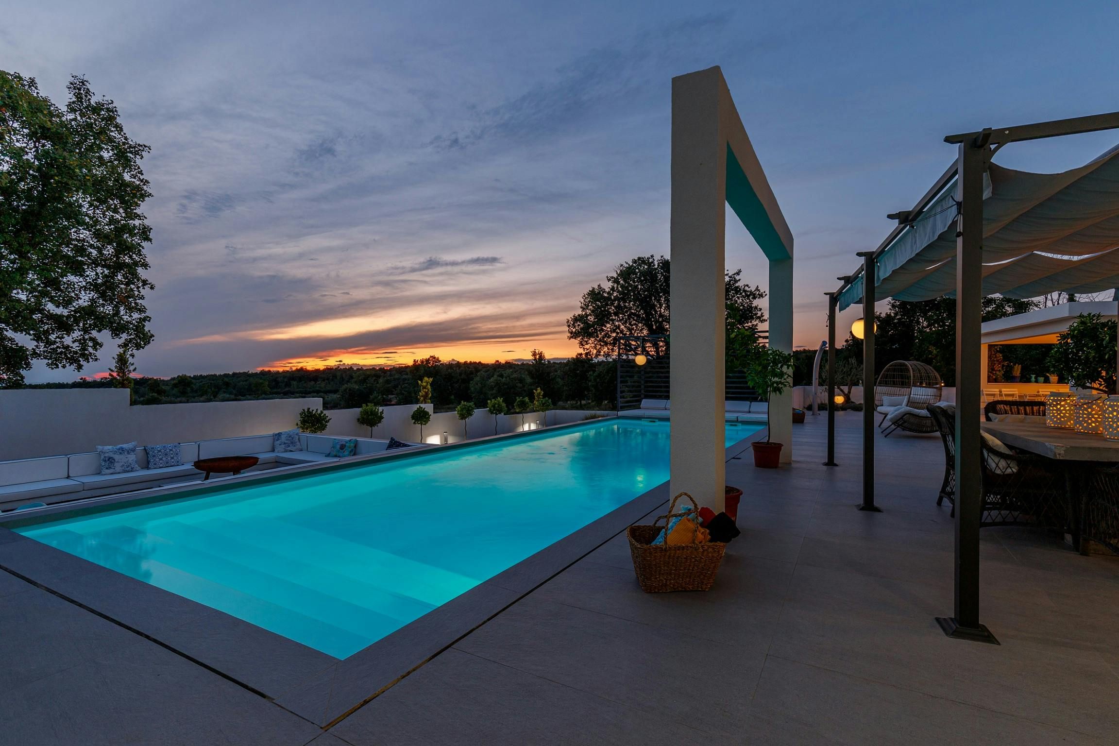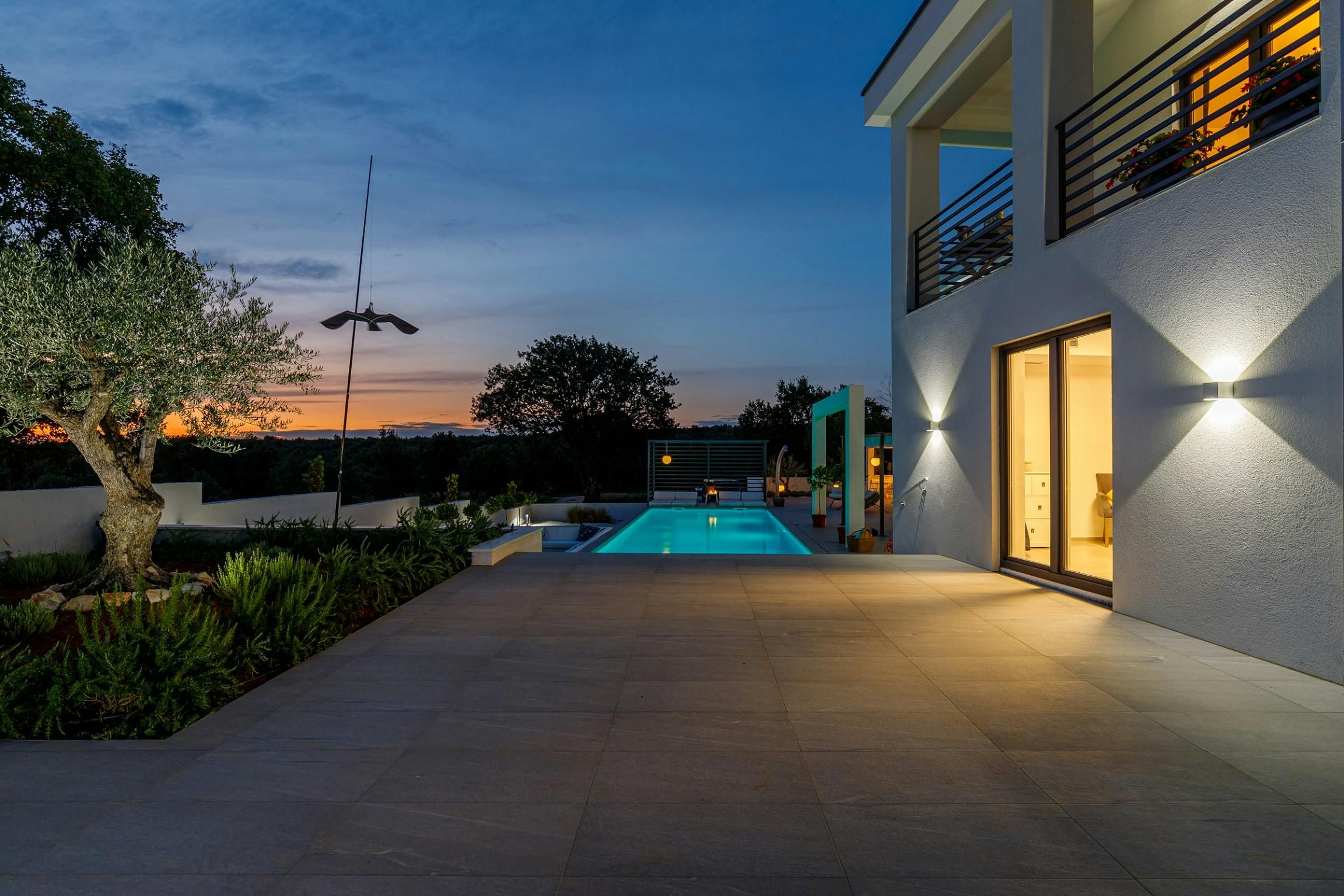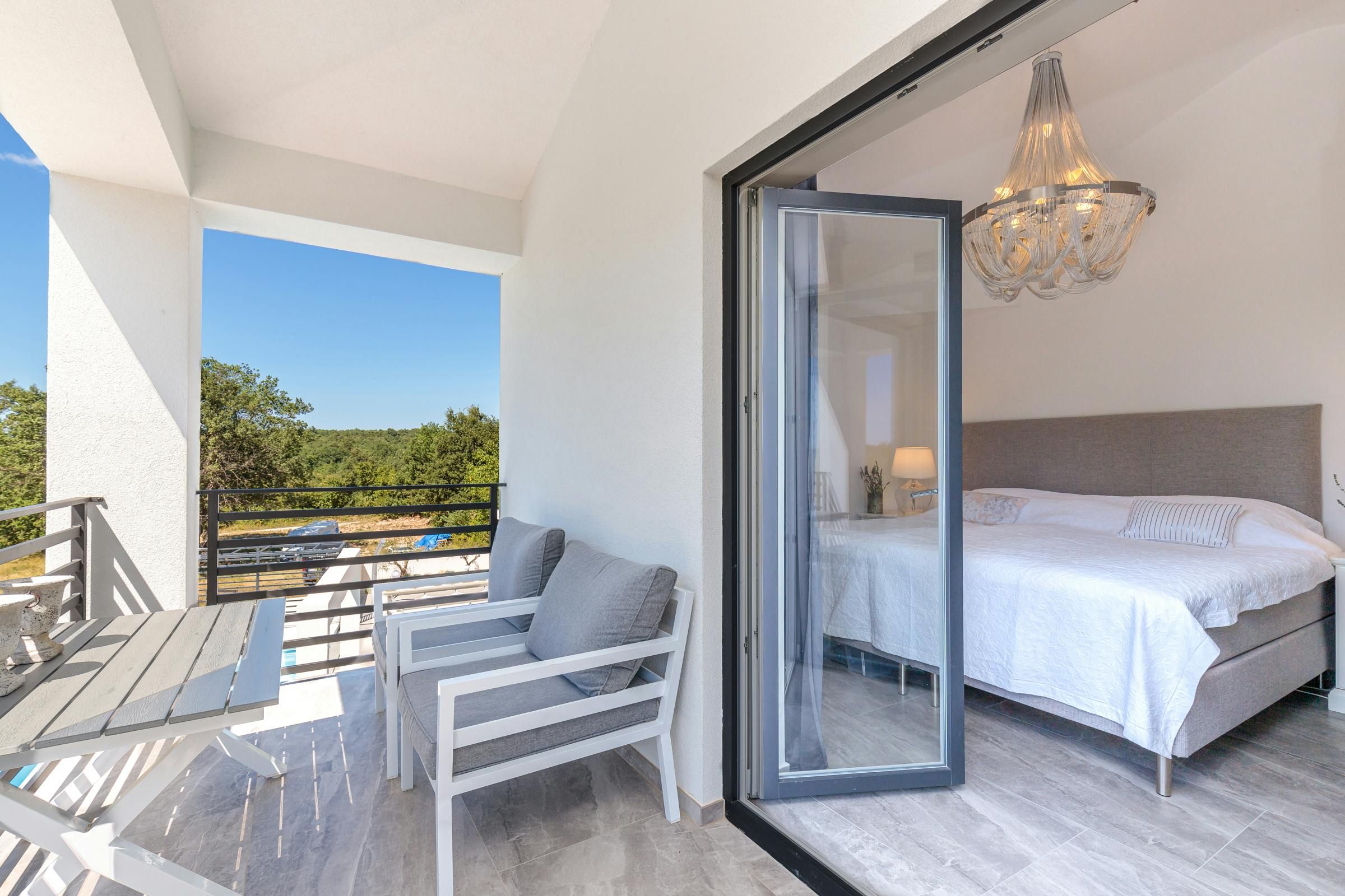 This charming villa located in the heart of Istria, in the small village of Barat, promises a relaxing and luxurious stay. Surrounded by greenery, this modernly designed property offers indoor and outdoor living space for the whole family. The outdoor area also includes a covered dining area, swimming pool, summer kitchen with an electric grill, and cosy daybeds. Inside, the living area boasts plenty of natural light as well as four bedrooms, each with an en-suite bathroom – one has a balcony with a view of the pool. Popular coastal towns such as Rovinj and Porec are just a thirty-minute drive away.