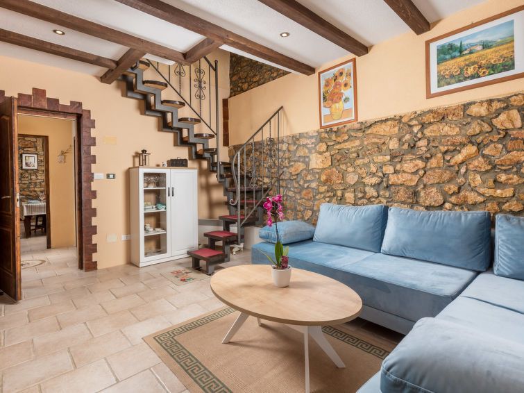3-room house 100 m2 on 2 levels. Living room with satellite TV and air conditioning. Kitchen (dishwasher, 4 ceramic glass hob hotplates, toaster, kettle, microwave, freezer, electric coffee machine) with dining table. Shower/WC. Upper floor: 1 room with 2 beds (90 cm, length 200 cm).