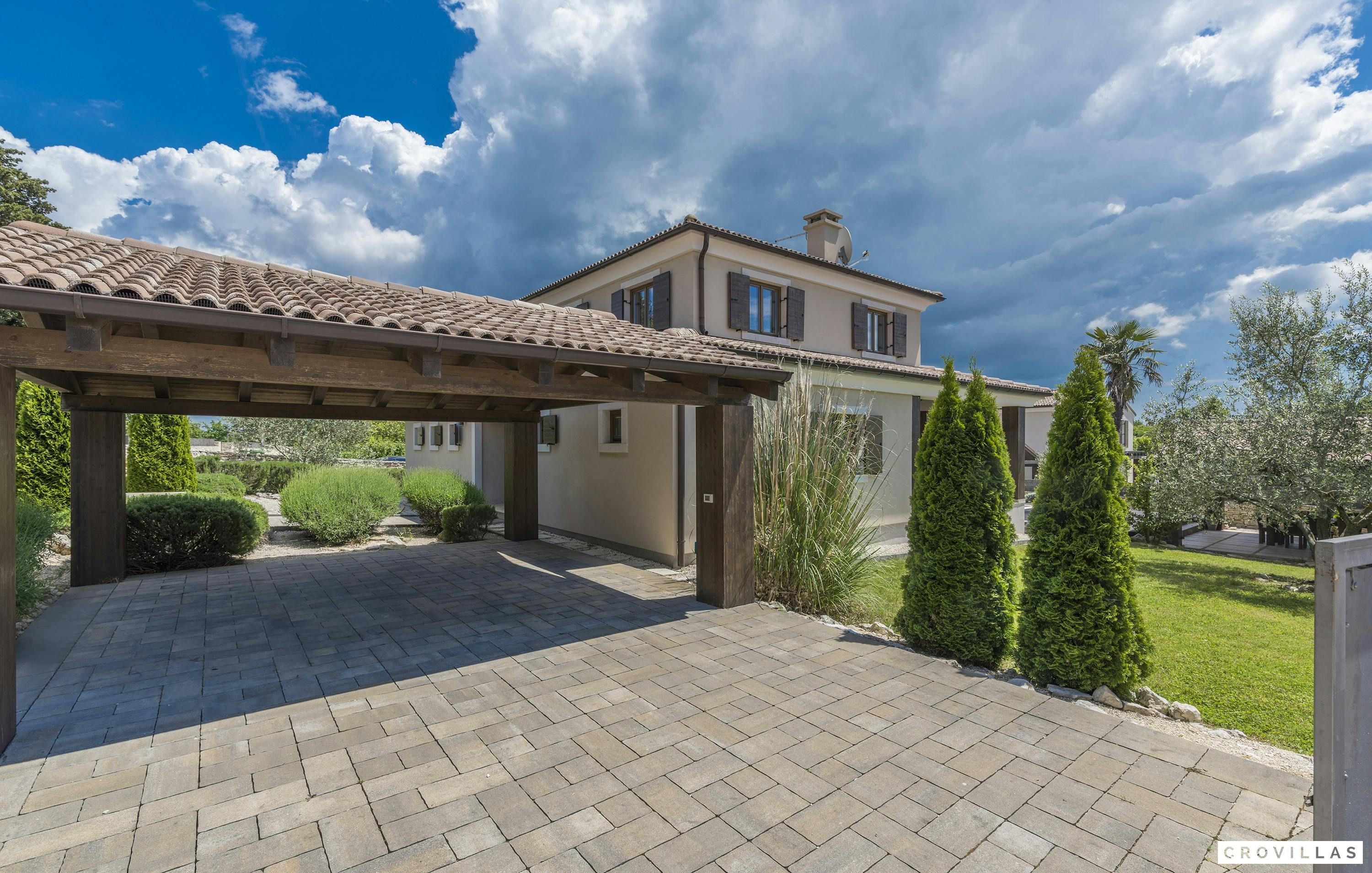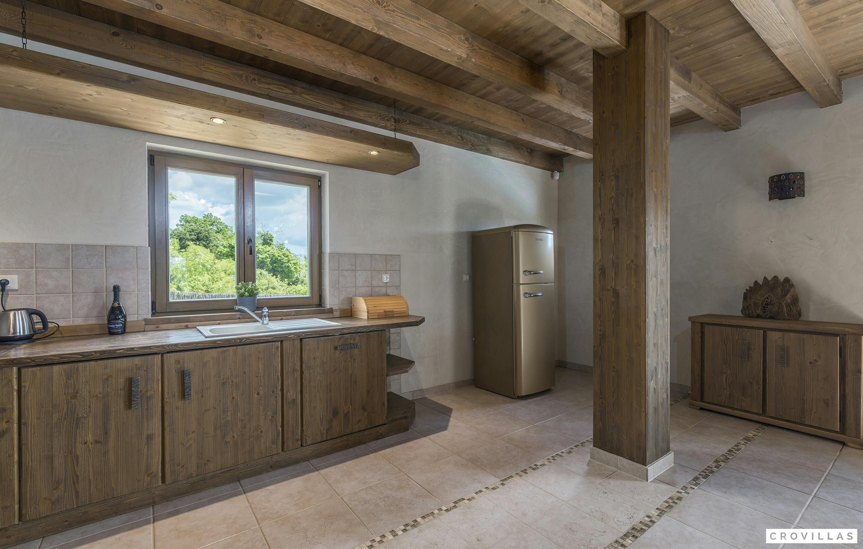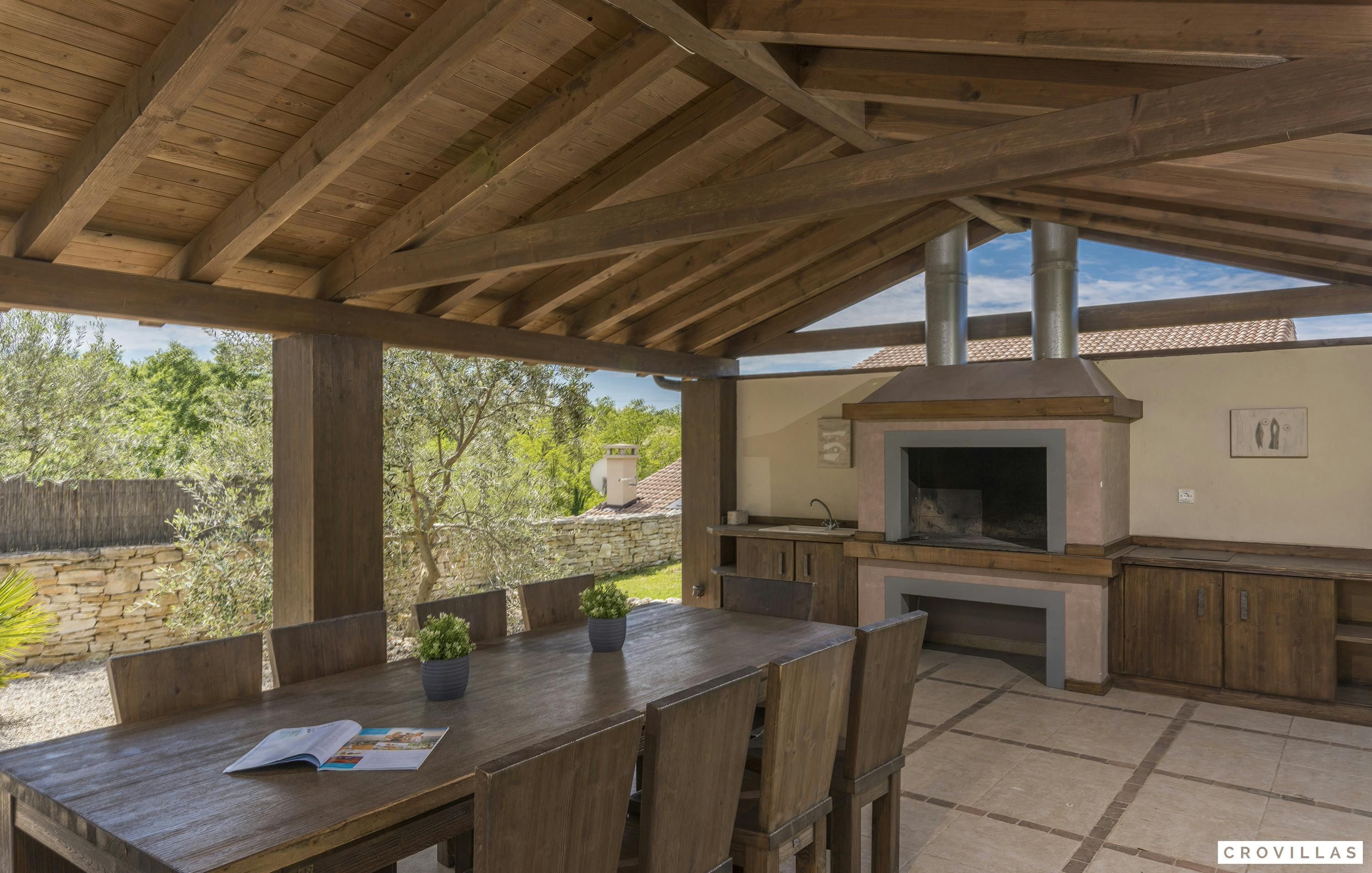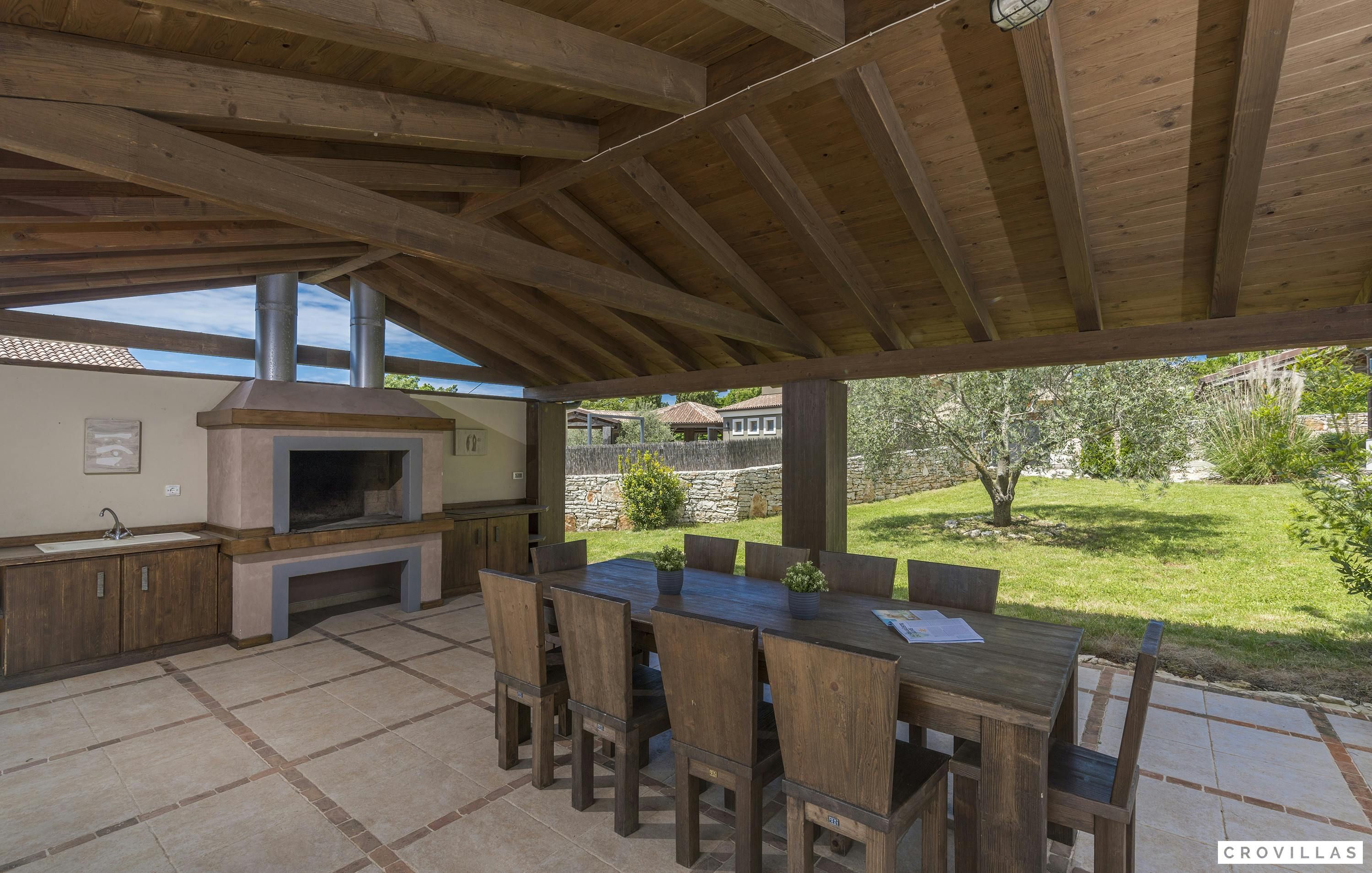 This home is an exquisite villa located in the charming village of Bonašini, near Vodnjan. The villa features a rustic country house style, with modern amenities and comfortable furnishings. The open-plan kitchen has a chest-height stove, ceramic hob, large refrigerator, coffee maker, dishwasher, kettle and much more. The living area has an in-house library and a fireplace for cozy evenings. The villa has four comfortable bedrooms with LCD TVs and en-suite bathrooms with showers or bathtubs. The villa features a small fitness area, a Finnish sauna, and a Jacuzzi. Outside there is an illuminated outdoor pool and an outdoor kitchen in the beautifully designed garden area.