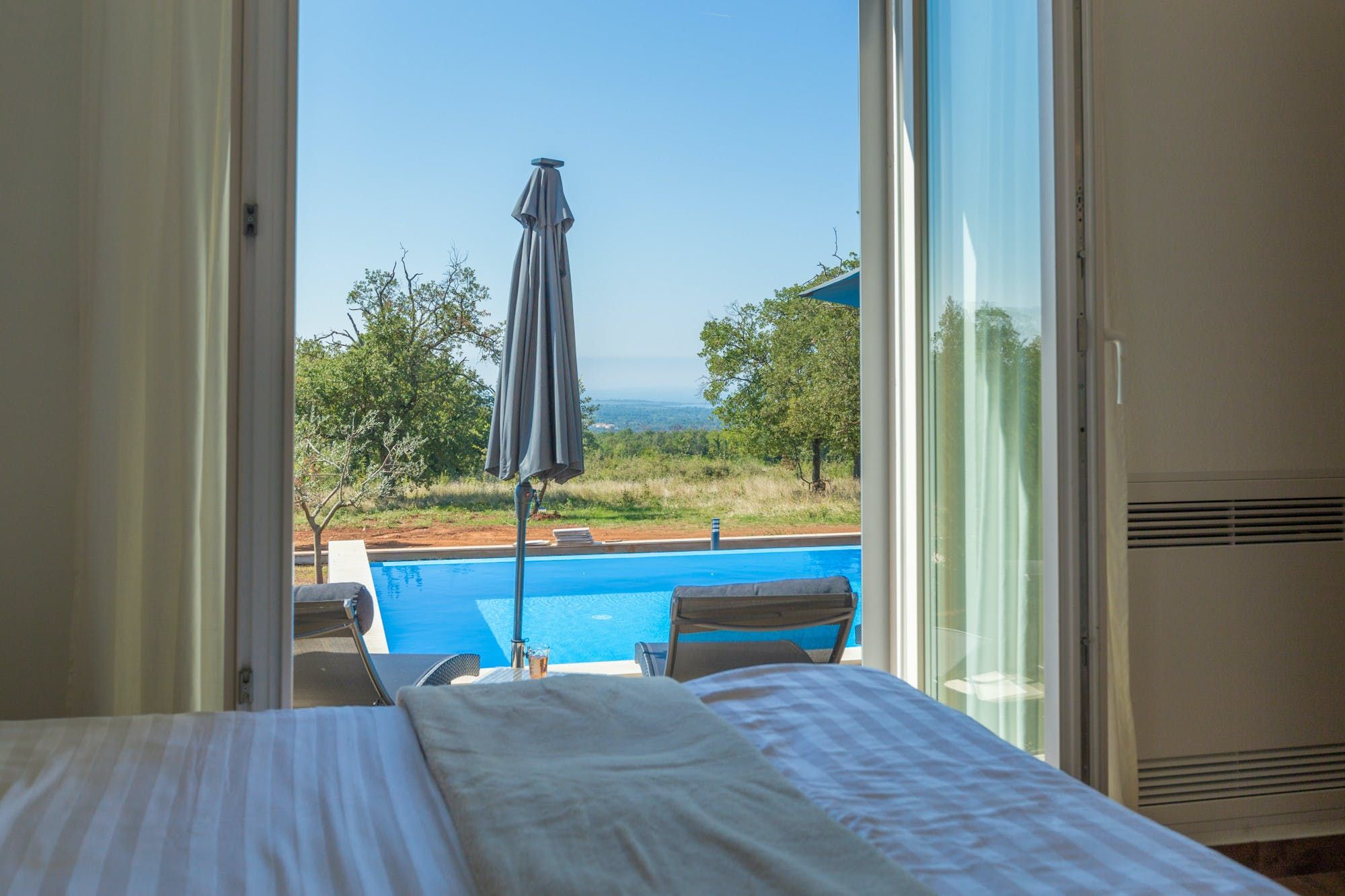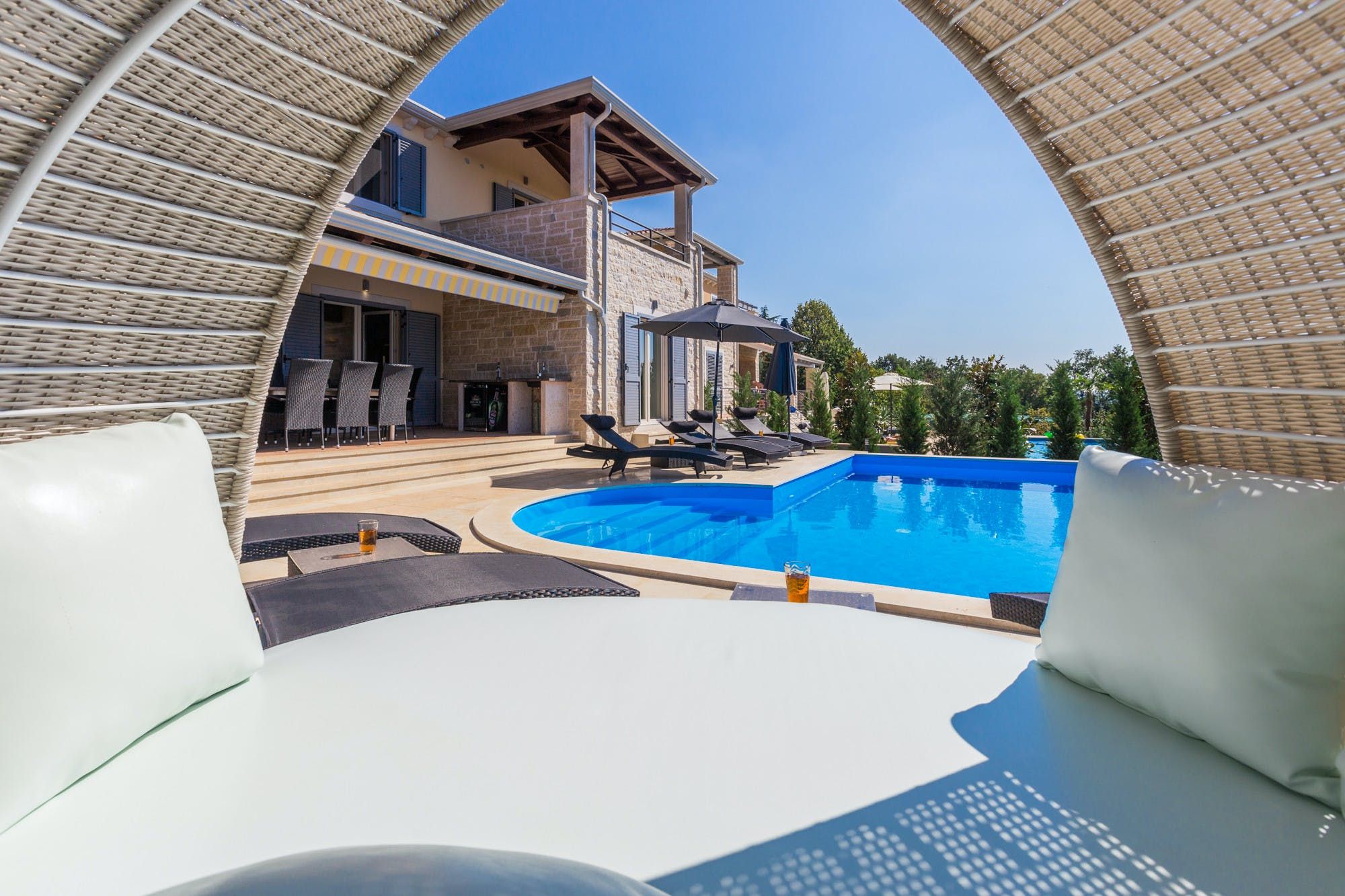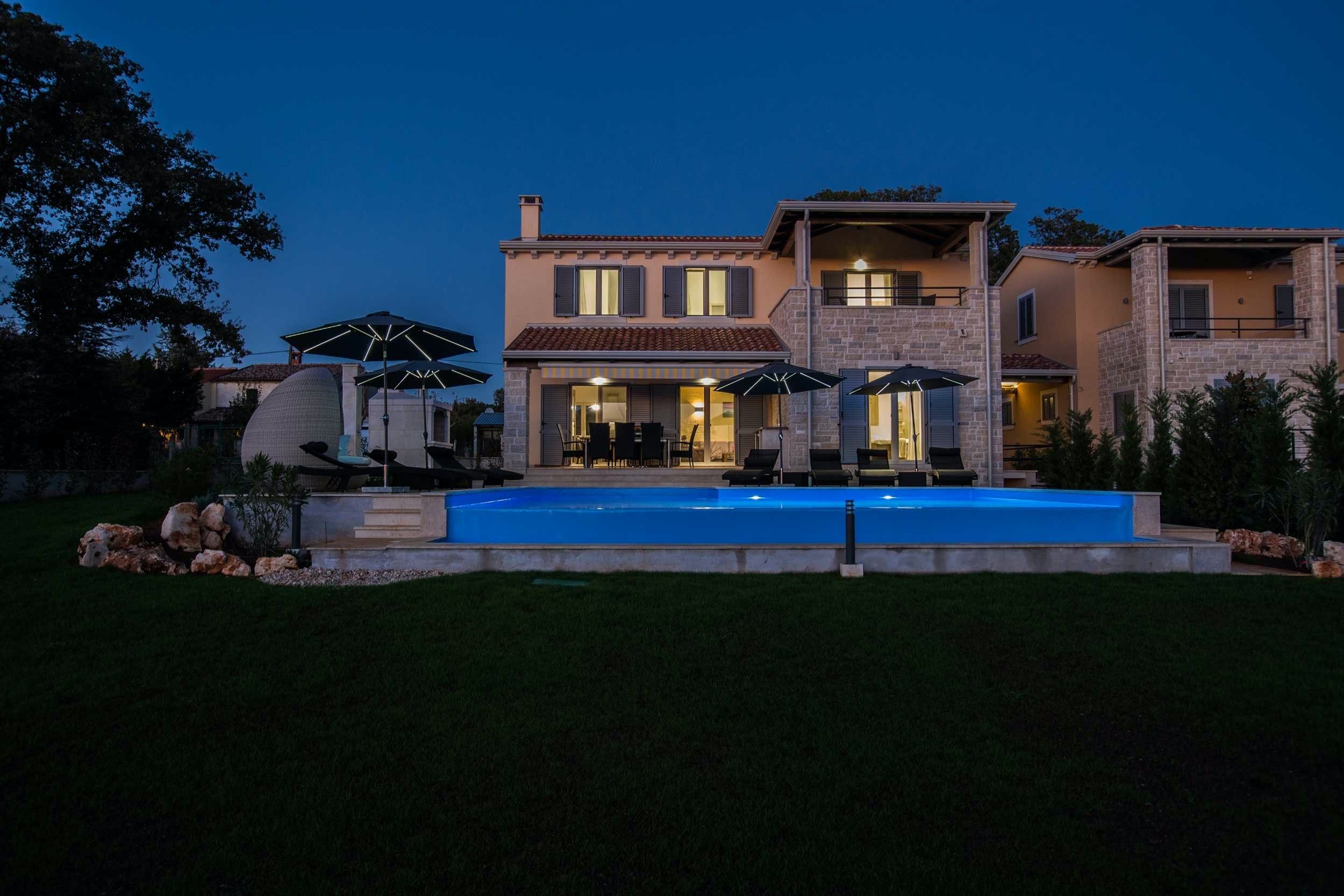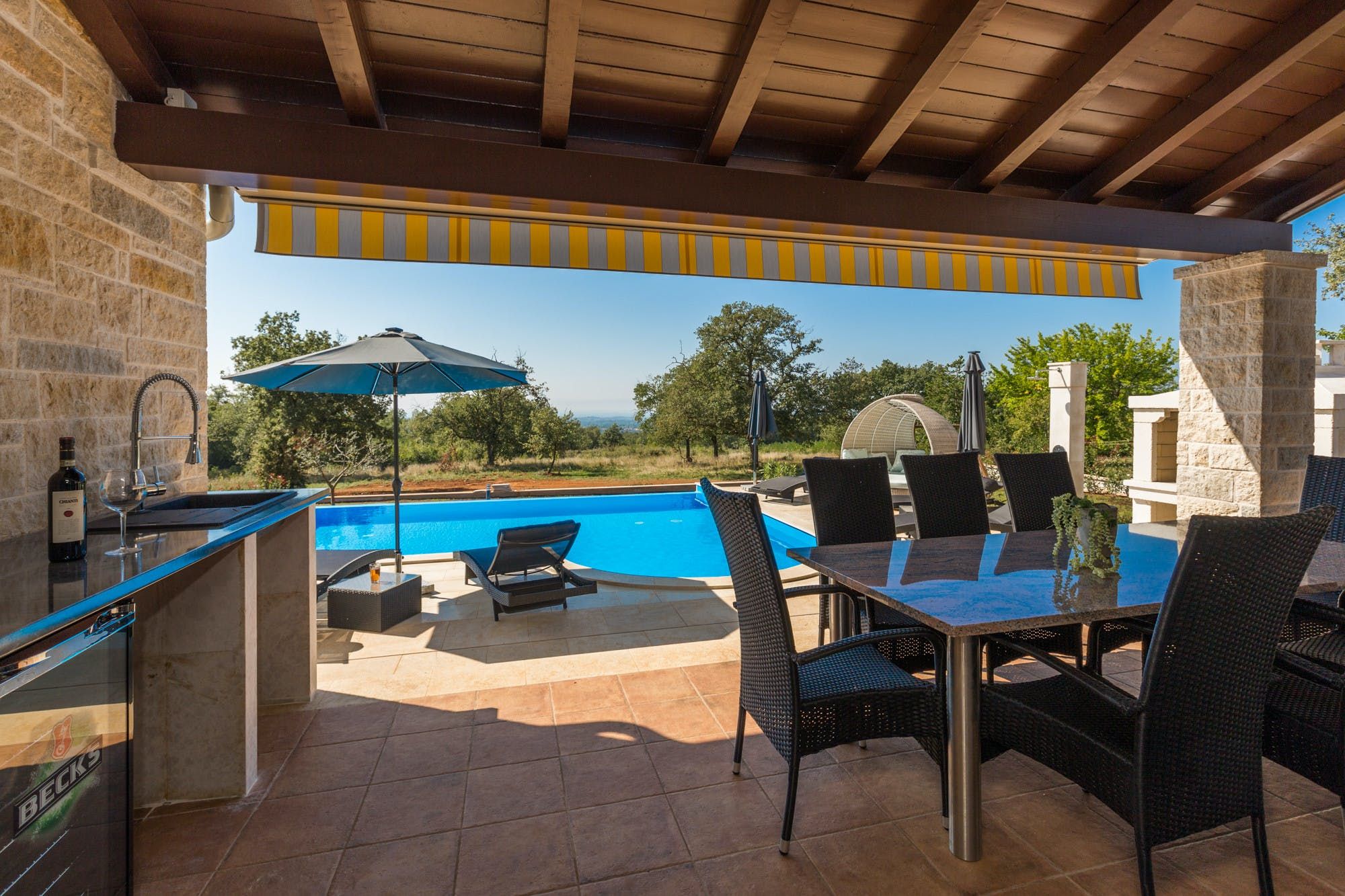 Experience luxury and privacy at the stunning luxury villa in Istria. The villa offers a breathtaking view of the sea and nearby olive groves, providing a serene atmosphere for the whole family. With a total of four air-conditioned bedrooms, each with private bathrooms, this villa can accommodate up to 8+2 guests. The first floor features a spacious living room with a large flat-screen TV, open modern kitchen, dining area for eight people, one bedroom with an adjoining bathroom, and a guest toilet. The second floor consists of three more bedrooms, all equipped with satellite TV and free Wi-Fi throughout the house and garden. The outdoor area boasts comfortable sun loungers, a 40 sqm infinity pool overlooking the sea, and a covered terrace with an adjacent outdoor grill offering an outdoor dining area for eight people. Children can enjoy the garden's amenities such as a swing with a climbing net while adults relax in total bliss.