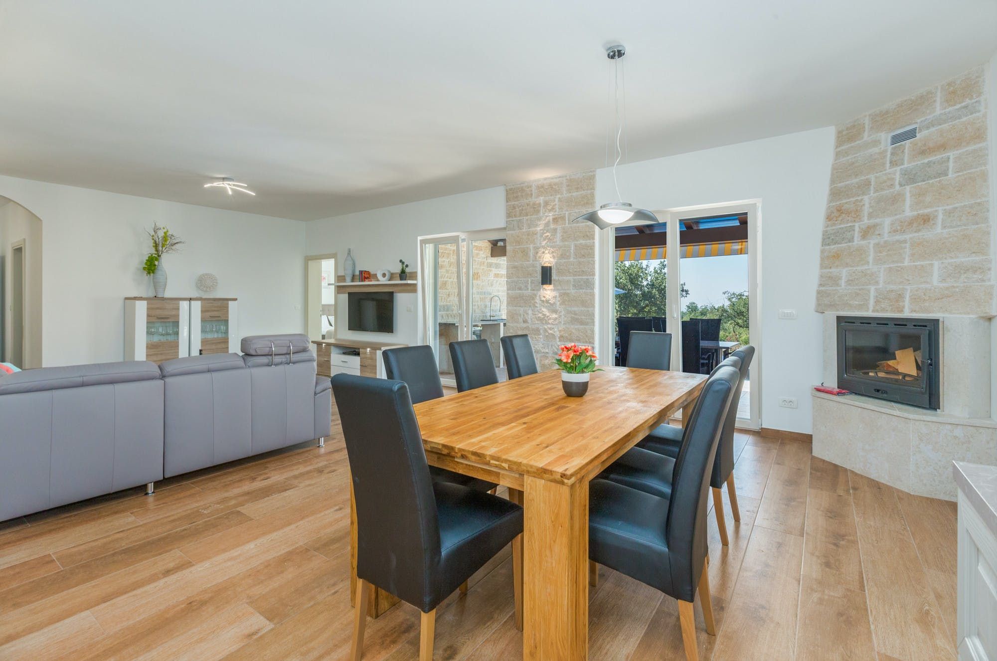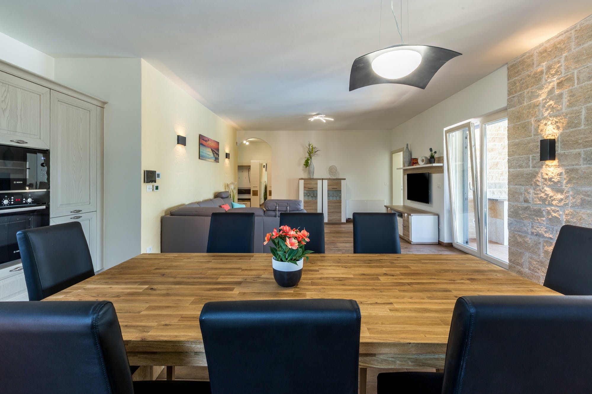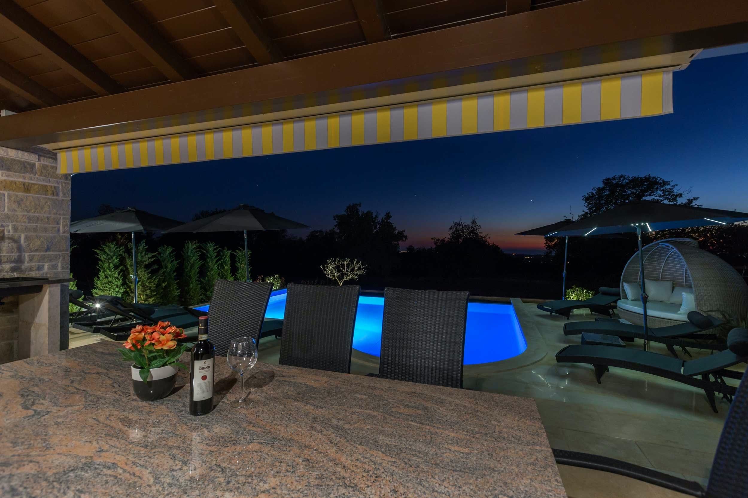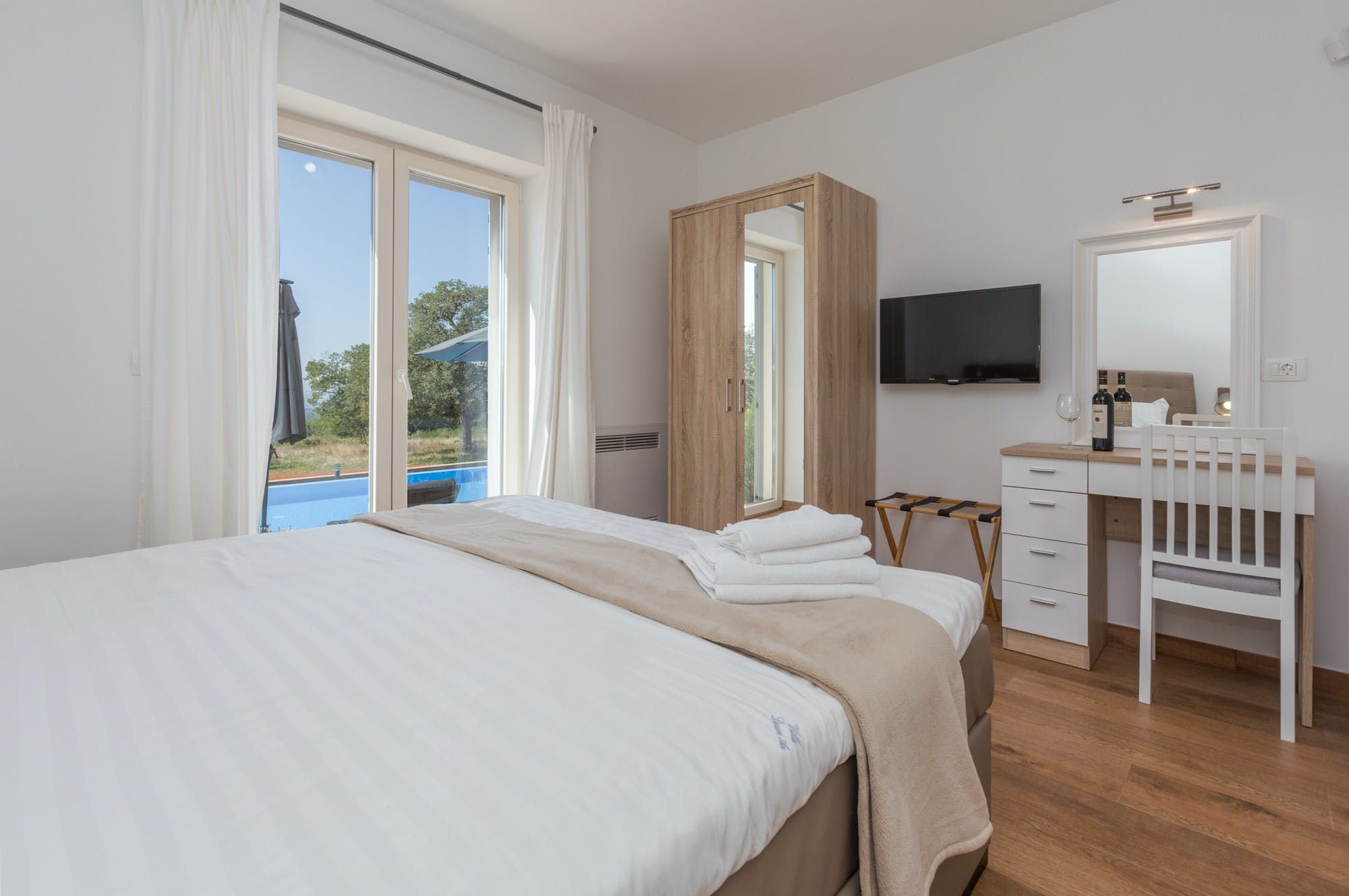 Experience luxury and privacy at the stunning luxury villa in Istria. The villa offers a breathtaking view of the sea and nearby olive groves, providing a serene atmosphere for the whole family. With a total of four air-conditioned bedrooms, each with private bathrooms, this villa can accommodate up to 8+2 guests. The first floor features a spacious living room with a large flat-screen TV, open modern kitchen, dining area for eight people, one bedroom with an adjoining bathroom, and a guest toilet. The second floor consists of three more bedrooms, all equipped with satellite TV and free Wi-Fi throughout the house and garden. The outdoor area boasts comfortable sun loungers, a 40 sqm infinity pool overlooking the sea, and a covered terrace with an adjacent outdoor grill offering an outdoor dining area for eight people. Children can enjoy the garden's amenities such as a swing with a climbing net while adults relax in total bliss.