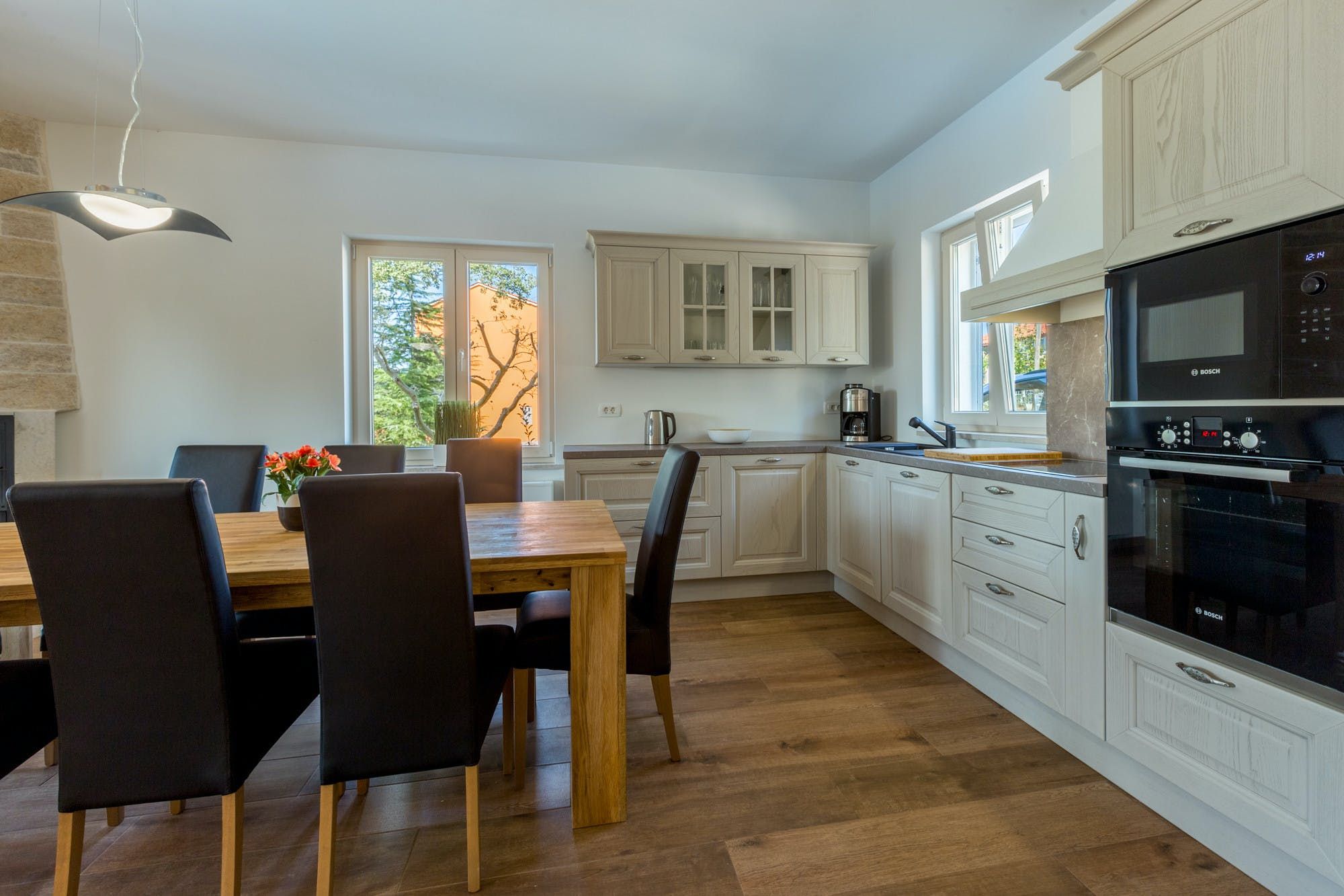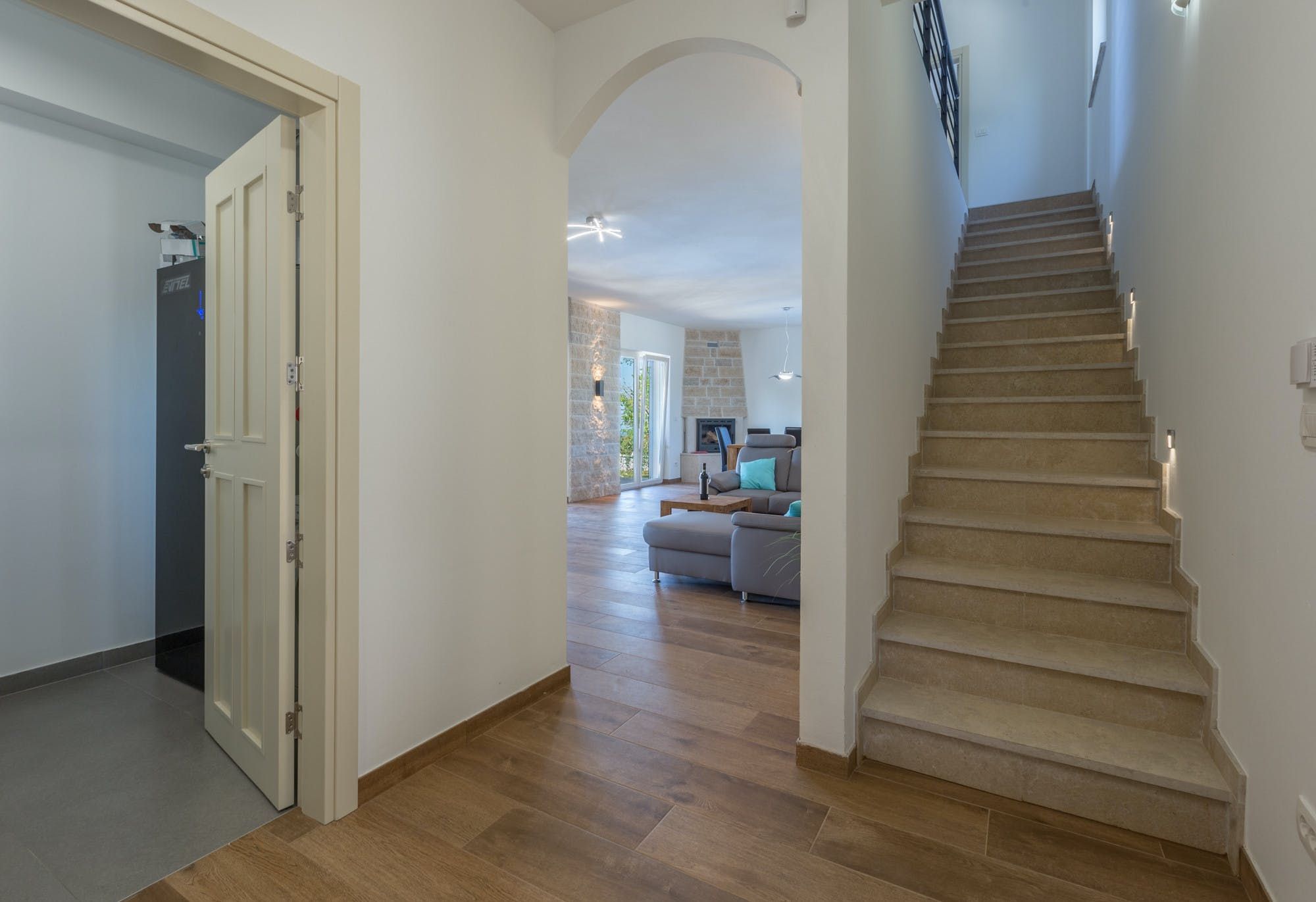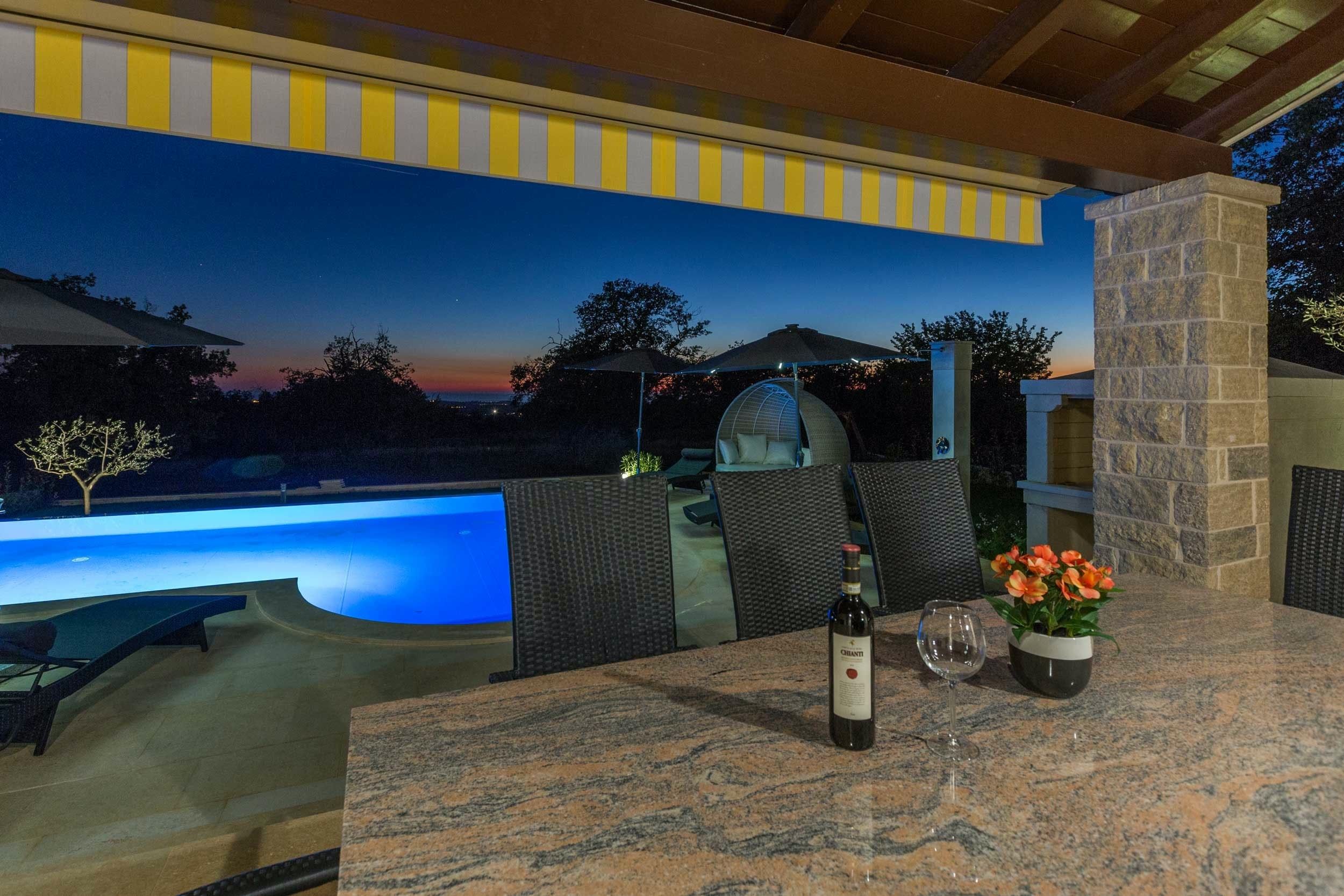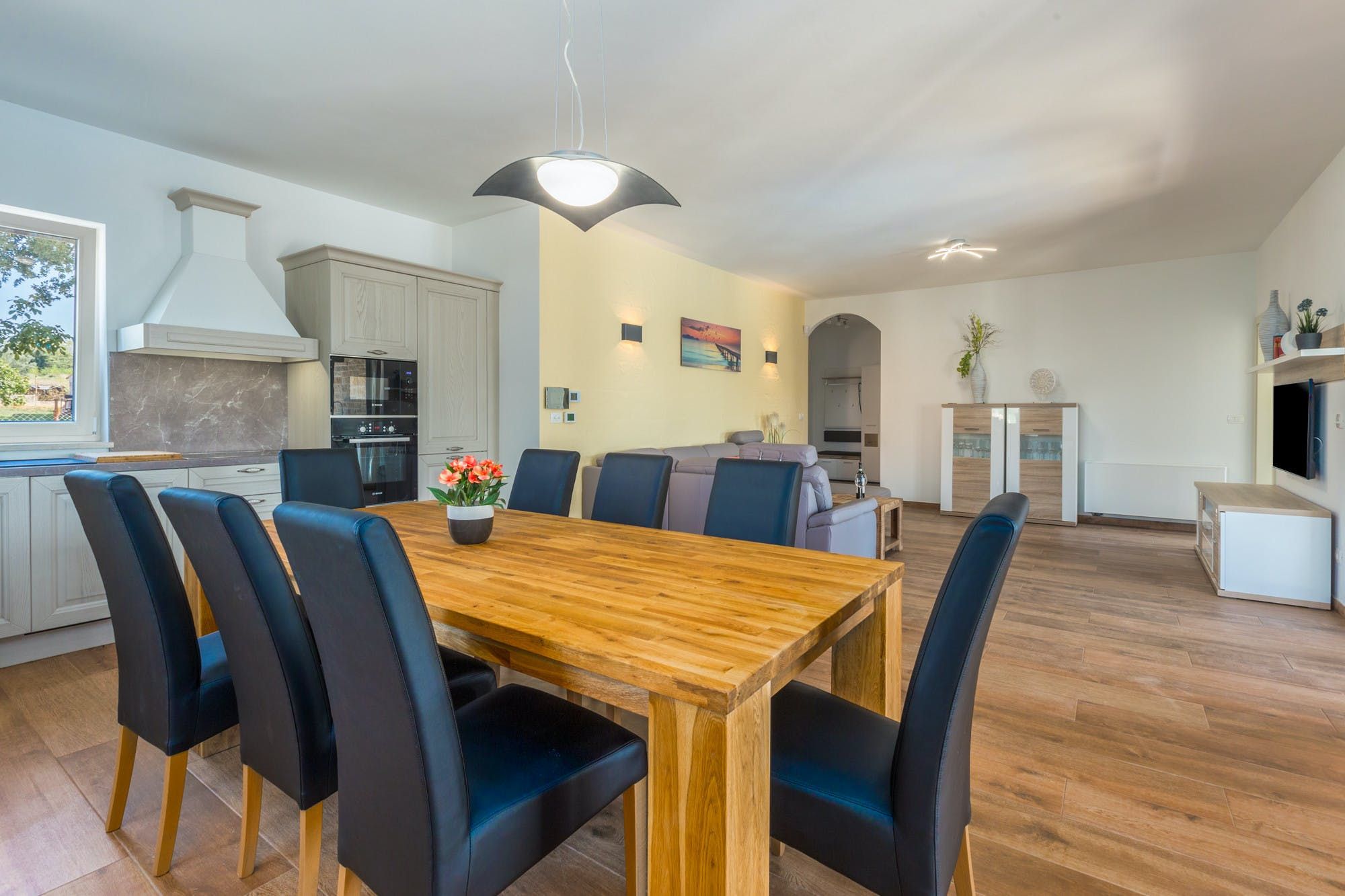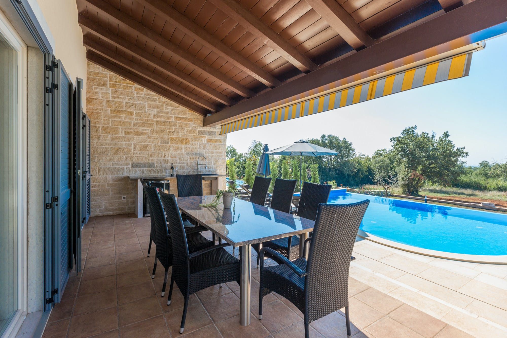 Experience luxury and privacy at the stunning luxury villa in Istria. The villa offers a breathtaking view of the sea and nearby olive groves, providing a serene atmosphere for the whole family. With a total of four air-conditioned bedrooms, each with private bathrooms, this villa can accommodate up to 8+2 guests. The first floor features a spacious living room with a large flat-screen TV, open modern kitchen, dining area for eight people, one bedroom with an adjoining bathroom, and a guest toilet. The second floor consists of three more bedrooms, all equipped with satellite TV and free Wi-Fi throughout the house and garden. The outdoor area boasts comfortable sun loungers, a 40 sqm infinity pool overlooking the sea, and a covered terrace with an adjacent outdoor grill offering an outdoor dining area for eight people. Children can enjoy the garden's amenities such as a swing with a climbing net while adults relax in total bliss.
