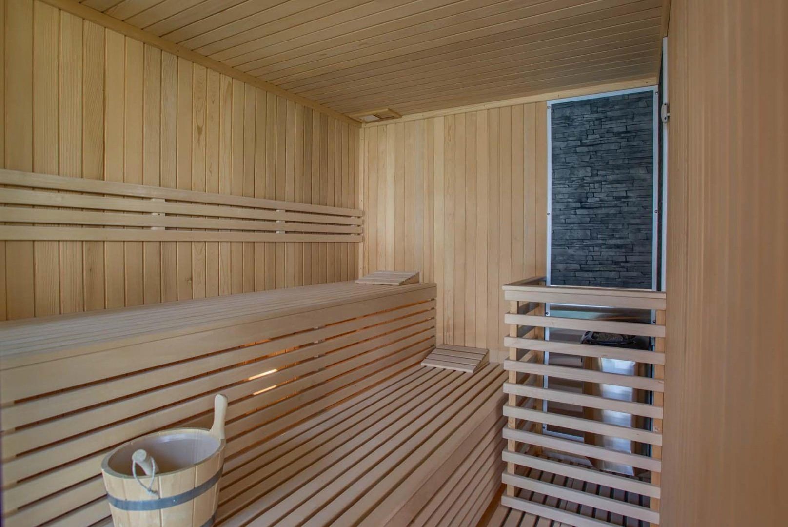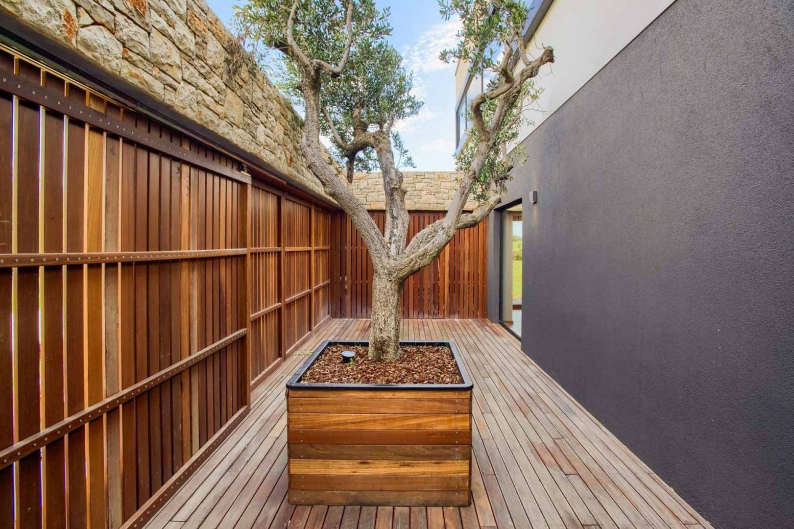 Heading inside, we love the floating staircase, like something from an interior design mag. The living area is bright and open, creating a social spot flooded with sunlight during the day. It’s here you’ll find the sleek black kitchen with its island and breakfast bar for plenty of prep space, and dining for the whole group at the wooden table. Should you want to keep on top of your fitness schedule, there’s a dedicated gym room and a sauna for afterwards. Bedrooms all open up to the outdoors from double sliding doors, so there’s no need to fight for the master.