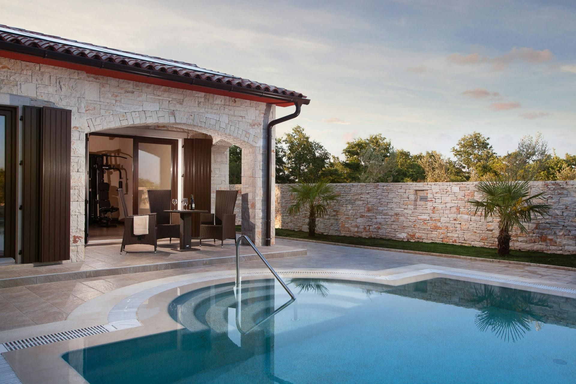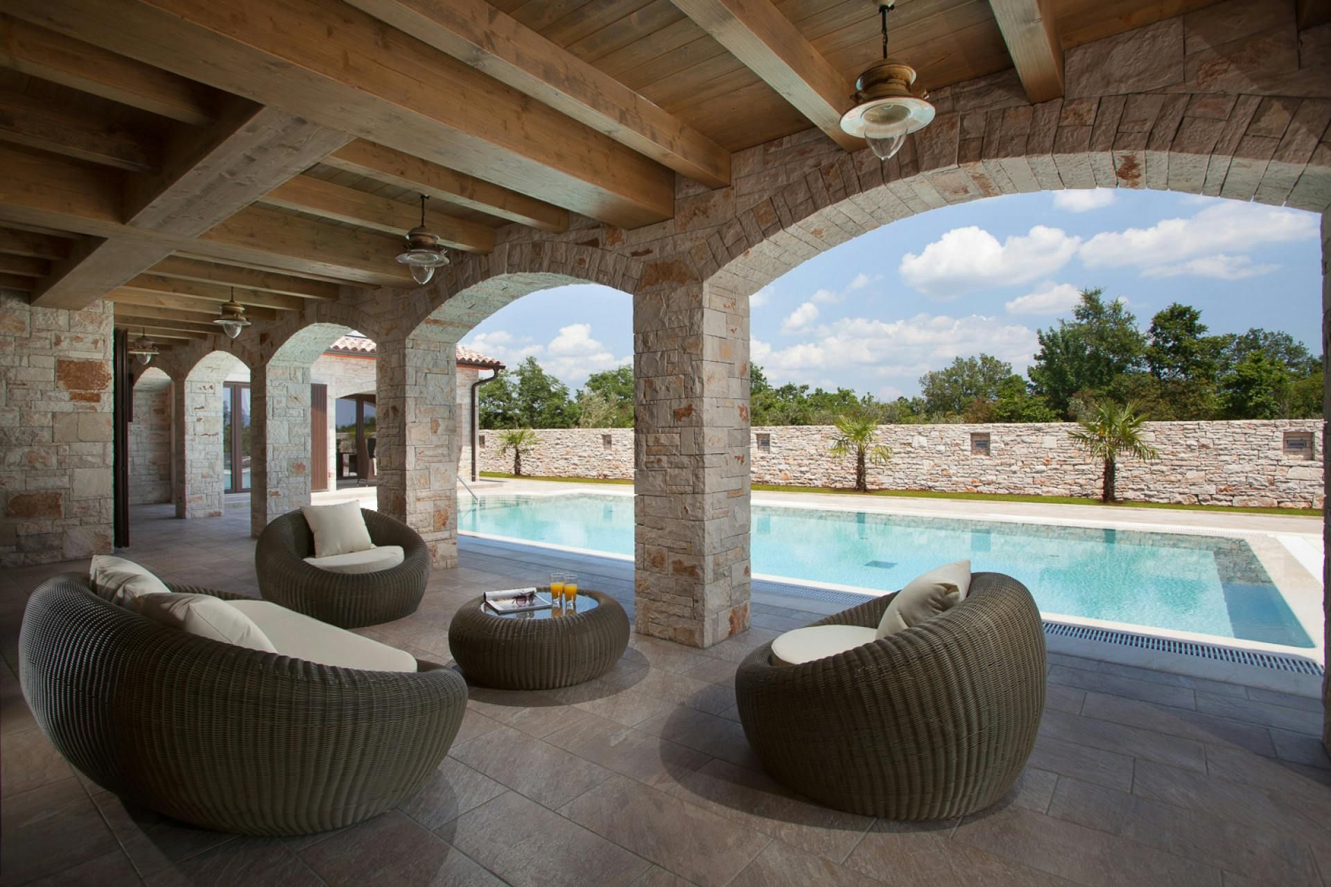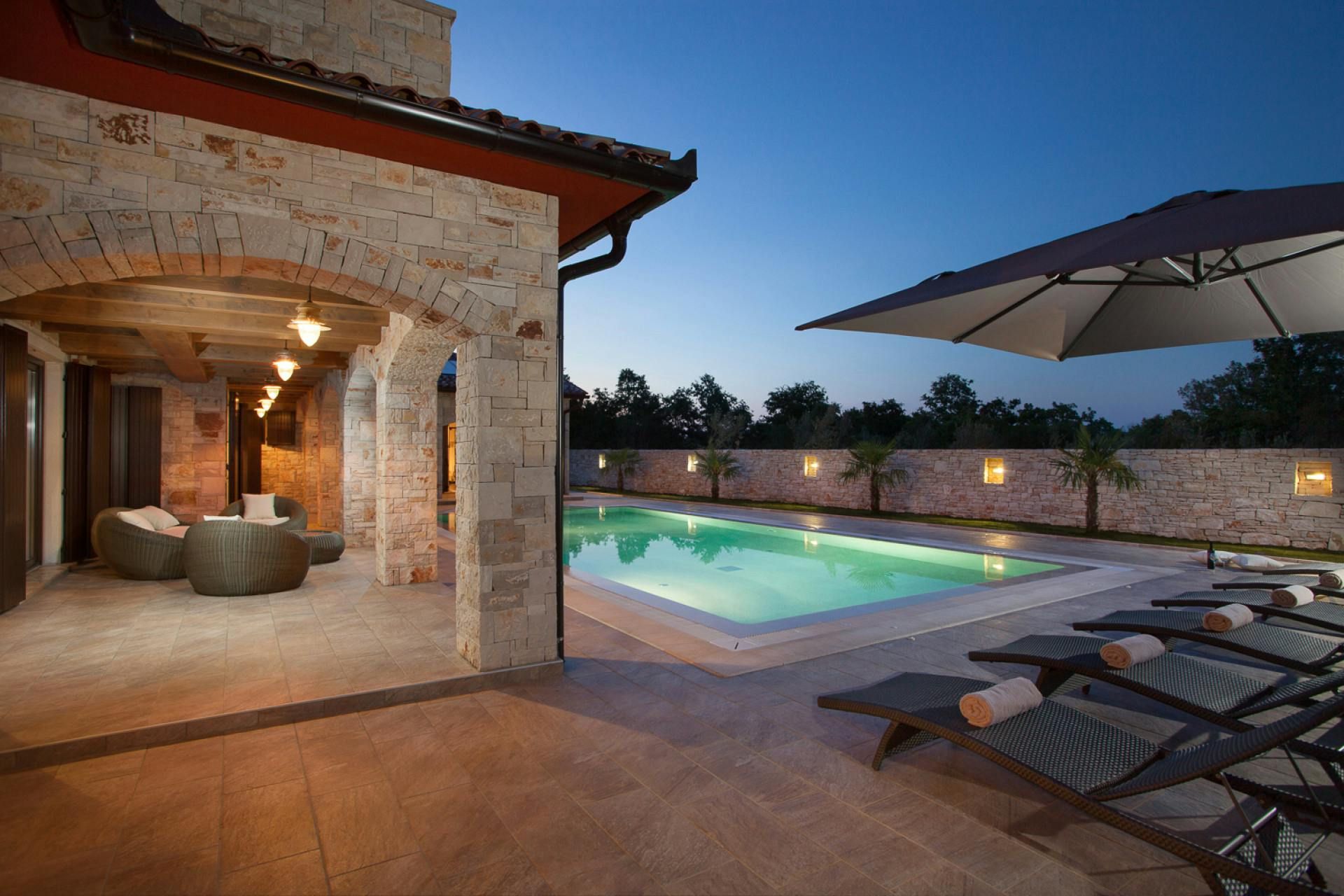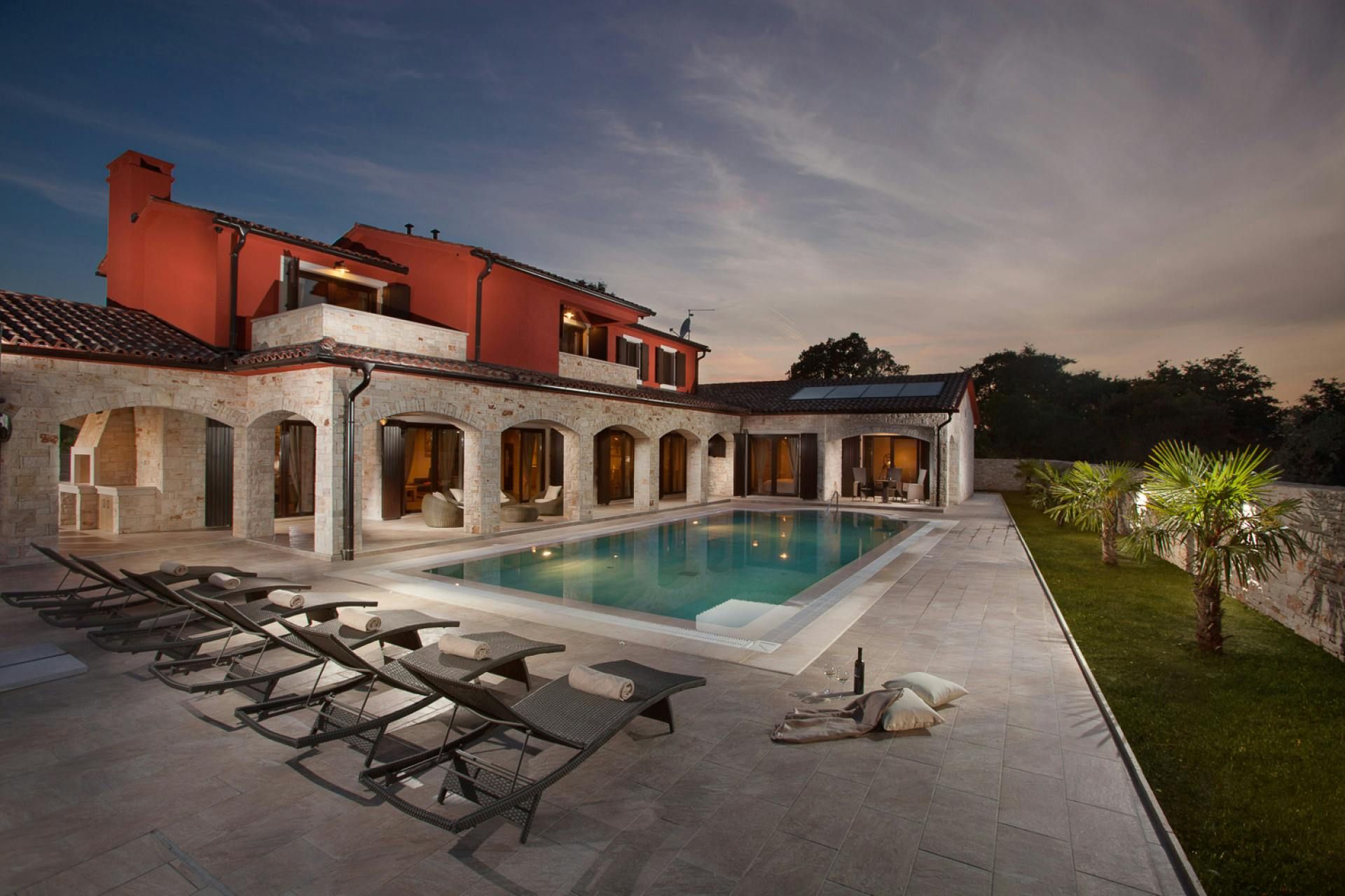 This stunning villa in Croatia provides a perfect blend of classic elegance and modern functionality for a comfortable holiday. The property boasts a beautiful green lawn, circular arches, natural stone and a striking red structure that surrounds the 65 m² pool. Guests can relax under the night sky in the open-air jacuzzi or on the spacious terrace, which is equipped with high-quality comfortable furniture. The outdoor covered kitchen features a built-in barbecue and long table for guests to enjoy meals together. On-site amenities include a volleyball field, table tennis table and children's play toys. Inside the villa, large floor-to-ceiling windows flood the 400 m² interior with natural light. The professional kitchen is fully equipped for self-catering, while minimalist living accents and wood elements provide simple elegance throughout. The four tastefully decorated bedrooms each have modern ensuite bathrooms and direct access to the terrace or balcony. The villa is ideally located for exploring Istria, with nearby villages connected by a small country road and the beach and golf course just 15 km and 25 km away, respectively.