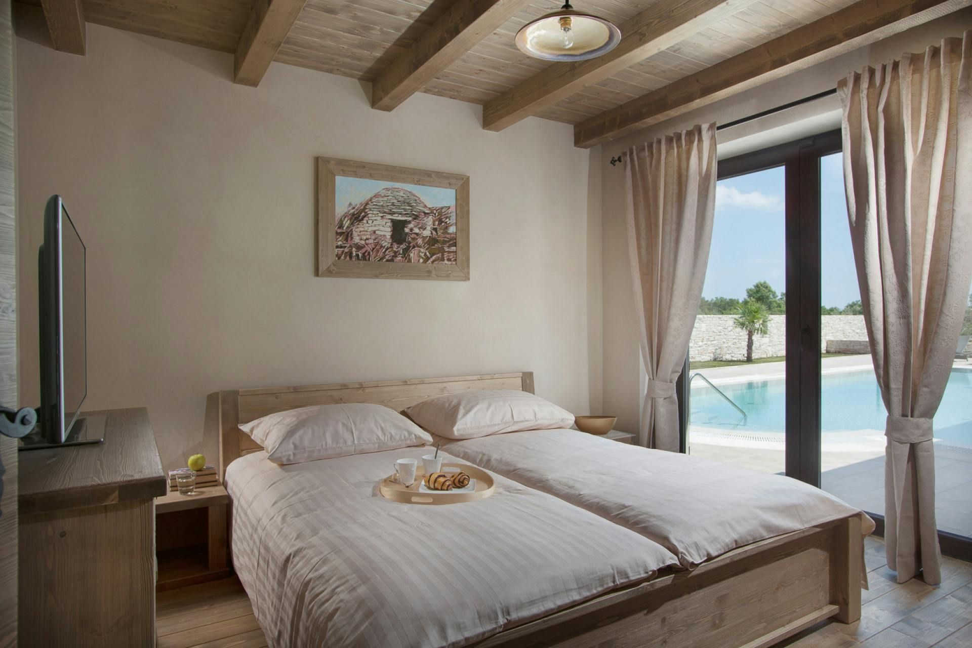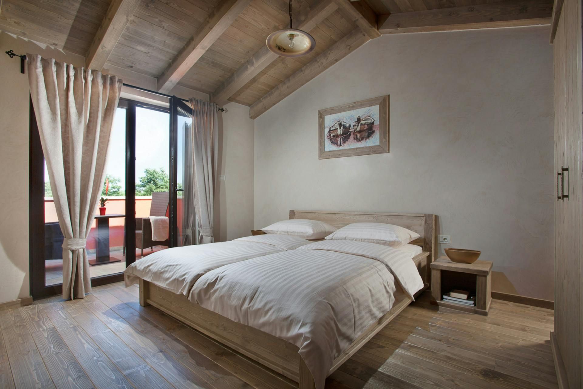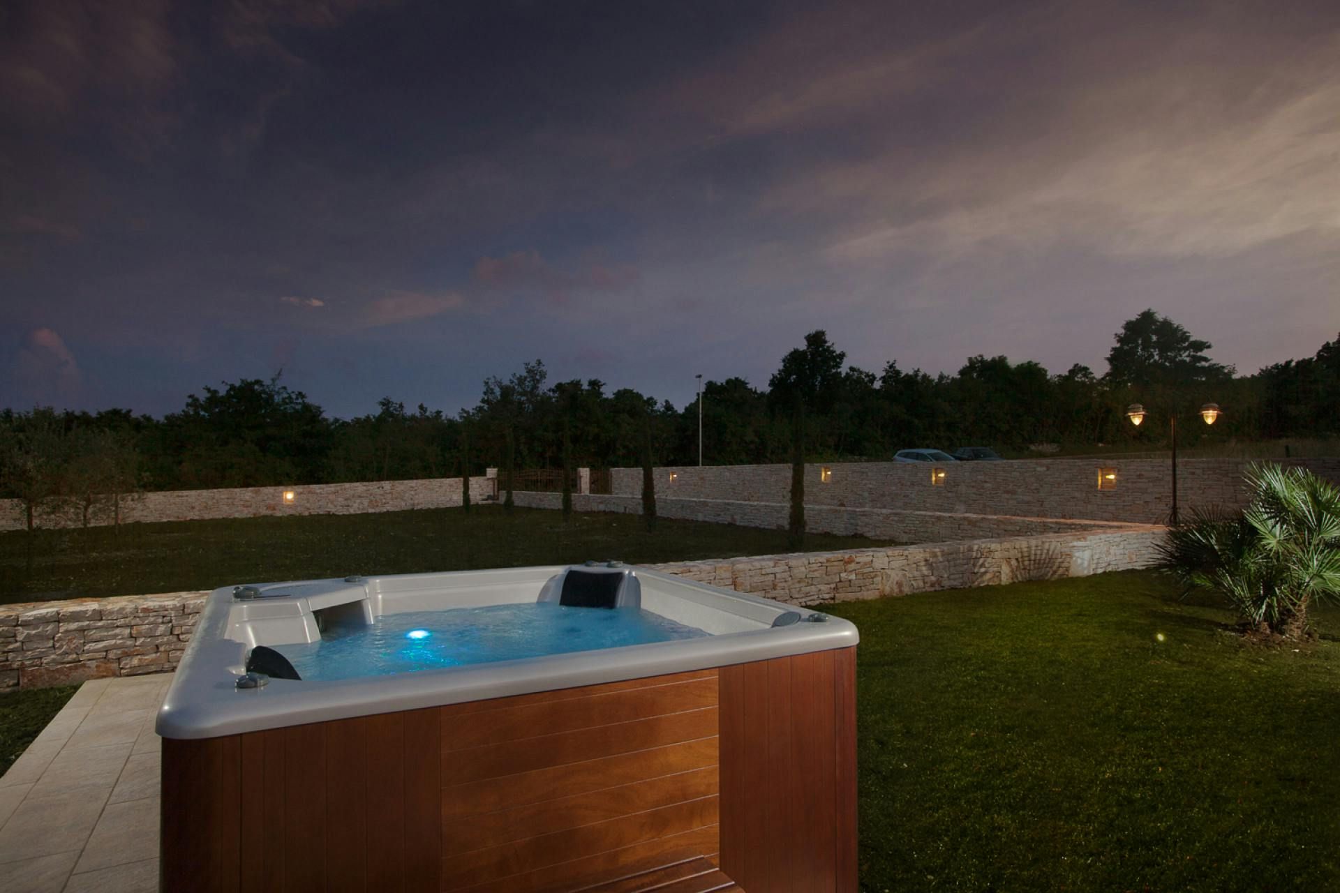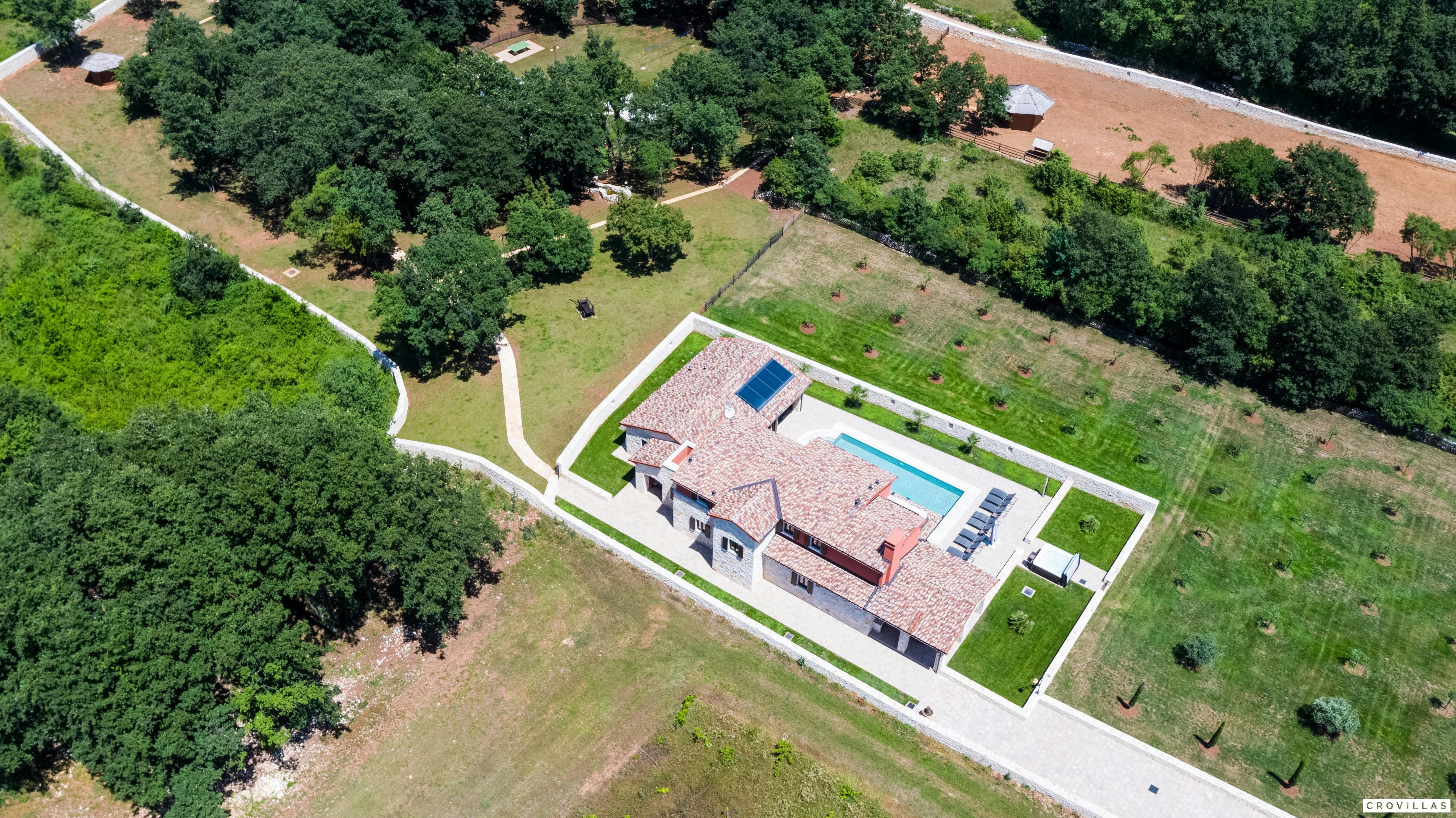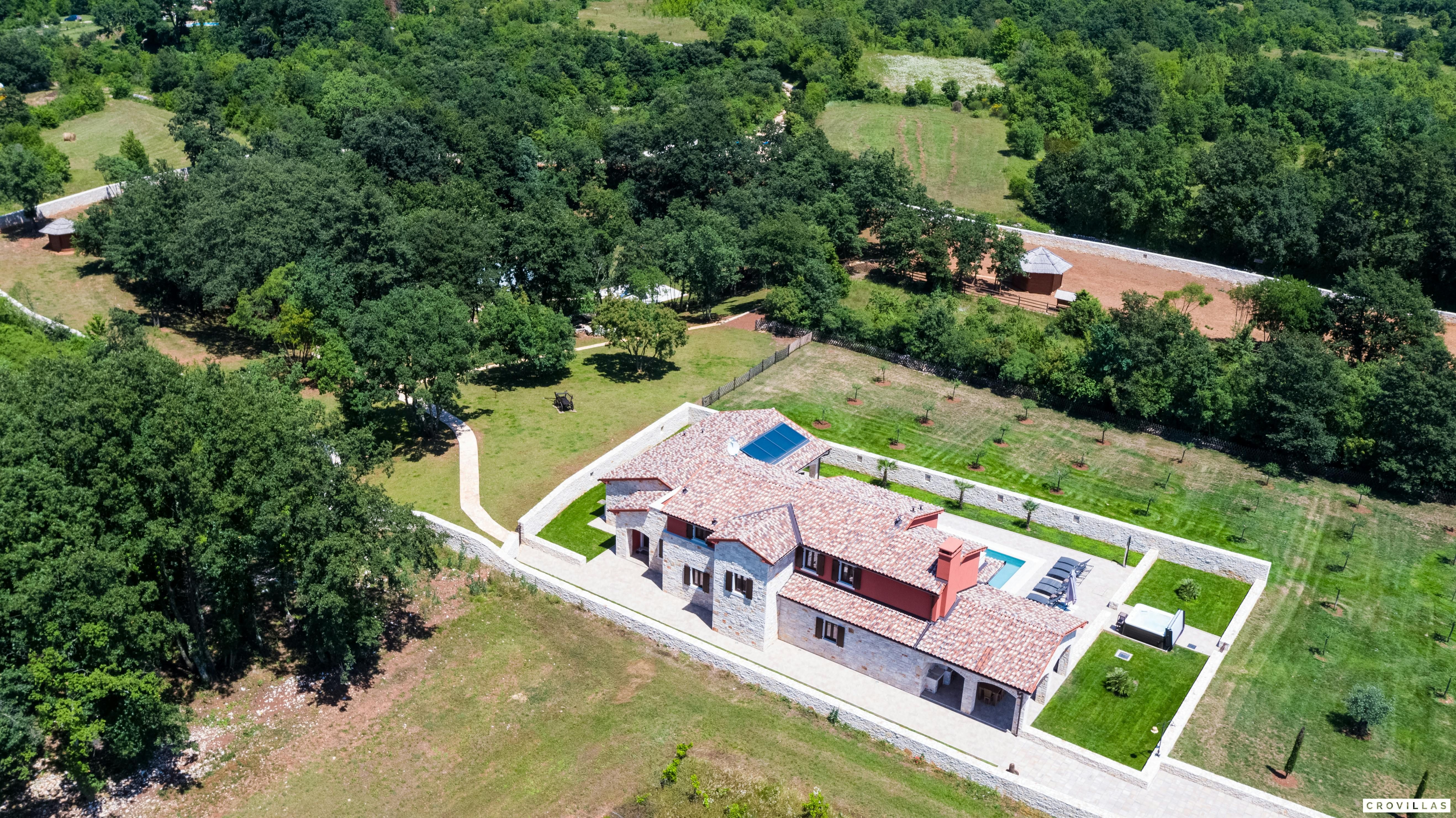 This stunning villa in Croatia provides a perfect blend of classic elegance and modern functionality for a comfortable holiday. The property boasts a beautiful green lawn, circular arches, natural stone and a striking red structure that surrounds the 65 m² pool. Guests can relax under the night sky in the open-air jacuzzi or on the spacious terrace, which is equipped with high-quality comfortable furniture. The outdoor covered kitchen features a built-in barbecue and long table for guests to enjoy meals together. On-site amenities include a volleyball field, table tennis table and children's play toys. Inside the villa, large floor-to-ceiling windows flood the 400 m² interior with natural light. The professional kitchen is fully equipped for self-catering, while minimalist living accents and wood elements provide simple elegance throughout. The four tastefully decorated bedrooms each have modern ensuite bathrooms and direct access to the terrace or balcony. The villa is ideally located for exploring Istria, with nearby villages connected by a small country road and the beach and golf course just 15 km and 25 km away, respectively.
