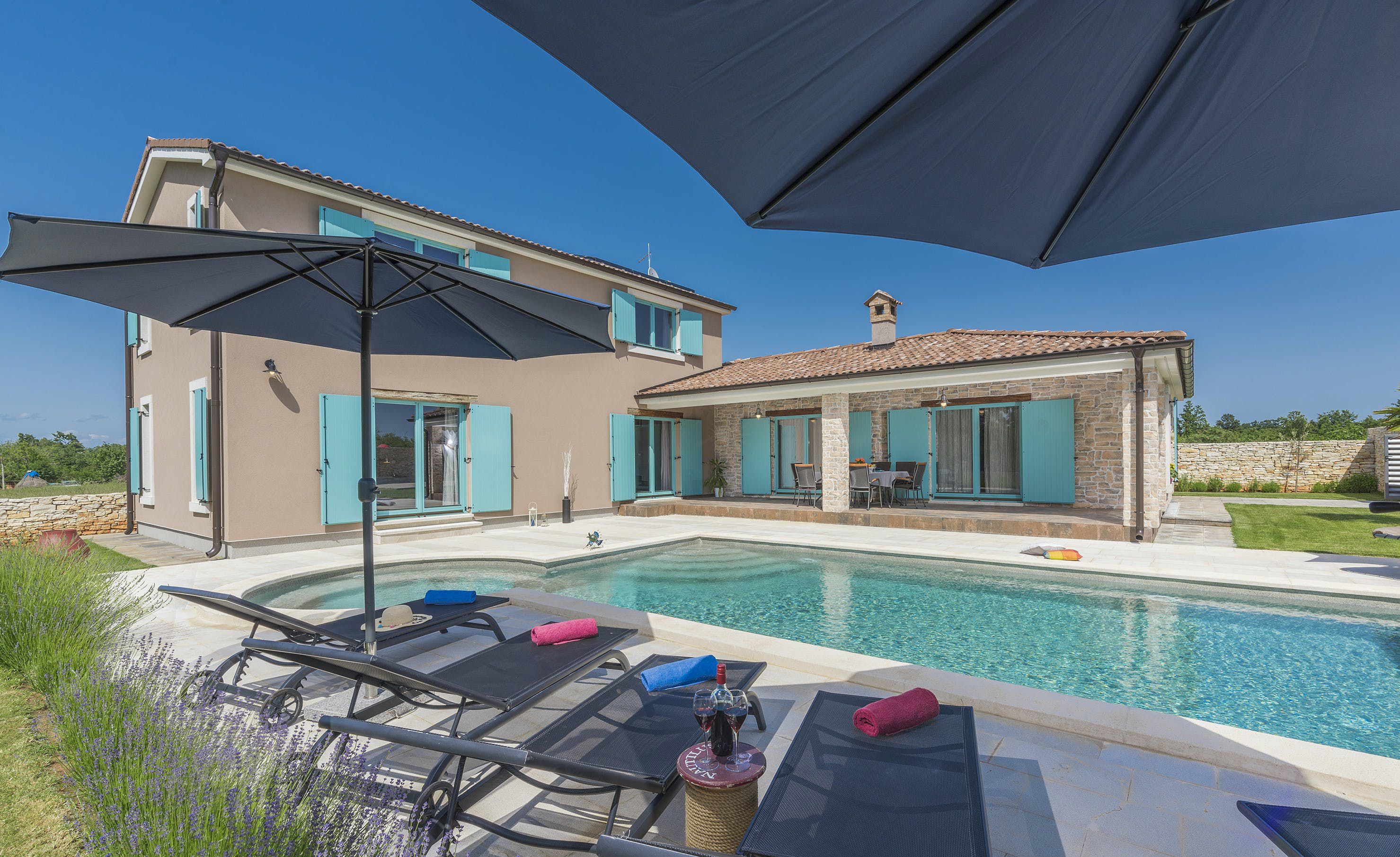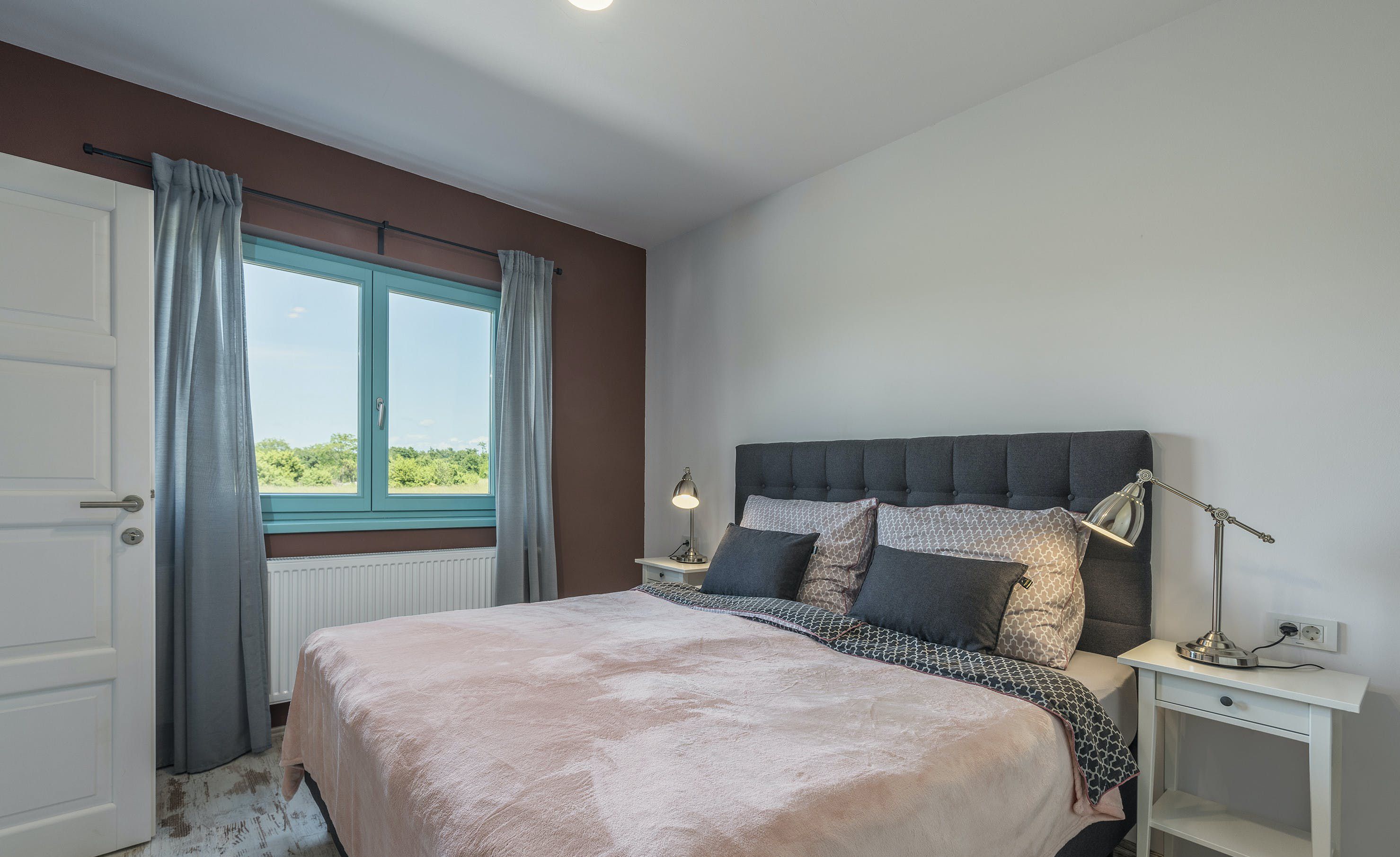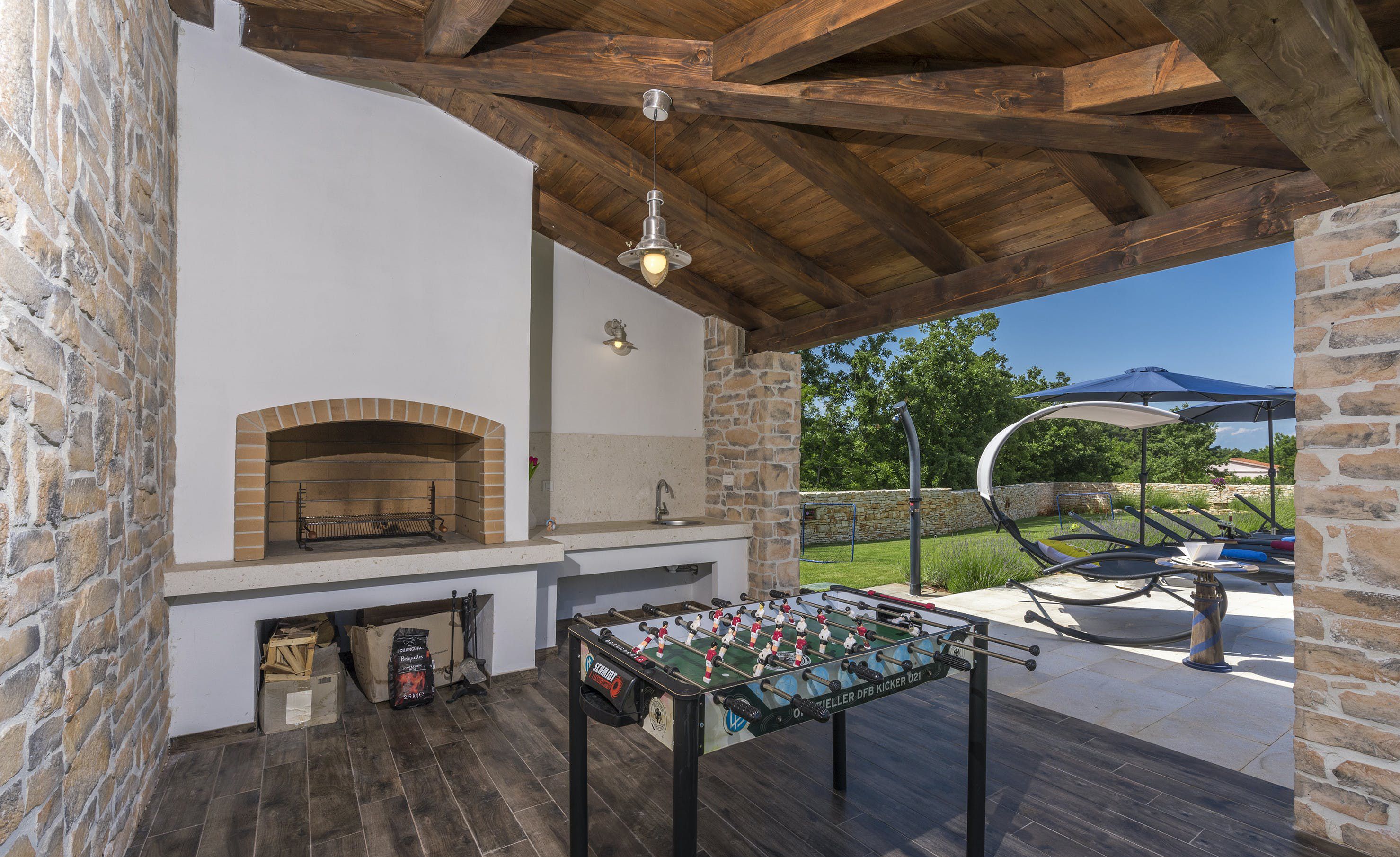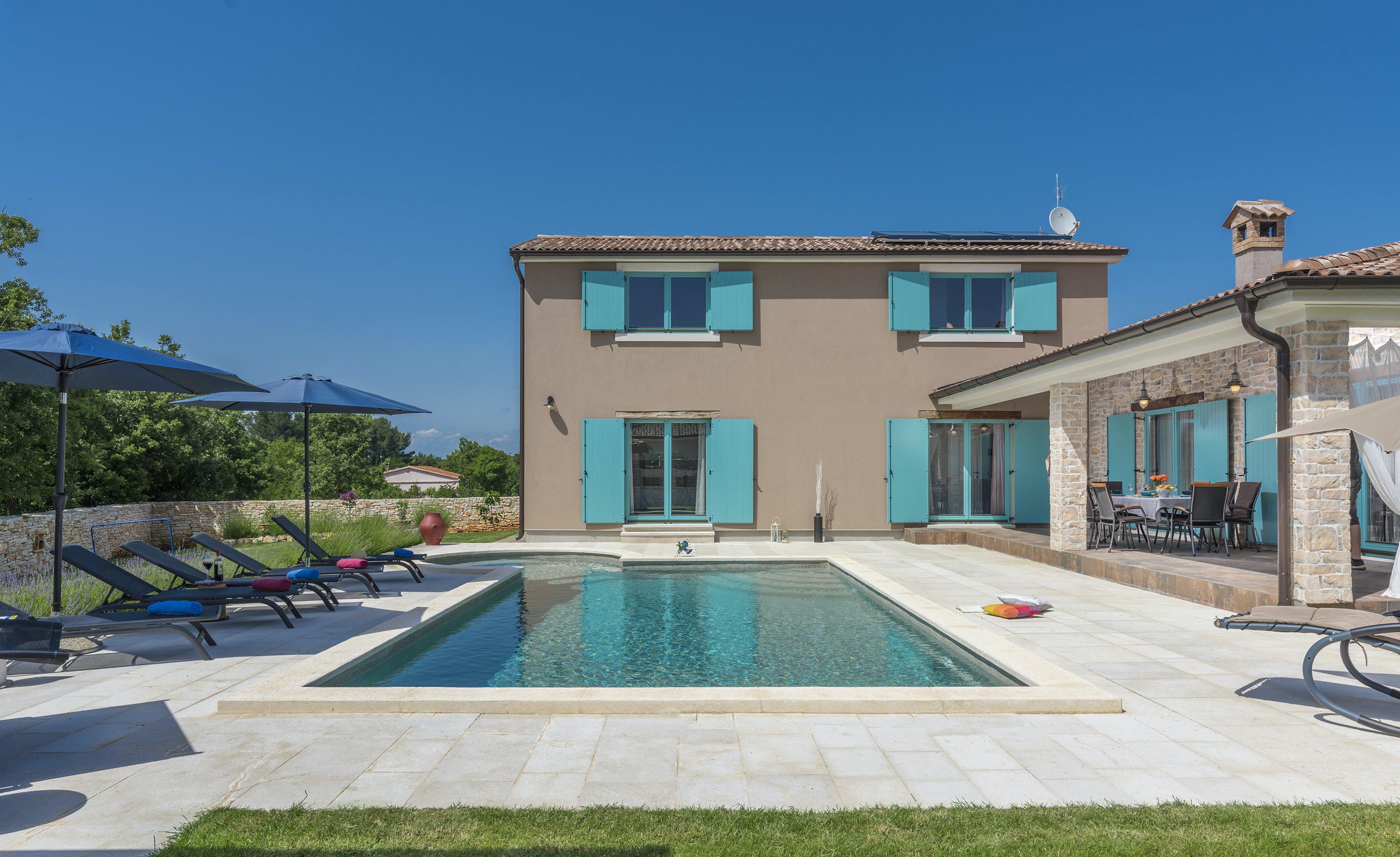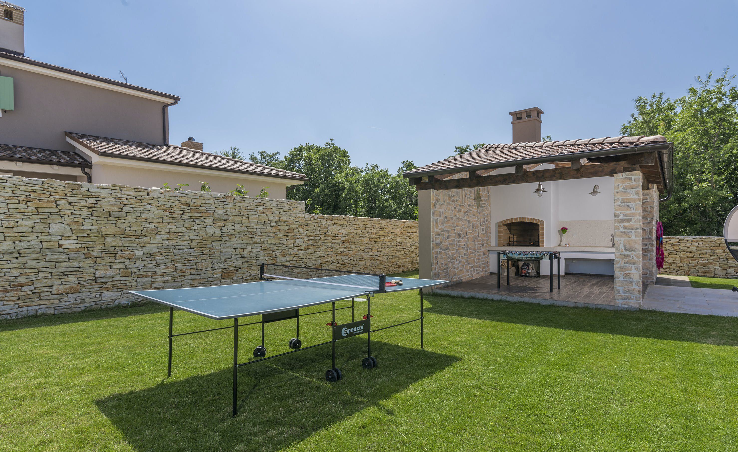 This modern villa near Pula is perfect for two families or a group of friends. The L-shaped house is situated on a large, well-maintained, completely fenced 1,000 sqm area with a pool terrace in front of it. The pool has a comfortable staircase entrance and a hydro massage feature. Besides the pool, guests can enjoy table tennis, small football goals, and table soccer on the premises. The outdoor brick grill provides an opportunity to end the day with a barbecue. Indoors, there is a trendy living room with lots of wood and colorful accents. The living areas flow into each other and are tasteful and consistent in color and style. On the ground floor, there is a super bedroom with direct access to the pool and en suite bathroom as well as a practical guest toilet. Upstairs, there are three bedrooms - two with views of the pool and garden - each with an en suite bathroom. The home provides the best conditions for an unforgettable vacation.