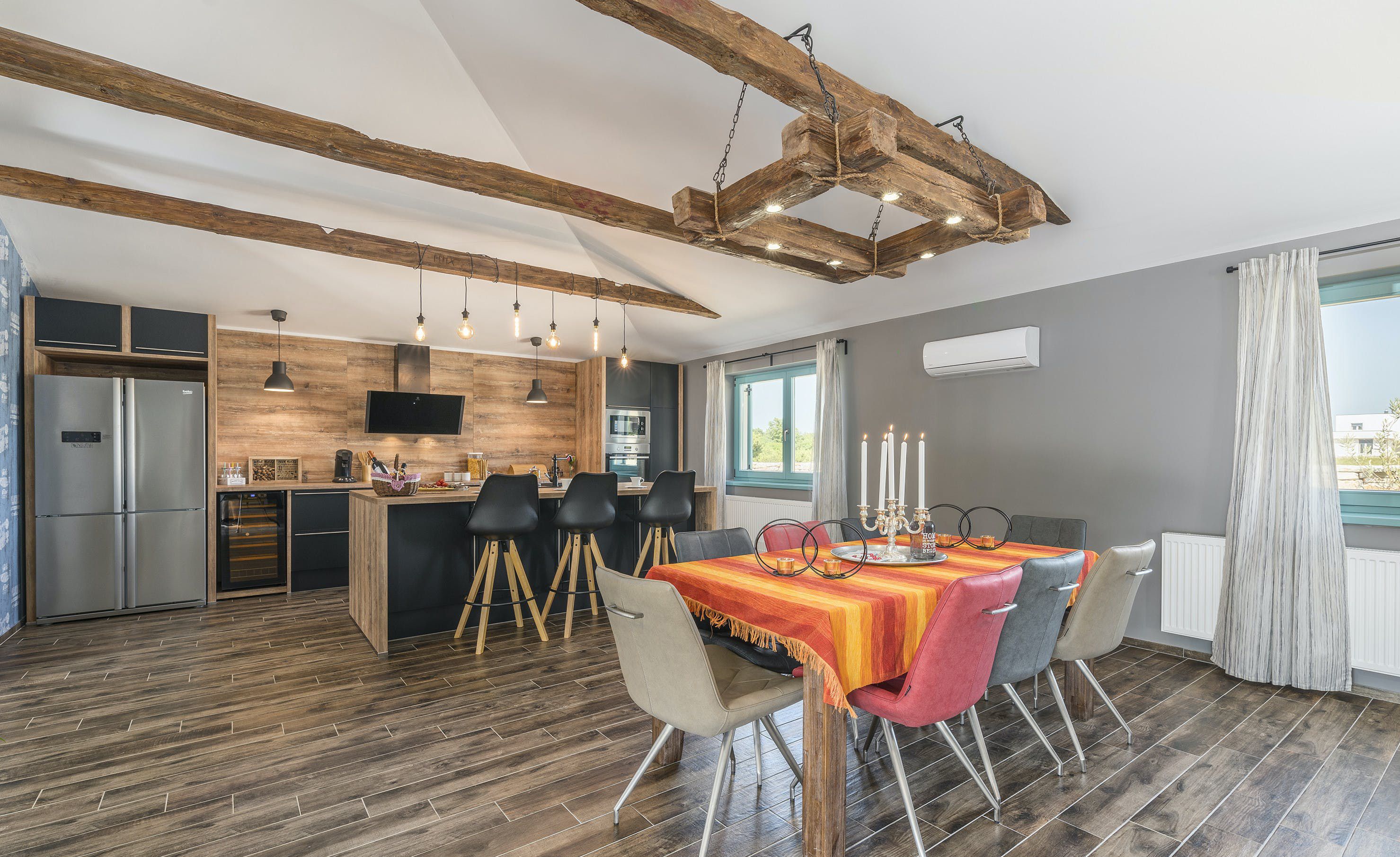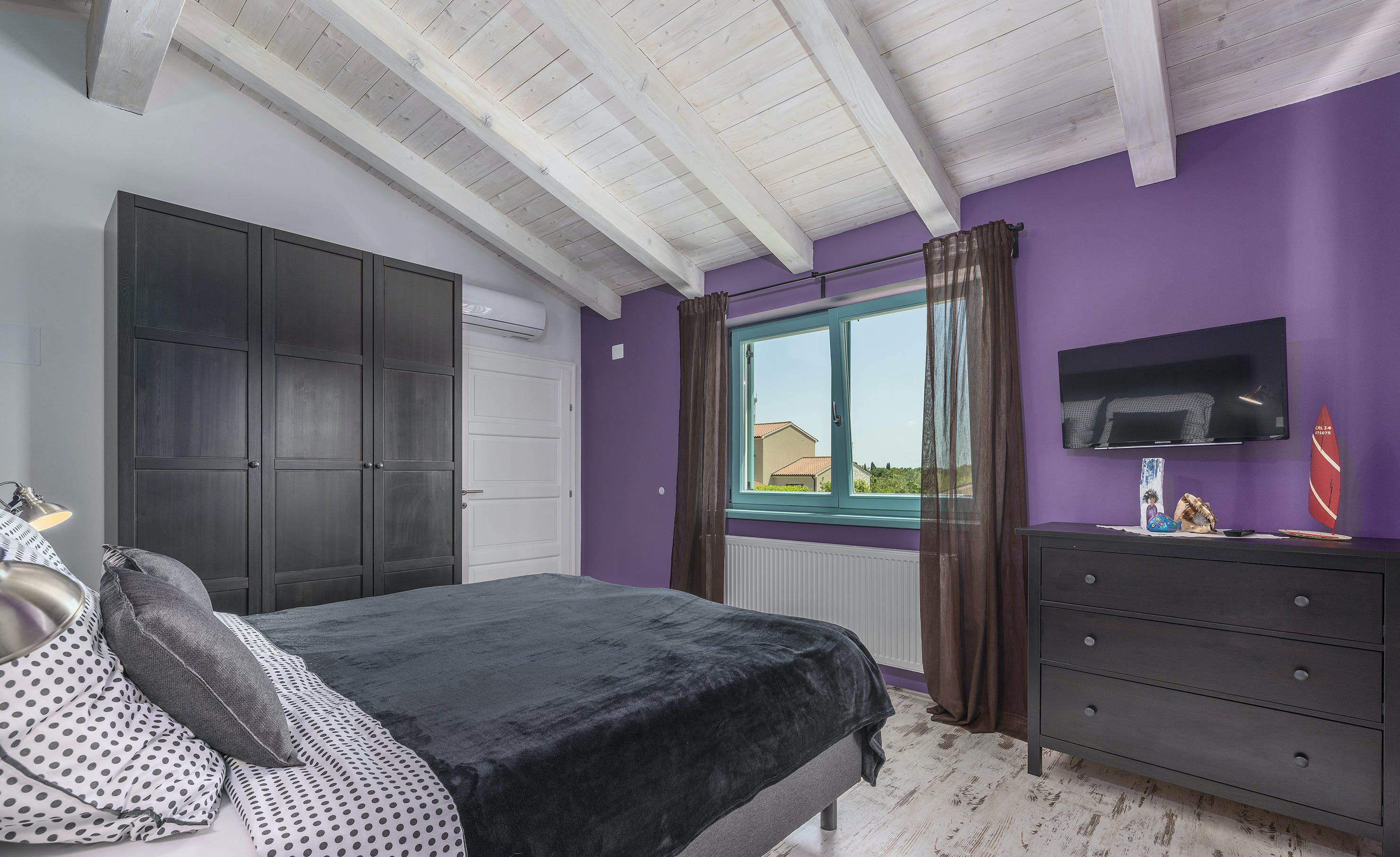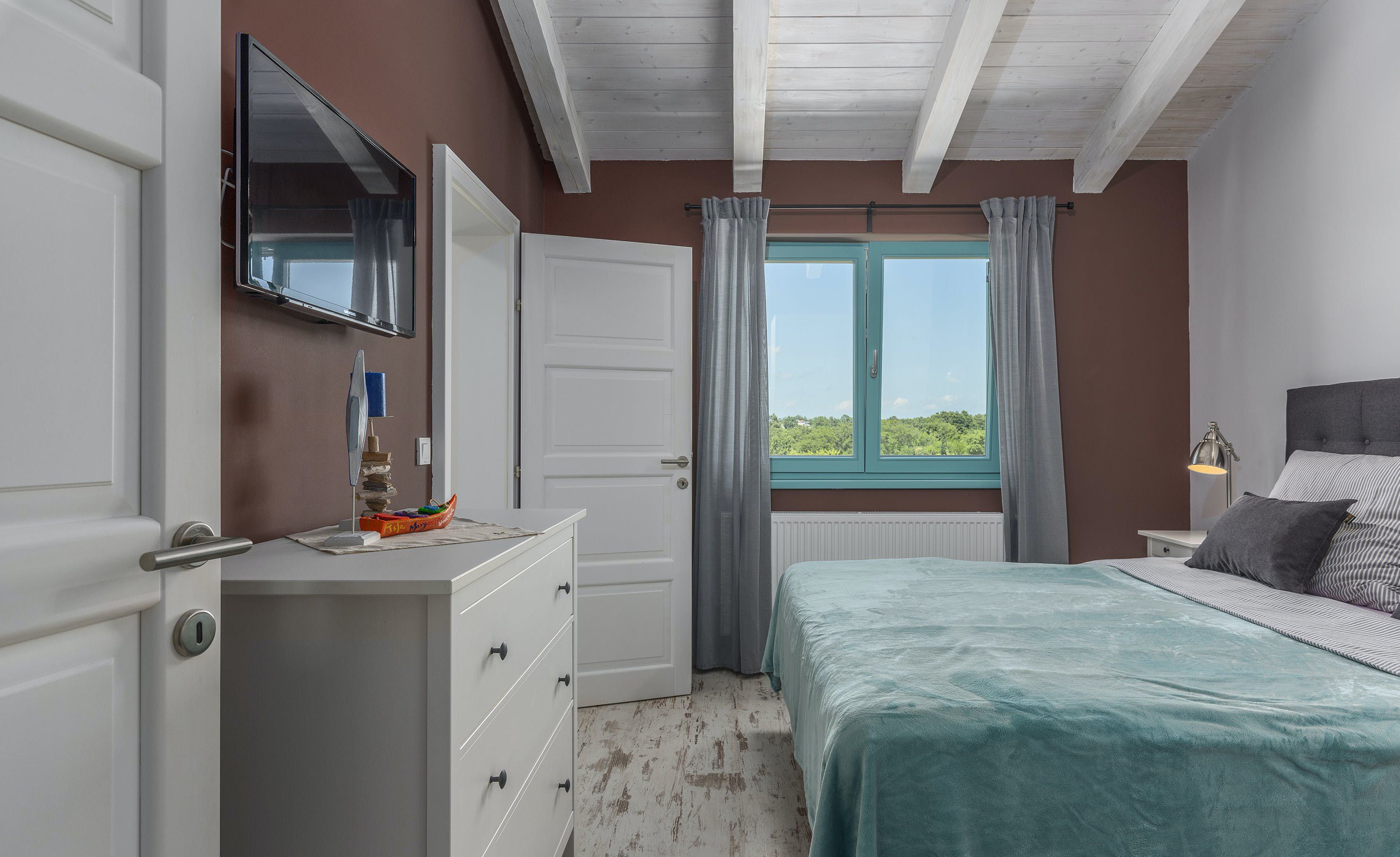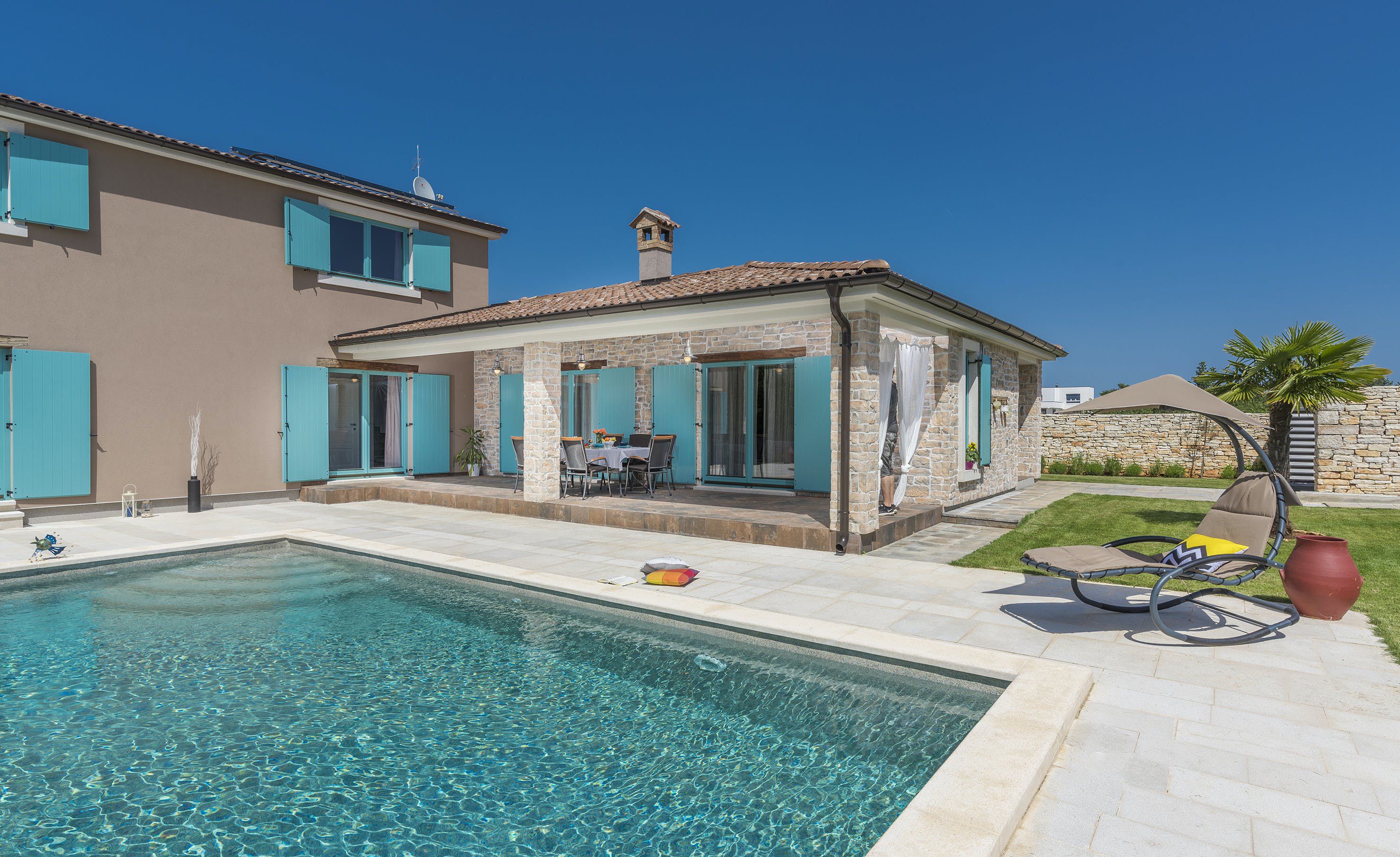 This modern villa near Pula is perfect for two families or a group of friends. The L-shaped house is situated on a large, well-maintained, completely fenced 1,000 sqm area with a pool terrace in front of it. The pool has a comfortable staircase entrance and a hydro massage feature. Besides the pool, guests can enjoy table tennis, small football goals, and table soccer on the premises. The outdoor brick grill provides an opportunity to end the day with a barbecue. Indoors, there is a trendy living room with lots of wood and colorful accents. The living areas flow into each other and are tasteful and consistent in color and style. On the ground floor, there is a super bedroom with direct access to the pool and en suite bathroom as well as a practical guest toilet. Upstairs, there are three bedrooms - two with views of the pool and garden - each with an en suite bathroom. The home provides the best conditions for an unforgettable vacation.