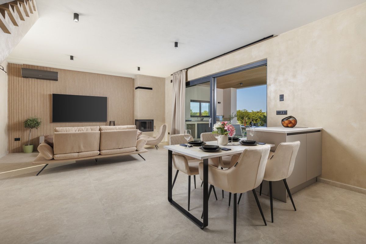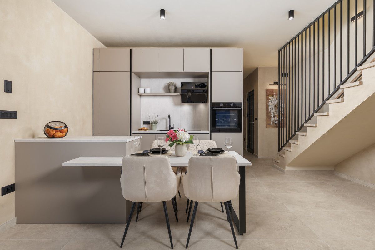 The interior combines modern luxury with the warmth of home – a kitchen for shared meals, a living room for relaxation, and an elegant bedroom inviting restful nights. The outdoor terrace, with seating and dining space, provides the perfect setting for dinners under the stars or quiet moments just for the two of you.