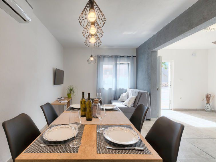 6-room house 150 m2 on 2 levels. Living/dining room with kitchen corner, satellite TV and air conditioning. 1 room with 2 beds (80 cm, length 190 cm). 1 room with 1 french bed (180 cm, length 200 cm), air conditioning. Living/dining room with satellite TV and air conditioning. Open kitchen (oven, dishwasher, 4 ceramic glass hob hotplates, microwave, freezer, electric coffee machine).
