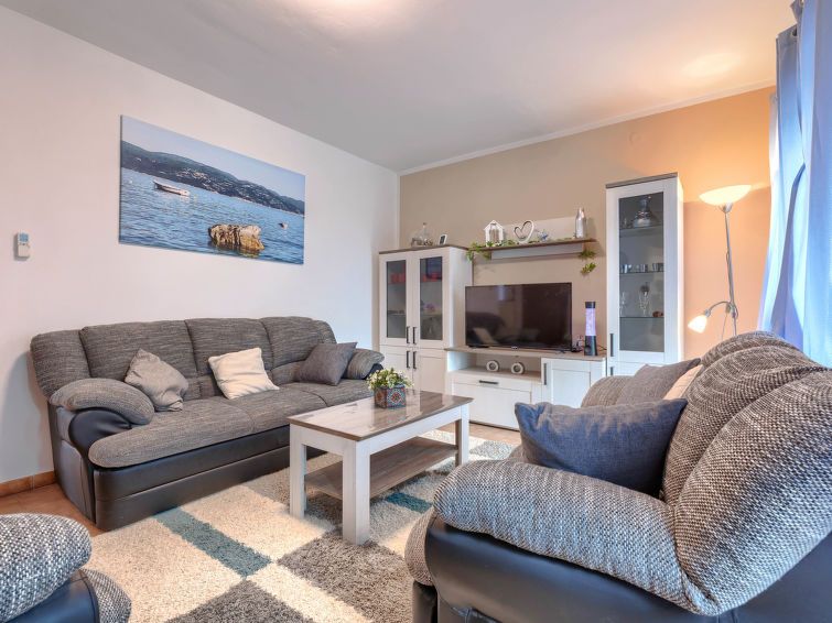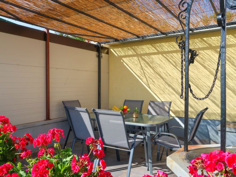 3-room semi-detached house 100 m2 on 2 levels. Living room with satellite TV and air conditioning. Exit to the terrace. Kitchen (1 hot plate, oven, dishwasher, 3 gas rings, toaster, kettle, microwave, freezer, electric coffee machine) with dining table. Shower/WC. Upper floor: 1 room with 1 french bed (200 cm, length 200 cm), satellite TV and air conditioning.