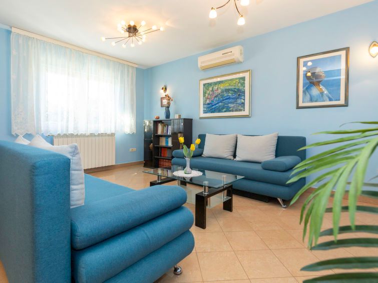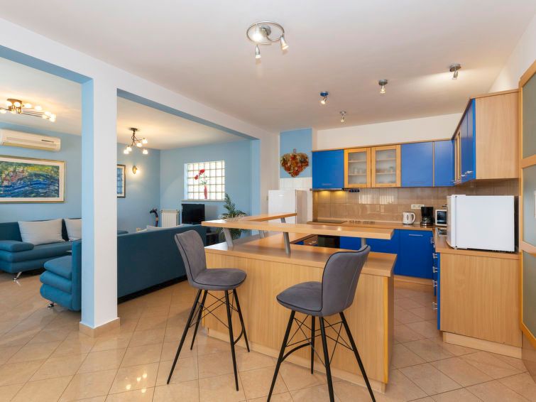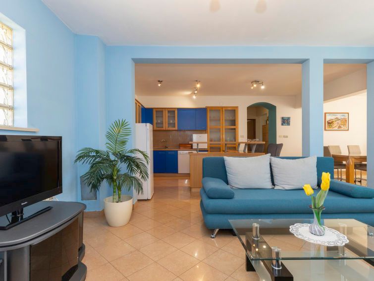 5-room apartment 150 m2 on 1st floor. Living/dining room with satellite TV and air conditioning. 1 room with 1 double bed (2 x 90 cm, length 200 cm), satellite TV and air conditioning. 1 room with 1 french bed (160 cm, length 200 cm), satellite TV and air conditioning. 1 room with 1 french bed (160 cm, length 200 cm), satellite TV and air conditioning.