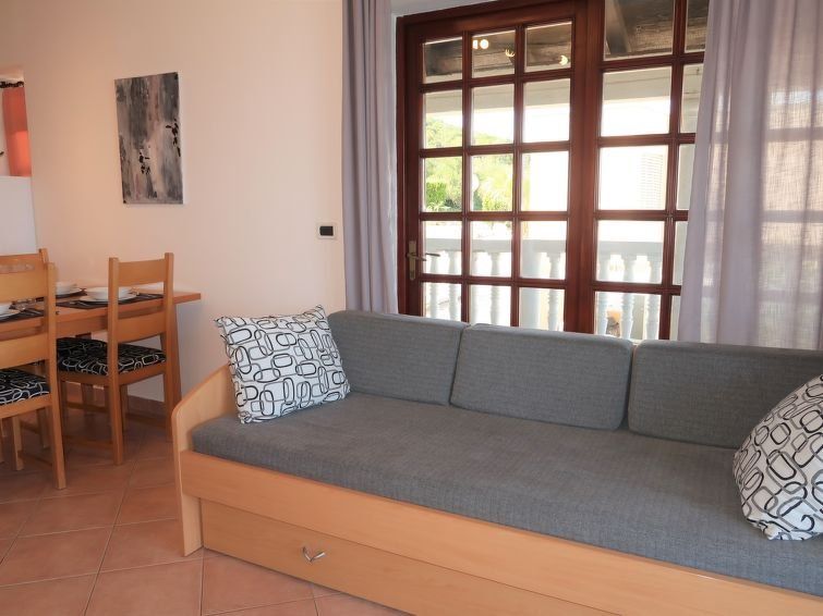 "Ulika", 3-room apartment 60 m2 on 1st floor. Living/sleeping room with 1 bed, 1 pull-out bed and satellite TV. Exit to the balcony. Entrance hall with air conditioning. 1 room with 2 beds. 1 room with 1 french bed (160 cm, length 200 cm). Open kitchen (2 hot plates, dishwasher, 2 gas rings, toaster, kettle, microwave, freezer, electric coffee machine) with dining table.