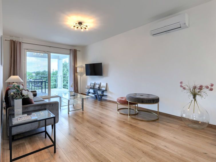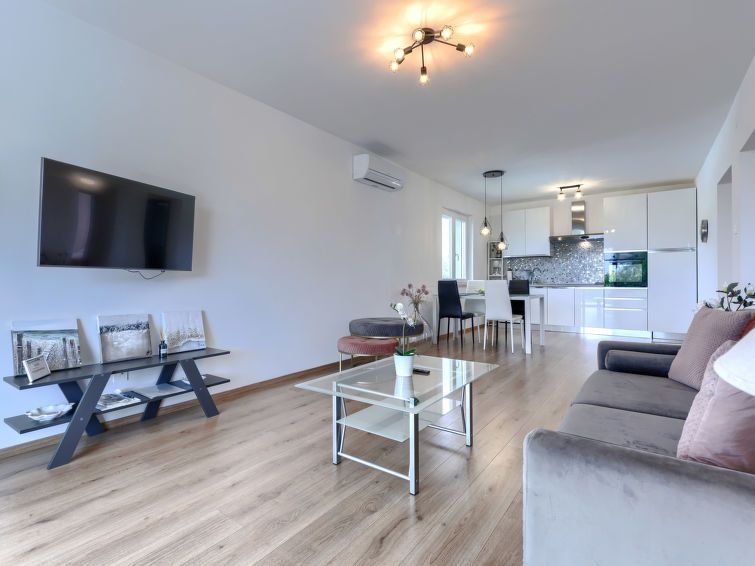 3-room apartment 70 m2 on 1st floor. Beautiful and cosy furnishings: living/dining room with satellite TV and air conditioning. Exit to the terrace. 2 rooms, each room with 1 french bed (160 cm, length 200 cm), air conditioning. Open kitchen (oven, dishwasher, 4 induction hot plates, toaster, kettle, microwave, freezer, electric coffee machine).
