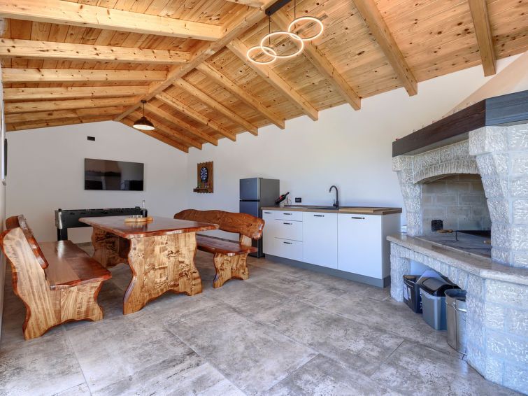 4-room house 120 m2. Living/dining room with 1 sofabed (140 cm, length 200 cm), satellite TV and air conditioning. Exit to the terrace, to the swimming pool. 3 rooms, each room with 1 french bed (160 cm, length 200 cm), satellite TV. Open kitchen (oven, dishwasher, 4 gas rings, toaster, kettle, microwave, freezer, electric coffee machine).