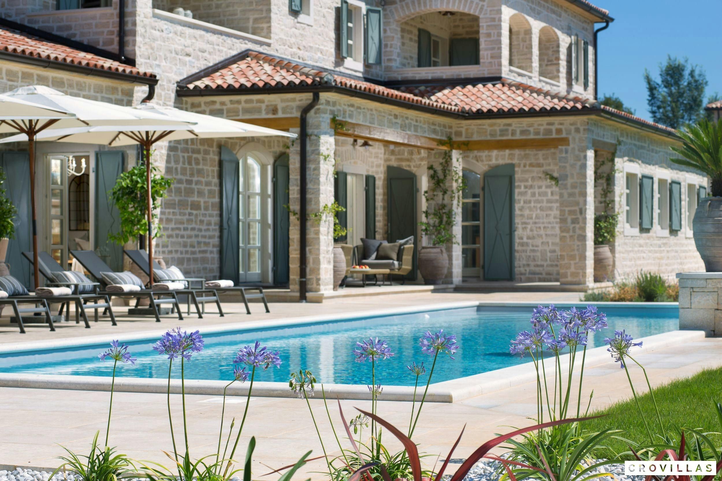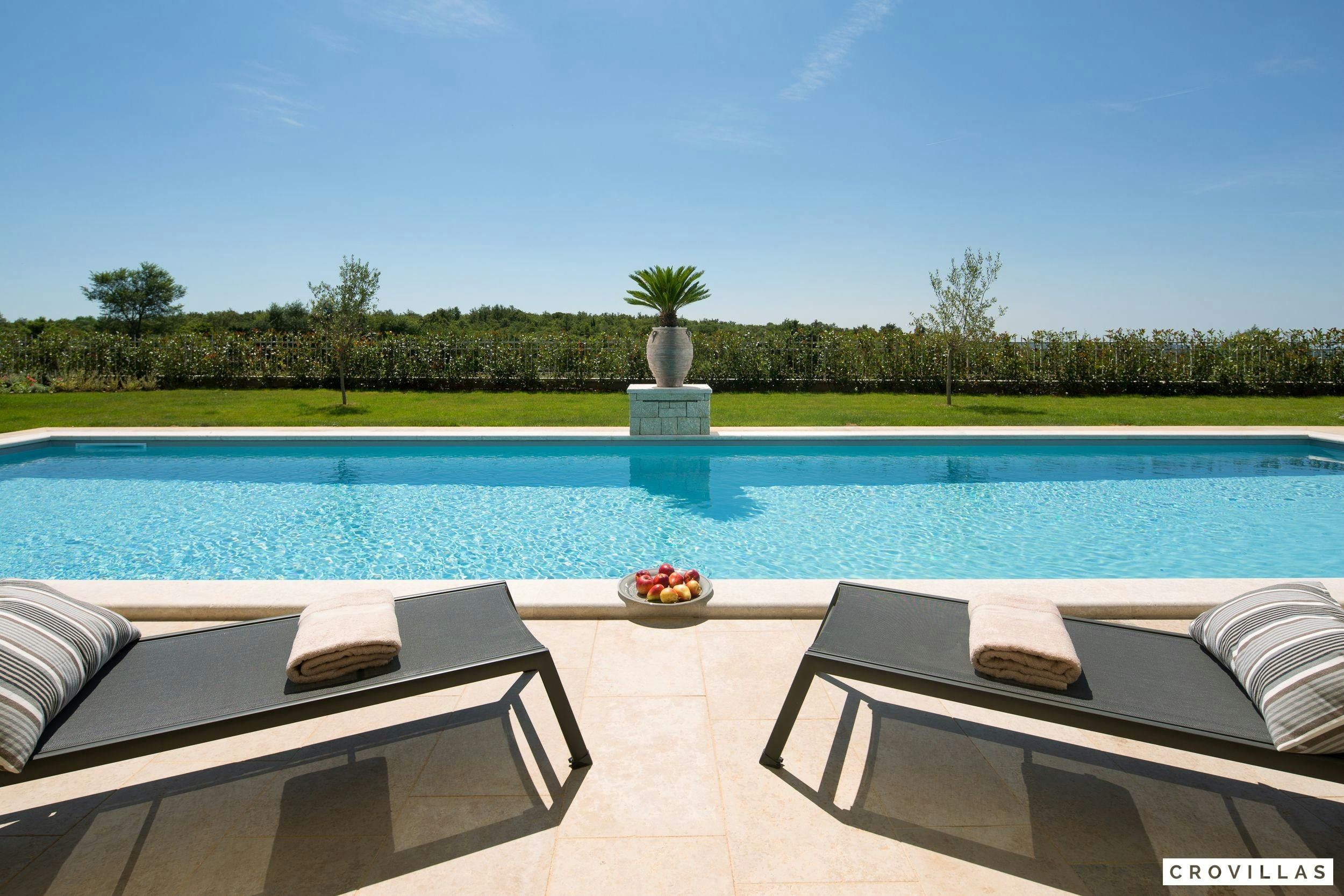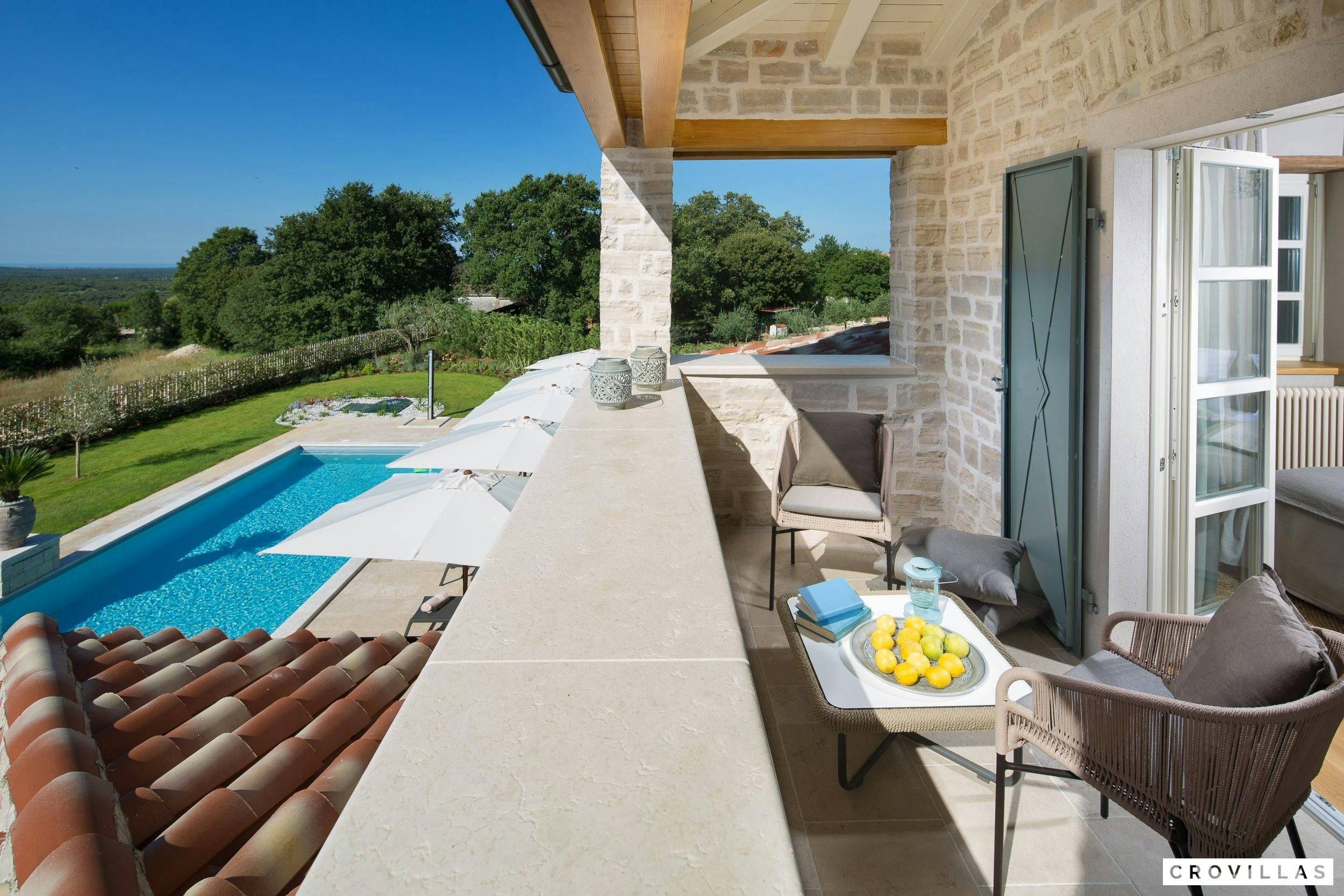 This home is an elegant and stylish villa located in Croatia. Only 15 km from the sea, guests can enjoy the outdoor area with various possibilities to spend quality time under the open sky. The pool is available for sporty laps and fun splashing around, while comfortable loungers and a beautifully landscaped garden surround the exterior. The villa also features a brick barbecue, two balconies with a distant sea view, and a multifunctional sports court shared with three neighbouring villas. Indoors, guests can relax in the spacious living room by the fireplace or at the long table in the dining room. The open-plan kitchen offers high-tech comfort for joint cooking sessions. Plenty of en-suite bedrooms round out the living space. The home is perfect for active vacationers who demand versatility and luxury in their holiday rental experience.