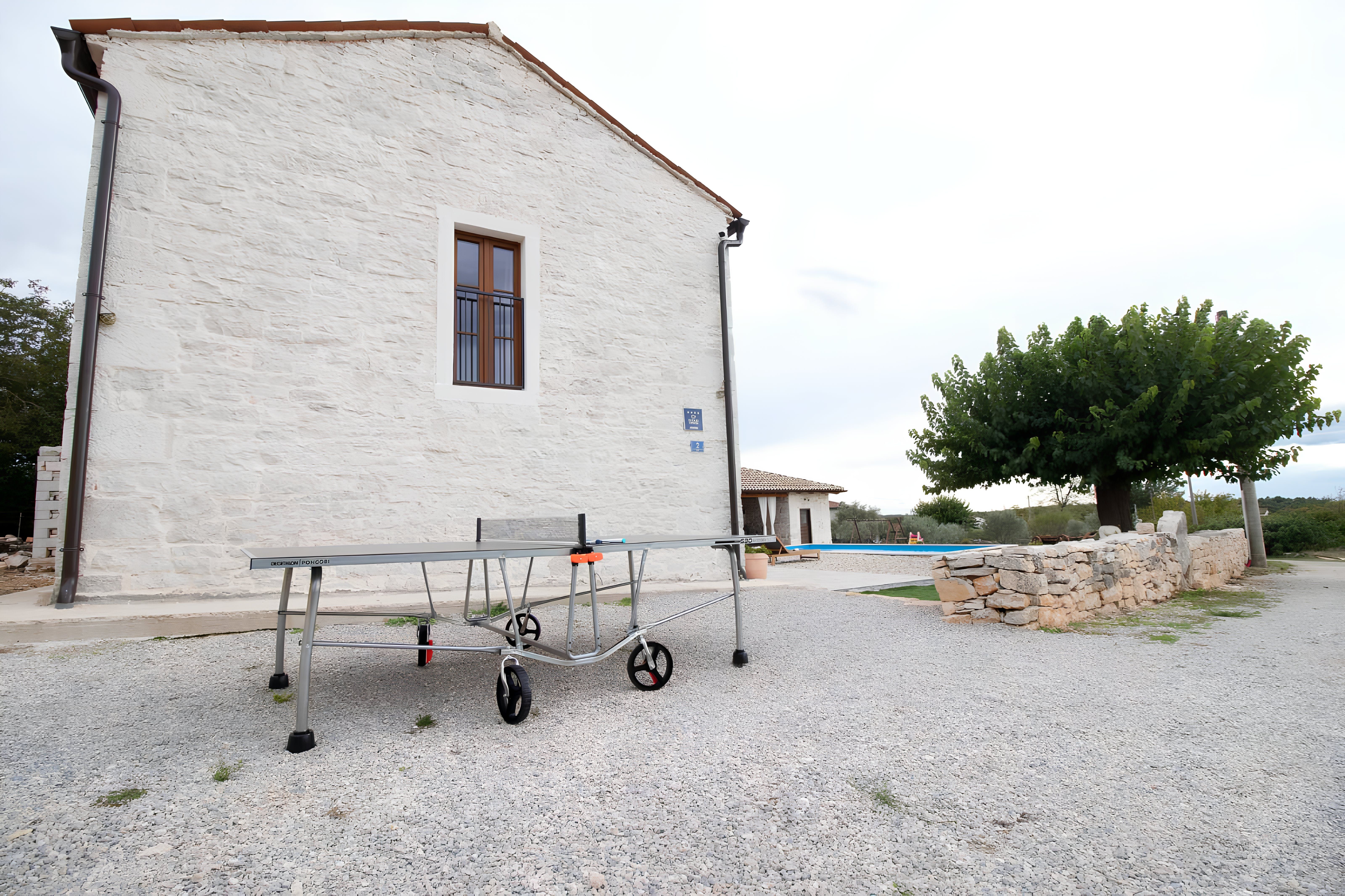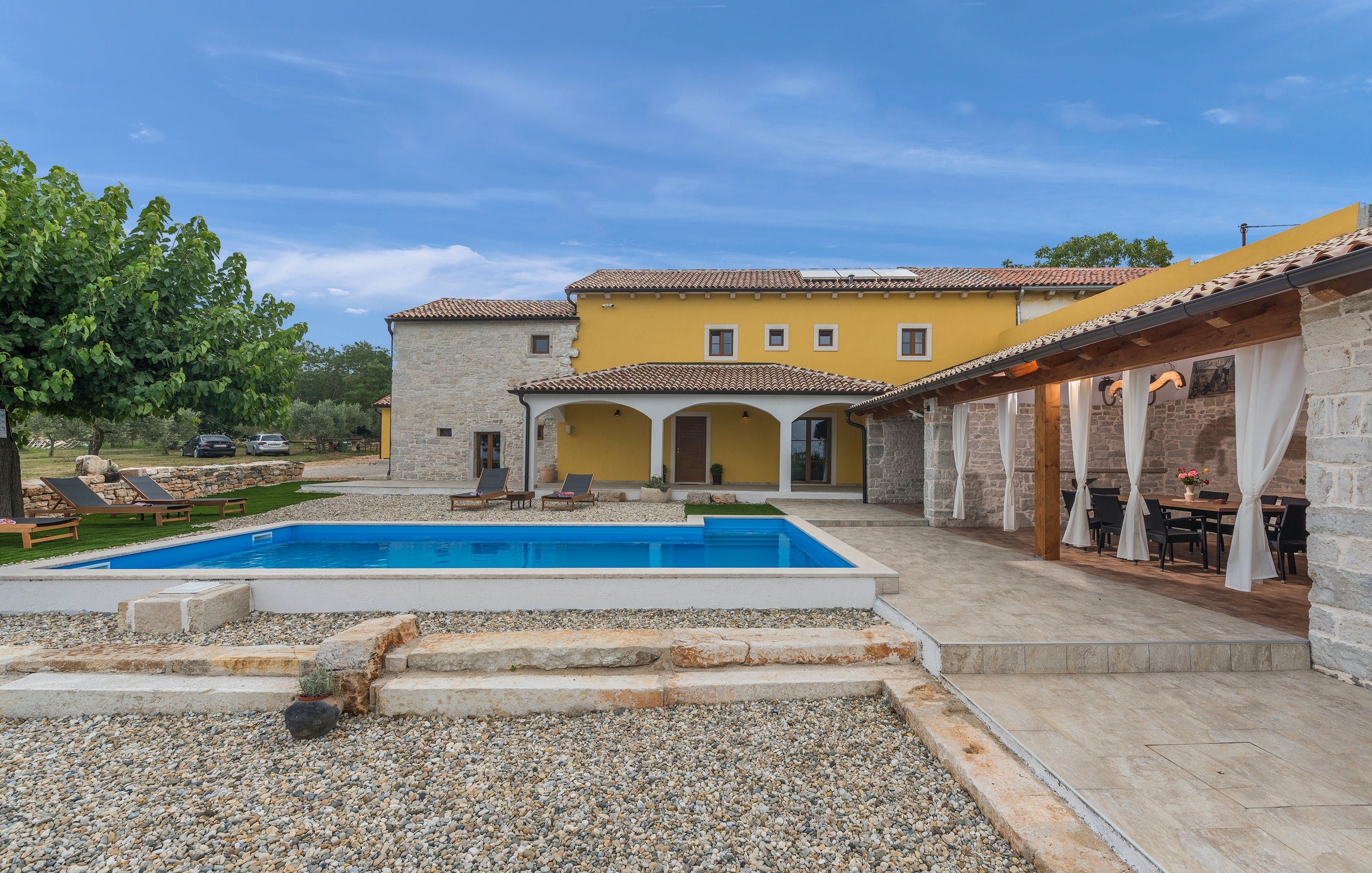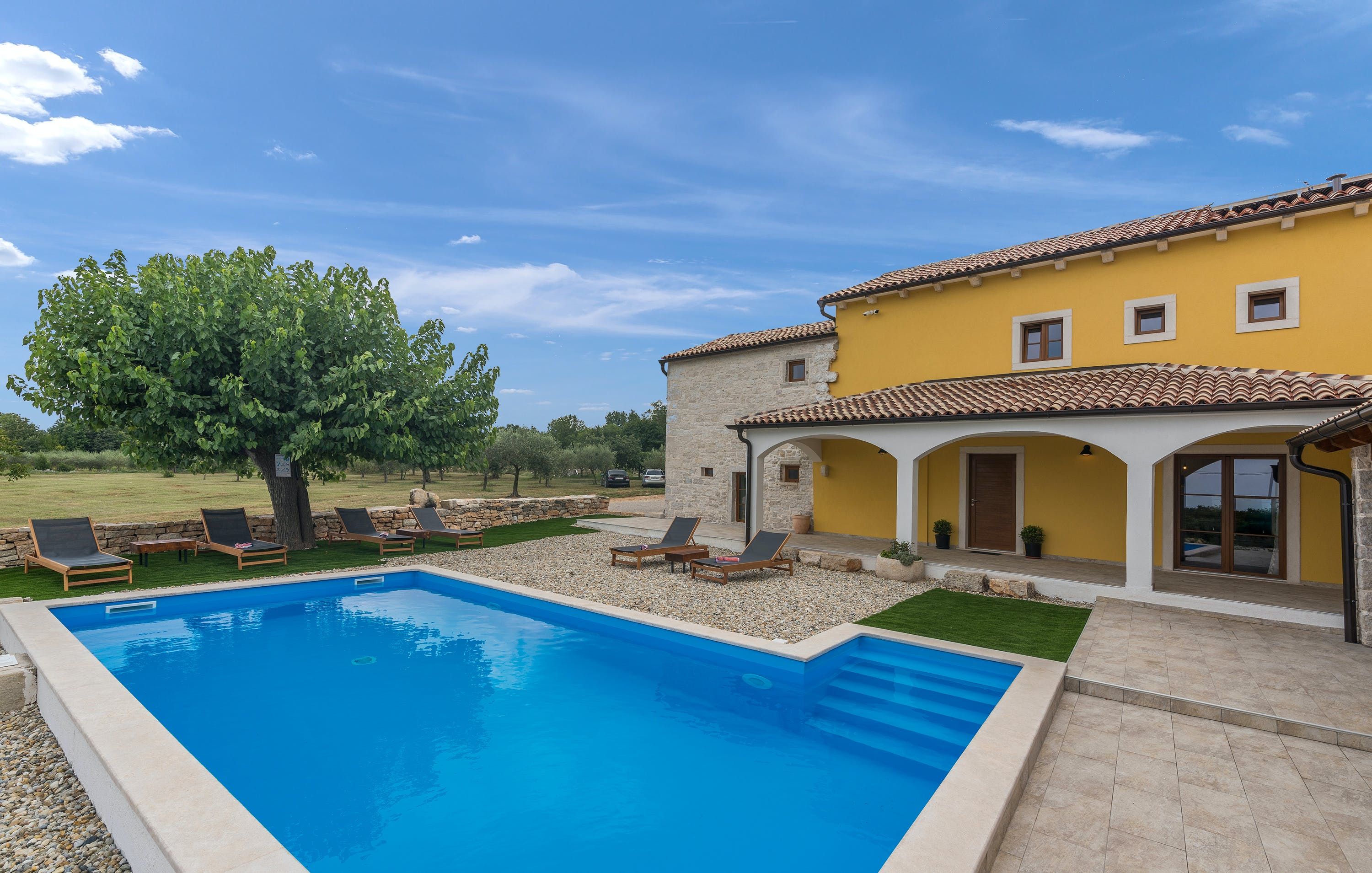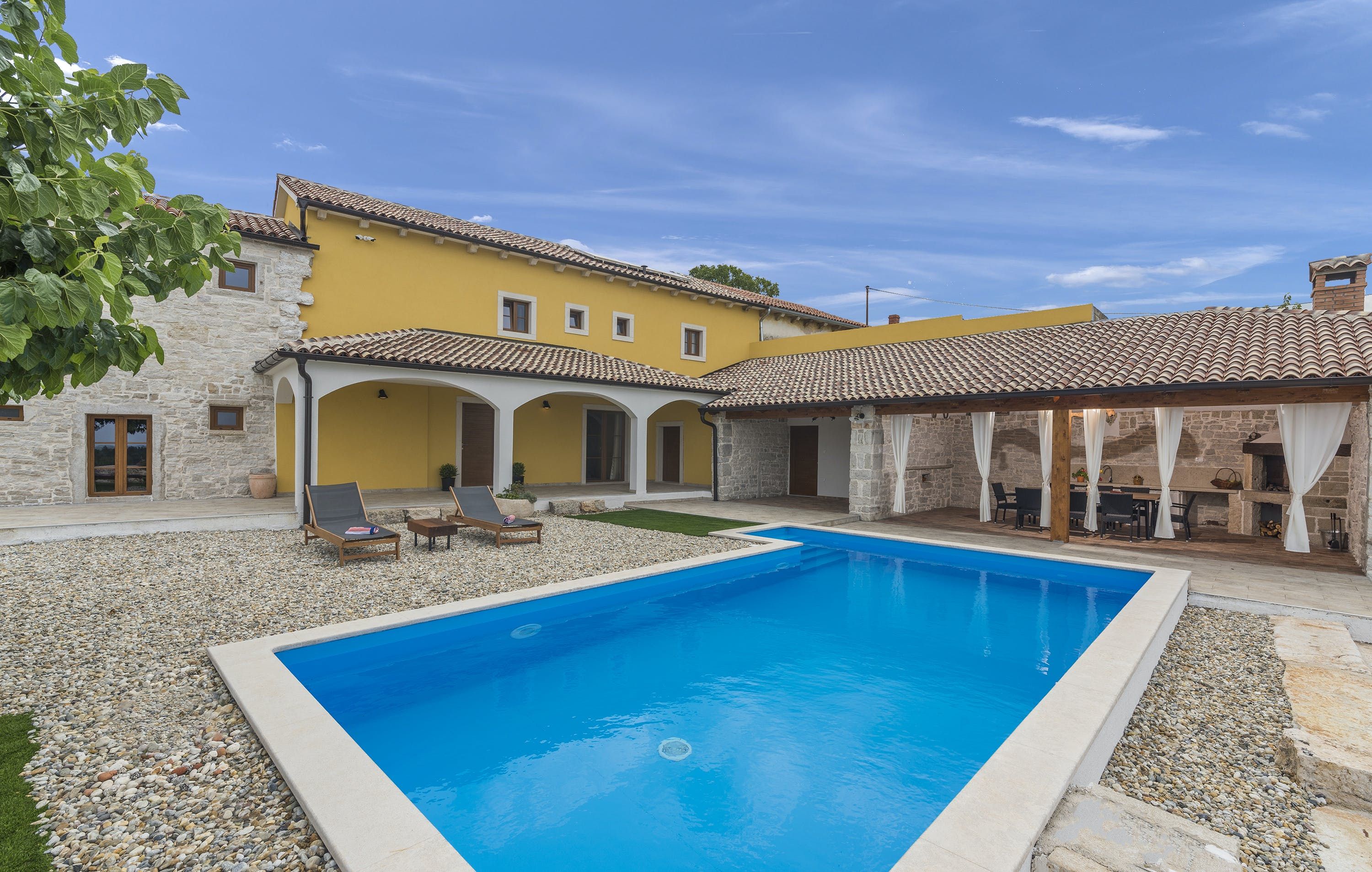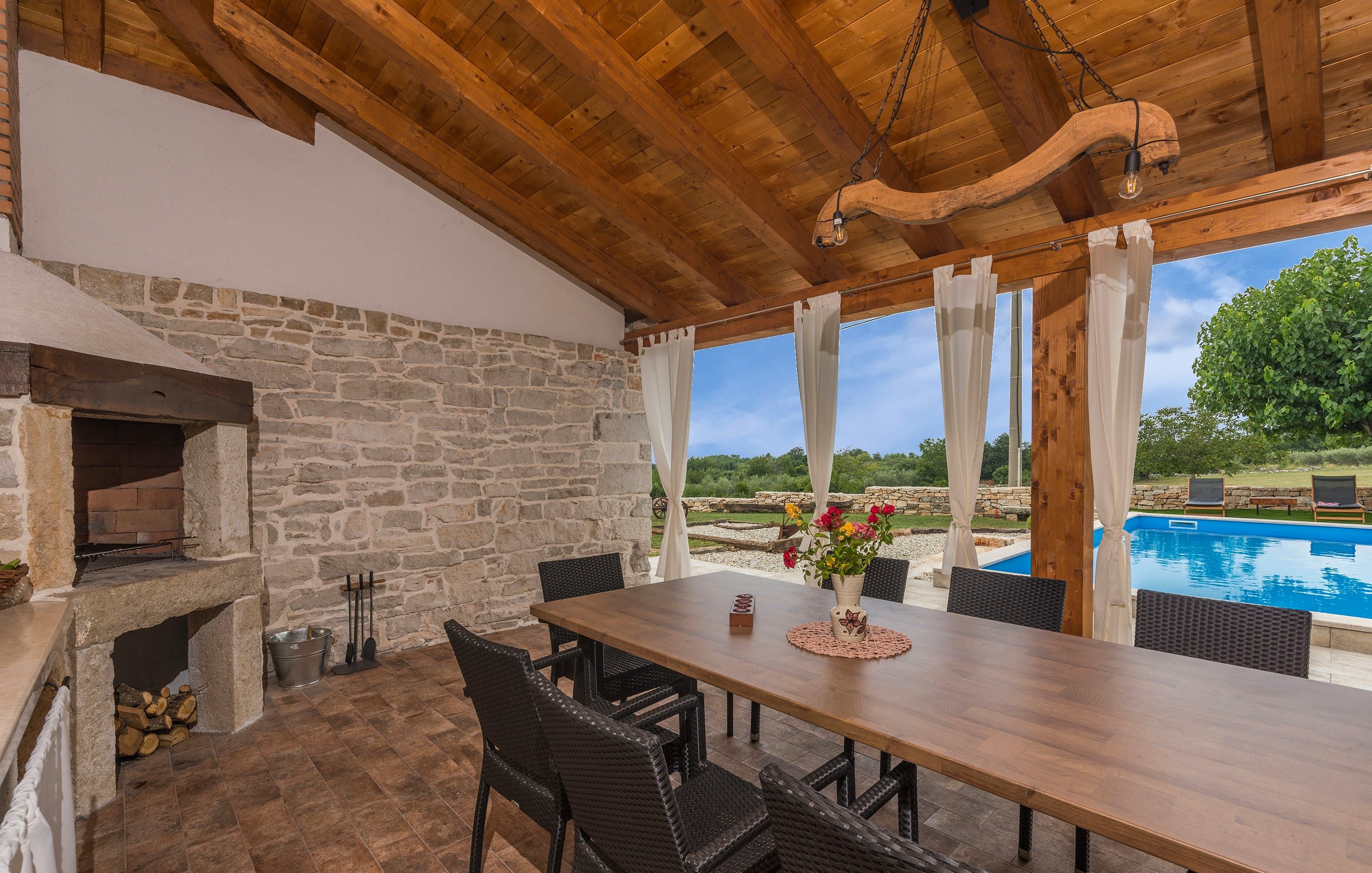 This Istrian villa is a spacious vacation home that boasts 4,282 m² of space for guests to enjoy. The villa offers a saltwater pool with modern loungers, a playground for children, and bicycles for exploring the area. Guests can also enjoy the sheltered outdoor dining area with a large table and summer kitchen including a brick charcoal grill. Inside, the open living and dining room with an integrated kitchen provides plenty of space for relaxation and entertainment. The cosy furnishings and natural stone elements add charm to the decor. The villa has four air-conditioned bedrooms with en suite shower rooms, providing perfect temperatures for sleeping even in high summer. An extra bed is available upon request. This Istrian villa is perfect for those looking for a generously sized vacation home in Croatia that offers both indoor and outdoor comfort.