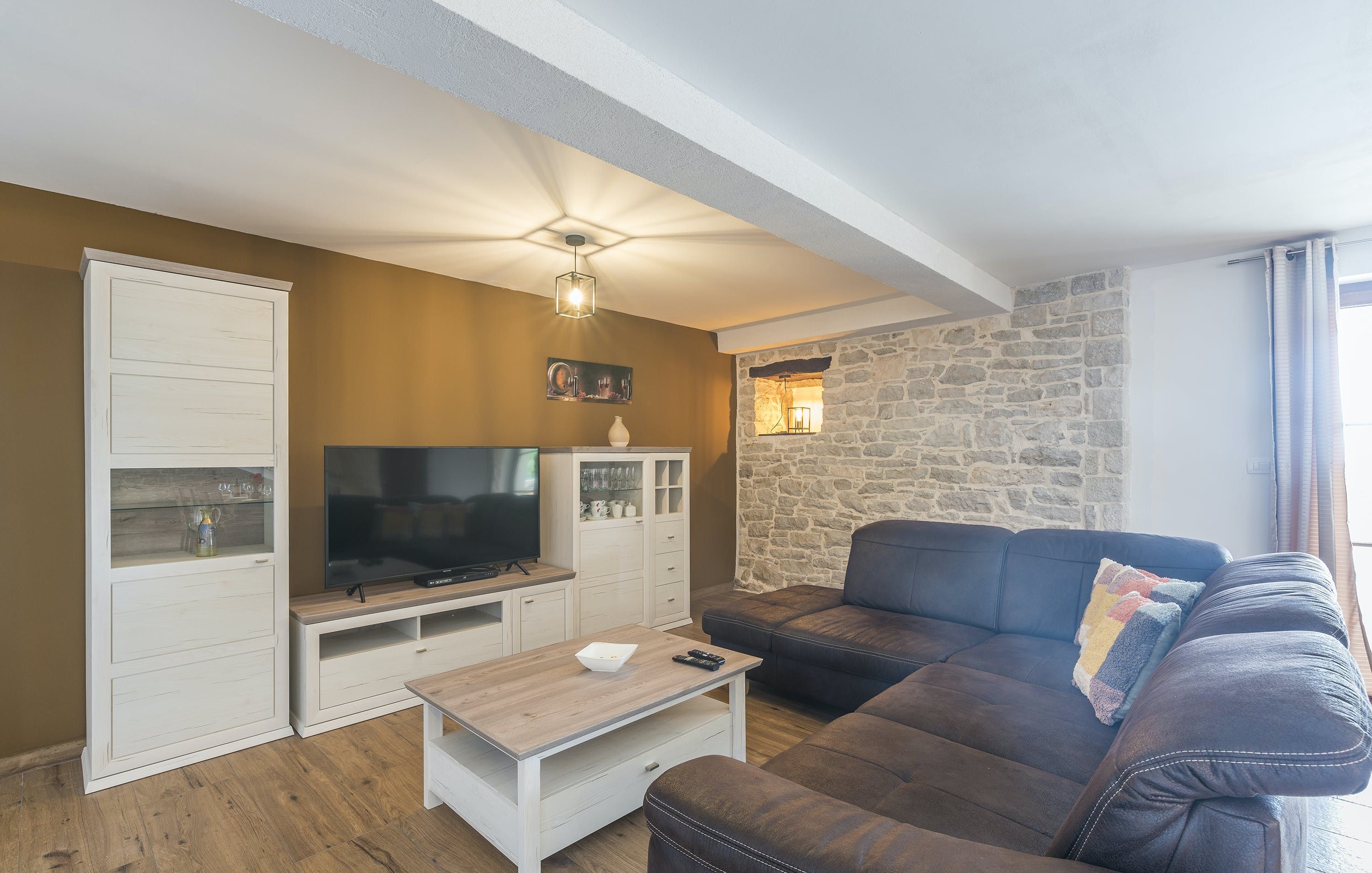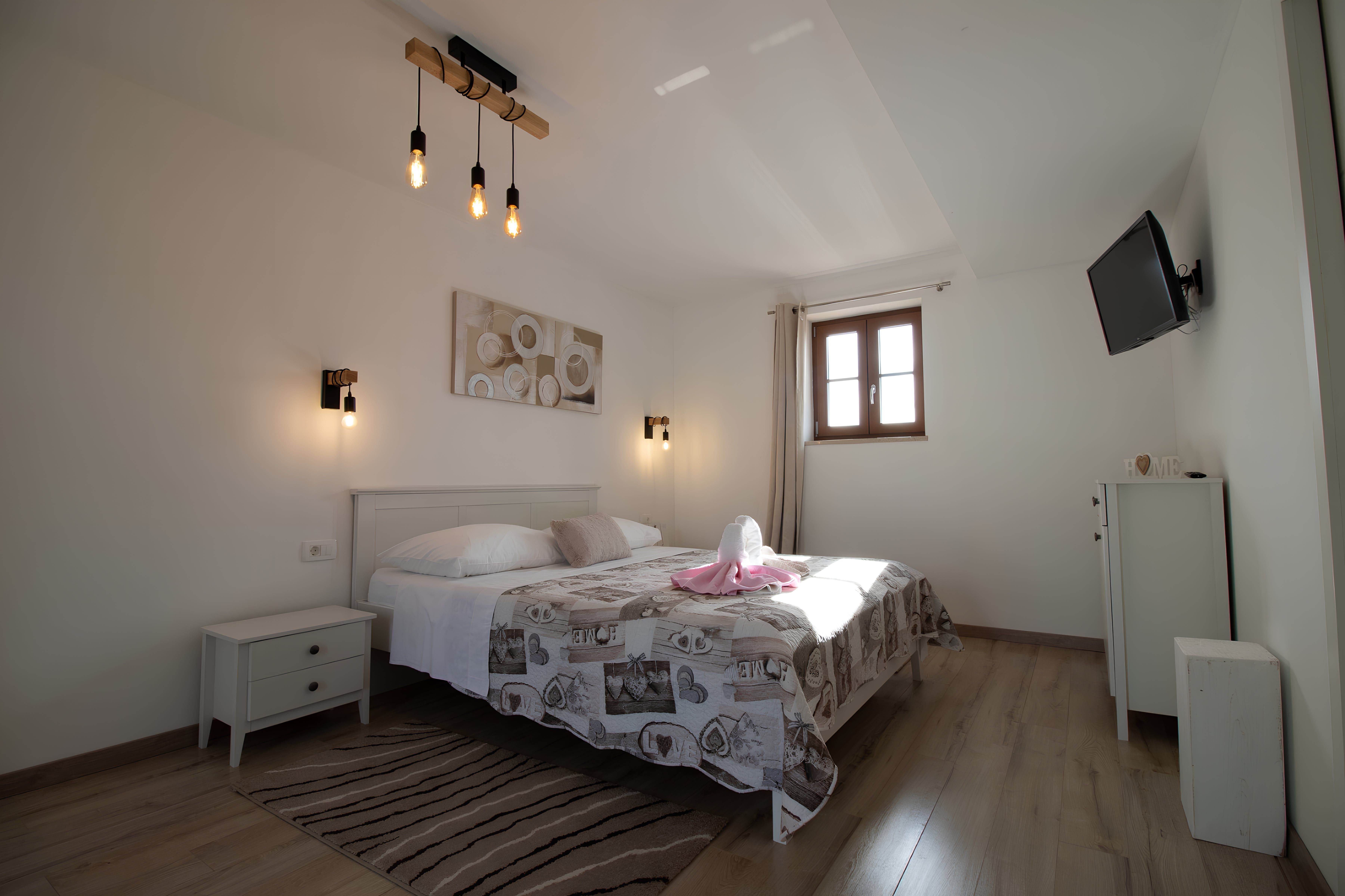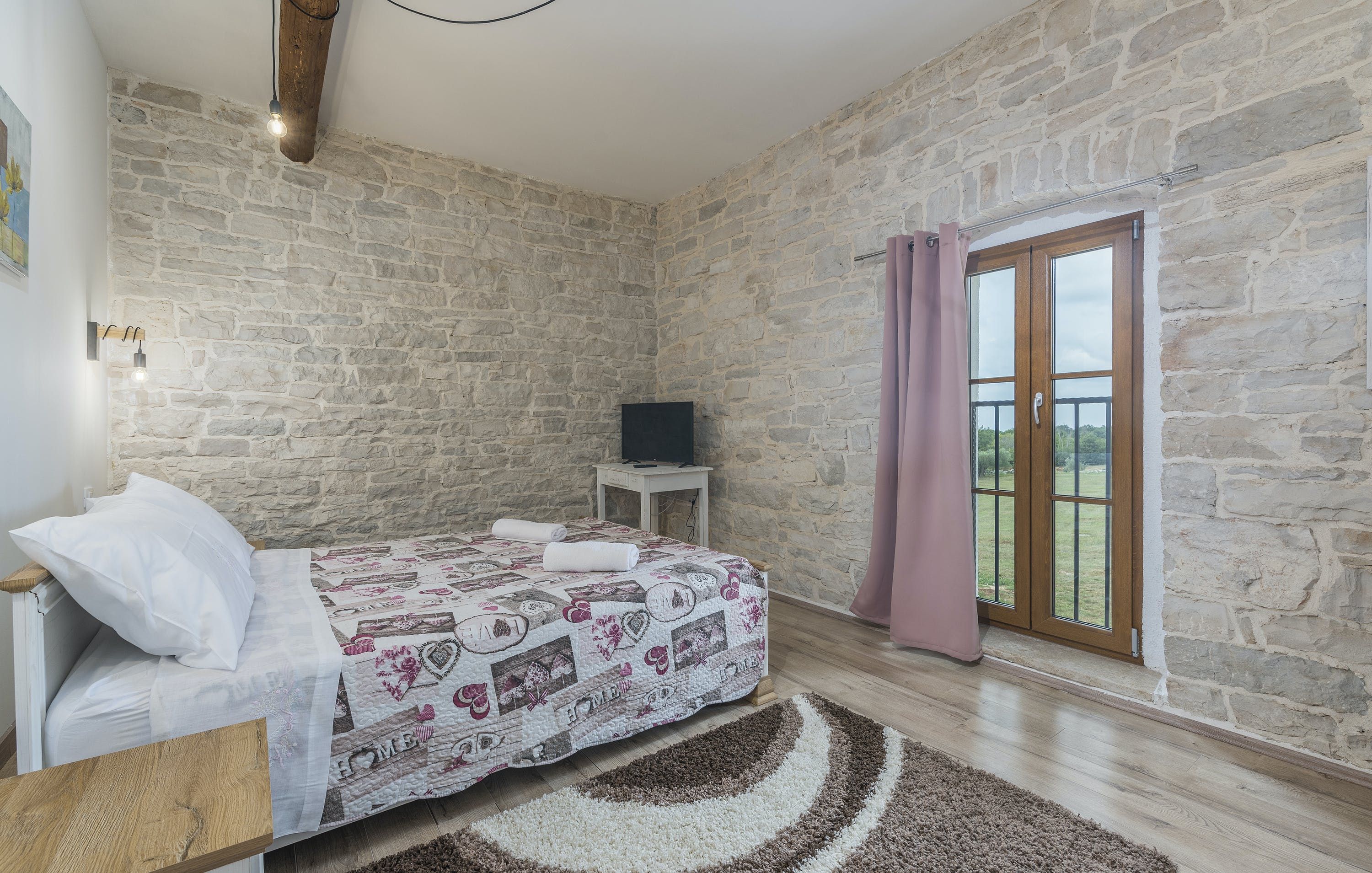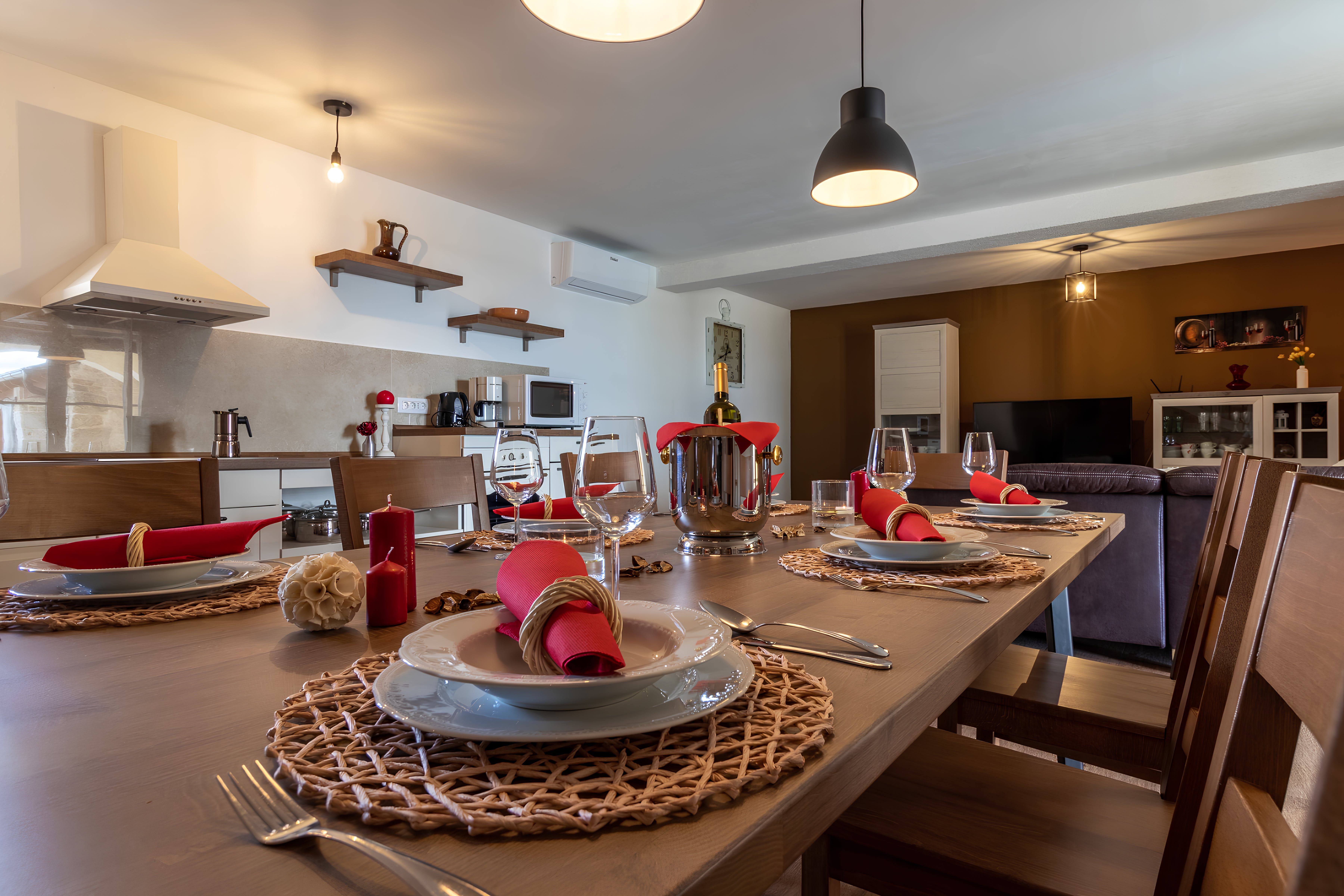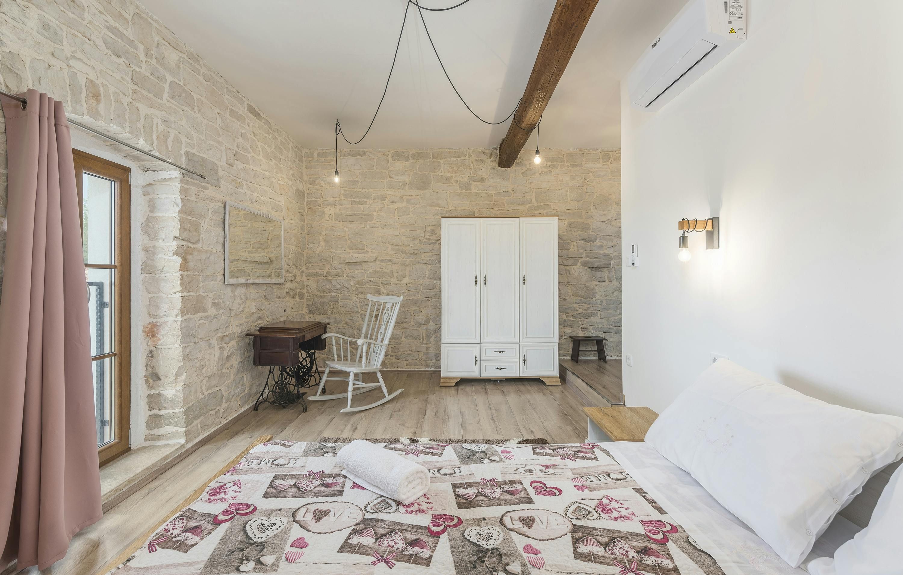 This Istrian villa is a spacious vacation home that boasts 4,282 m² of space for guests to enjoy. The villa offers a saltwater pool with modern loungers, a playground for children, and bicycles for exploring the area. Guests can also enjoy the sheltered outdoor dining area with a large table and summer kitchen including a brick charcoal grill. Inside, the open living and dining room with an integrated kitchen provides plenty of space for relaxation and entertainment. The cosy furnishings and natural stone elements add charm to the decor. The villa has four air-conditioned bedrooms with en suite shower rooms, providing perfect temperatures for sleeping even in high summer. An extra bed is available upon request. This Istrian villa is perfect for those looking for a generously sized vacation home in Croatia that offers both indoor and outdoor comfort.