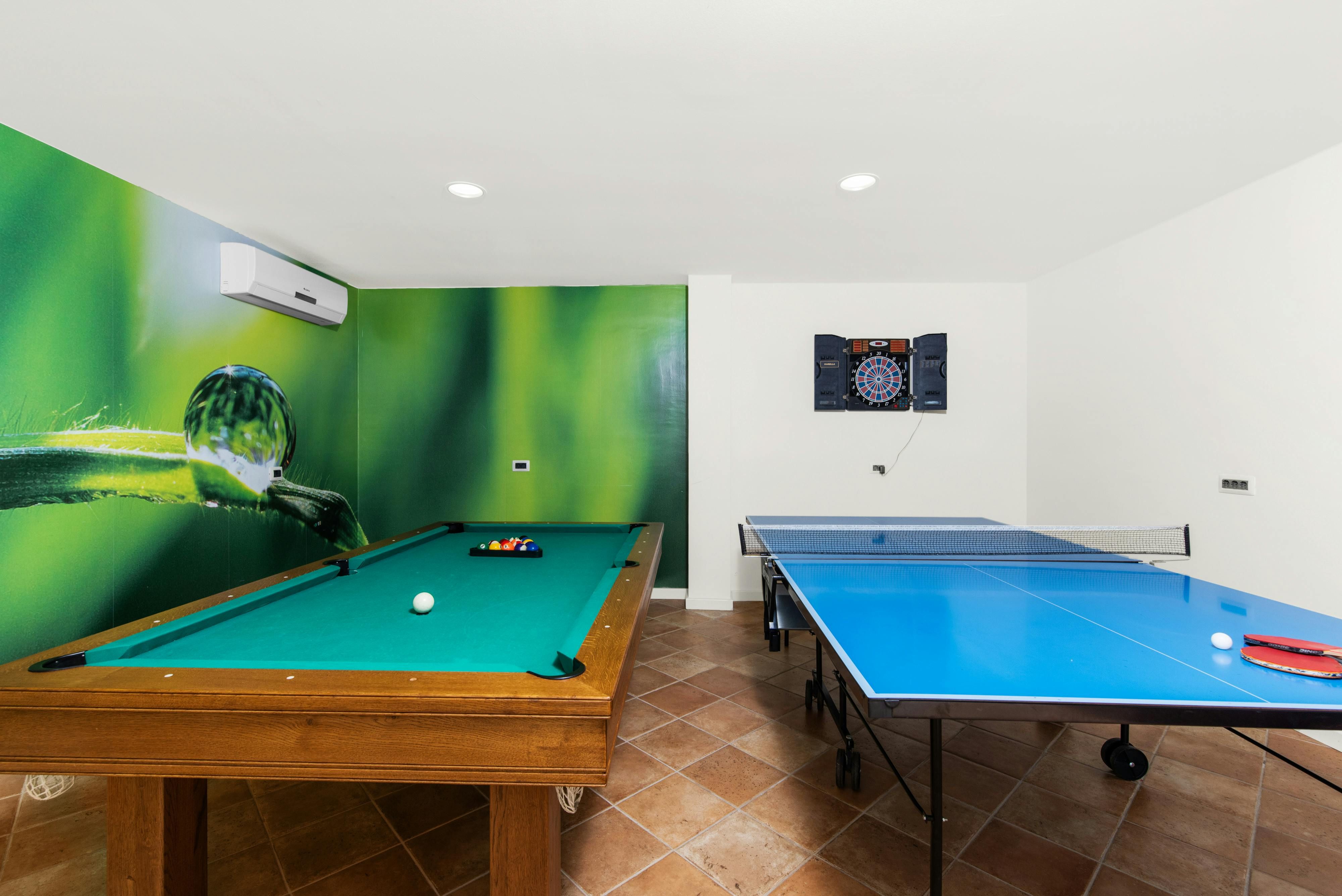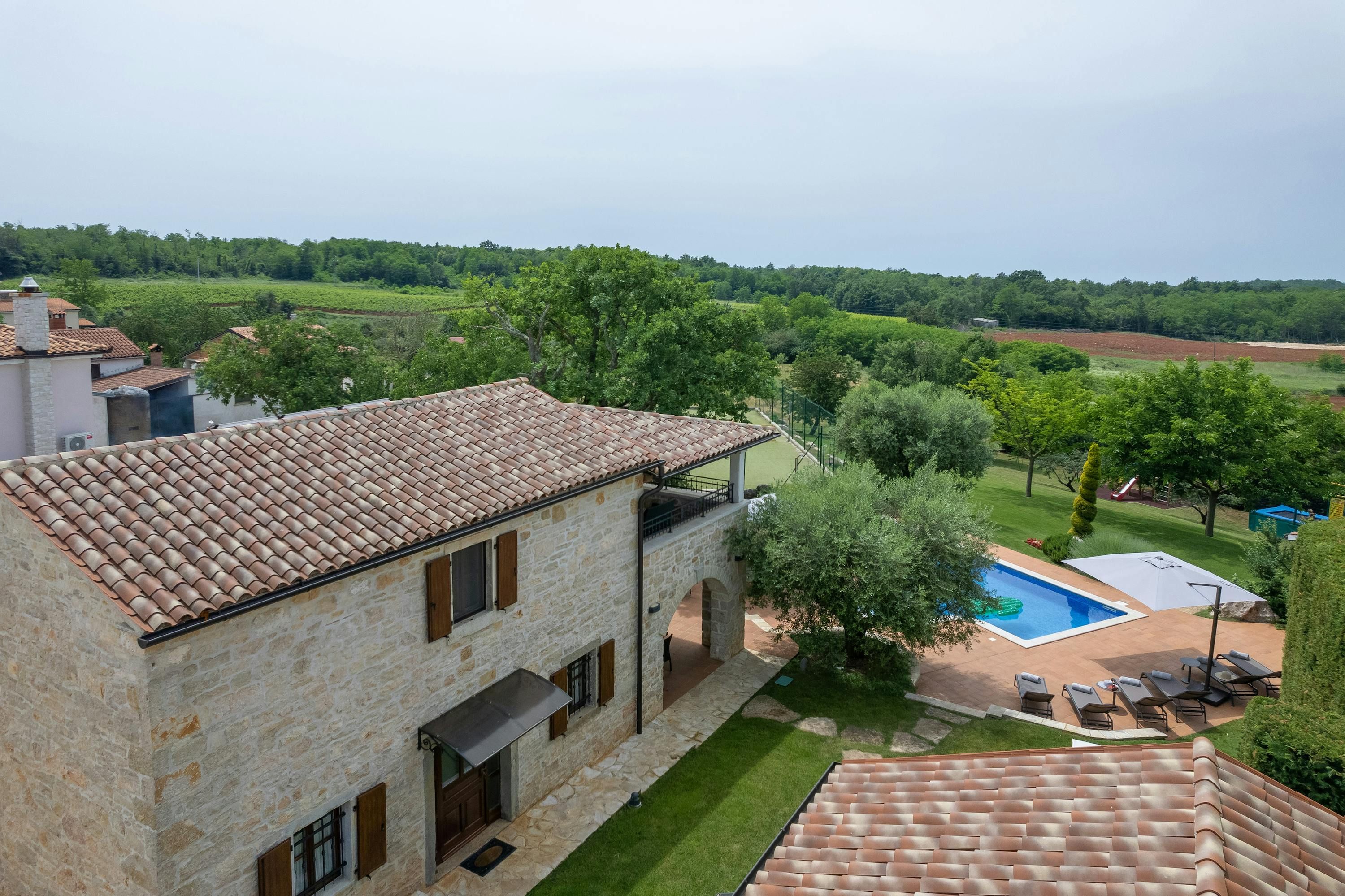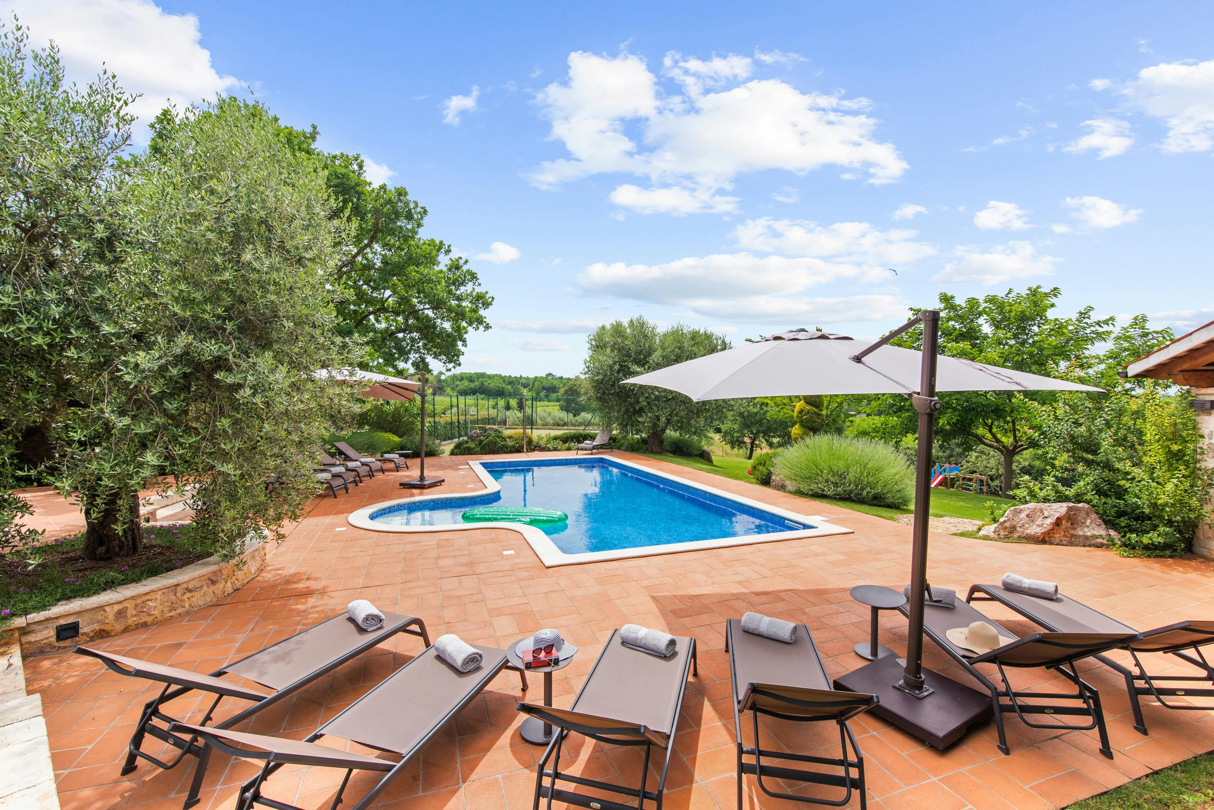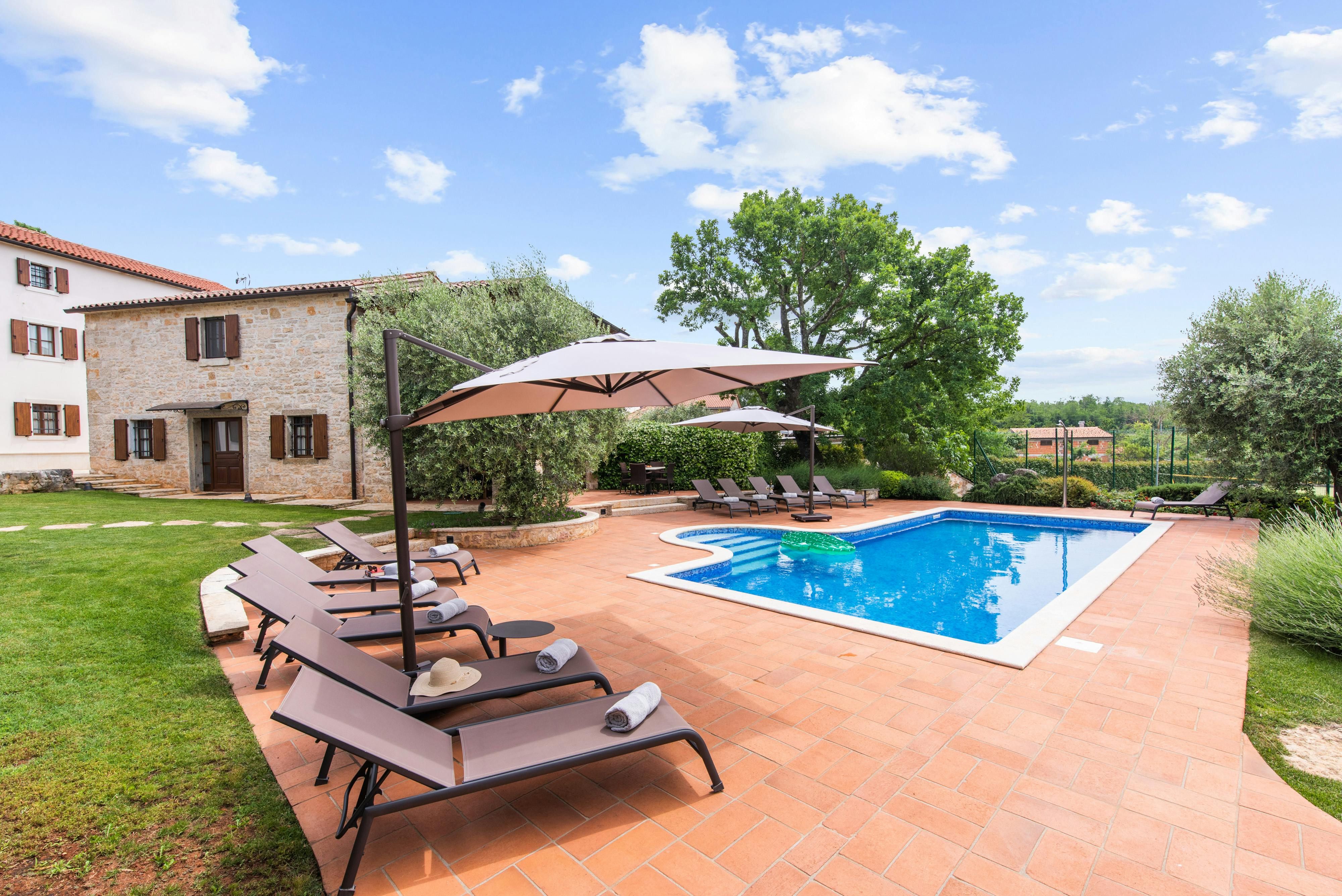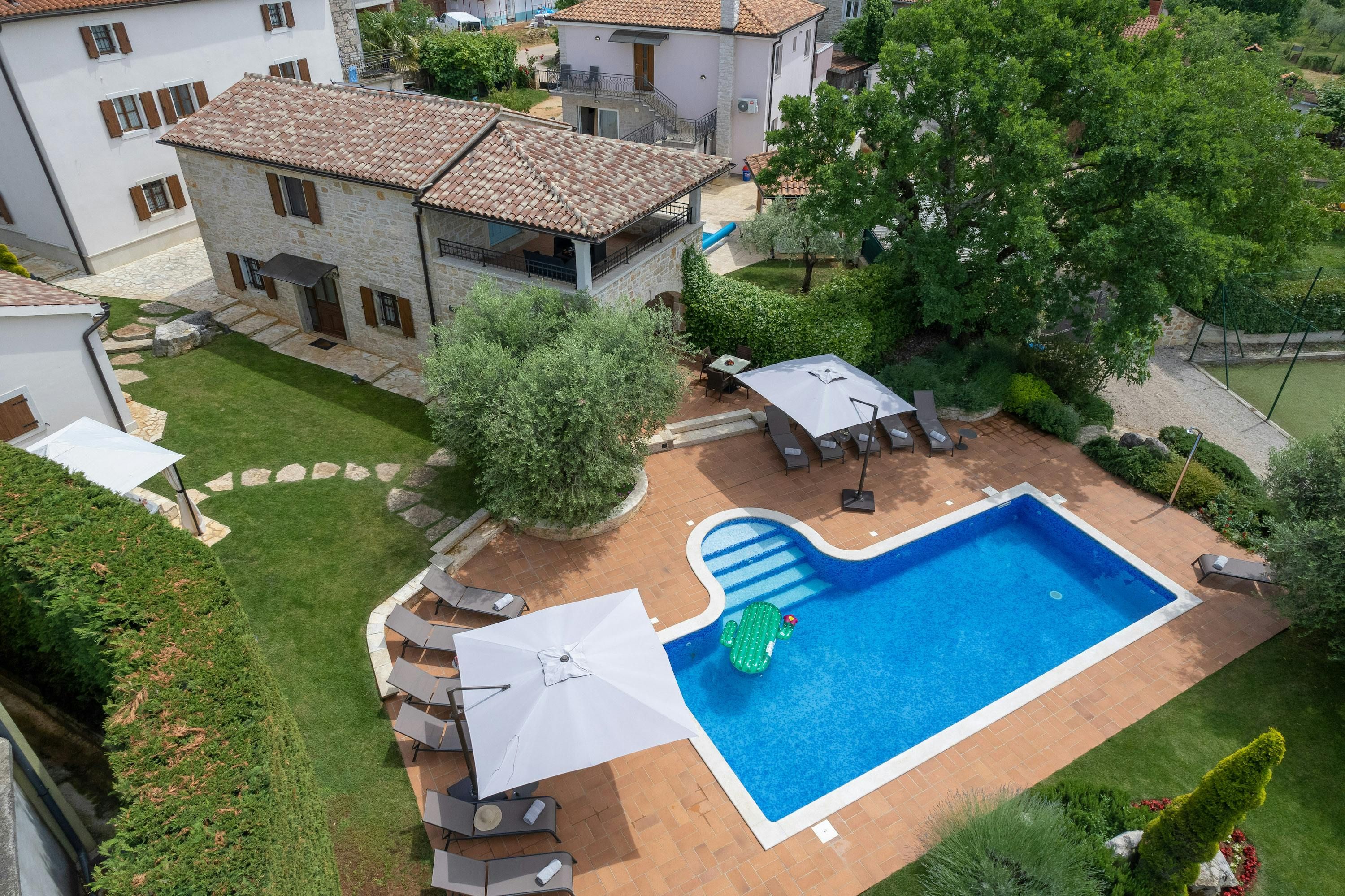 This luxurious villa, surrounded by a fenced plot of 800 m², offers maximum privacy with its two residential buildings and an indoor area of 300 m². The park-like outdoor area boasts a large pool, jacuzzi, tennis court, children's playground, trampoline, and brick charcoal grill. The cosy country house ambience features air-conditioned rooms with wood, natural stone elements, and color accents. The main house is spread over three floors and includes a spacious living/dining room with fireplace, SAT-TV, fully equipped kitchen, four double bedrooms each with an en suite bathroom, and a guest toilet. The smaller stone house near the pool has a small kitchen, dining area, living area, one bedroom with an en suite bathroom upstairs and access to a covered balcony. A game room with ping pong table, darts and a pool table completes the equipment of the villa. This property comfortably accommodates up to 14 people.