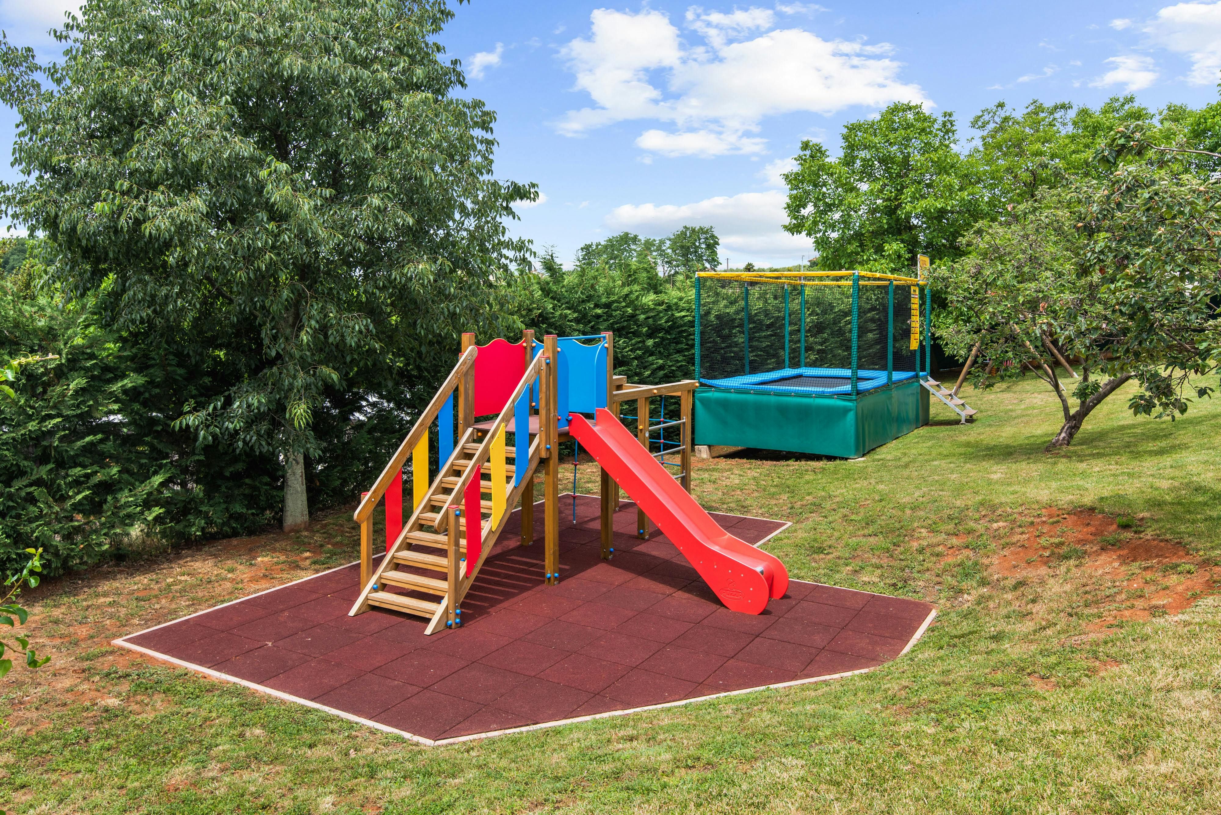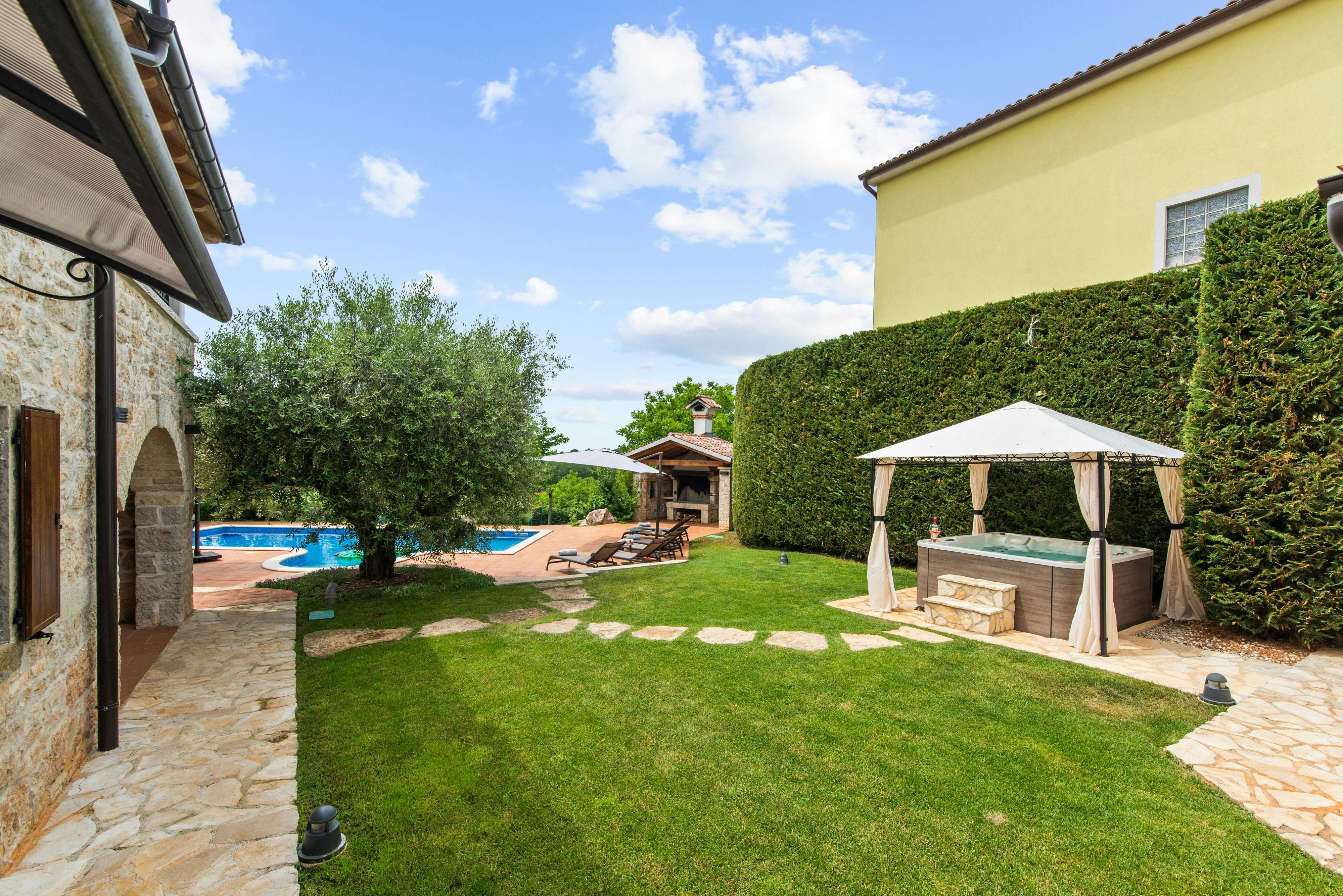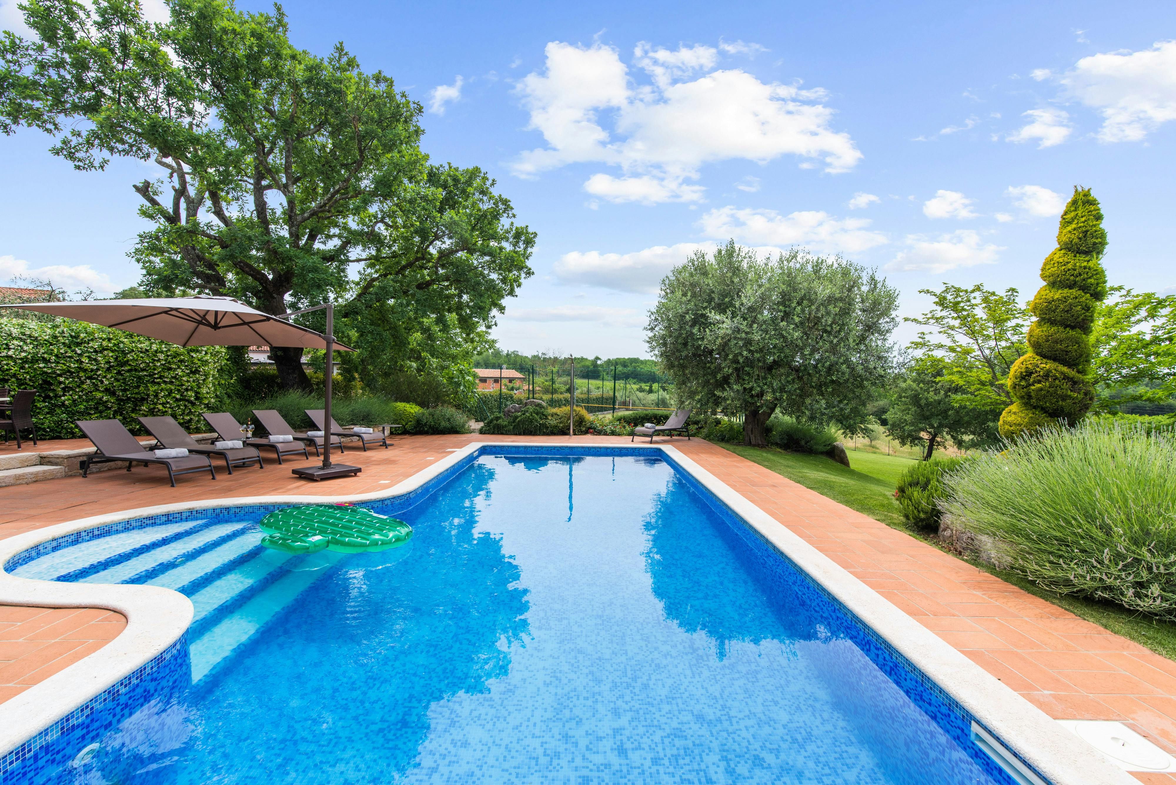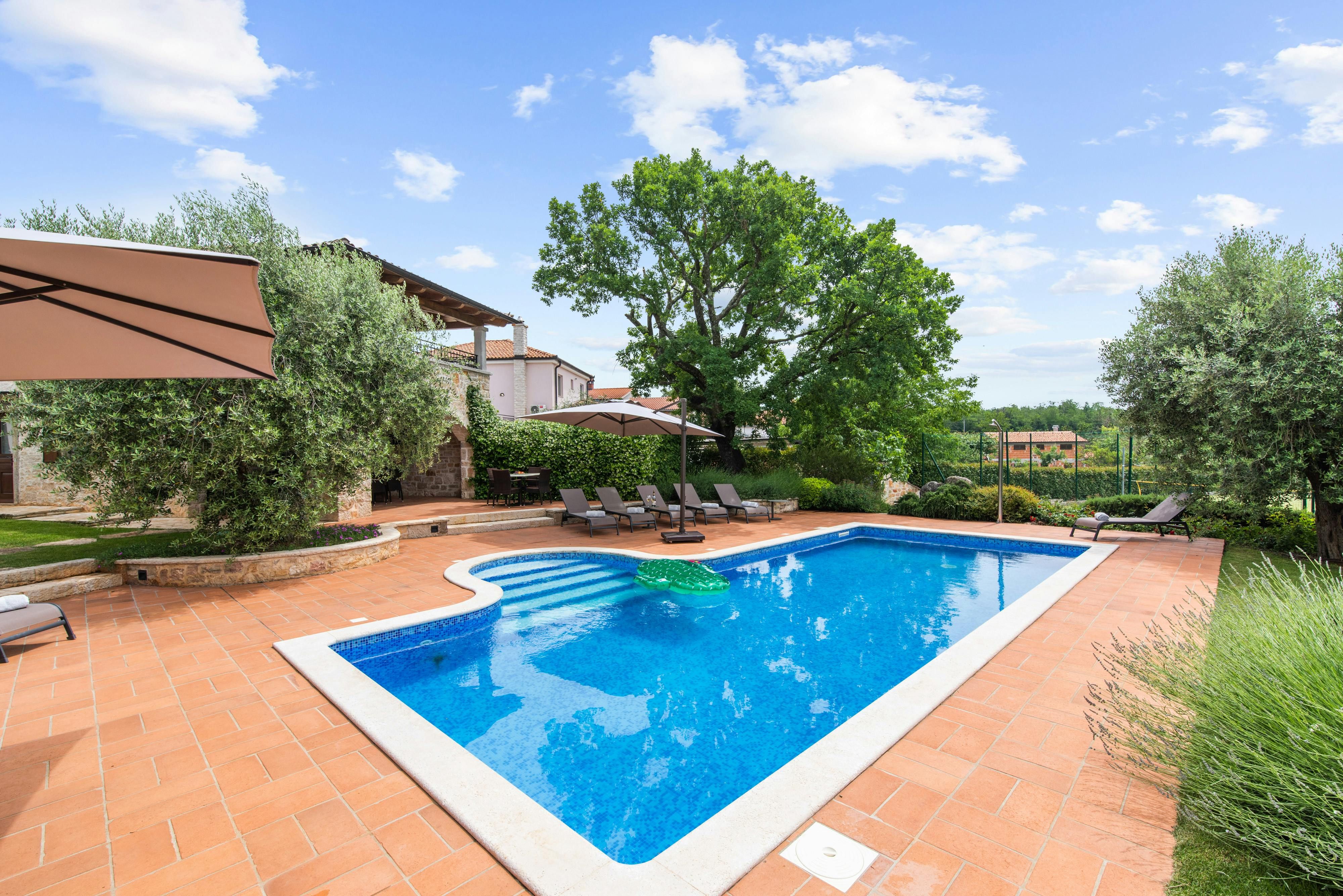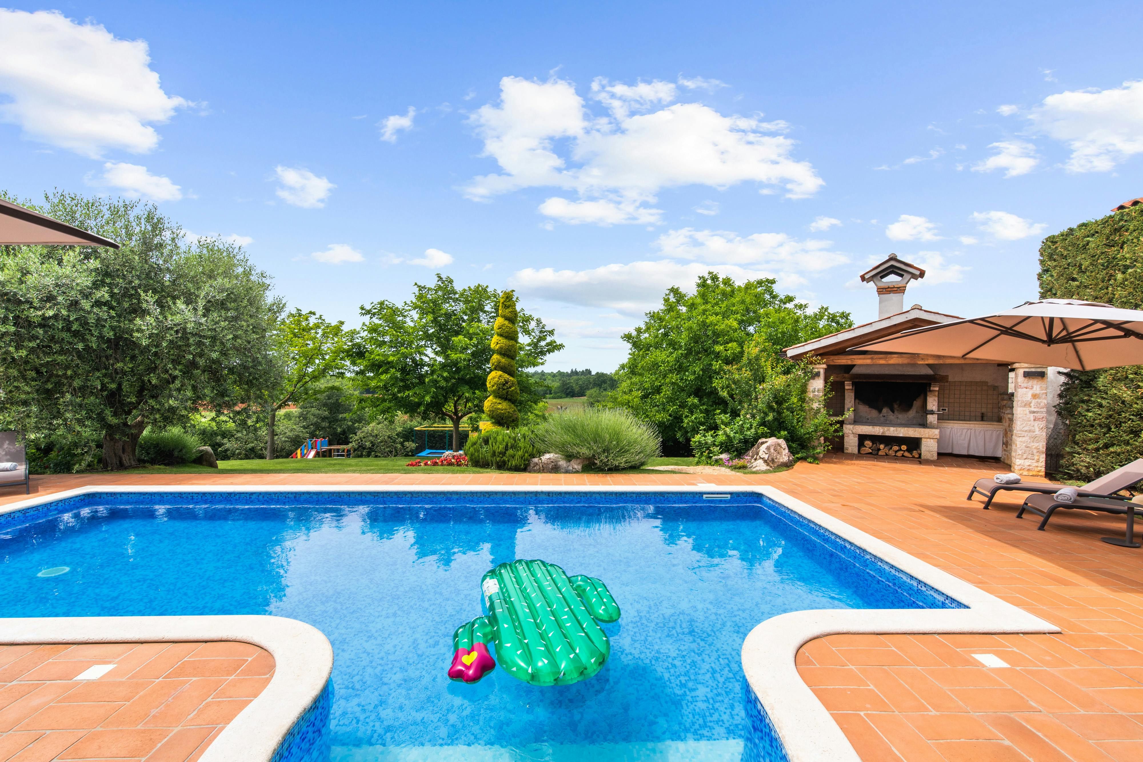 This luxurious villa, surrounded by a fenced plot of 800 m², offers maximum privacy with its two residential buildings and an indoor area of 300 m². The park-like outdoor area boasts a large pool, jacuzzi, tennis court, children's playground, trampoline, and brick charcoal grill. The cosy country house ambience features air-conditioned rooms with wood, natural stone elements, and color accents. The main house is spread over three floors and includes a spacious living/dining room with fireplace, SAT-TV, fully equipped kitchen, four double bedrooms each with an en suite bathroom, and a guest toilet. The smaller stone house near the pool has a small kitchen, dining area, living area, one bedroom with an en suite bathroom upstairs and access to a covered balcony. A game room with ping pong table, darts and a pool table completes the equipment of the villa. This property comfortably accommodates up to 14 people.