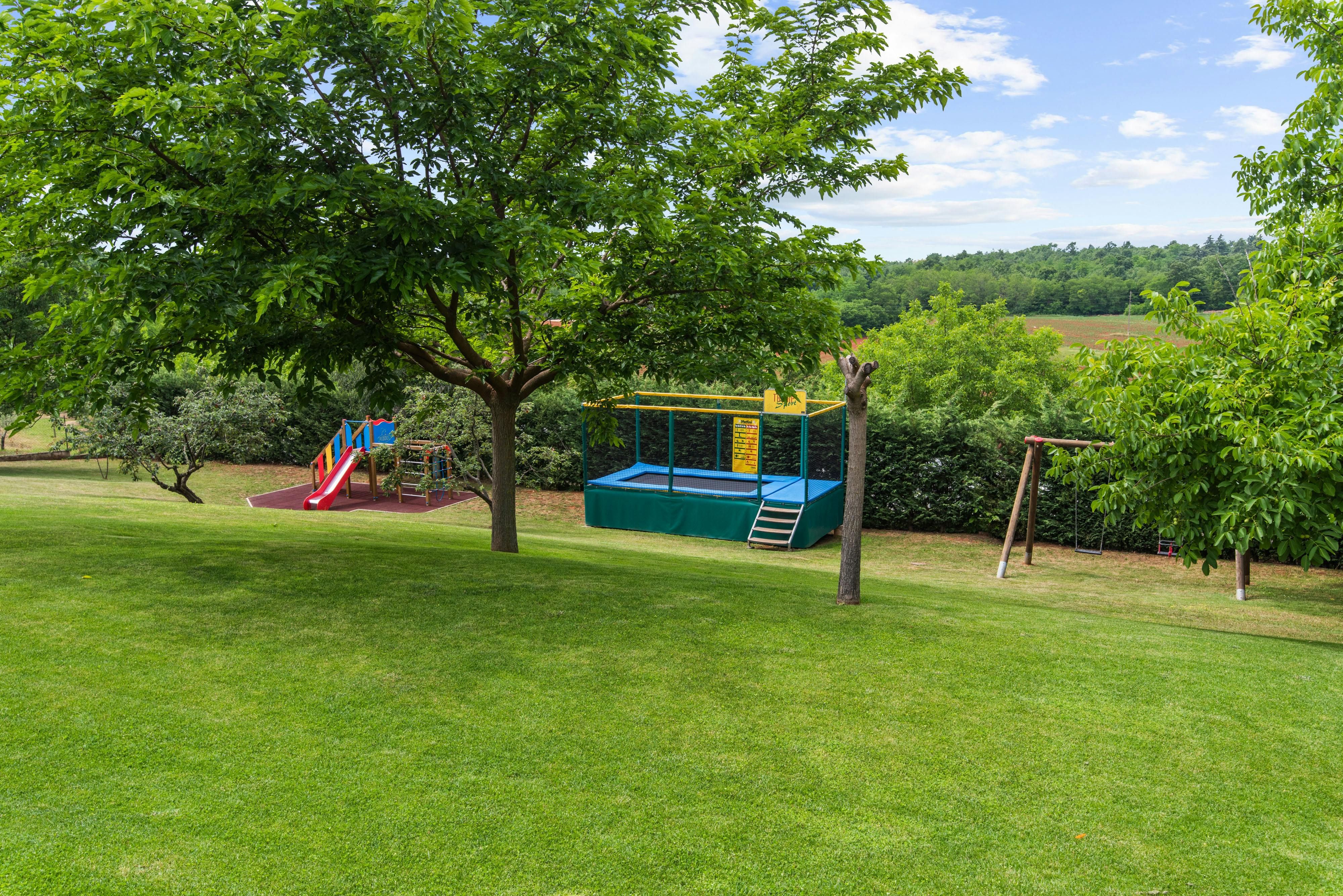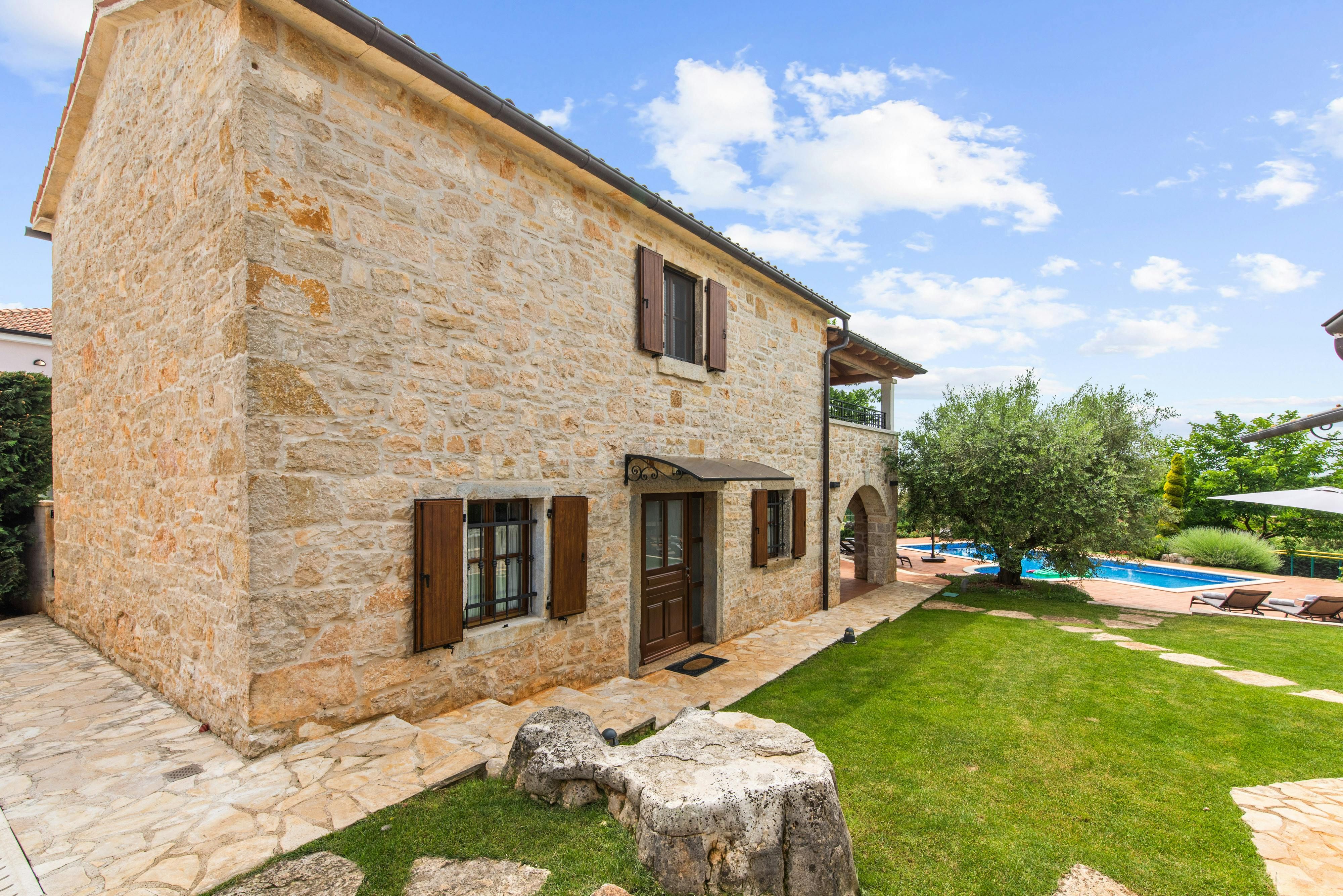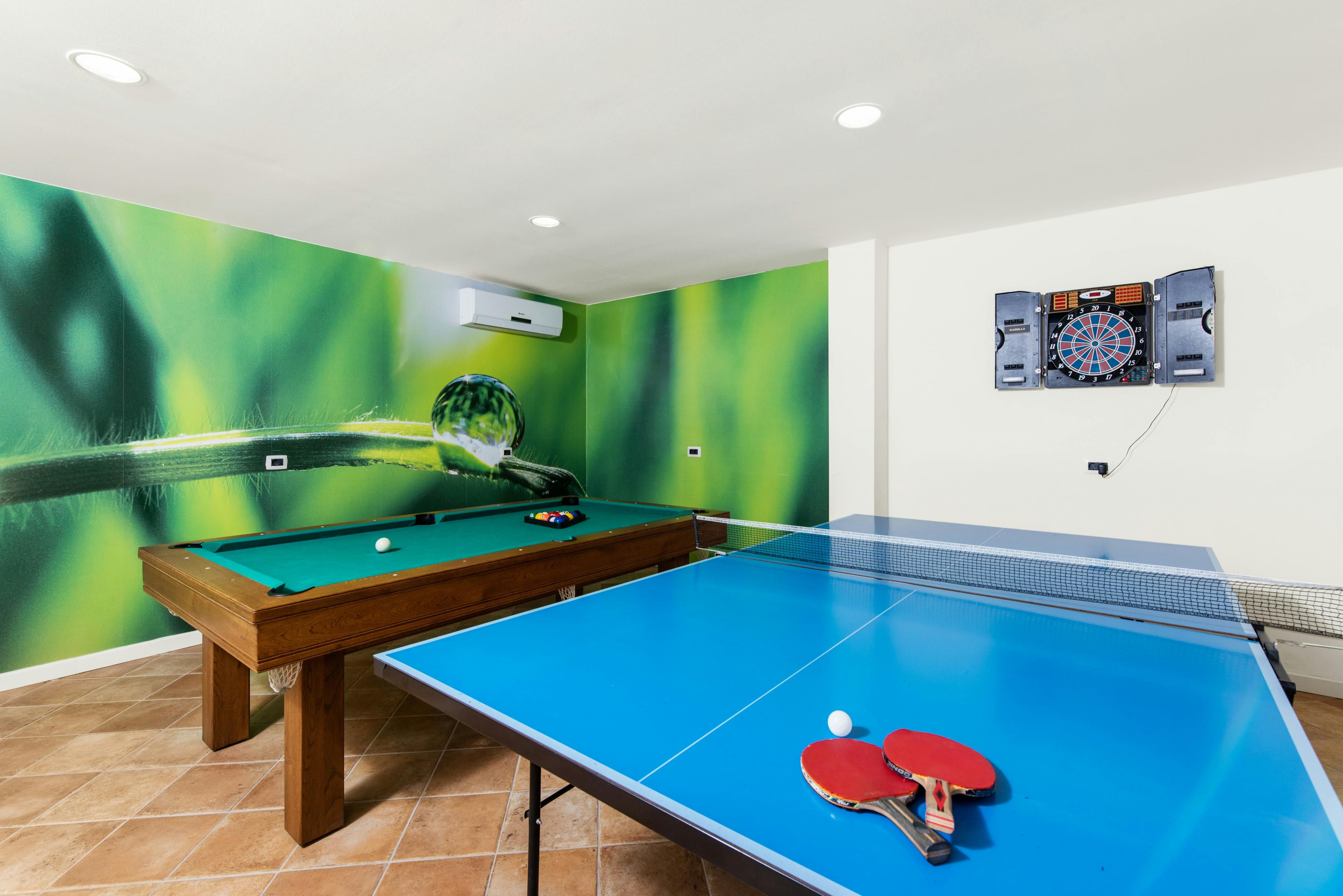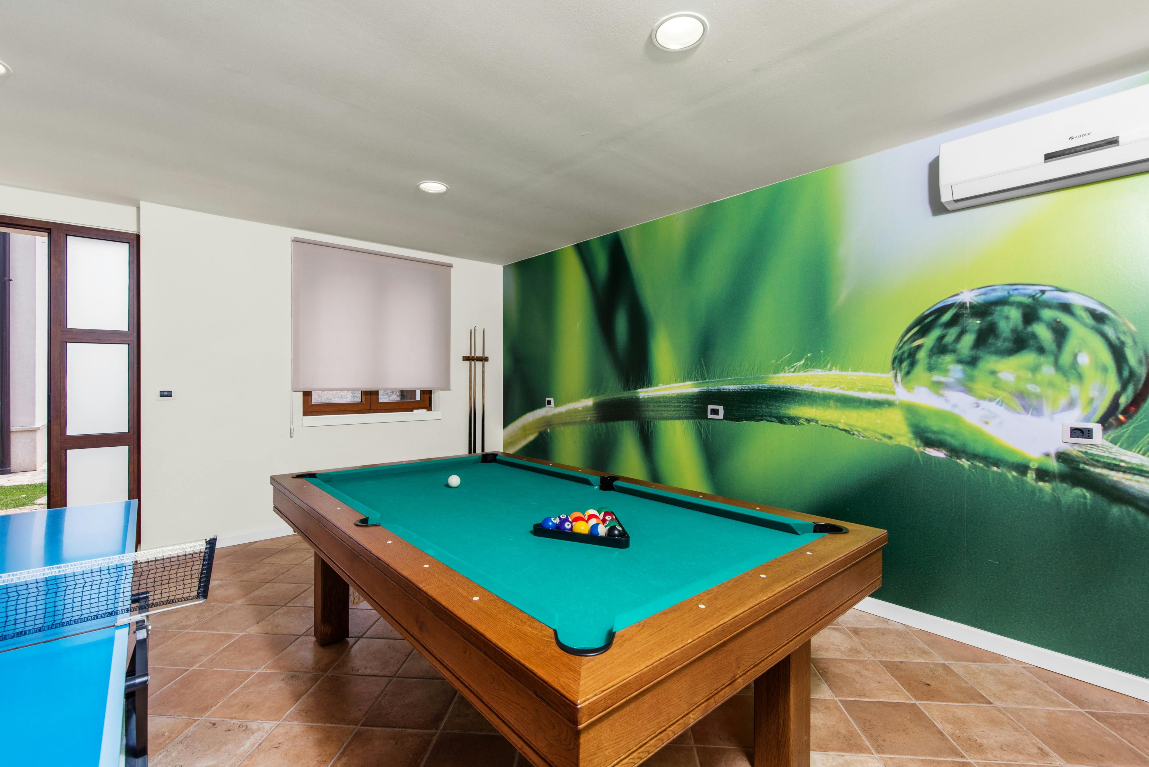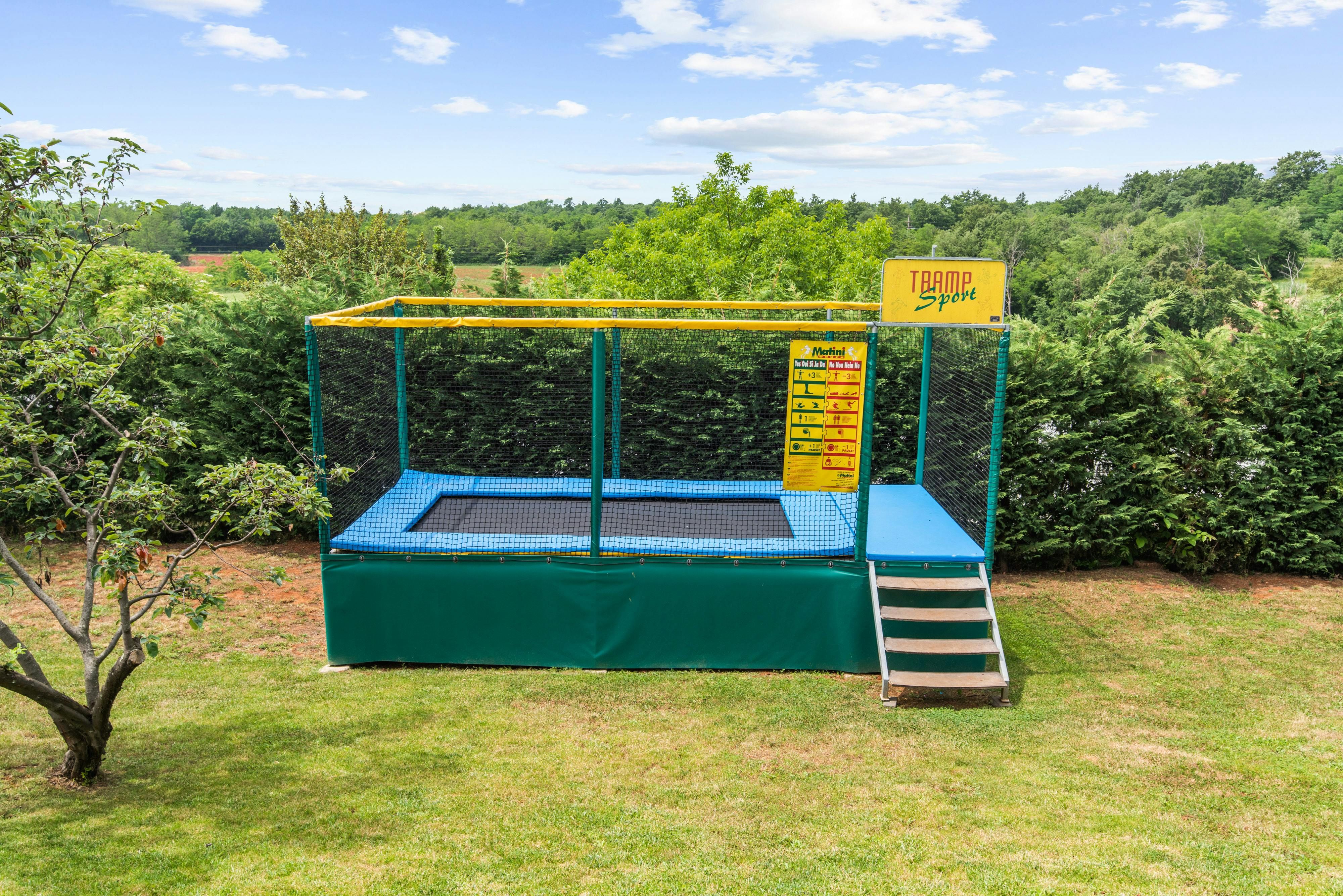 This luxurious villa, surrounded by a fenced plot of 800 m², offers maximum privacy with its two residential buildings and an indoor area of 300 m². The park-like outdoor area boasts a large pool, jacuzzi, tennis court, children's playground, trampoline, and brick charcoal grill. The cosy country house ambience features air-conditioned rooms with wood, natural stone elements, and color accents. The main house is spread over three floors and includes a spacious living/dining room with fireplace, SAT-TV, fully equipped kitchen, four double bedrooms each with an en suite bathroom, and a guest toilet. The smaller stone house near the pool has a small kitchen, dining area, living area, one bedroom with an en suite bathroom upstairs and access to a covered balcony. A game room with ping pong table, darts and a pool table completes the equipment of the villa. This property comfortably accommodates up to 14 people.