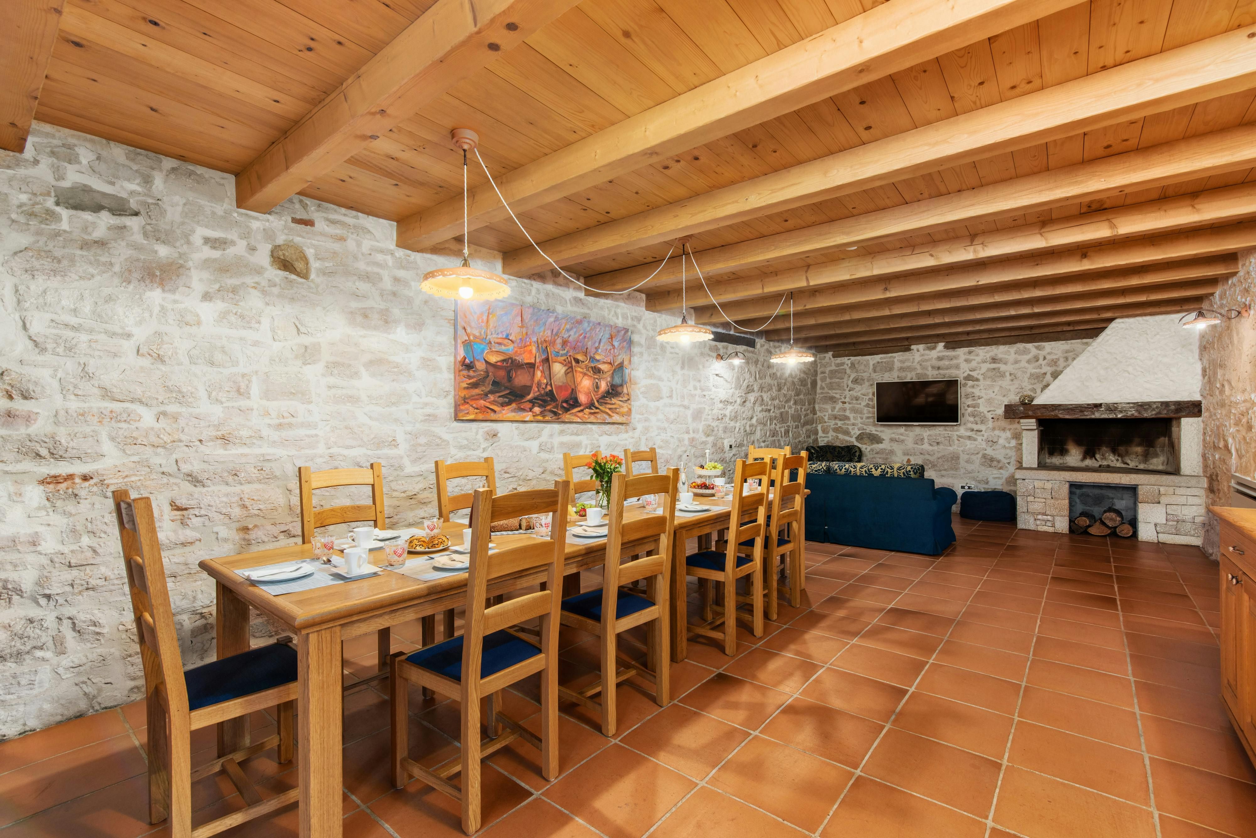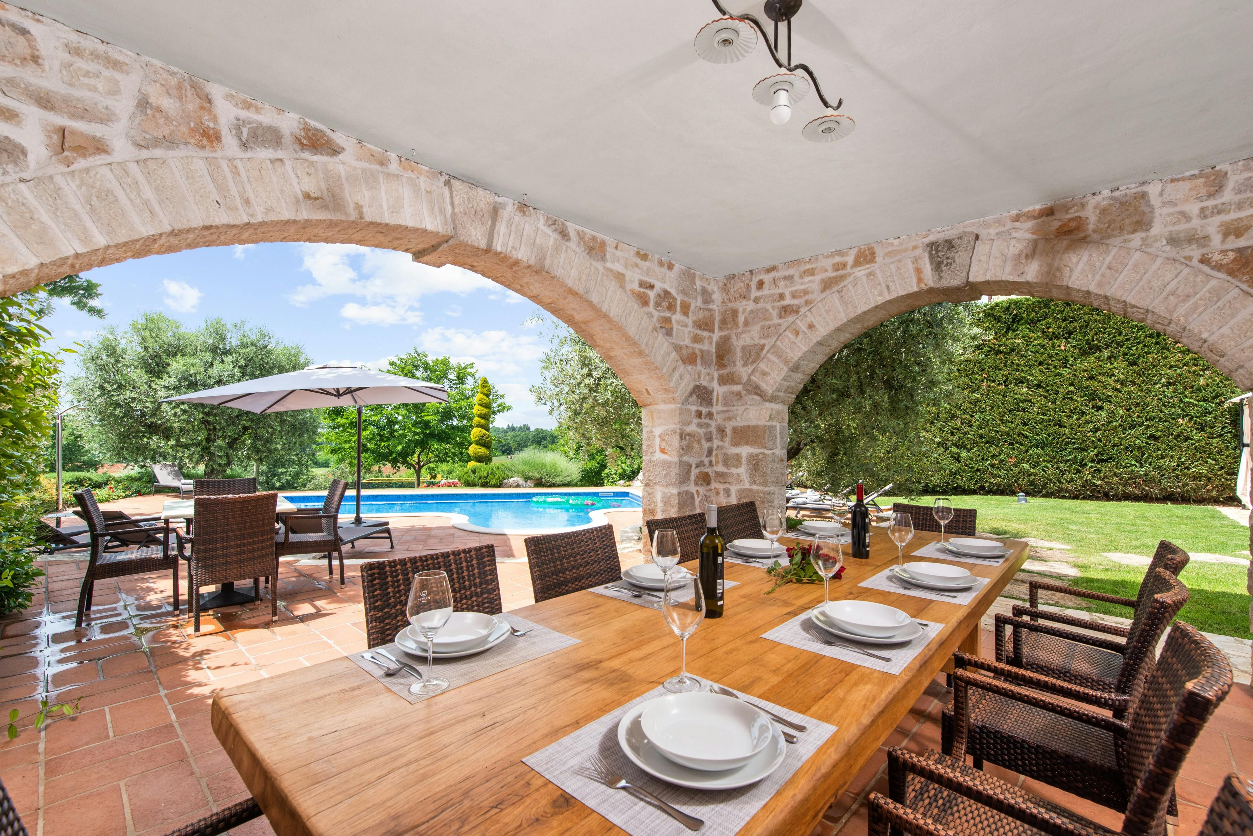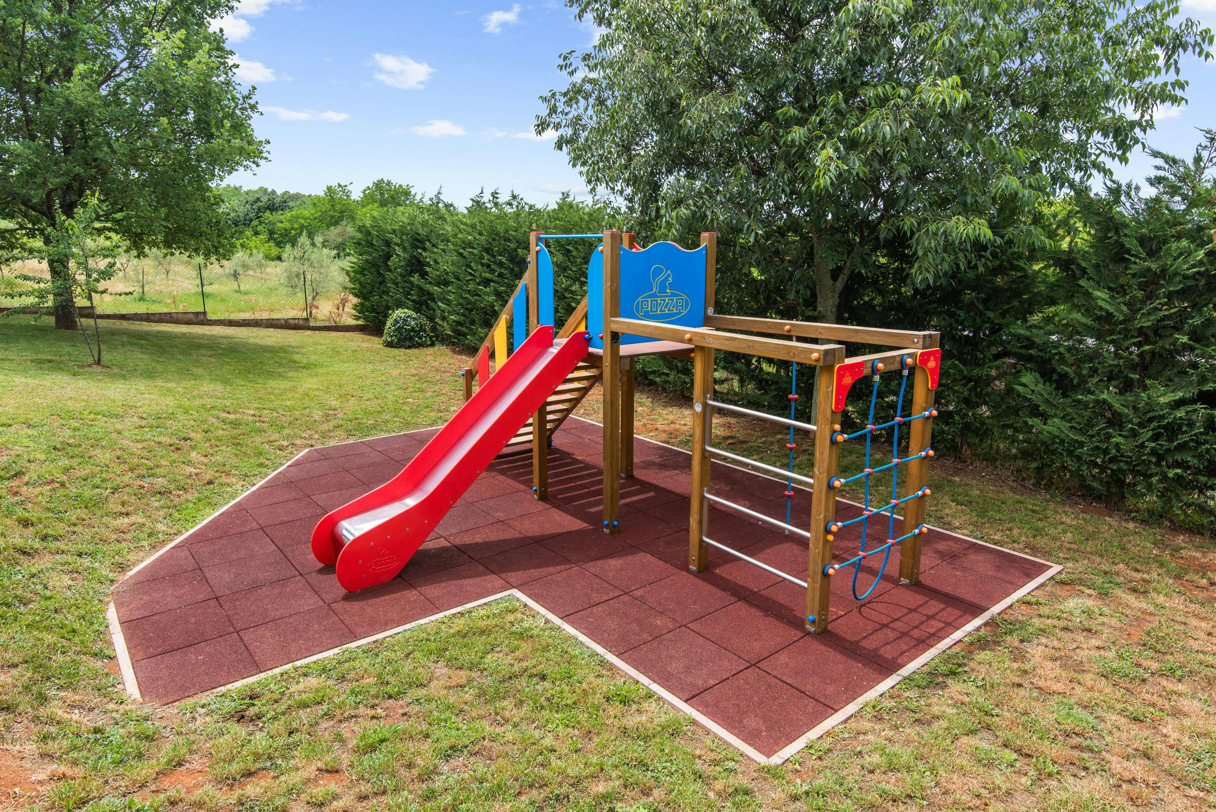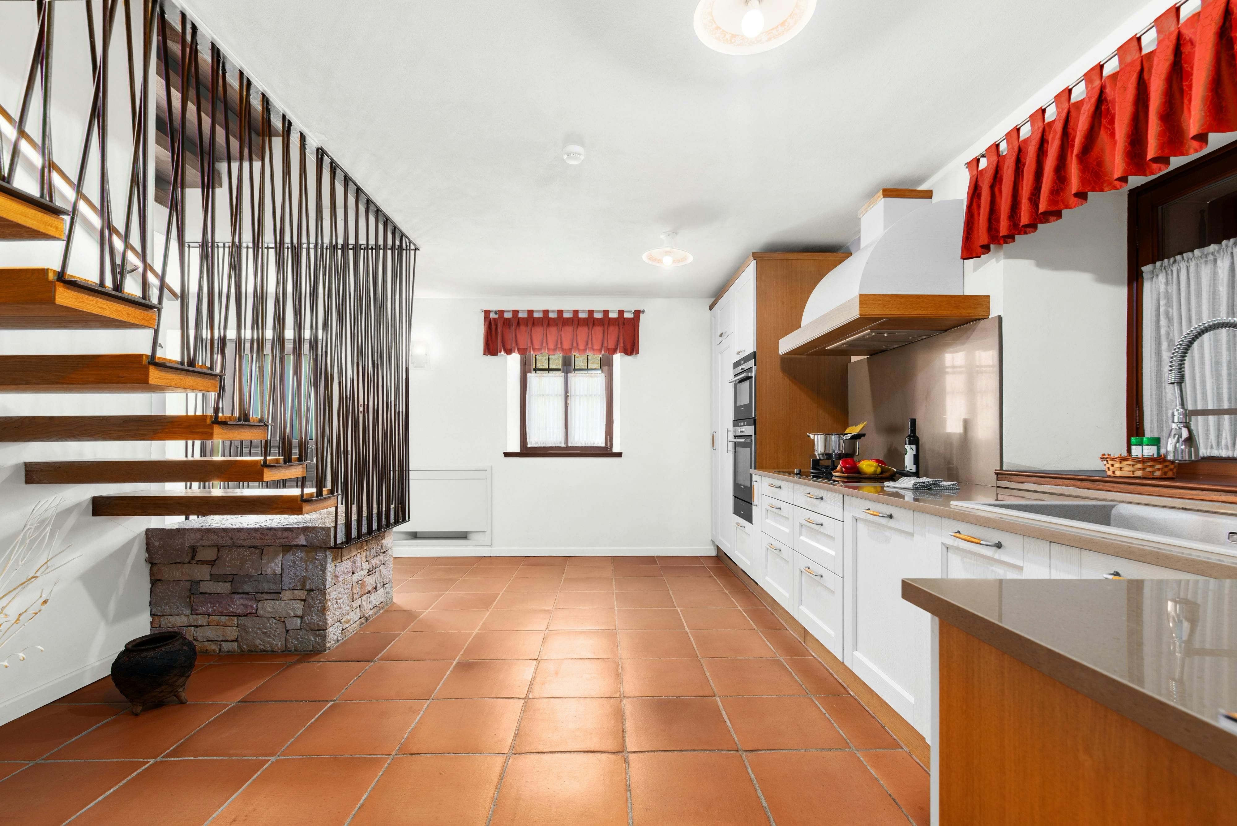 This luxurious villa, surrounded by a fenced plot of 800 m², offers maximum privacy with its two residential buildings and an indoor area of 300 m². The park-like outdoor area boasts a large pool, jacuzzi, tennis court, children's playground, trampoline, and brick charcoal grill. The cosy country house ambience features air-conditioned rooms with wood, natural stone elements, and color accents. The main house is spread over three floors and includes a spacious living/dining room with fireplace, SAT-TV, fully equipped kitchen, four double bedrooms each with an en suite bathroom, and a guest toilet. The smaller stone house near the pool has a small kitchen, dining area, living area, one bedroom with an en suite bathroom upstairs and access to a covered balcony. A game room with ping pong table, darts and a pool table completes the equipment of the villa. This property comfortably accommodates up to 14 people.