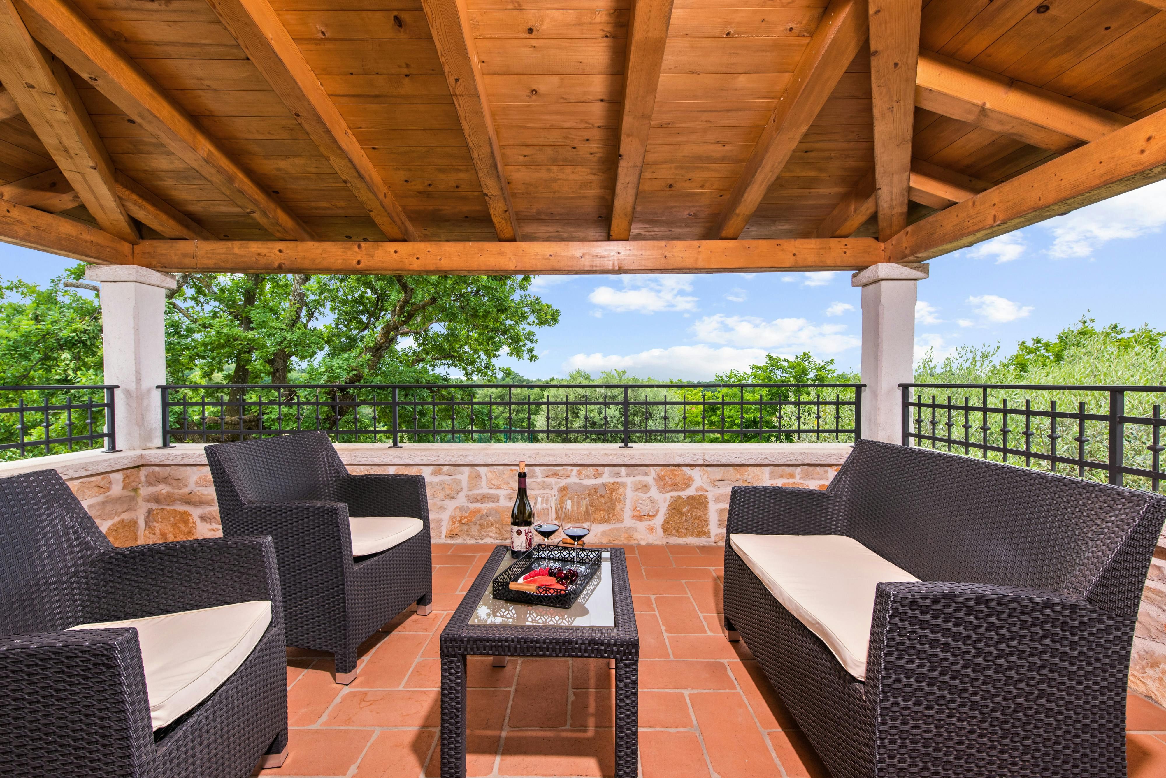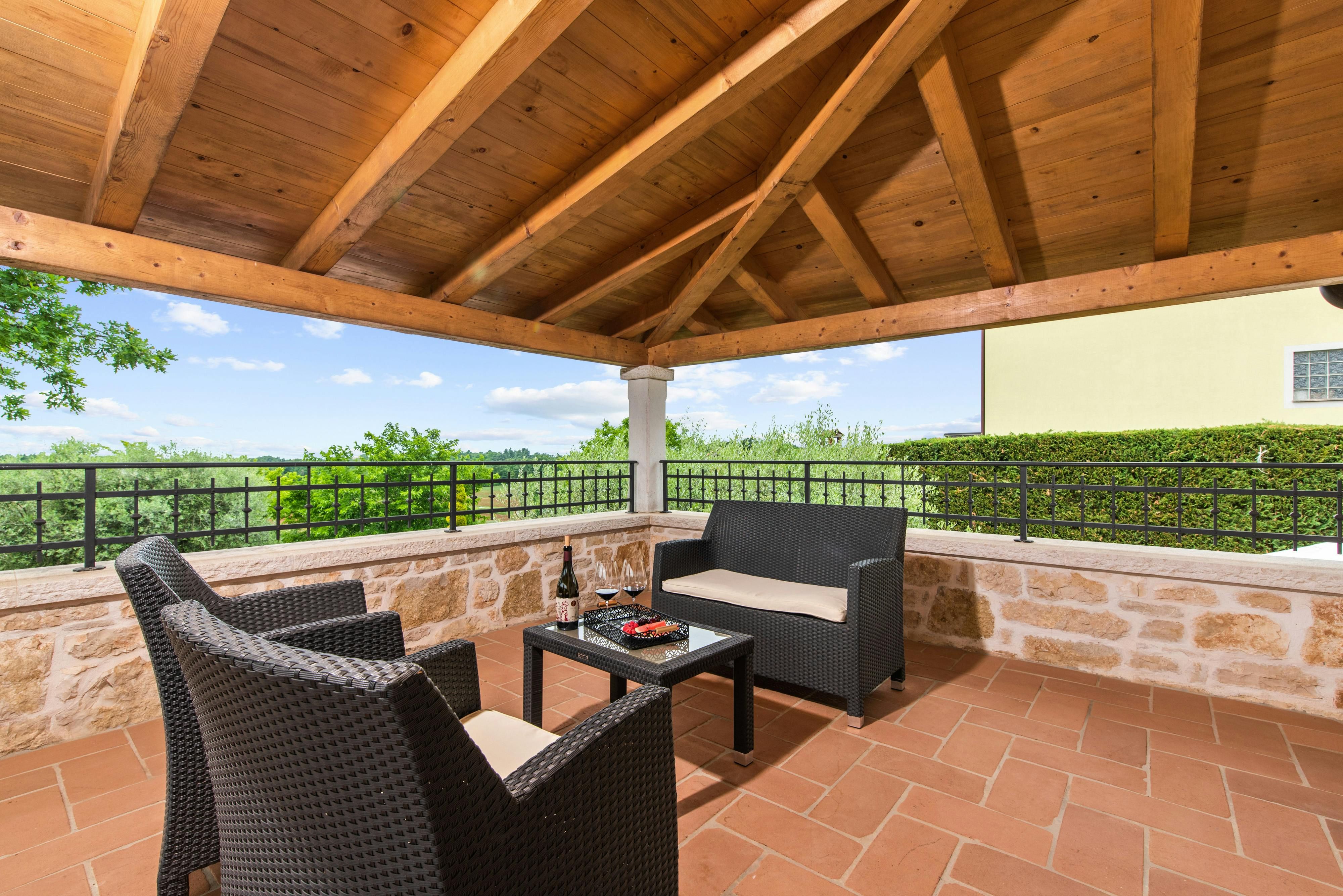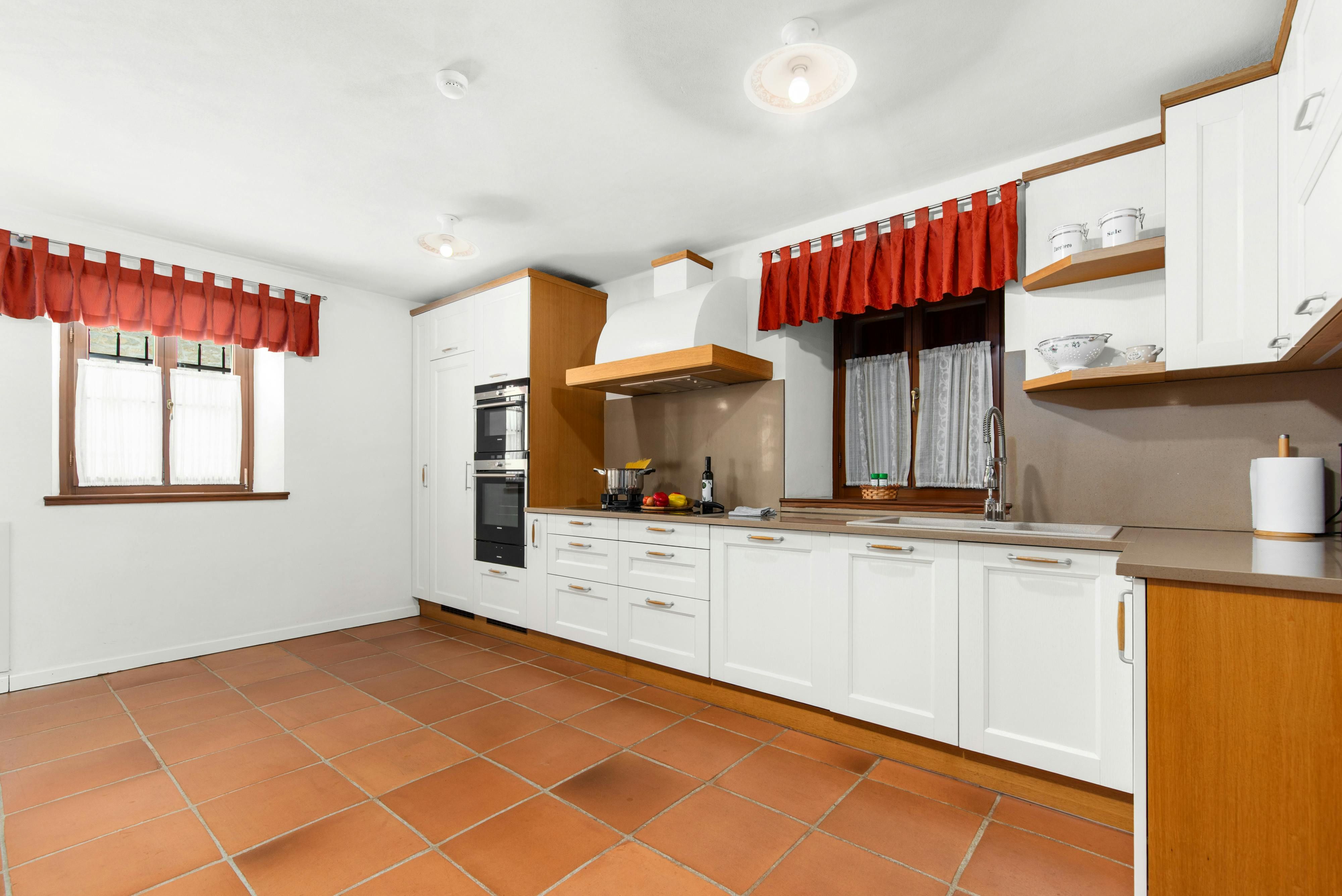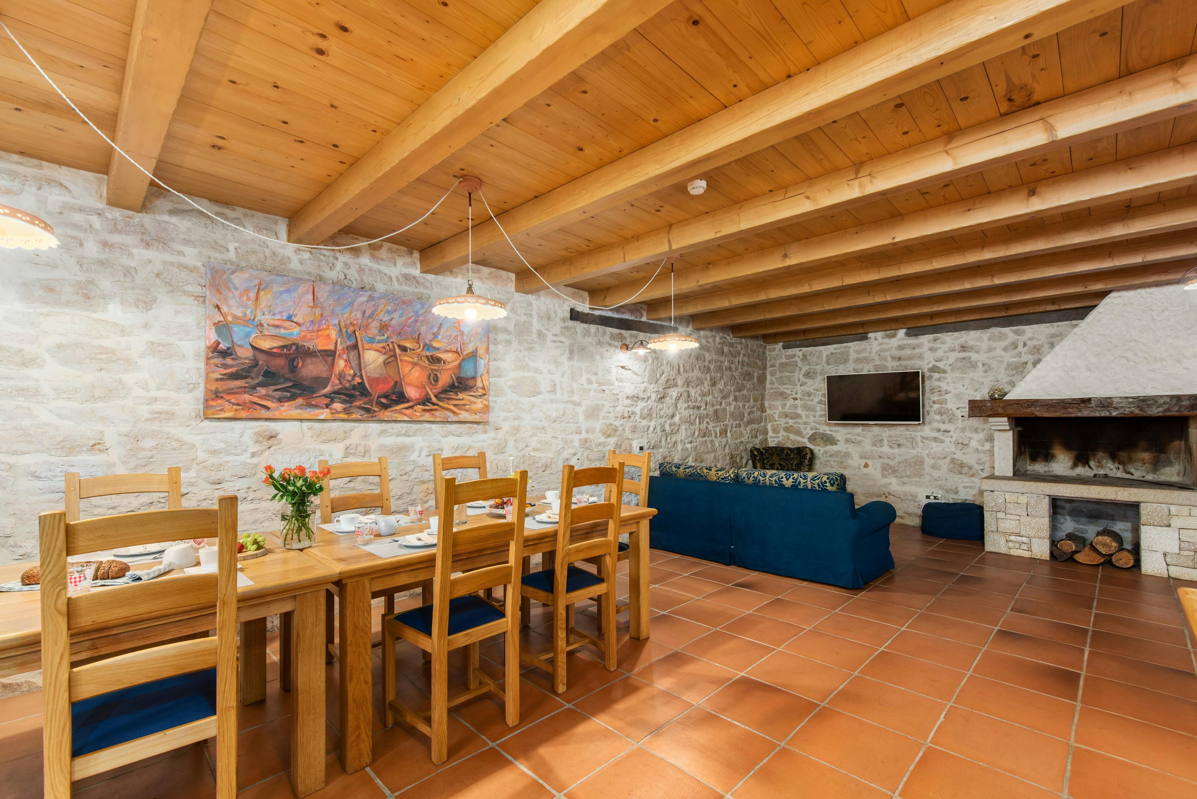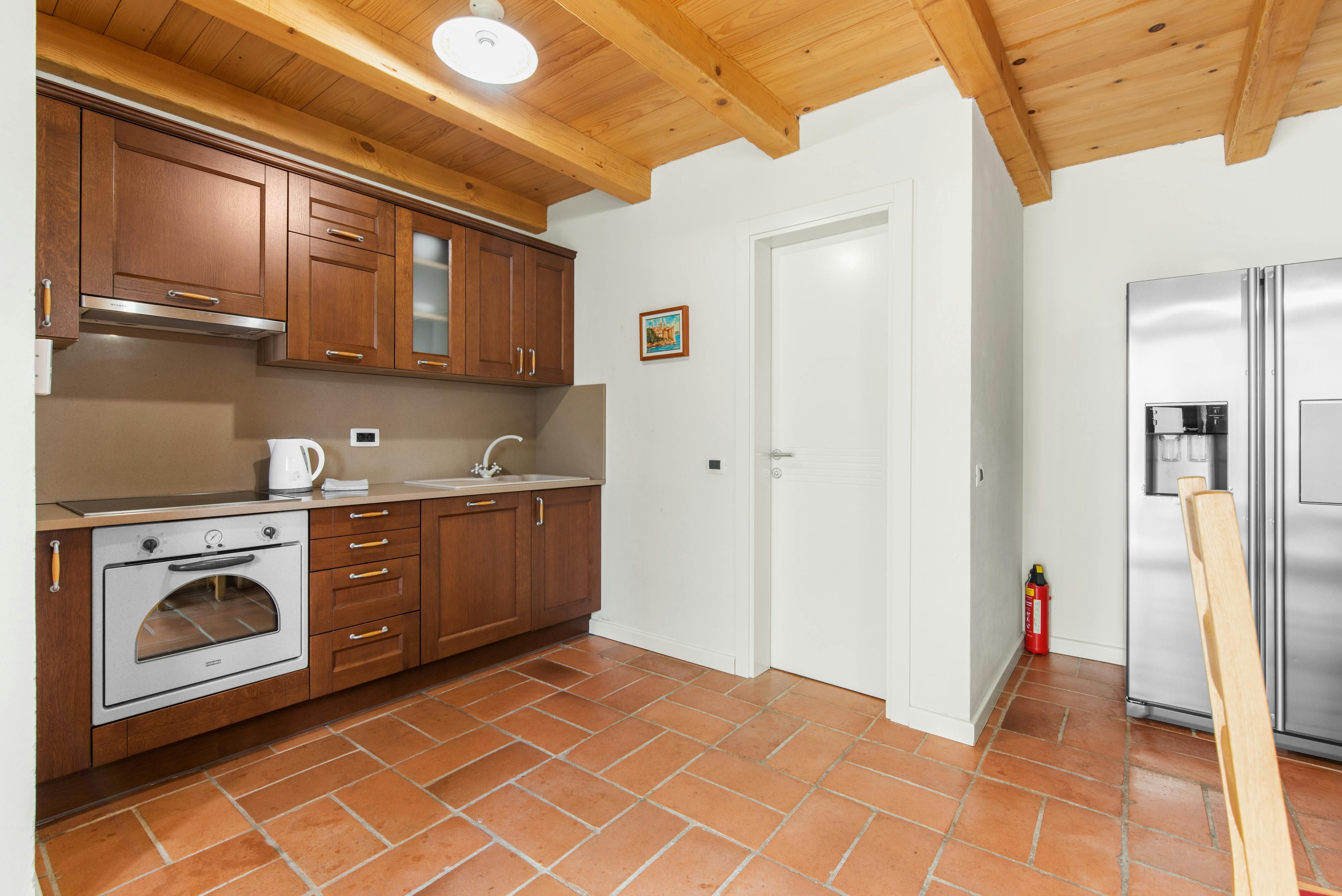 This luxurious villa, surrounded by a fenced plot of 800 m², offers maximum privacy with its two residential buildings and an indoor area of 300 m². The park-like outdoor area boasts a large pool, jacuzzi, tennis court, children's playground, trampoline, and brick charcoal grill. The cosy country house ambience features air-conditioned rooms with wood, natural stone elements, and color accents. The main house is spread over three floors and includes a spacious living/dining room with fireplace, SAT-TV, fully equipped kitchen, four double bedrooms each with an en suite bathroom, and a guest toilet. The smaller stone house near the pool has a small kitchen, dining area, living area, one bedroom with an en suite bathroom upstairs and access to a covered balcony. A game room with ping pong table, darts and a pool table completes the equipment of the villa. This property comfortably accommodates up to 14 people.
