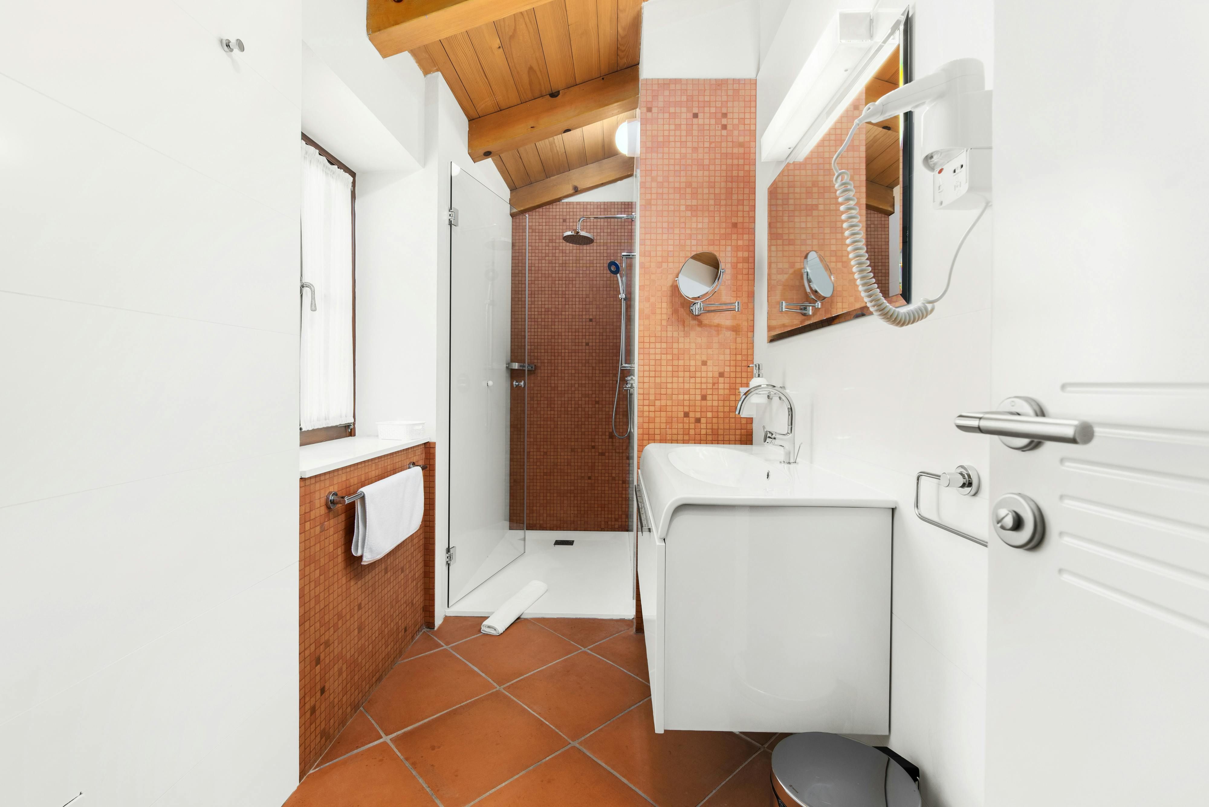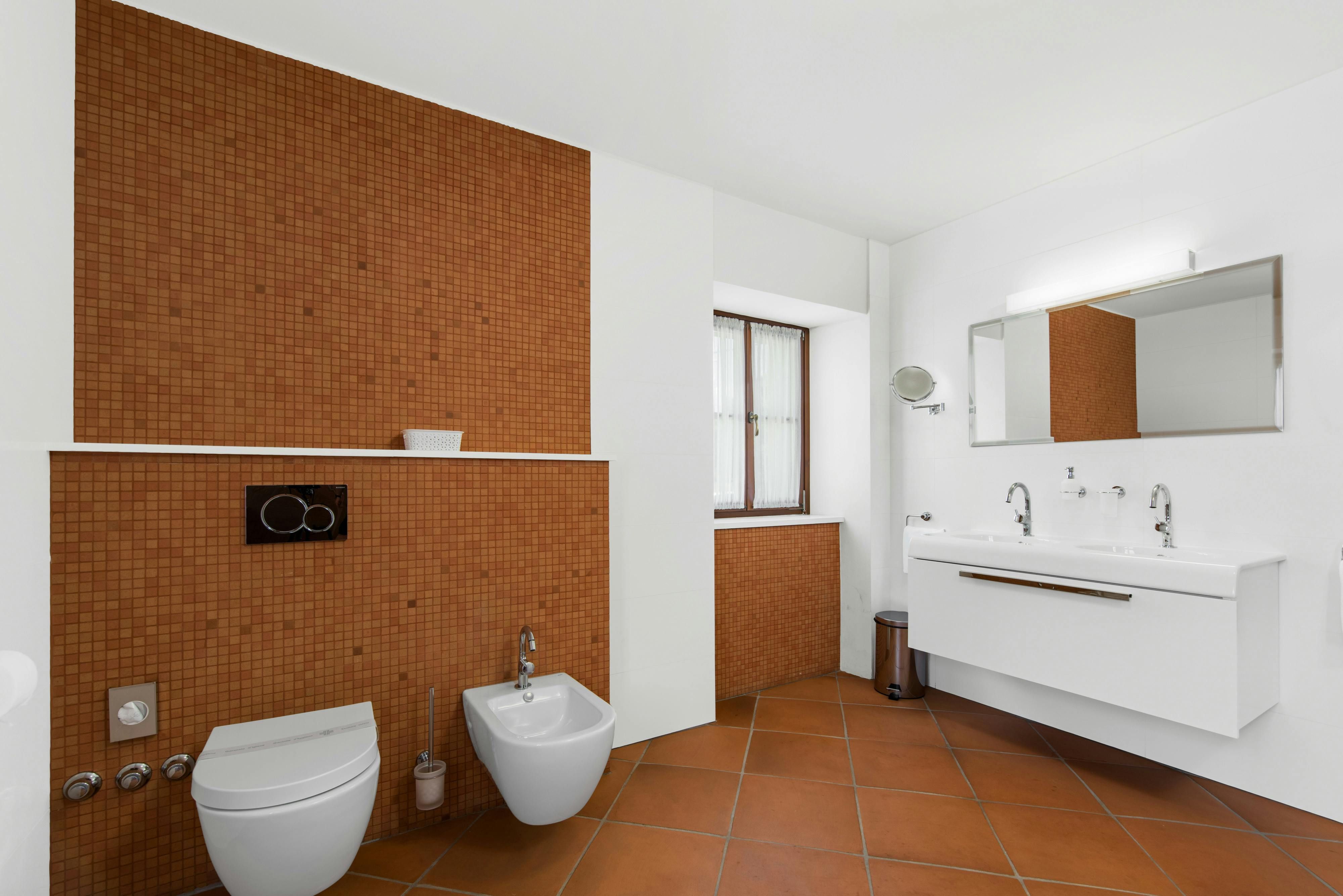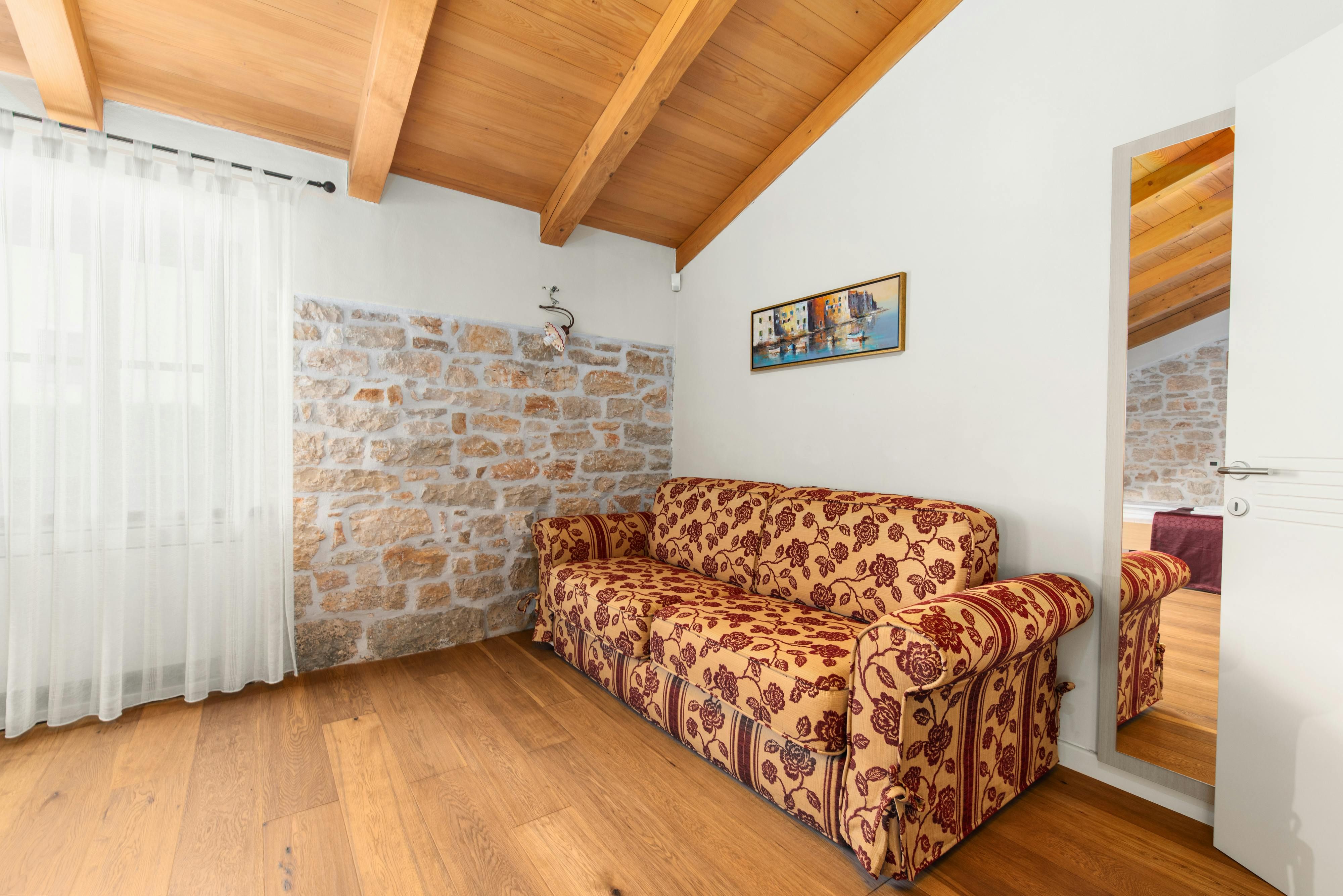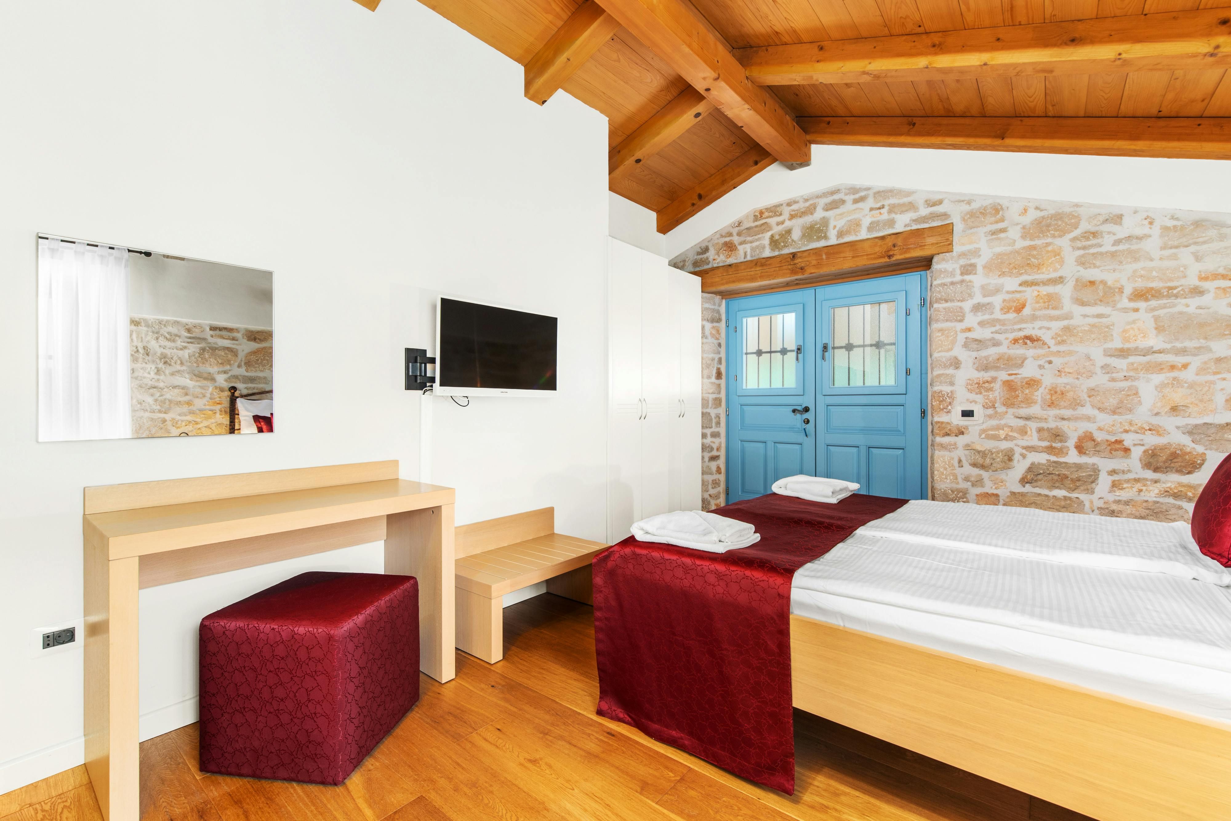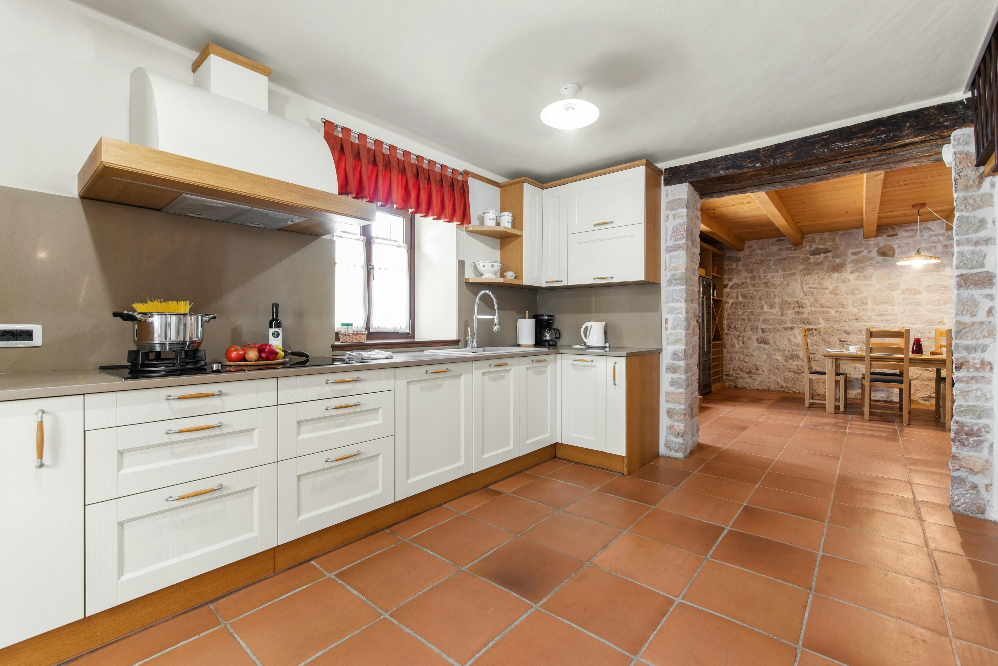 This luxurious villa, surrounded by a fenced plot of 800 m², offers maximum privacy with its two residential buildings and an indoor area of 300 m². The park-like outdoor area boasts a large pool, jacuzzi, tennis court, children's playground, trampoline, and brick charcoal grill. The cosy country house ambience features air-conditioned rooms with wood, natural stone elements, and color accents. The main house is spread over three floors and includes a spacious living/dining room with fireplace, SAT-TV, fully equipped kitchen, four double bedrooms each with an en suite bathroom, and a guest toilet. The smaller stone house near the pool has a small kitchen, dining area, living area, one bedroom with an en suite bathroom upstairs and access to a covered balcony. A game room with ping pong table, darts and a pool table completes the equipment of the villa. This property comfortably accommodates up to 14 people.