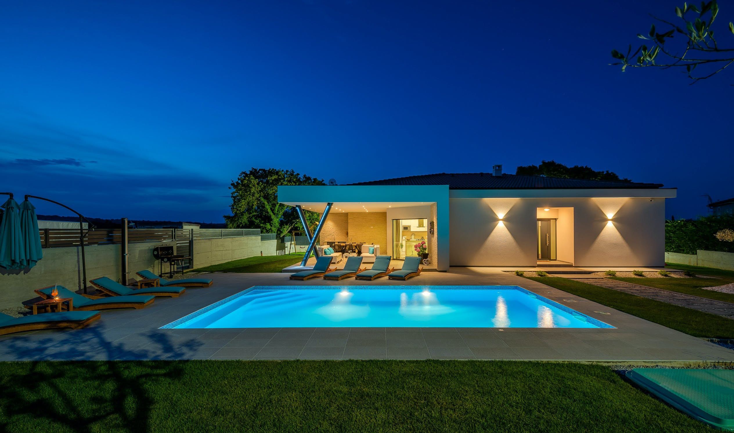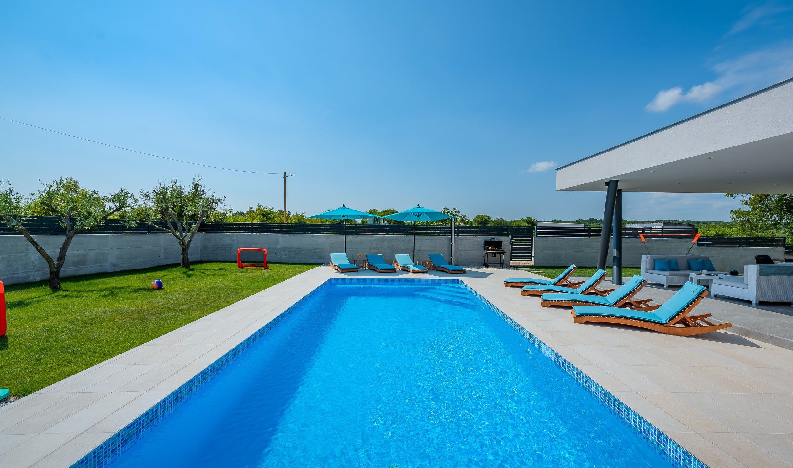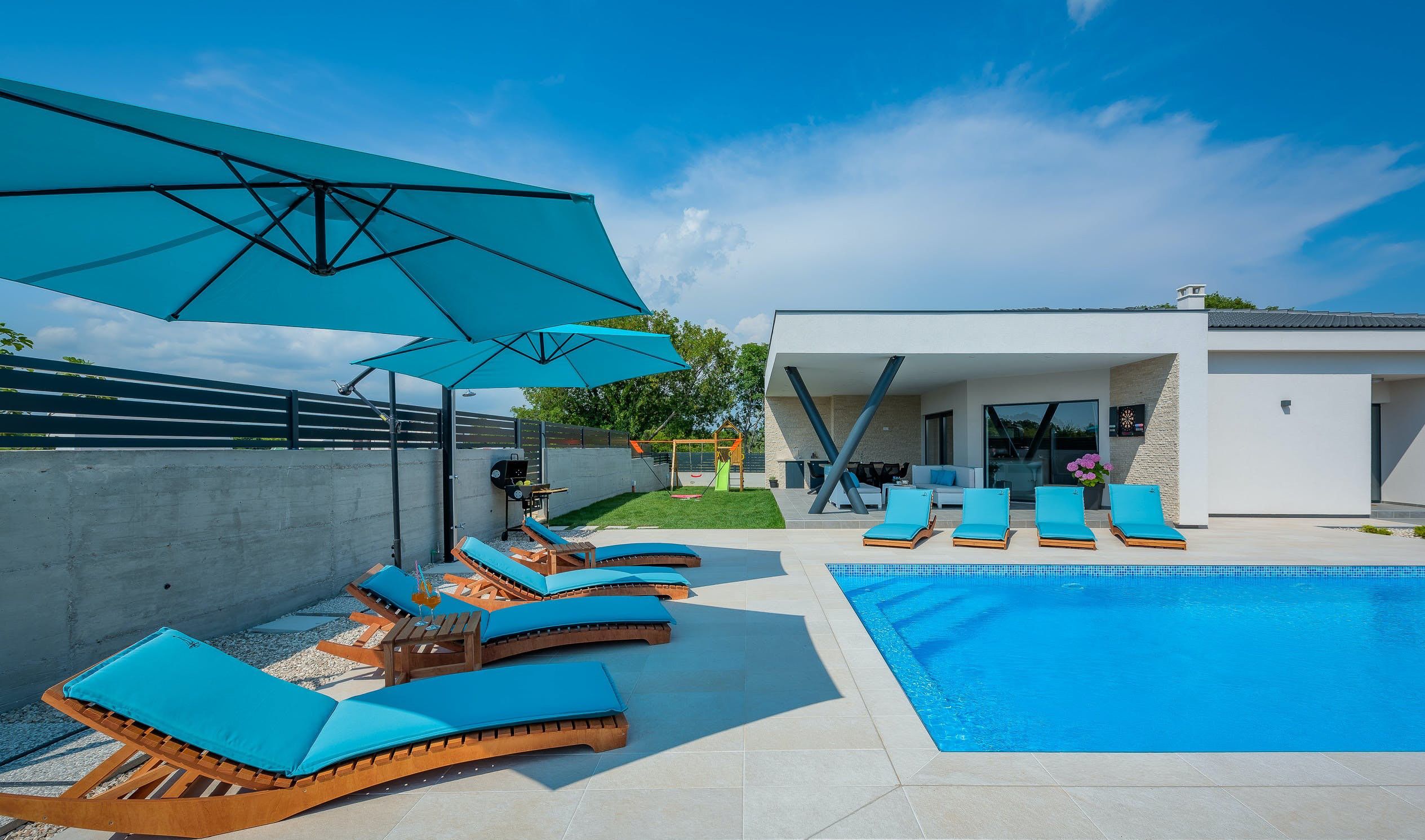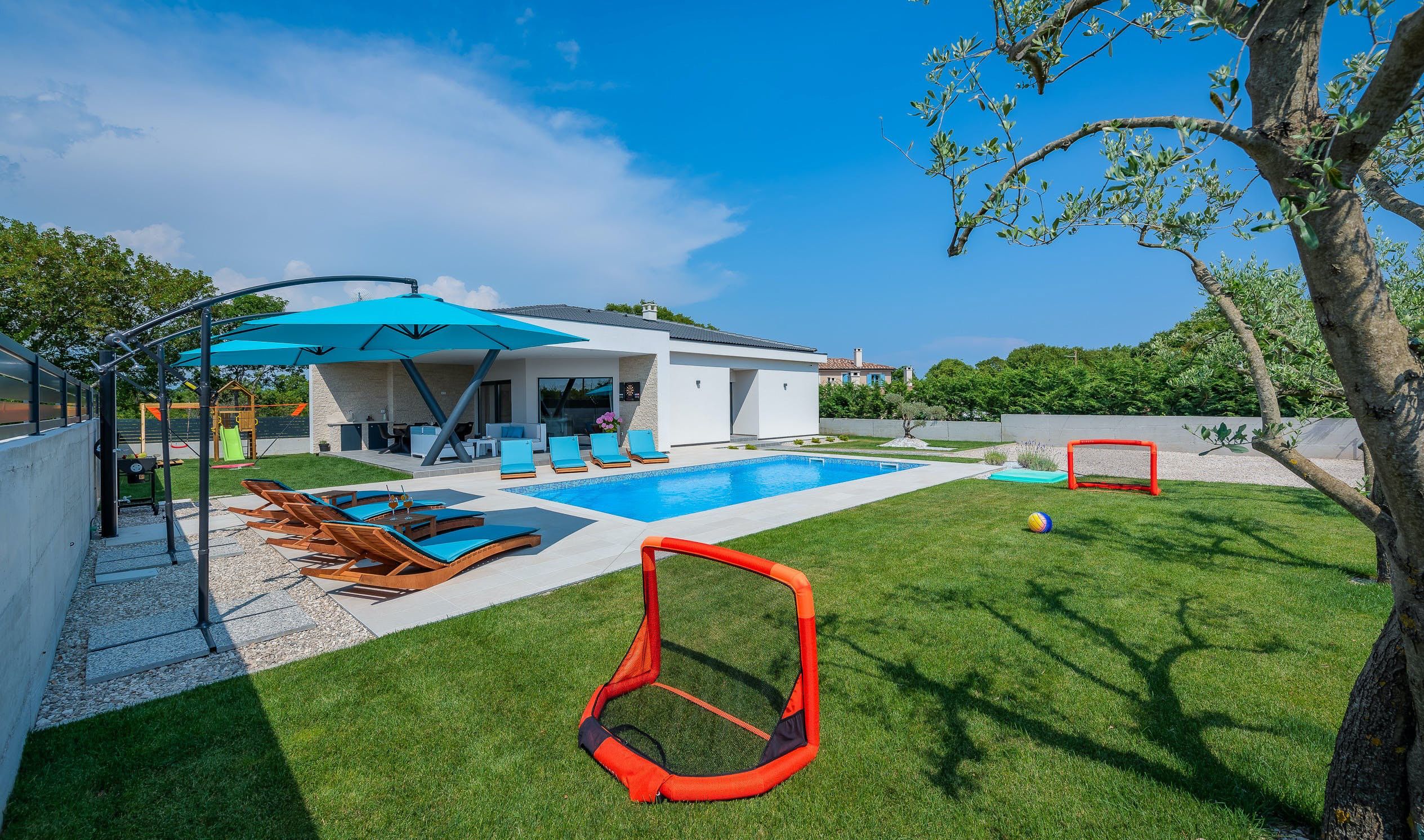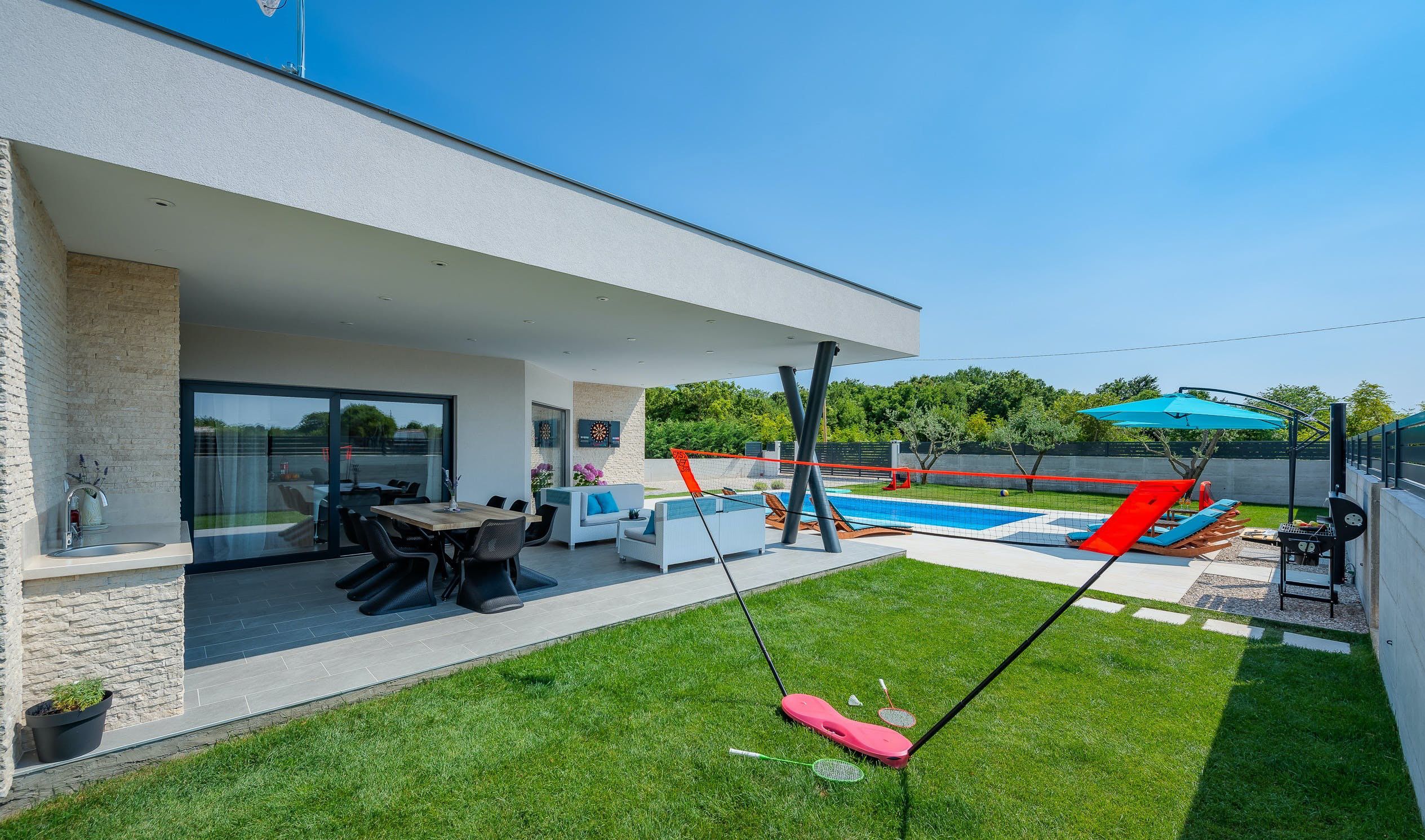 This home is an elegant, cubically designed villa with a harmonious ambience that invites guests to spend their time under the open sky. The villa features a 32 m² pool, a cosy lounge, and a stylish dining table. Guests can enjoy fun and action with the table tennis table, children's playground, volleyball net, soccer goals and dartboard. The villa has floor-to-ceiling windows that let in natural light and provide a view of the outdoor area. An air conditioning system ensures ideal indoor temperatures at all times. The living area features a large couch and TV while the dining area has a chic table for dining indoors. The fully equipped kitchen is openly integrated into the room. The villa has four individually designed bedrooms and modern en suite bathrooms. Guests can enjoy sizzling Mediterranean delicacies on the charcoal grill in the beautiful garden with lighting that contributes to a convivial atmosphere.