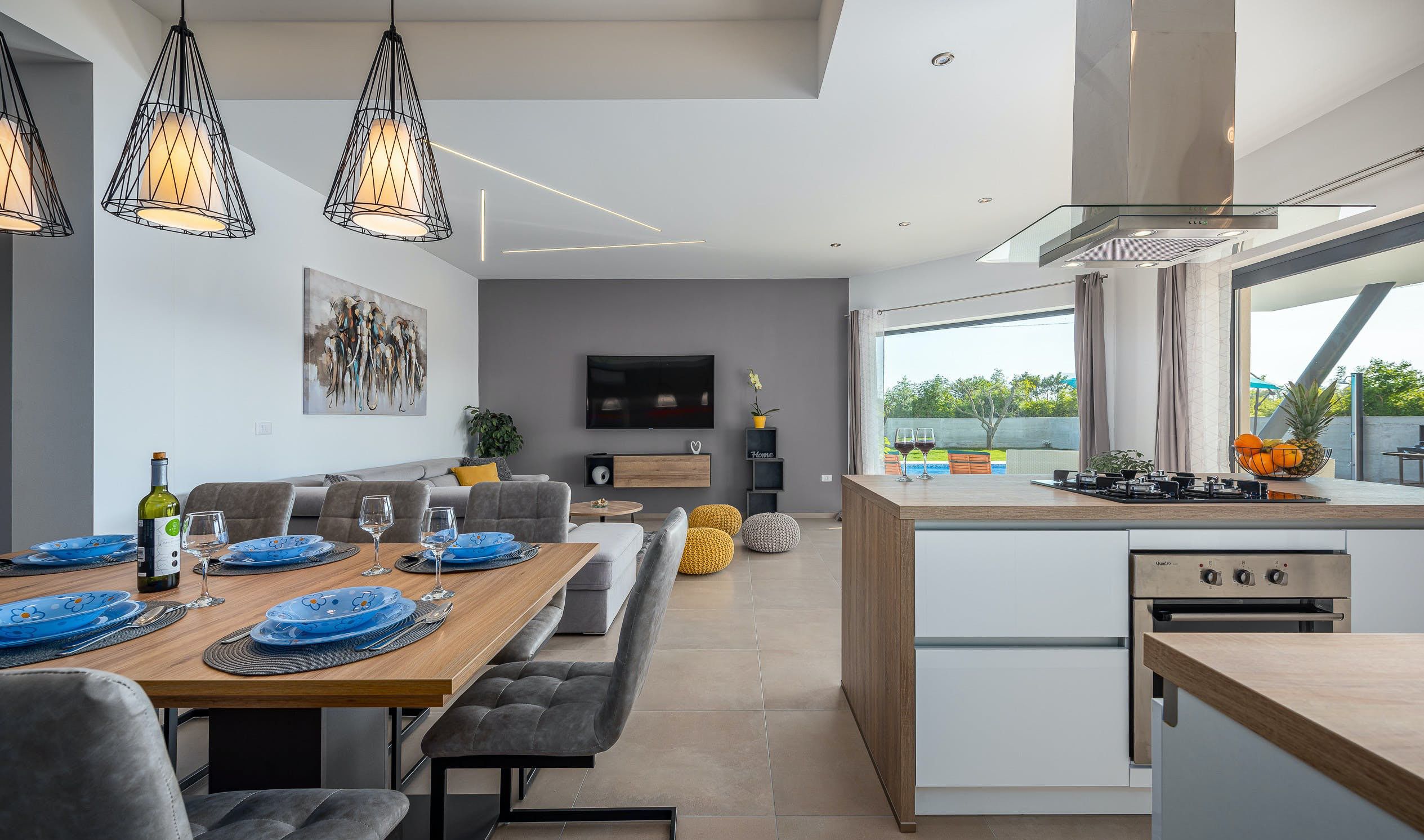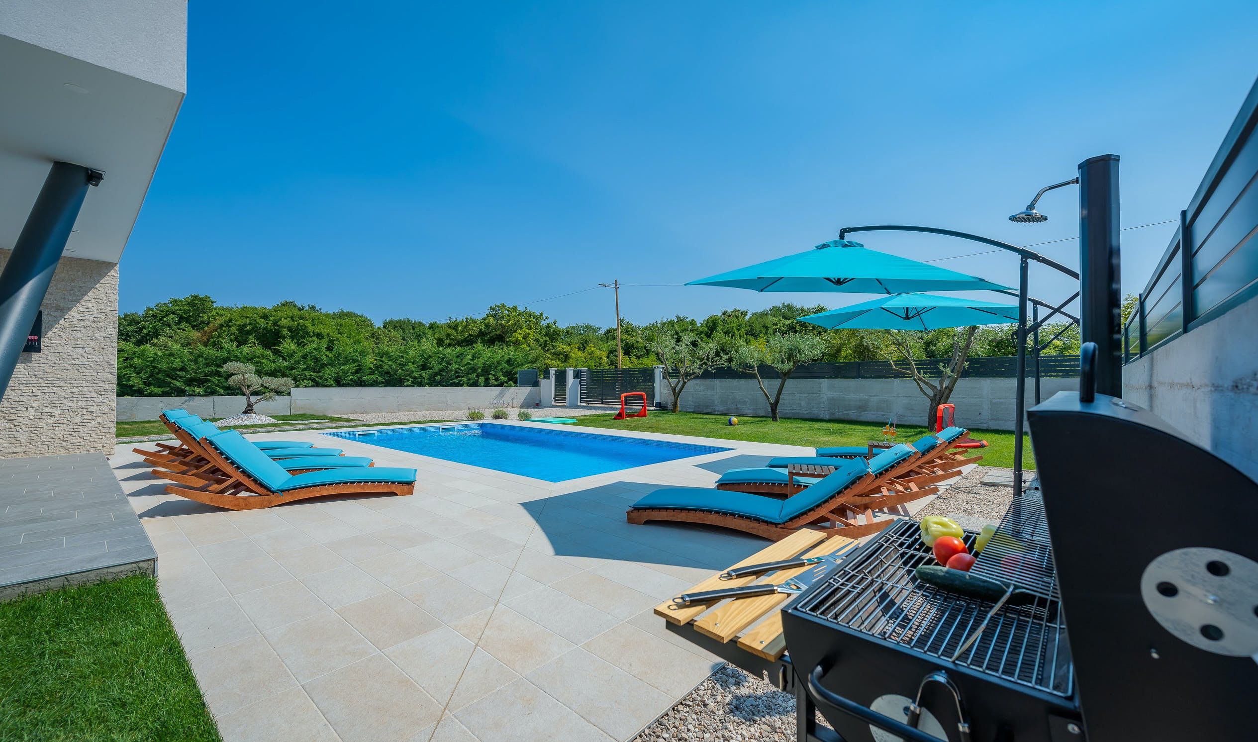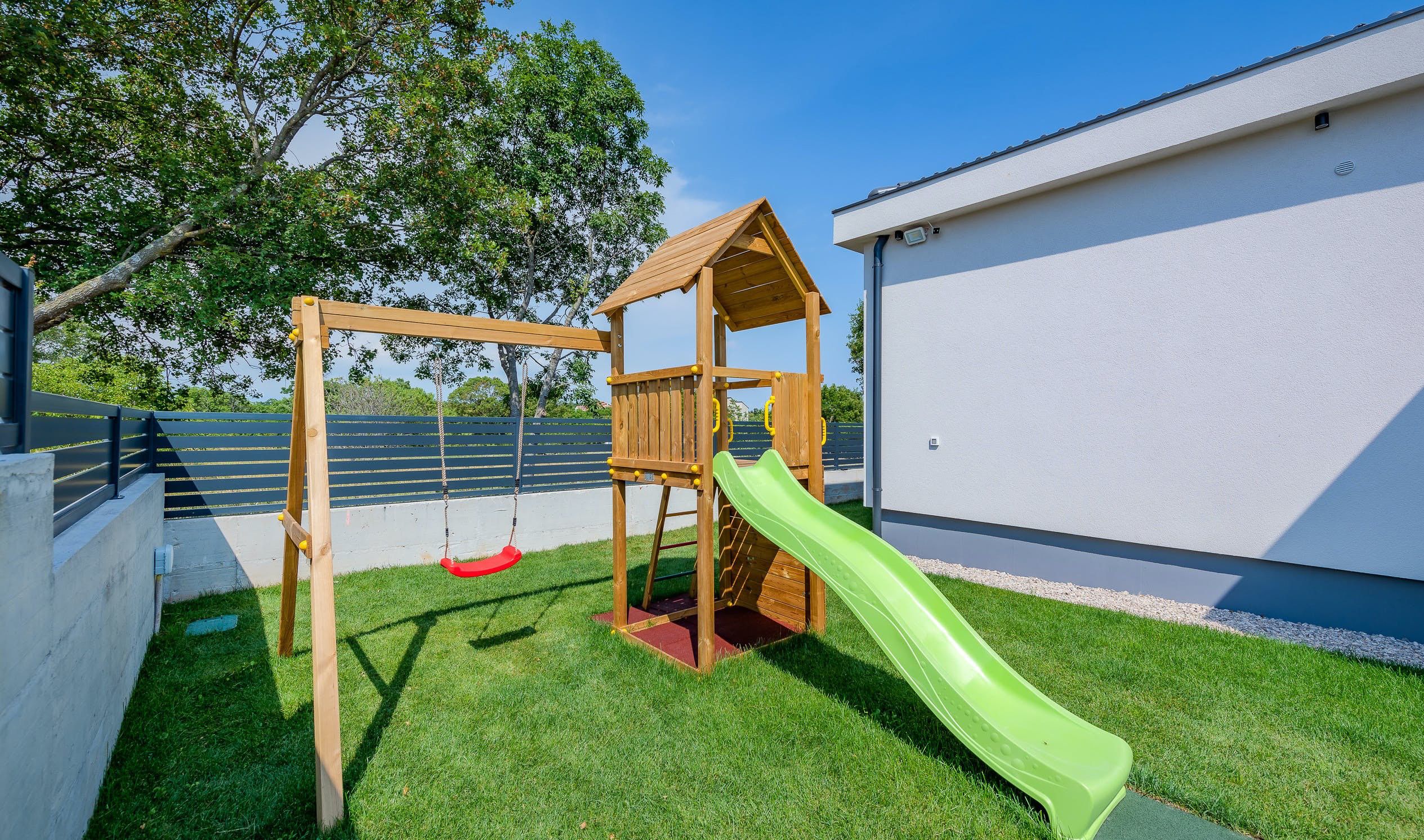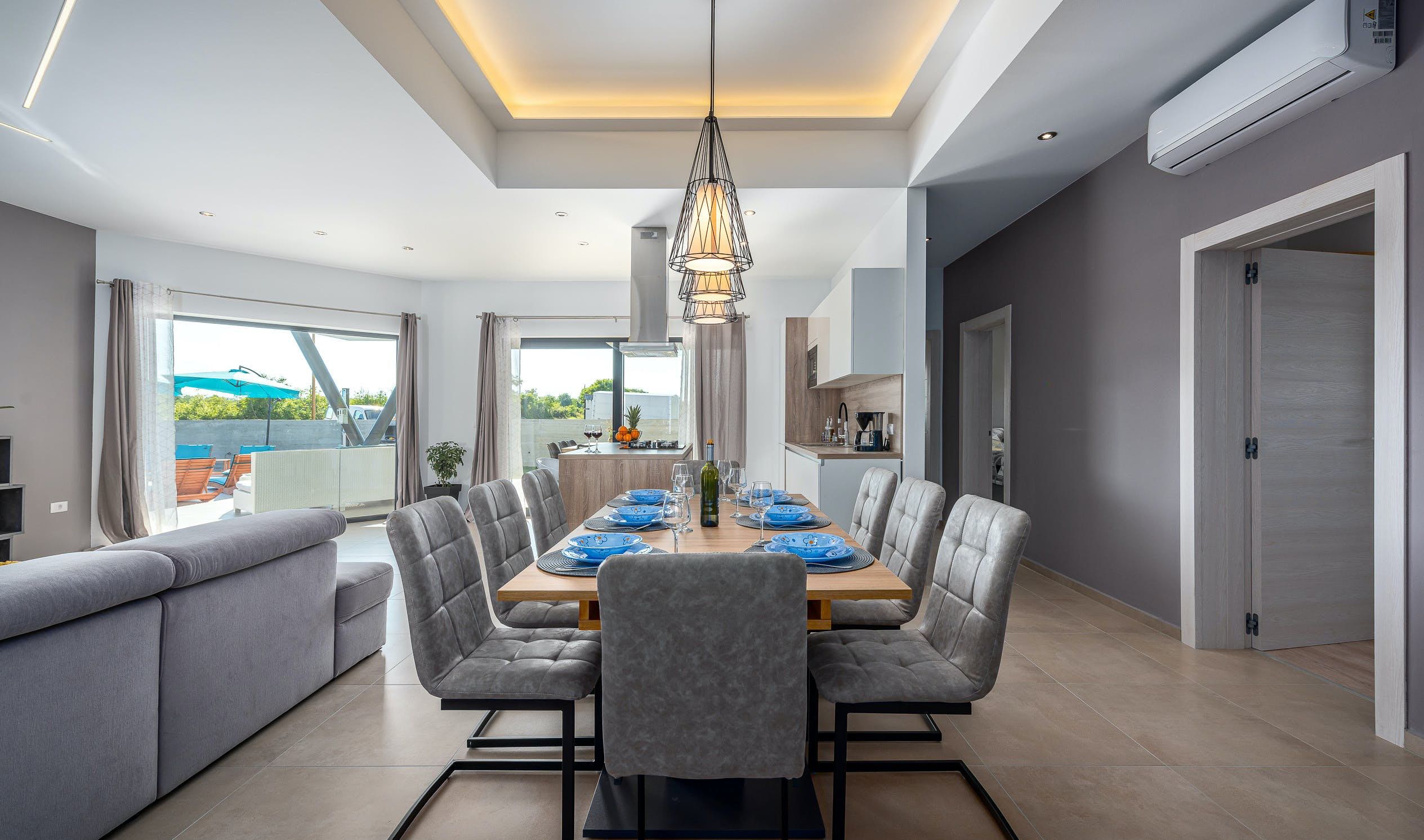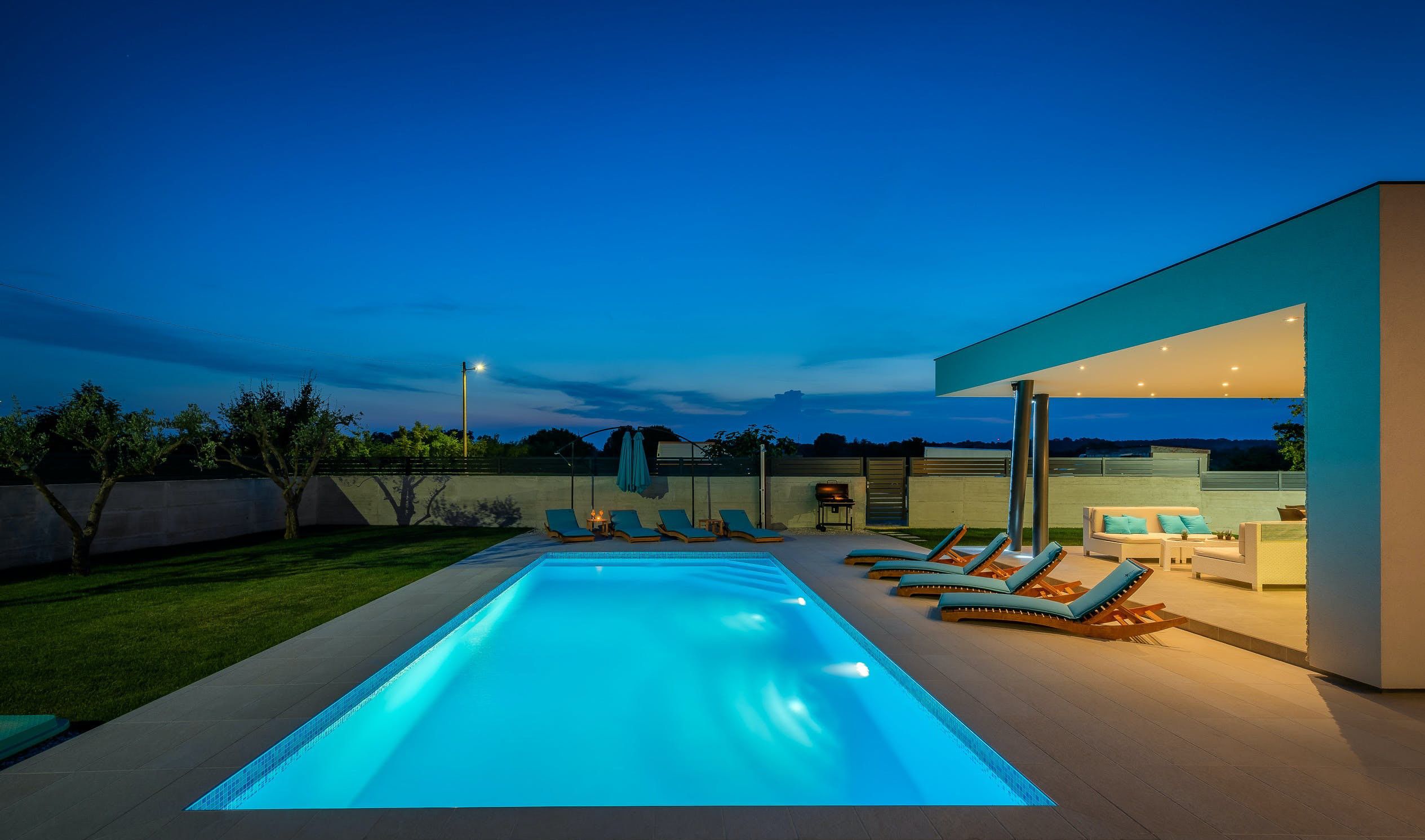 This home is an elegant, cubically designed villa with a harmonious ambience that invites guests to spend their time under the open sky. The villa features a 32 m² pool, a cosy lounge, and a stylish dining table. Guests can enjoy fun and action with the table tennis table, children's playground, volleyball net, soccer goals and dartboard. The villa has floor-to-ceiling windows that let in natural light and provide a view of the outdoor area. An air conditioning system ensures ideal indoor temperatures at all times. The living area features a large couch and TV while the dining area has a chic table for dining indoors. The fully equipped kitchen is openly integrated into the room. The villa has four individually designed bedrooms and modern en suite bathrooms. Guests can enjoy sizzling Mediterranean delicacies on the charcoal grill in the beautiful garden with lighting that contributes to a convivial atmosphere.