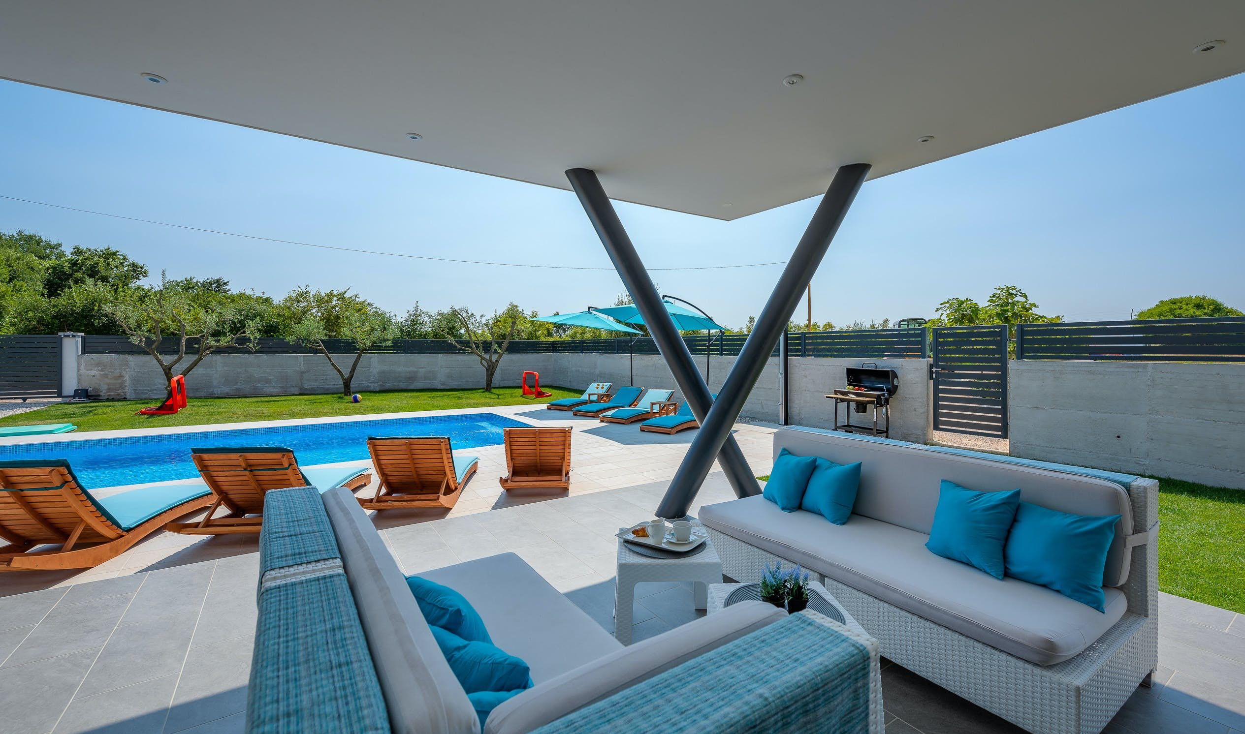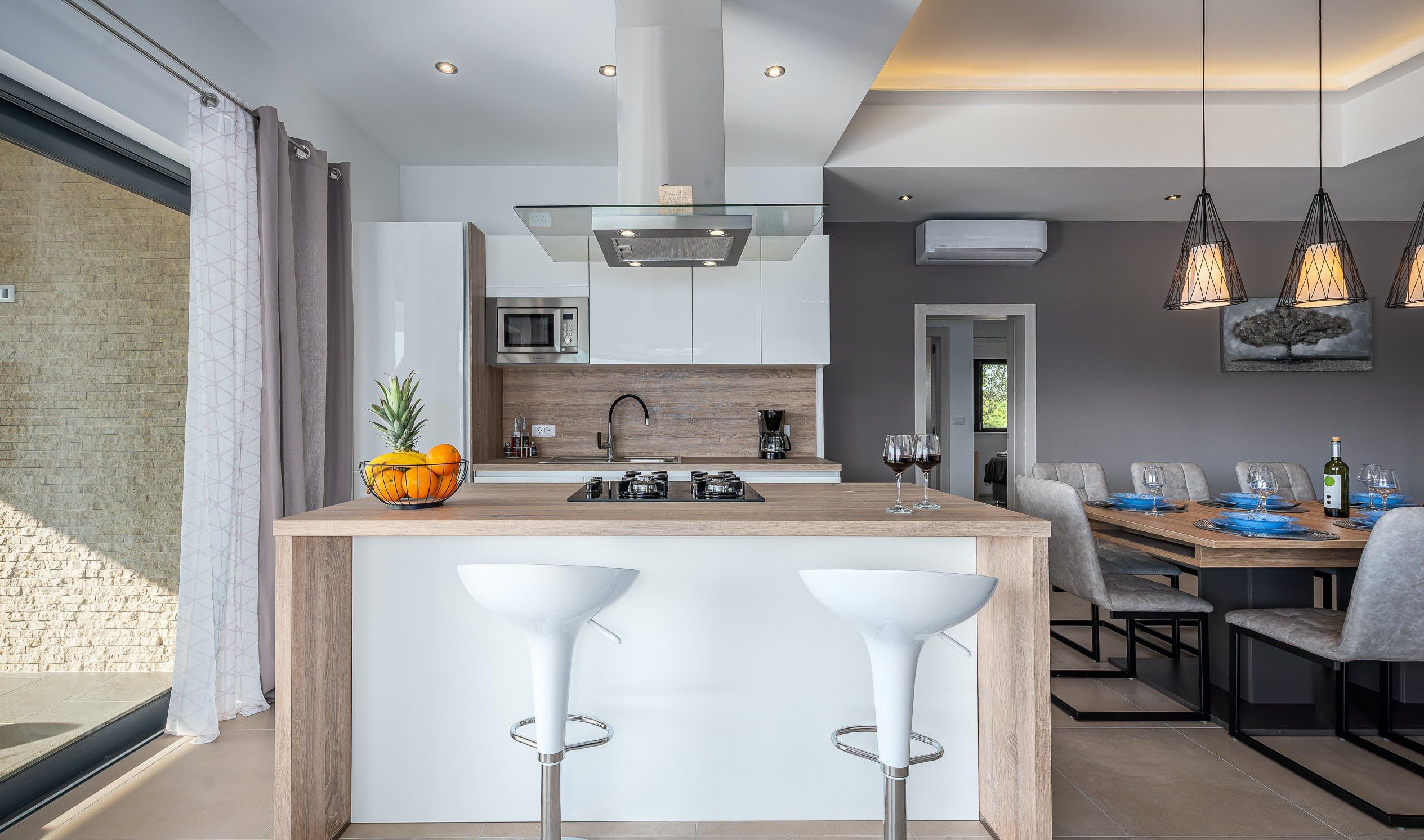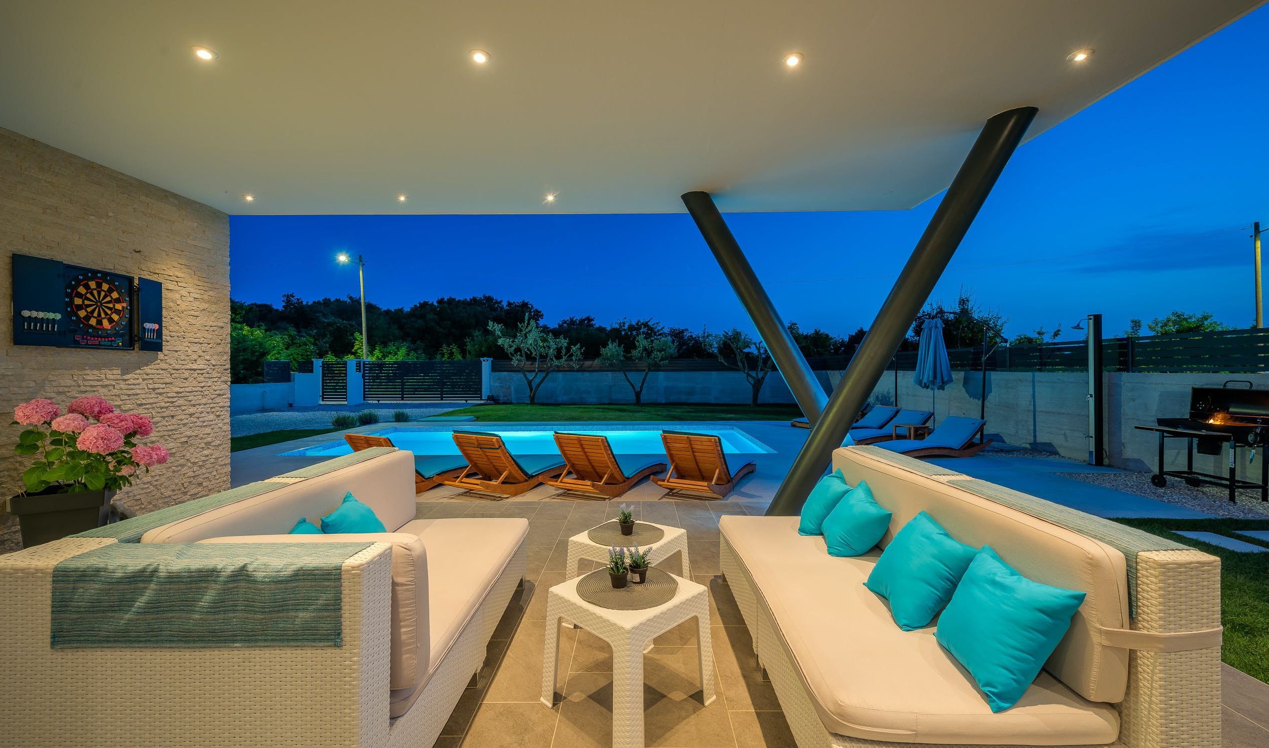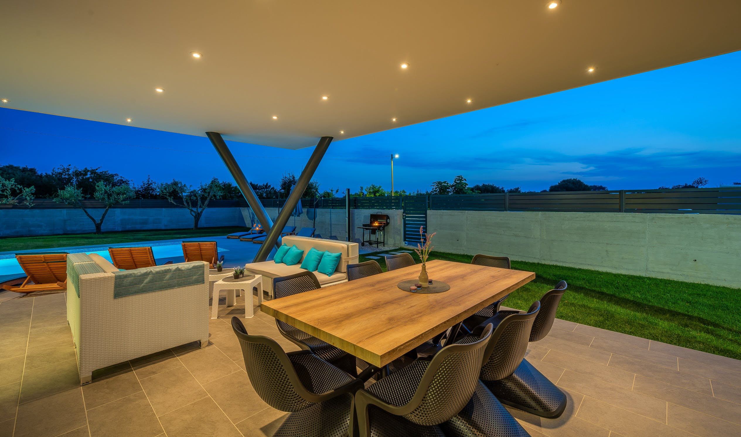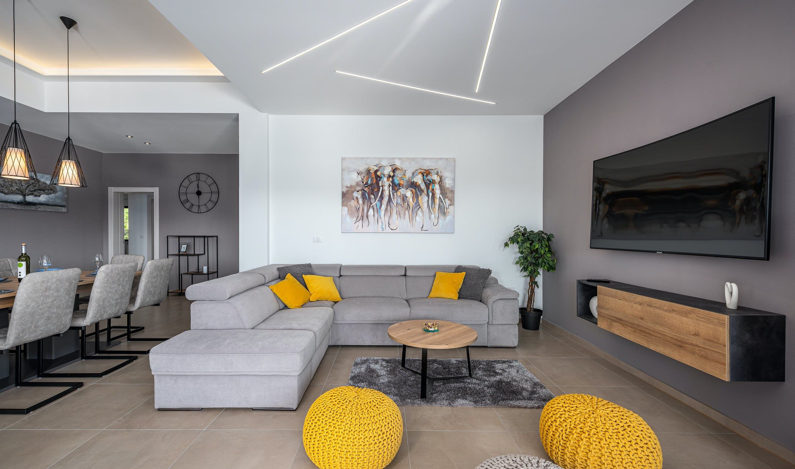 This home is an elegant, cubically designed villa with a harmonious ambience that invites guests to spend their time under the open sky. The villa features a 32 m² pool, a cosy lounge, and a stylish dining table. Guests can enjoy fun and action with the table tennis table, children's playground, volleyball net, soccer goals and dartboard. The villa has floor-to-ceiling windows that let in natural light and provide a view of the outdoor area. An air conditioning system ensures ideal indoor temperatures at all times. The living area features a large couch and TV while the dining area has a chic table for dining indoors. The fully equipped kitchen is openly integrated into the room. The villa has four individually designed bedrooms and modern en suite bathrooms. Guests can enjoy sizzling Mediterranean delicacies on the charcoal grill in the beautiful garden with lighting that contributes to a convivial atmosphere.