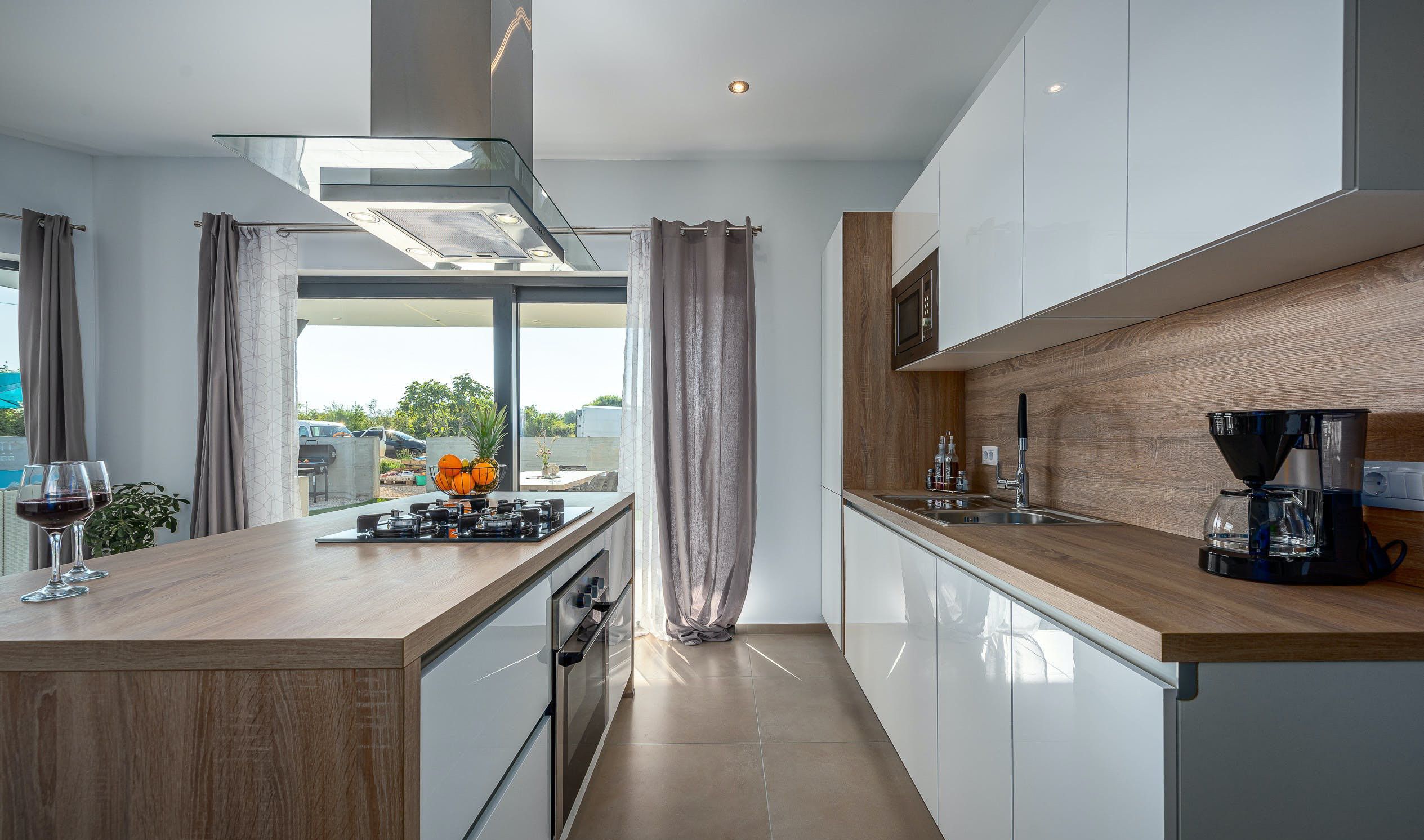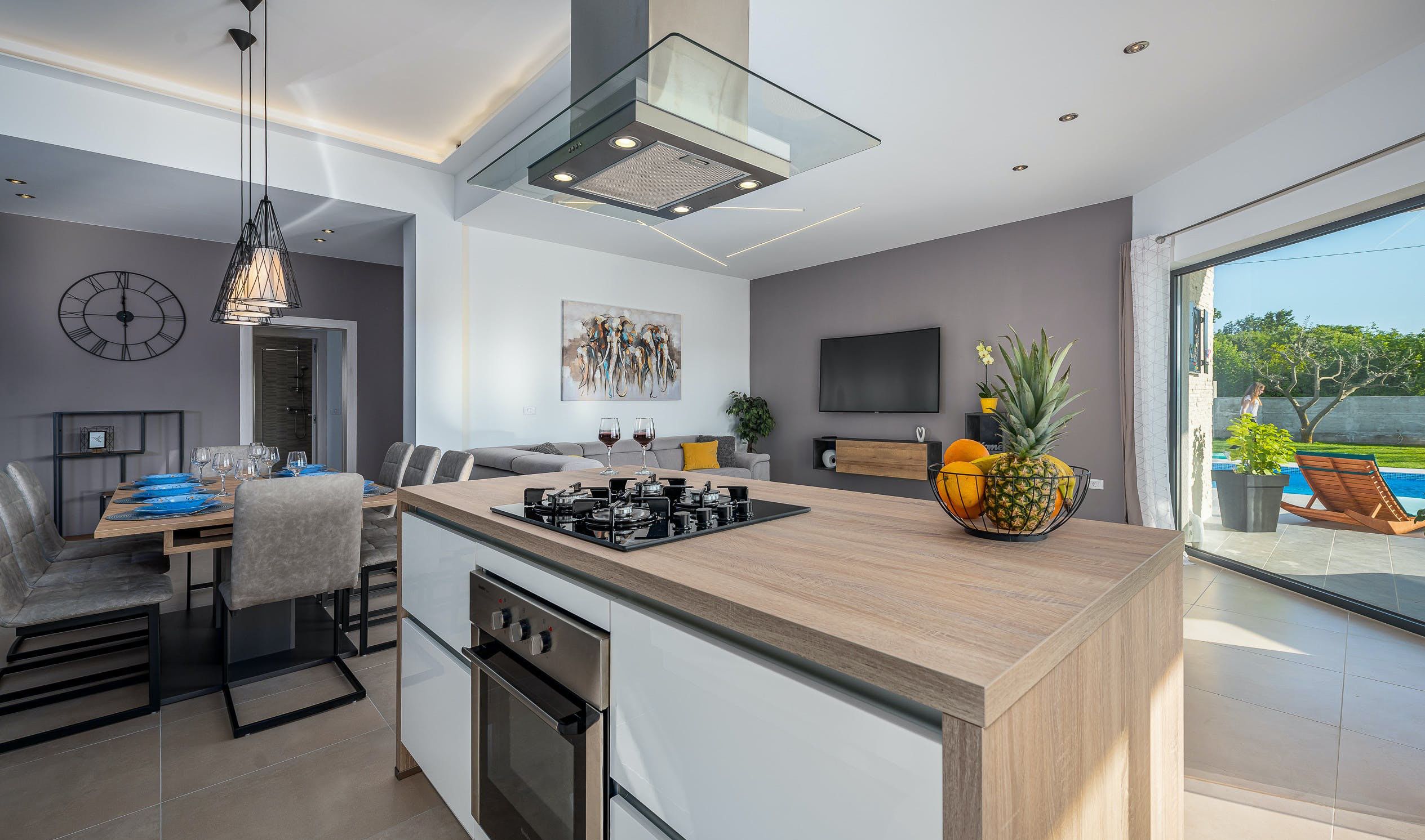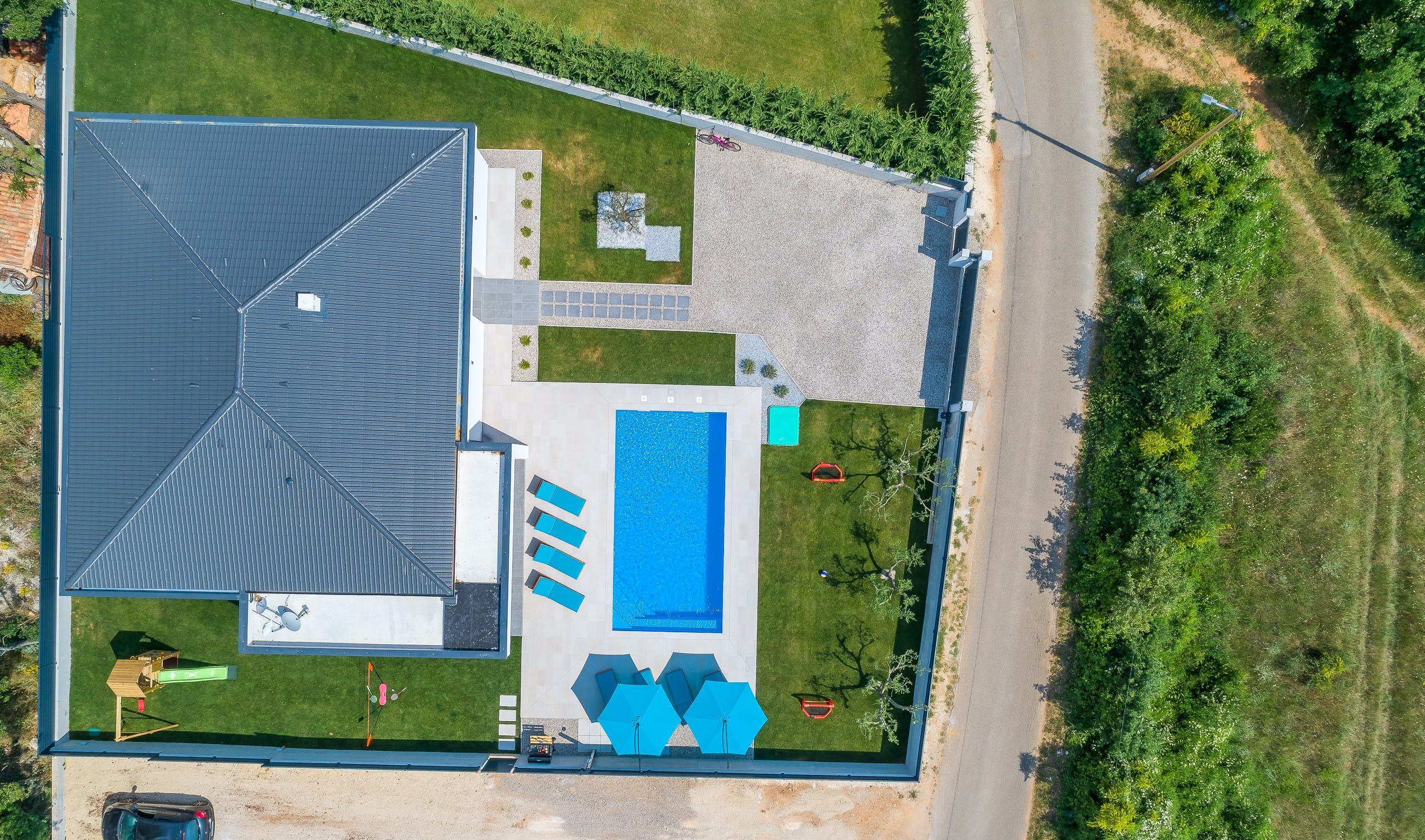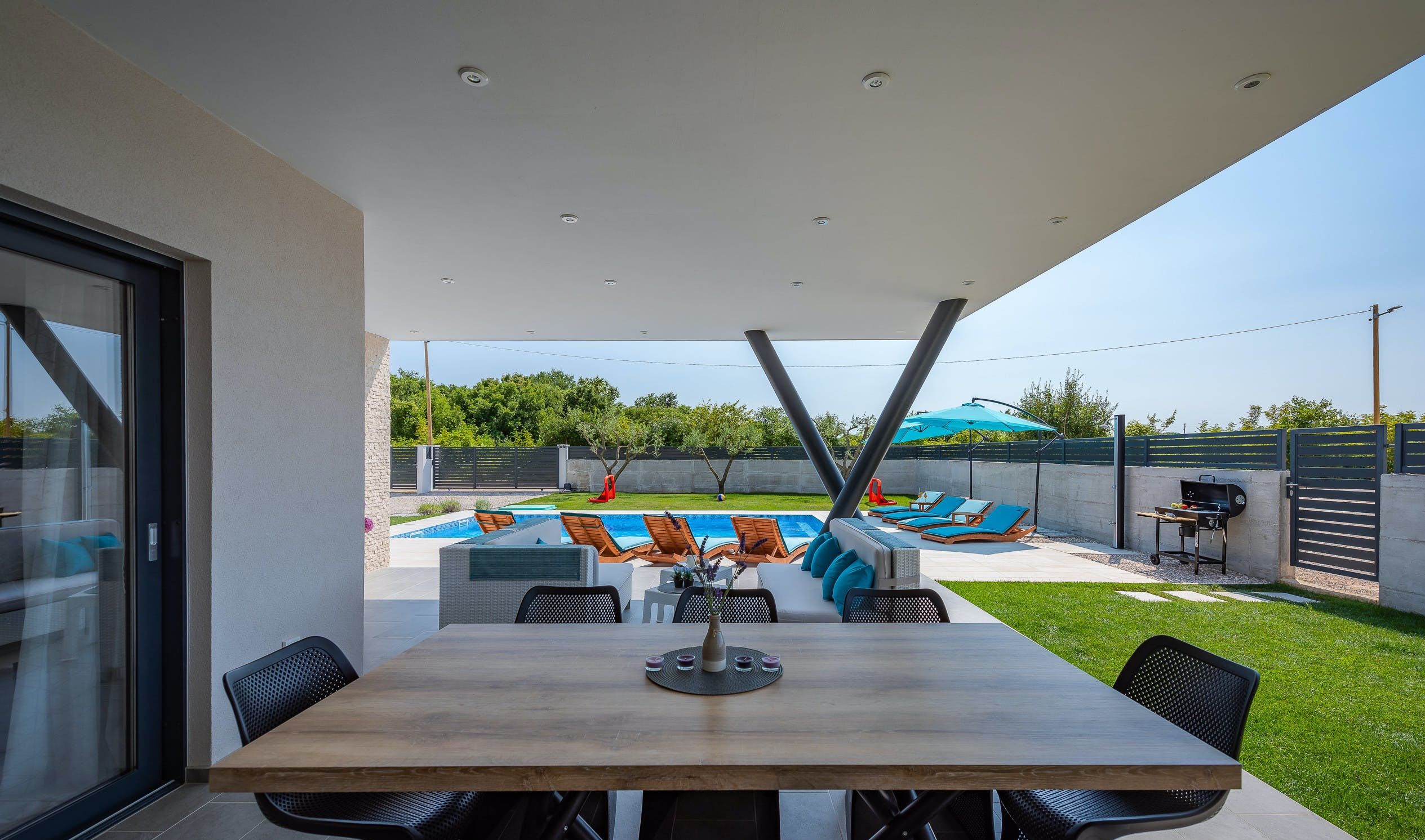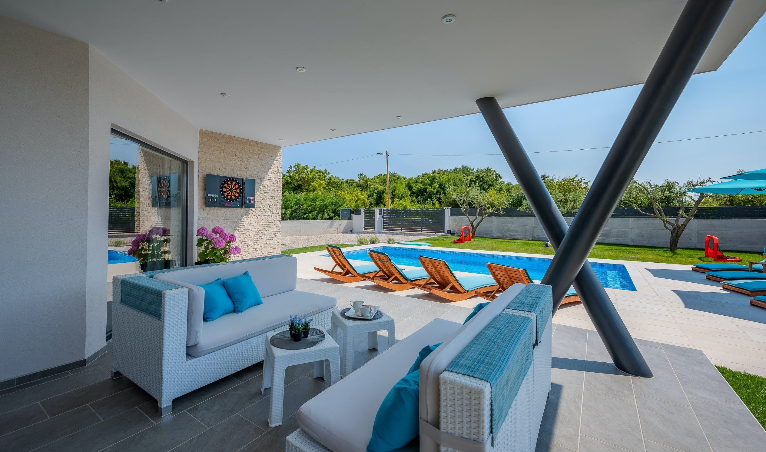 This home is an elegant, cubically designed villa with a harmonious ambience that invites guests to spend their time under the open sky. The villa features a 32 m² pool, a cosy lounge, and a stylish dining table. Guests can enjoy fun and action with the table tennis table, children's playground, volleyball net, soccer goals and dartboard. The villa has floor-to-ceiling windows that let in natural light and provide a view of the outdoor area. An air conditioning system ensures ideal indoor temperatures at all times. The living area features a large couch and TV while the dining area has a chic table for dining indoors. The fully equipped kitchen is openly integrated into the room. The villa has four individually designed bedrooms and modern en suite bathrooms. Guests can enjoy sizzling Mediterranean delicacies on the charcoal grill in the beautiful garden with lighting that contributes to a convivial atmosphere.